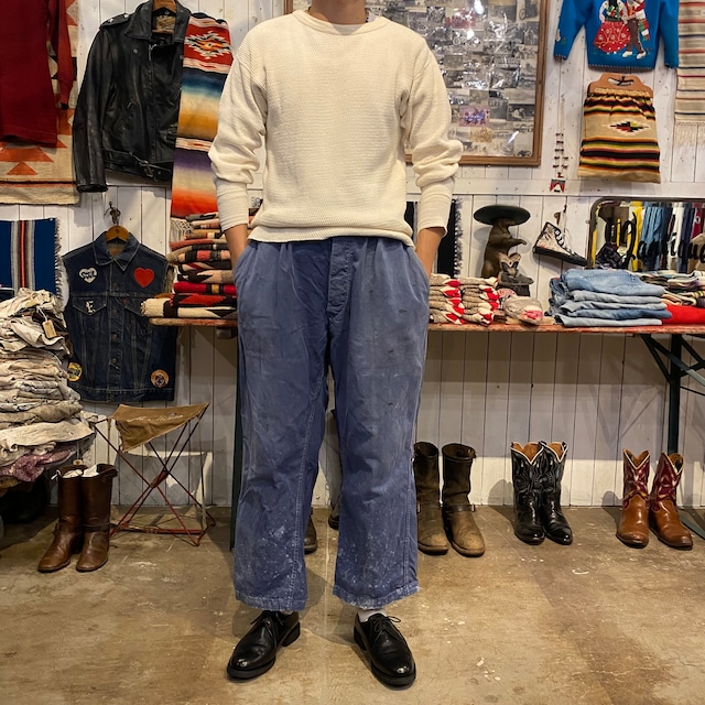 ⬜︎商品説明⬜︎ フランスからダブルニーのワークパンツになります。ペンキ跳びがあるようにペンキ屋等で使われていたものだと思います。生地はコットンとポリエステルになります。コットンが65%なので軽すぎずガシガシ履けるような、履きやすいパンツです。 青色に程よい赤のポイントが入って、そこにペンキなどのダメージがカッコ良いアイテムで、これを履けば決まるアイテムと思います。 割と通年履けるアイテムかなと思いますのでワークパンツお探しの方は是非。 ⬜︎サイズ⬜︎ ウエスト98cm 股上30cm 股下76cm 総丈103cm わたり34cm 裾幅21cm 着用モデル:178cm ⬛︎お支払い方法 クレジットカード決済のみになります ⬛︎送料 エリア別の料金対応になります ⬛︎⬜︎ATTENTION⬜︎⬛︎ 文章では伝えきれらない古着特有の使用感や経年変化等もございますが、こちらも含めて 楽しんで頂けたらと思います。 商品等の質問は、トップページのcontactからお問い合わせ頂く事が出来ますのでごぜひ利用下さい。 ⬛︎SOLD表示になっていなくてもお買い上げが出来ない場合がございます⬛︎ ※掲載商品は、店頭での販売も行っている為、注文が重複してお買い上げができない場合がございます。 ※営業時間外等に、ご購入決定のご連絡を弊社に直接頂たお客様がいる場合は、webの表示がsoldになっていない状態でもご購入して頂くことが出来ません。決定のご連絡を早く頂いたお客様へ発送とさせて頂きます。 予めご了承下さい。 ◼️店頭での受け取りをご希望される場合 購入画面の備考欄に店頭受け取りの旨をお書き下さい。ご来店頂き、決済を確定させて頂く際に送料分のキャンセル手続きをこちらで行わせていただきます。 ※お問い合わせの返信時間は営業時間内に限ります ※購入後の返品交換は致しかねます 上記の注意事項にご理解のあるお客様に向けて紹介させて頂きたいと思います。
