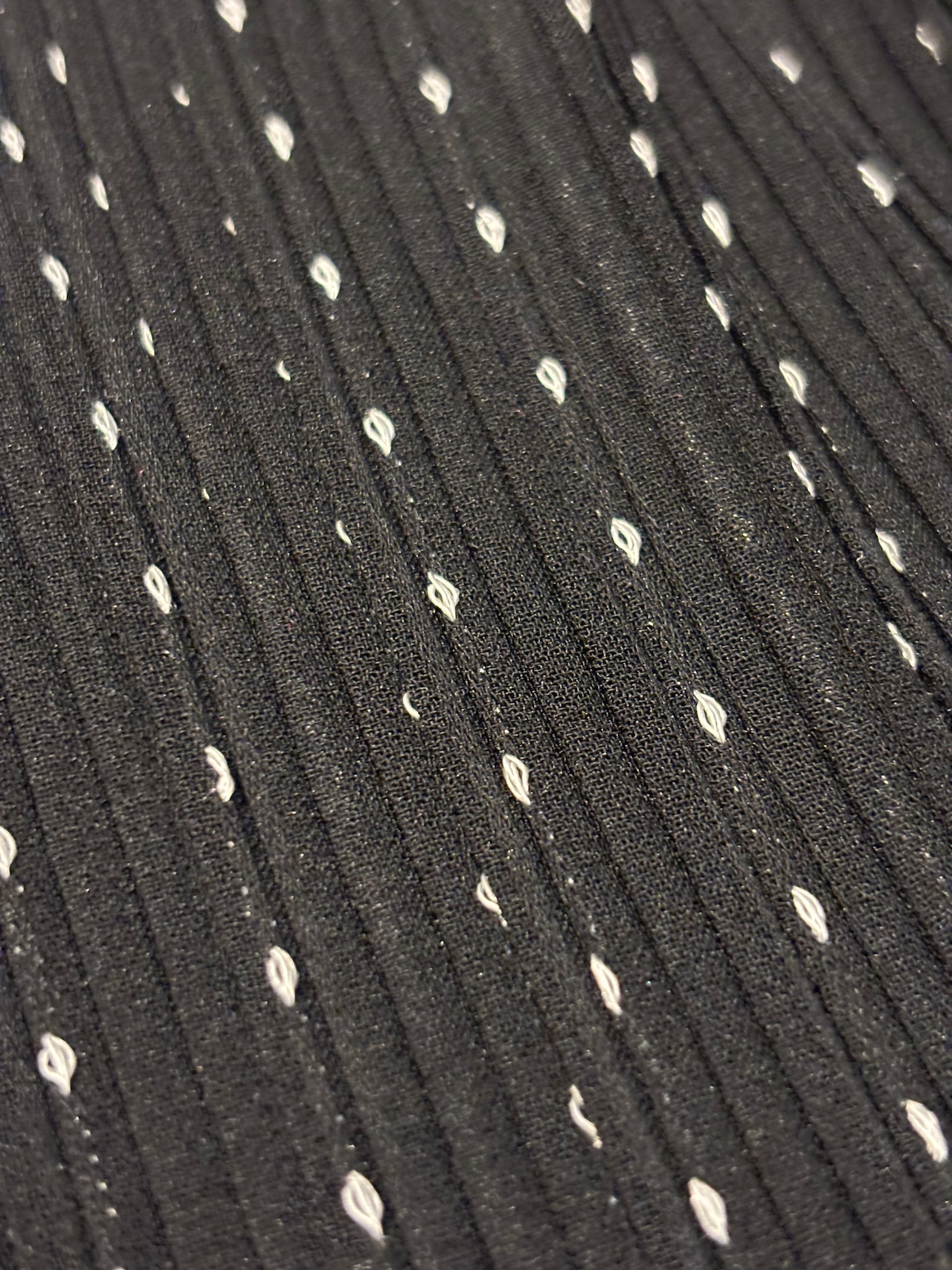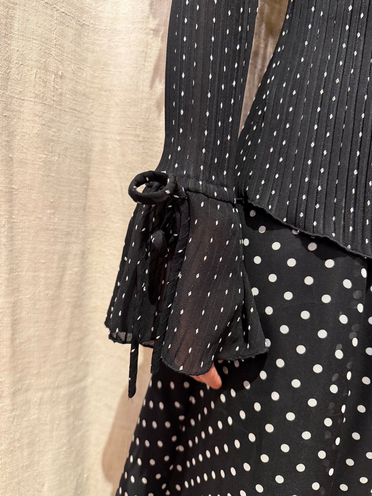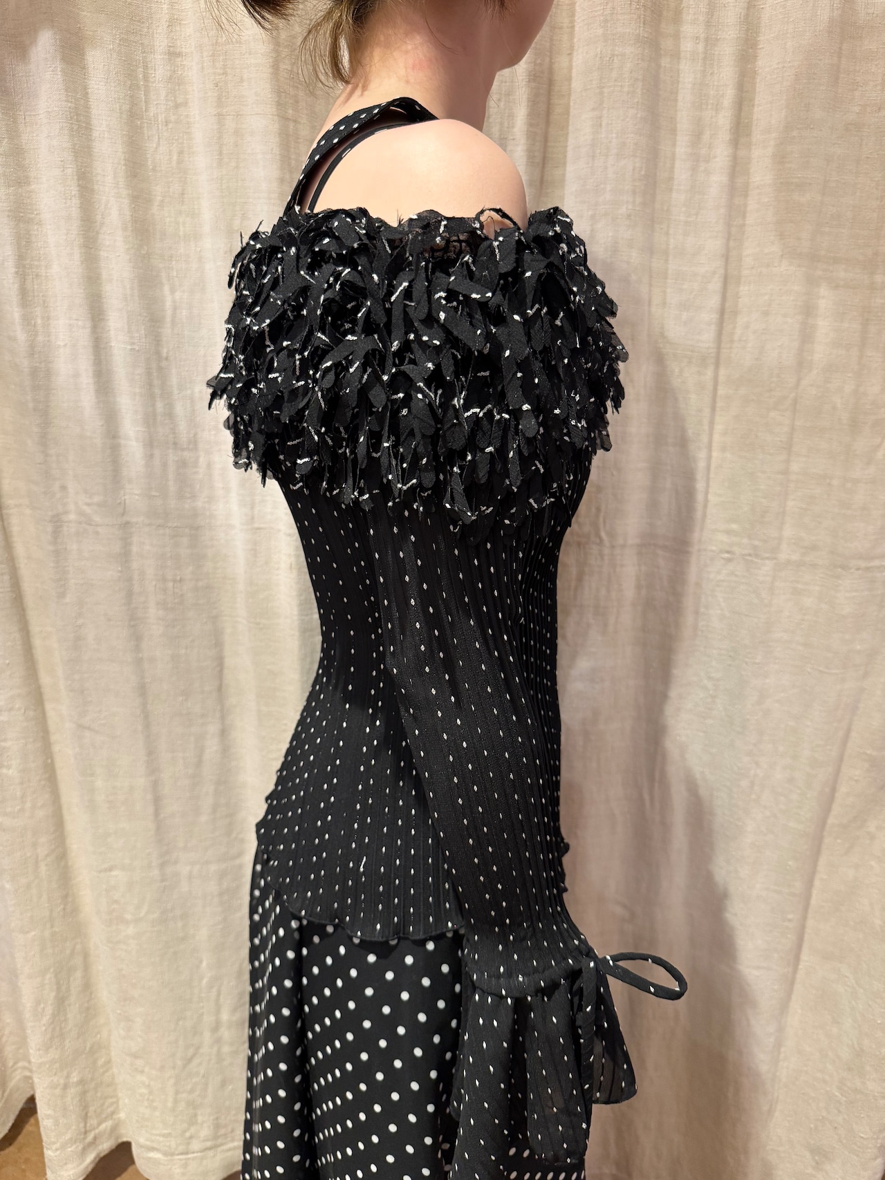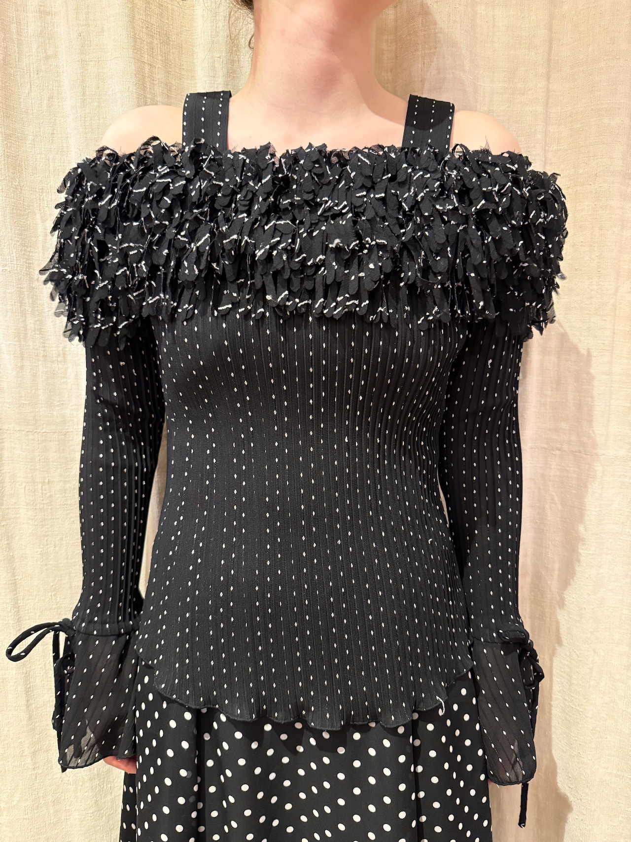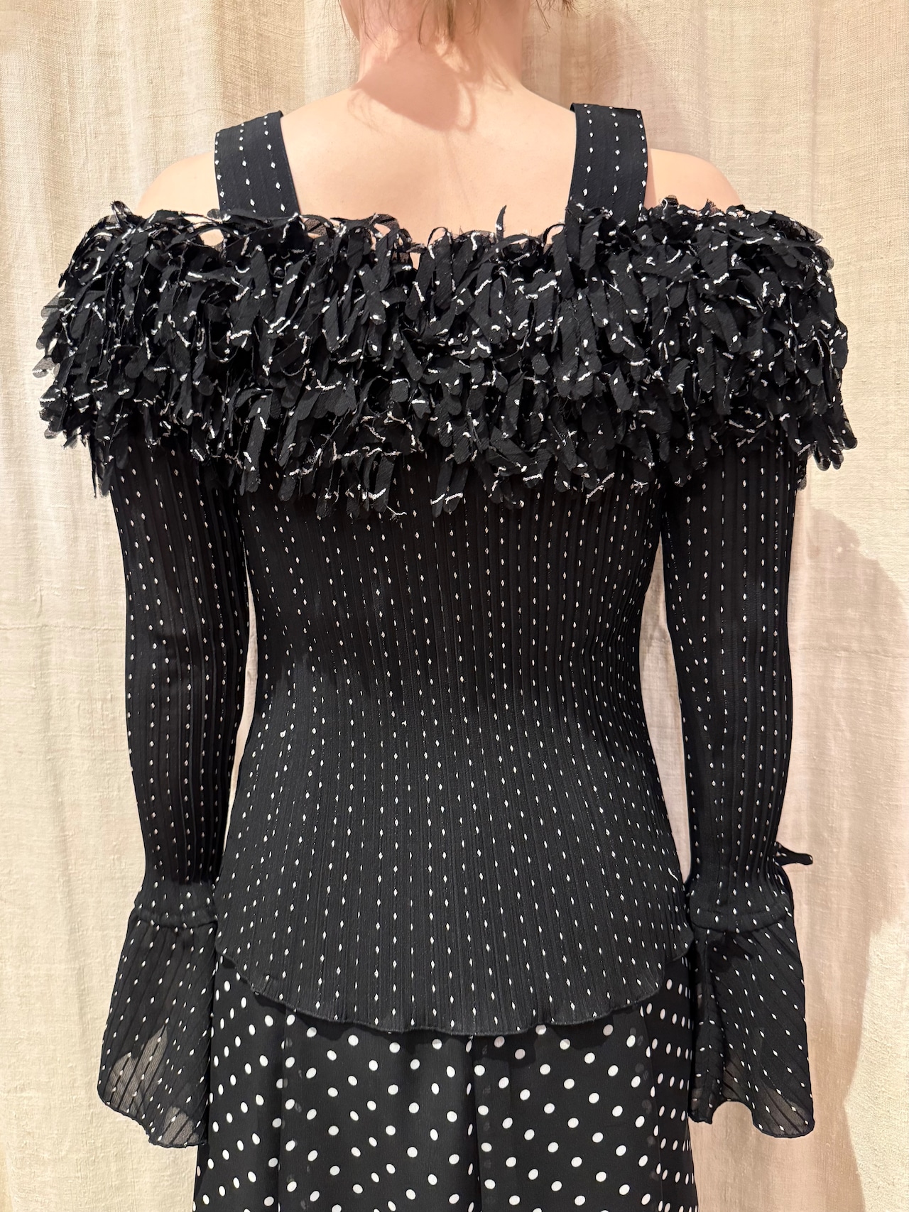 細かいプリーツのトップスです。伸縮性があり、体にフィットする素材感です。オフショルで、バスト部分はたくさんのフリンジが施されており、ボリュームがあります。全体と、バスト&袖口のボリュームのシルエットのメリハリが女性らしいです。また、ドットのような柄は元々の生地の柄ではなく刺繍で作らています。細かいディティールにも注目です。
