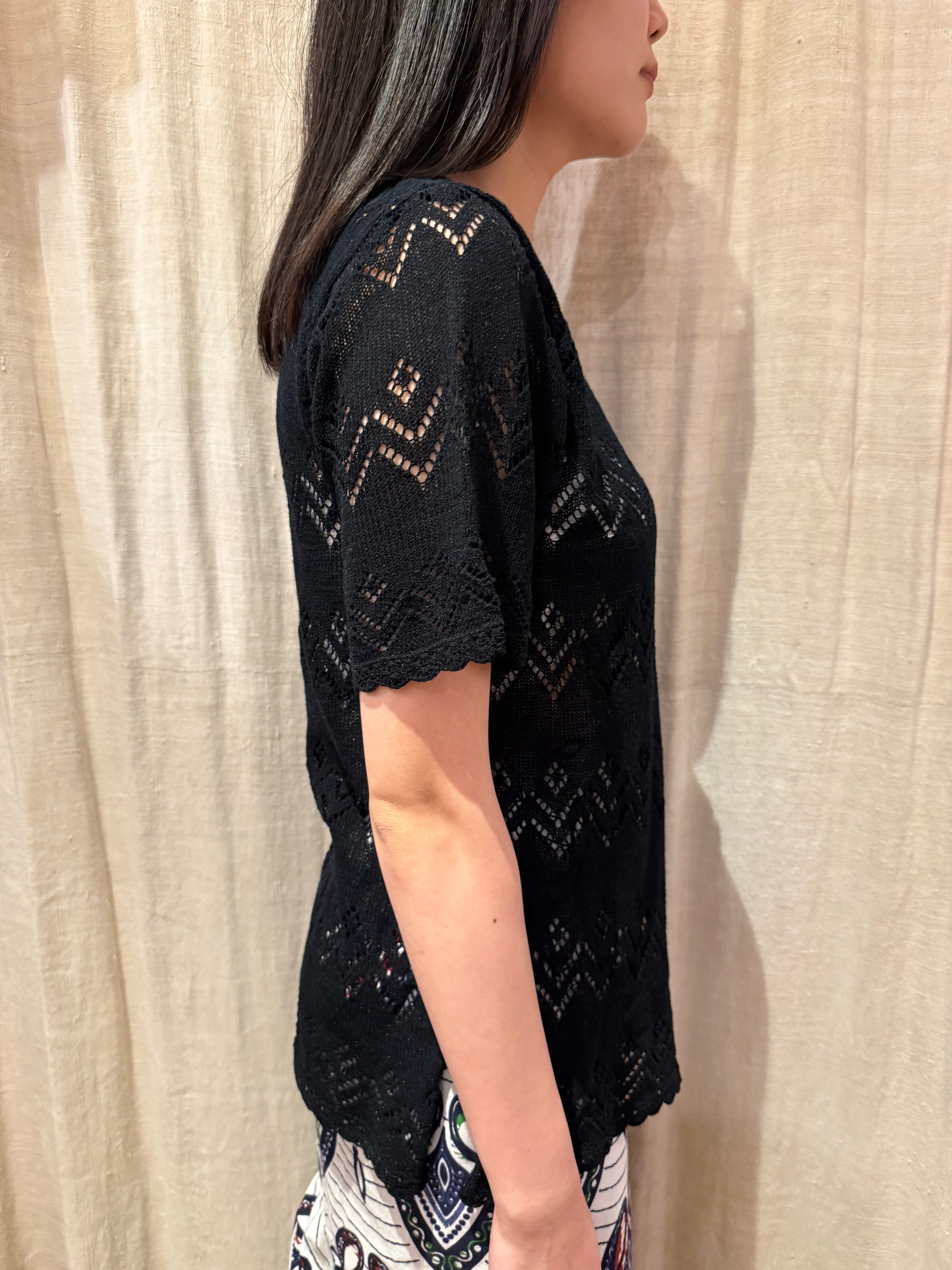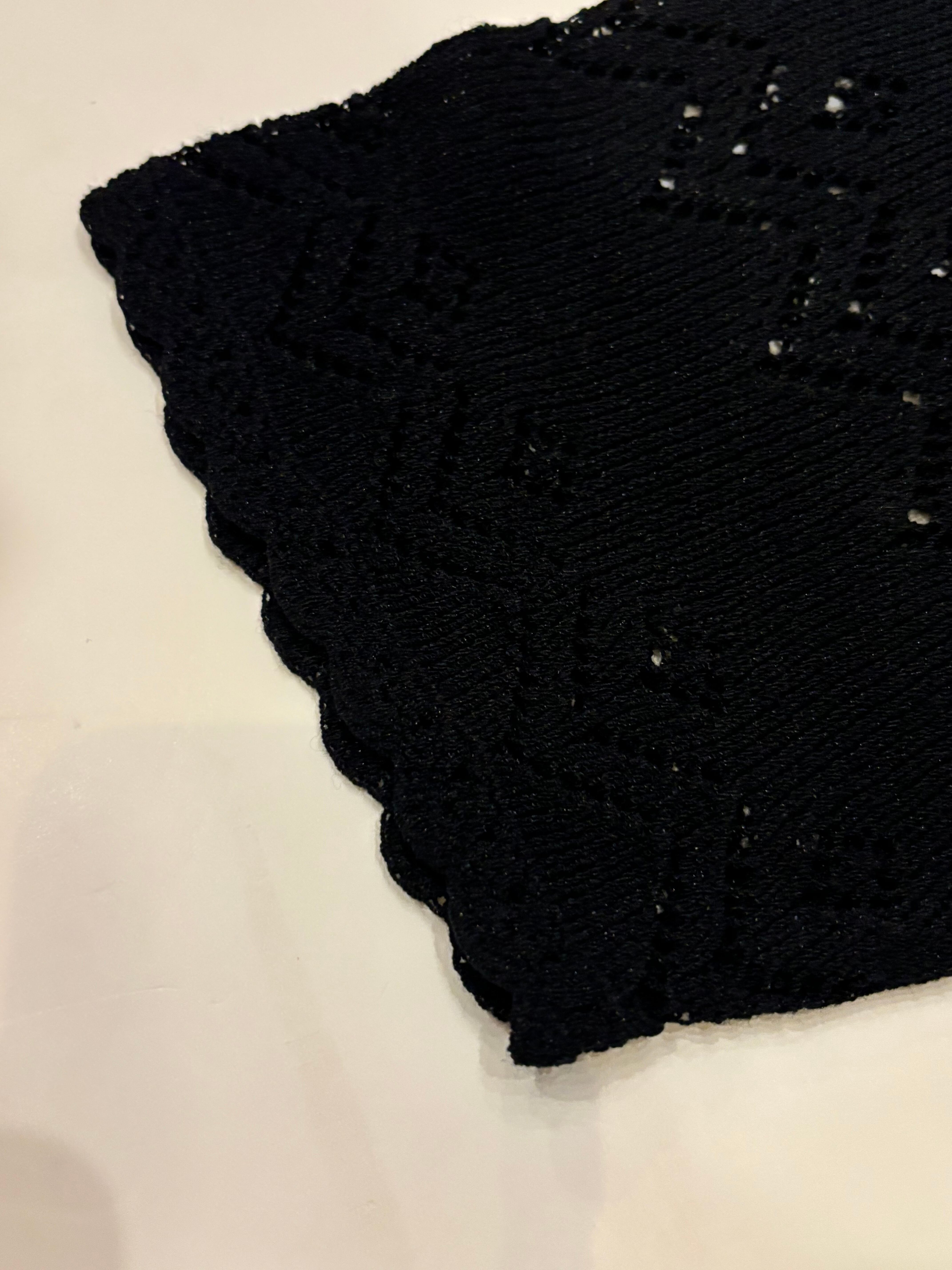 クロシェニットのカーディガンです。チクチクしない肌触りで、素肌の上からでも着用していただけます。ボックス型のシルエットでゆとりのあるサイズ感なので、羽織としてもご使用していただけます。襟、袖、裾の、なみなみした始末が可愛いです。
