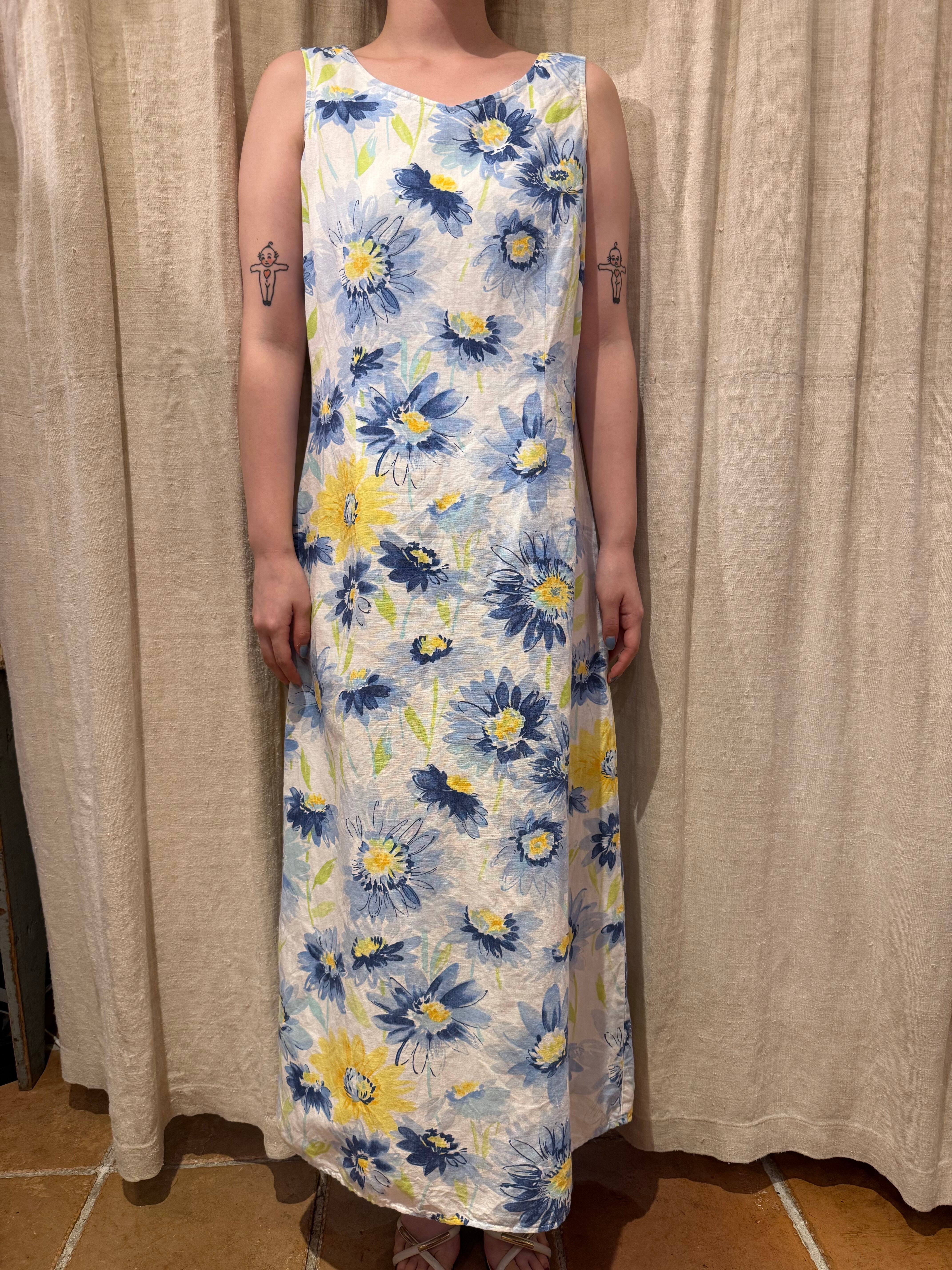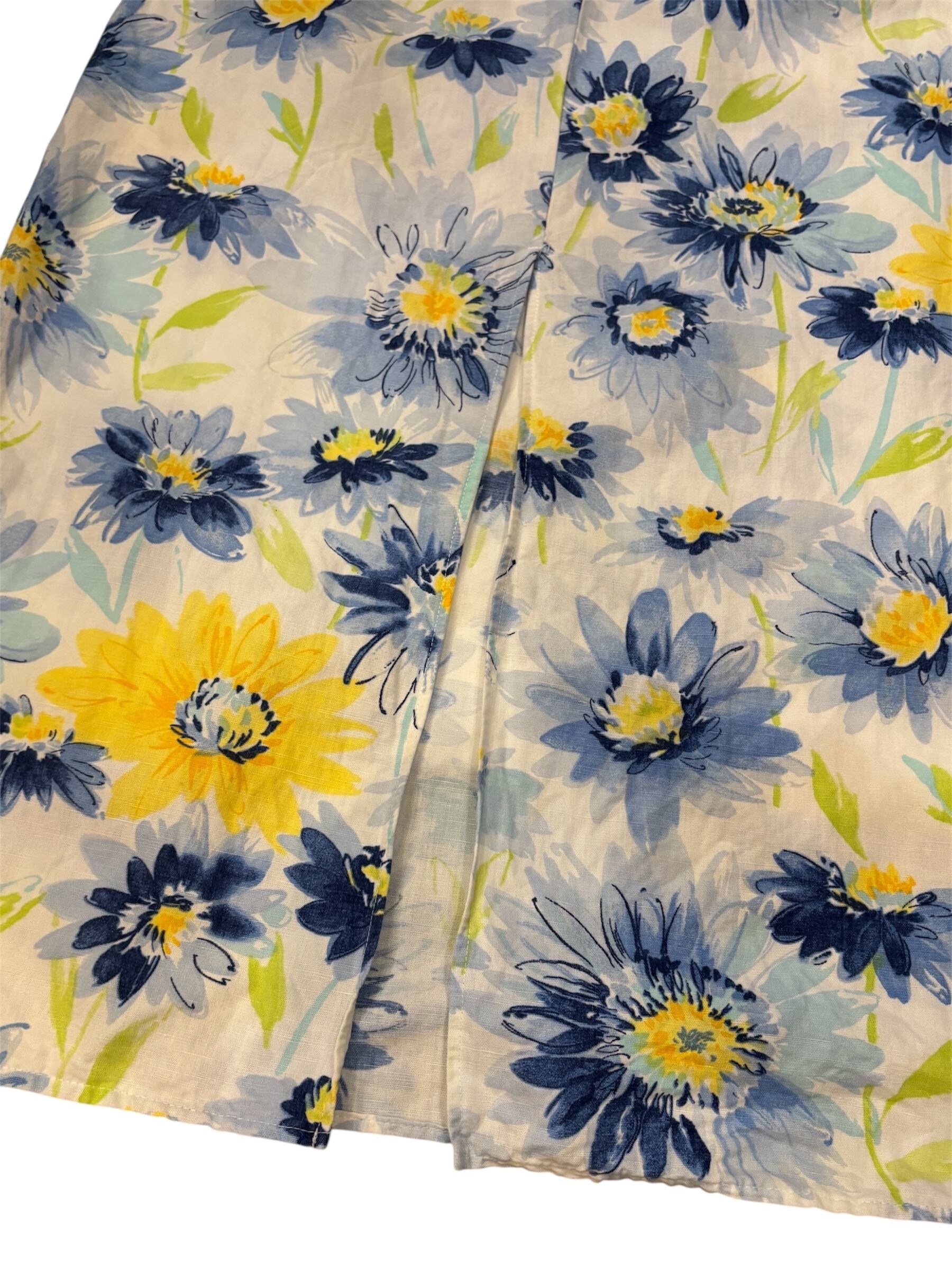 ハリのある素材でコットンのような肌触り。全体的にプリントされたお花柄は青ベースのカラーで夏らしいです。バックに入ったスリットは深めで隙間から見える素肌が可愛らしいです。夏は一枚でガバっと着れる一着です。