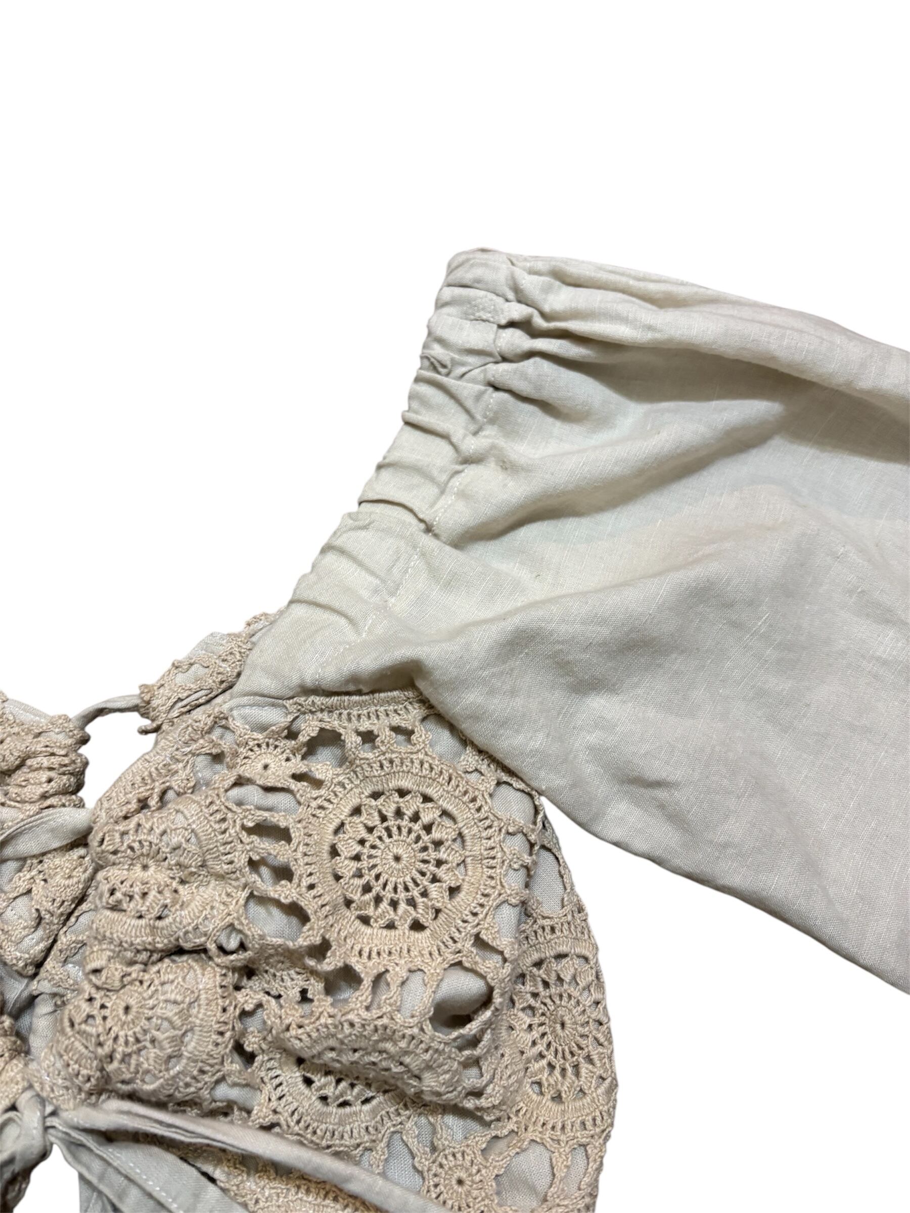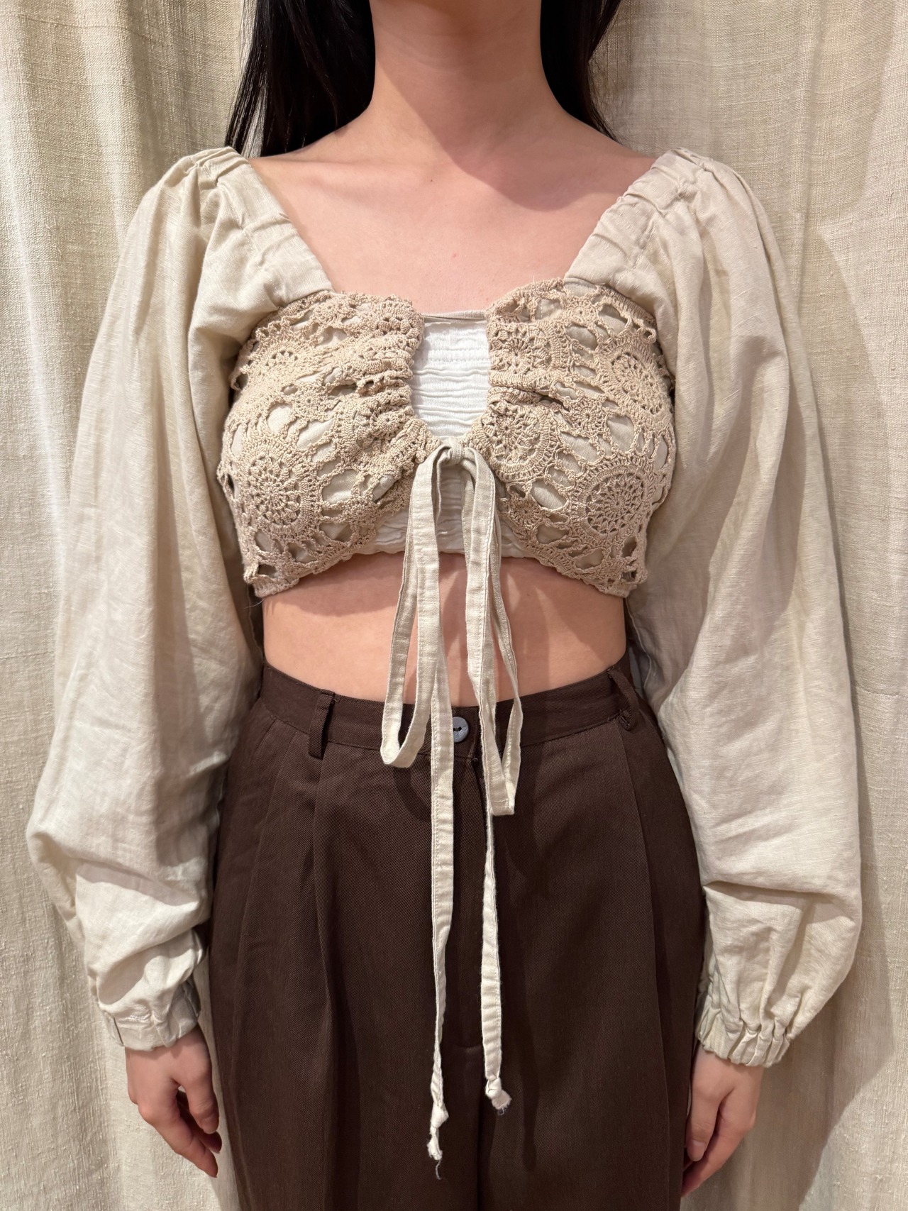 クロップド丈のブラウスです。バストくらいまでの丈感に対し長めの袖で、シルエットのメリハリが可愛いです。生成りの生地にクロシェ編みであたたかみがあります。前後共に同じ作りで、長めのリボンが施されており、バストや裾幅に関してはリボンで調整できます。タンクトップなどにレイヤードしても可愛いです。