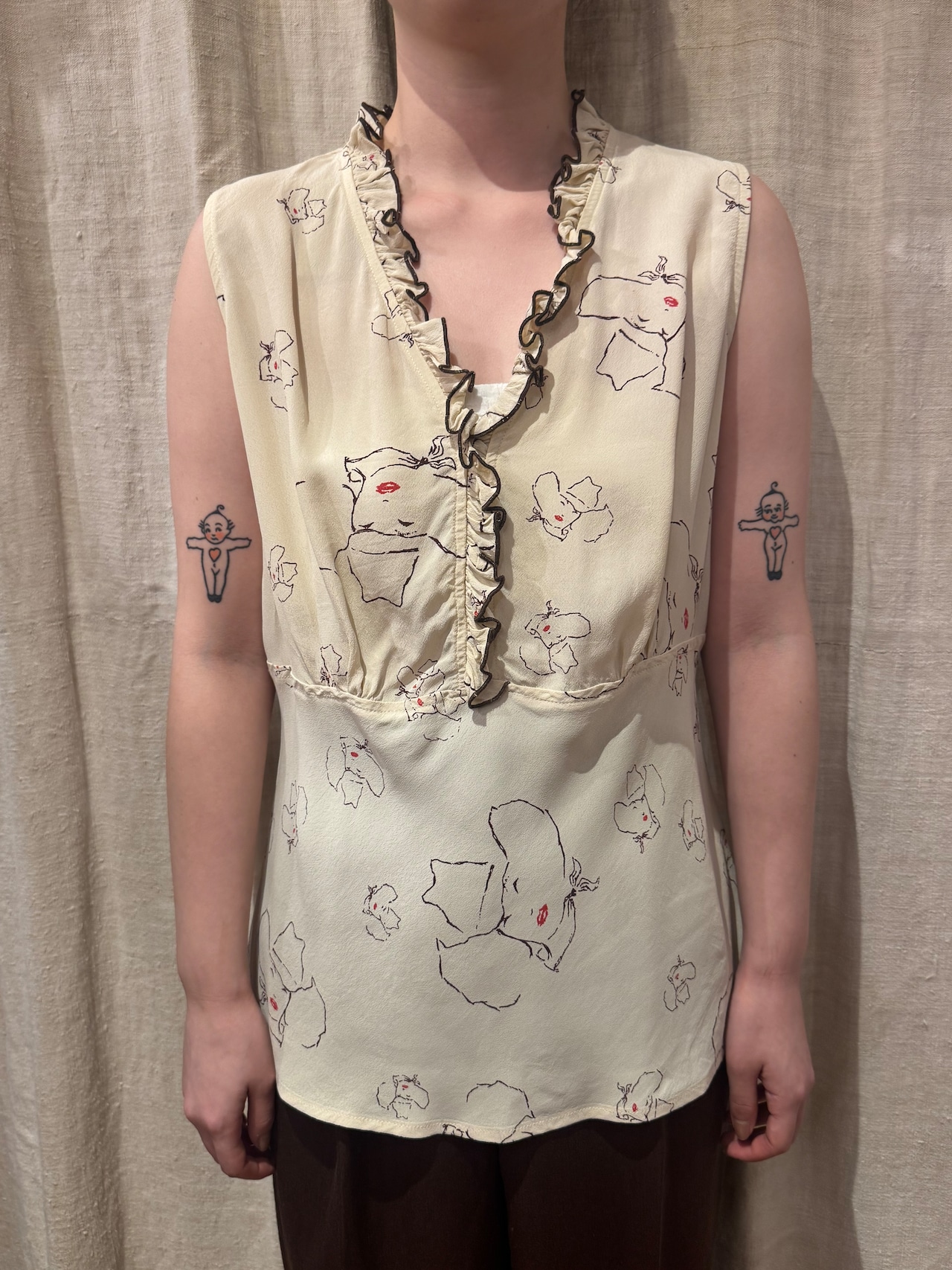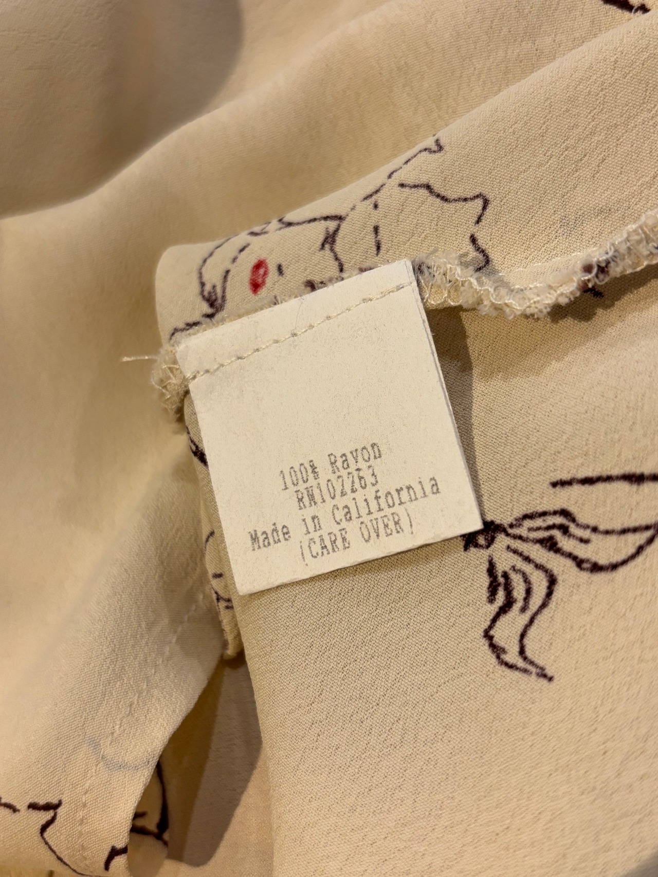 テロテロとした肌触りの良いレーヨン素材のブラウス。ベージュとブラウンの配色がとても可愛らしく、独特なタッチの女性柄も特徴的です。ウエストが少しくびれていて裾がヒラっとしているので綺麗なシルエットになり、今の時期はサラッと快適に着用する事が出来るので一枚で着ても重ねても使いやすいアイテムです。