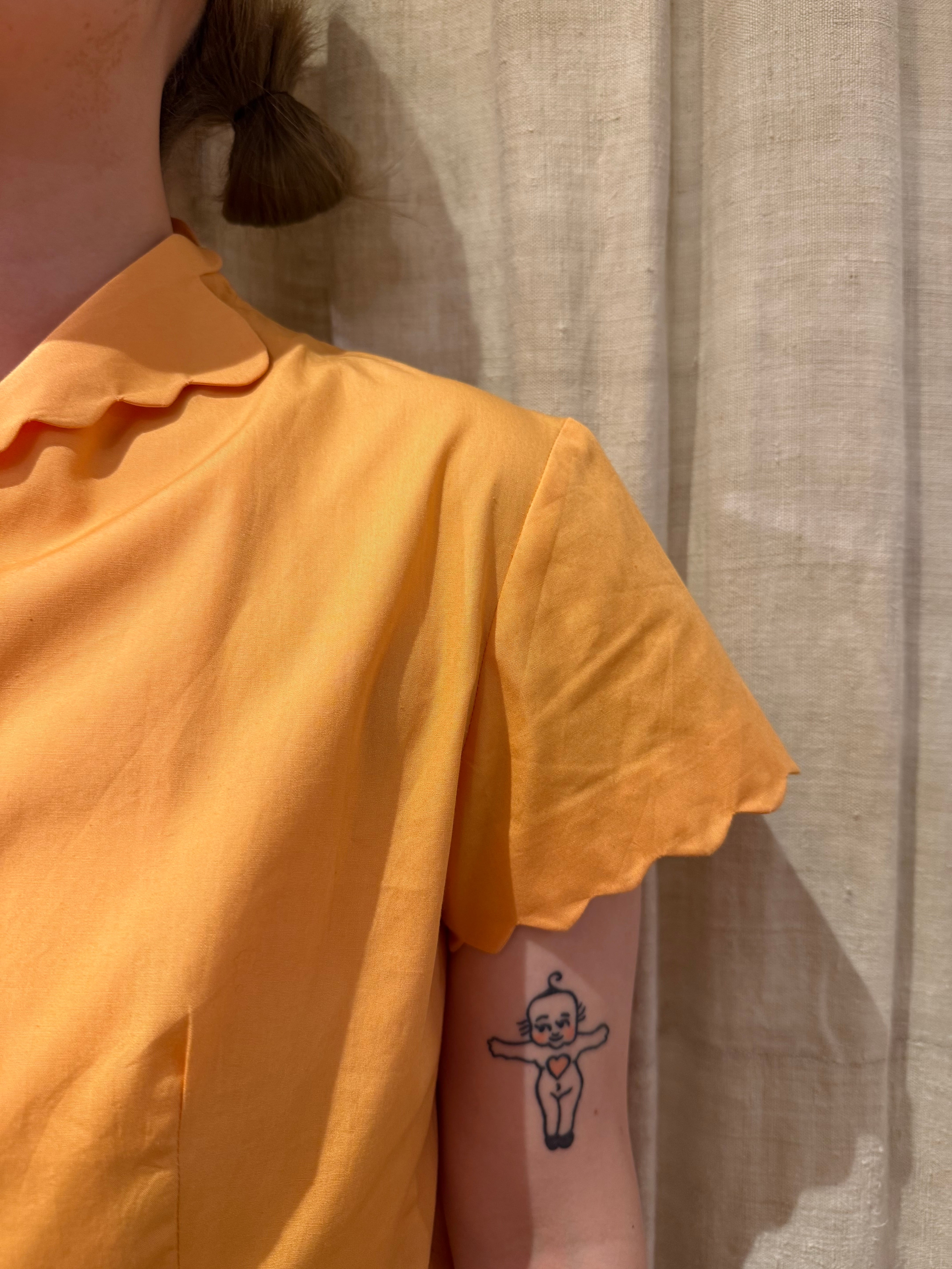 ナミナミとした襟と裾に施されたスカラップが目を惹くブラウス。しっかりとしたコットン素材で着心地も良く、くすみオレンジの様な色味もとても可愛らしいです。前部分が縫い合わせで立体的になっているのも特徴的。一枚でアクセントになるアイテムです。