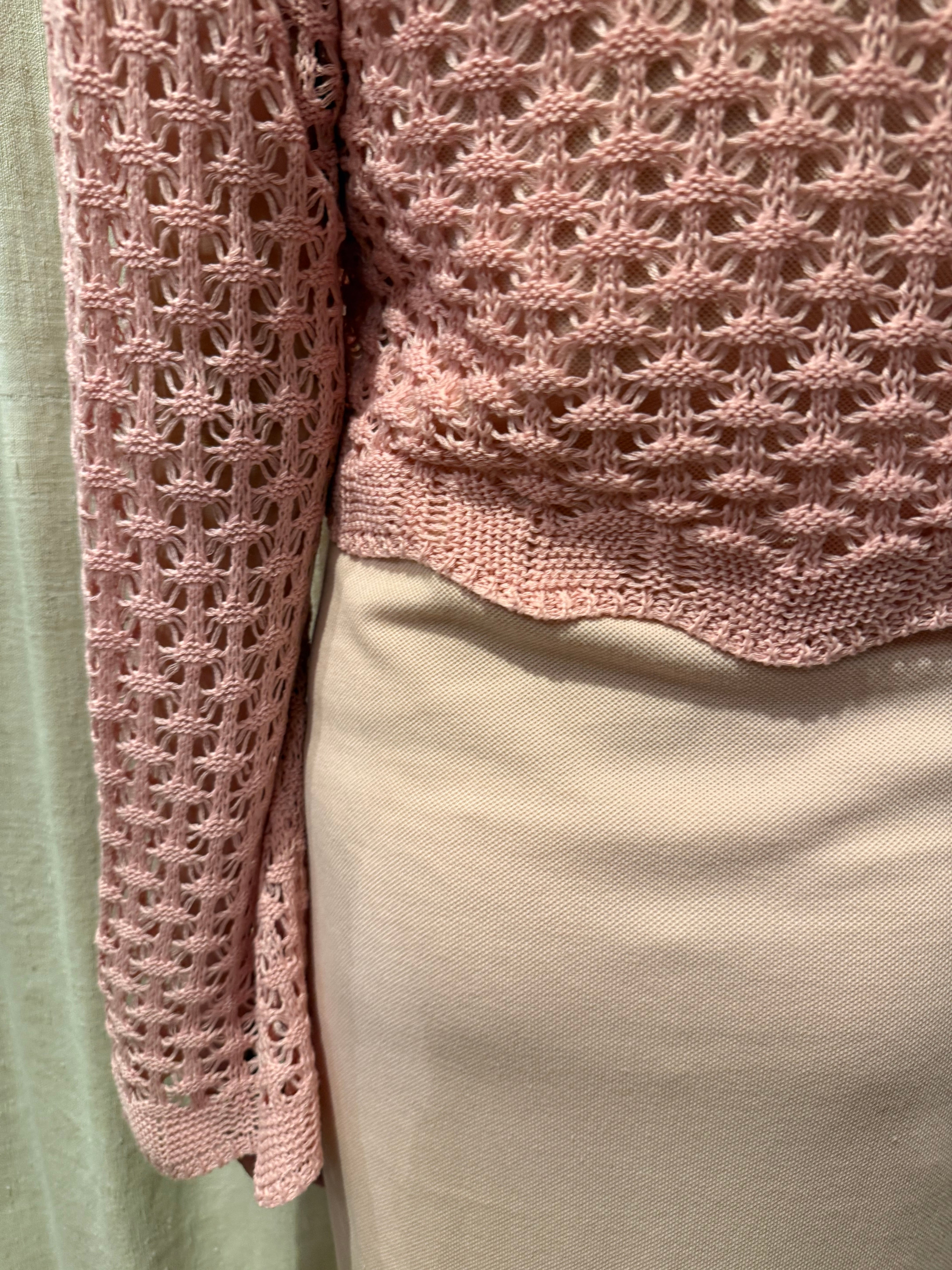 ベビーピンクの様なカラーが可愛らしいカーディガン。荒めの編み目でインナーや素肌が透ける感じが◎袖にかけて広がっていて裾やリブ部分が波打つ様な編み方になっています。胸のリボンも紐が二重になっているのもポイントです。