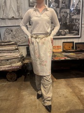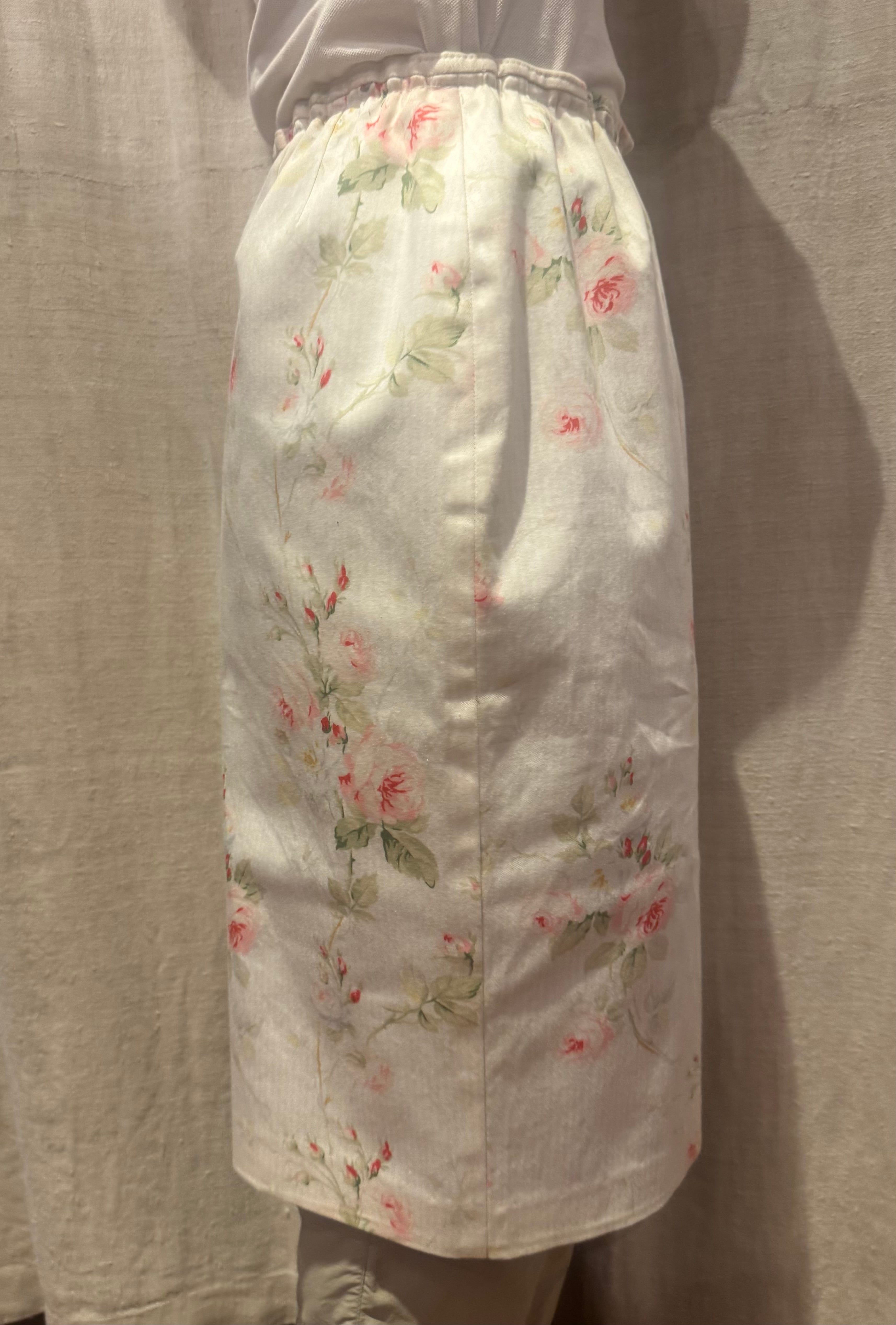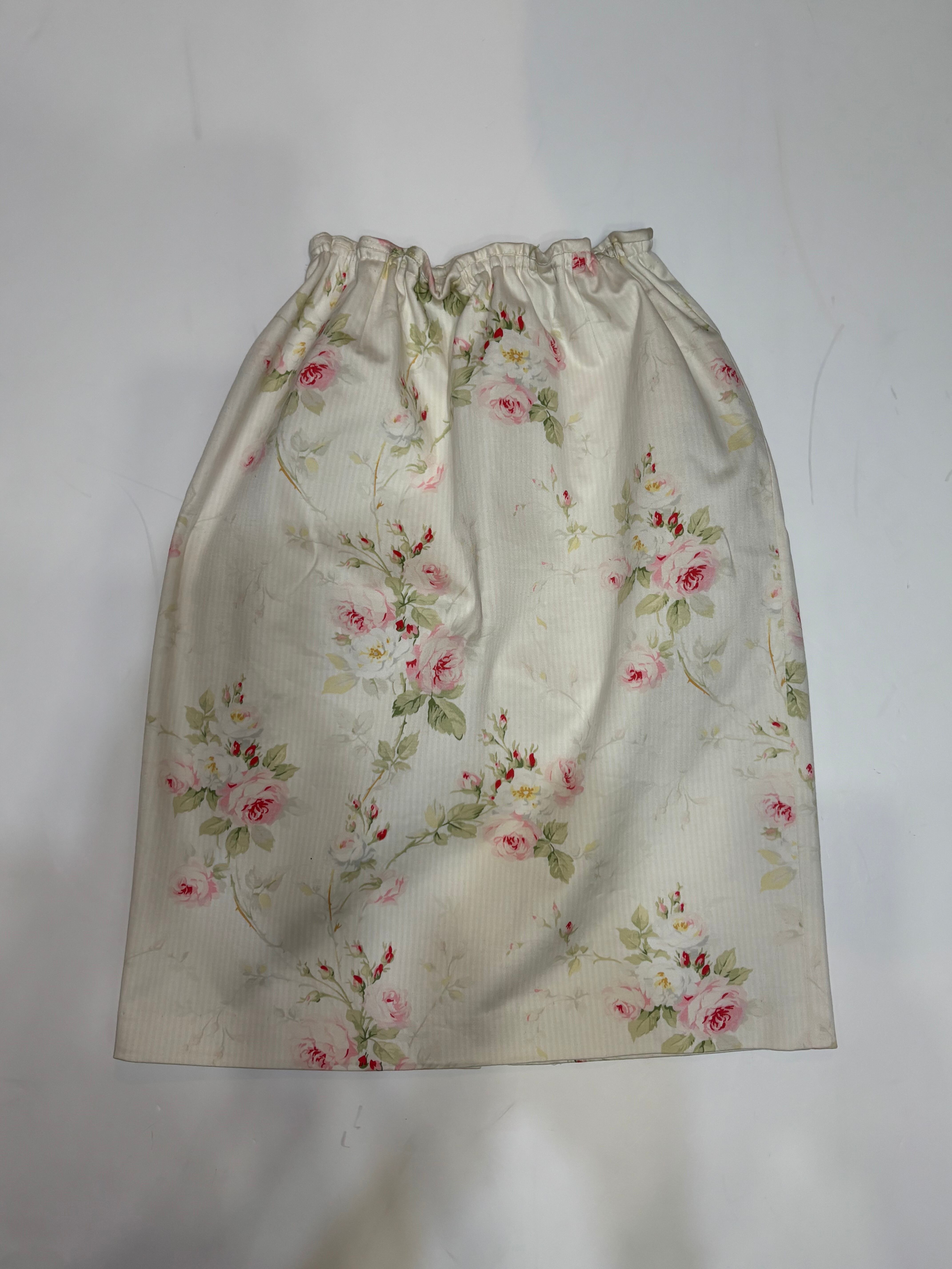 淡い色合の花柄が可愛らしいスカート。しっかりとした肌触りで、生地全体に薄めにストライプ柄のような物が入っています。ウエストはゴムが入っていてジッパーも付いているので着脱もしやすいです。後ろのスリットから素肌やパンツなどレイヤードしてもいいと思います。
