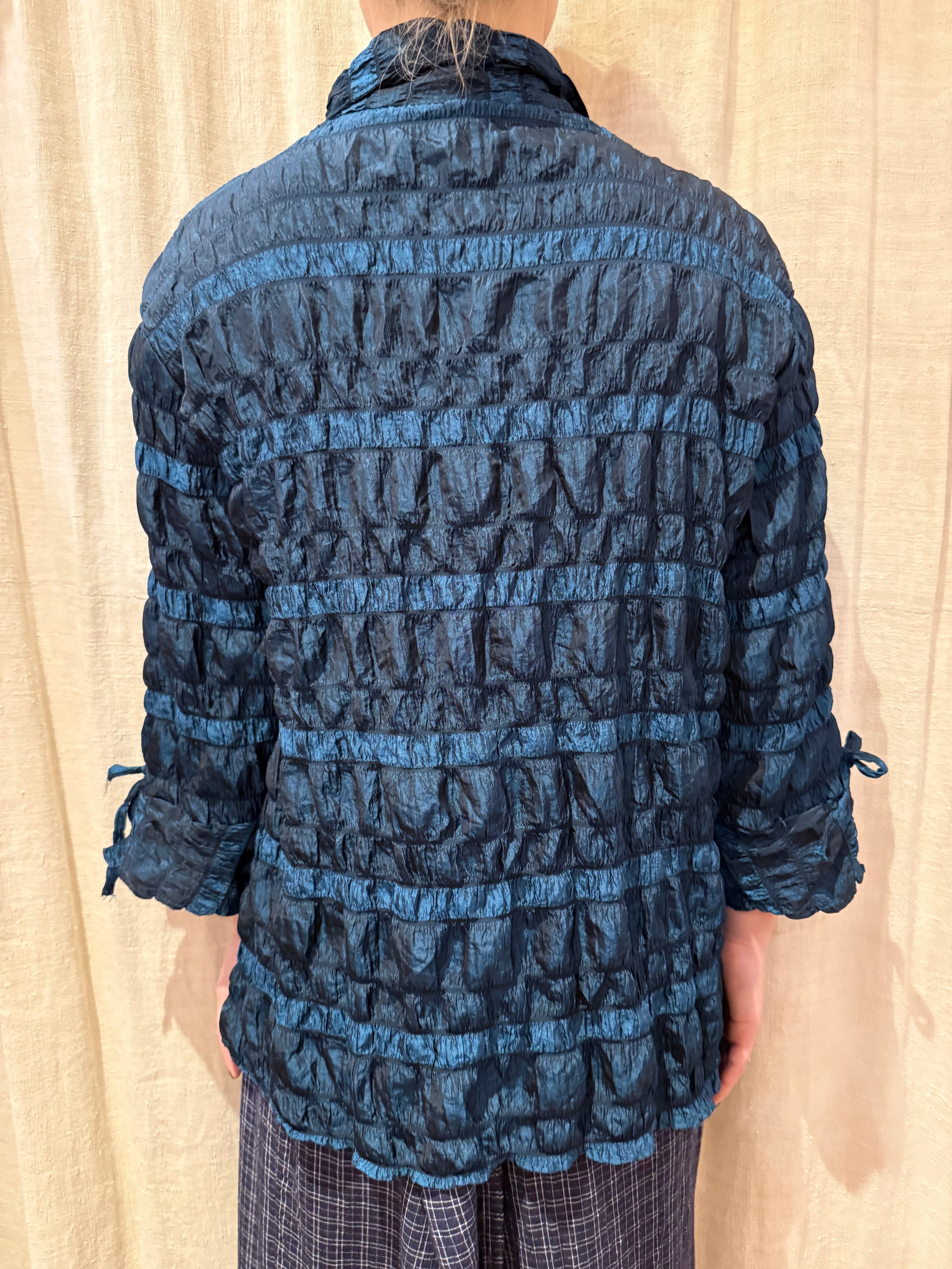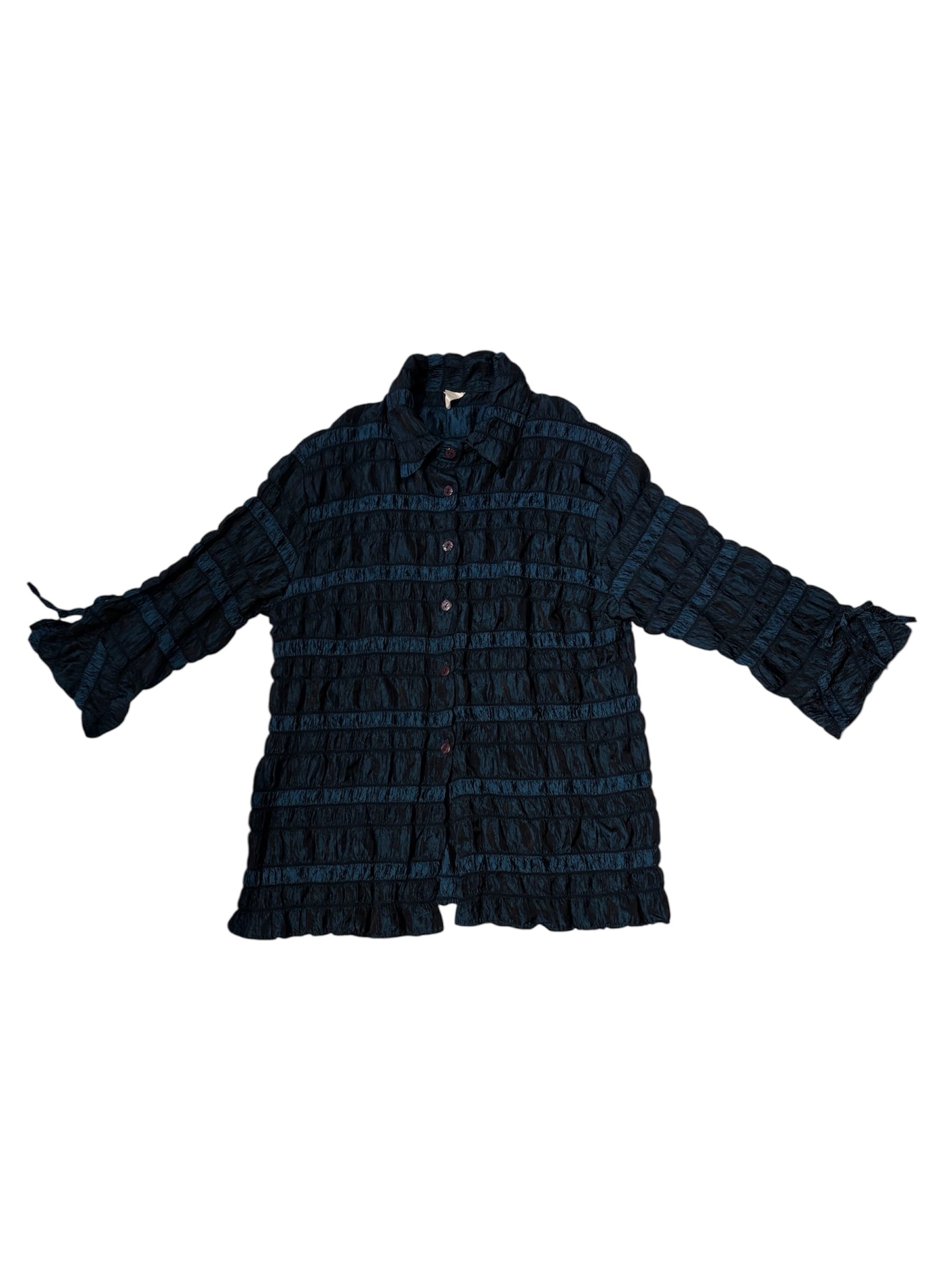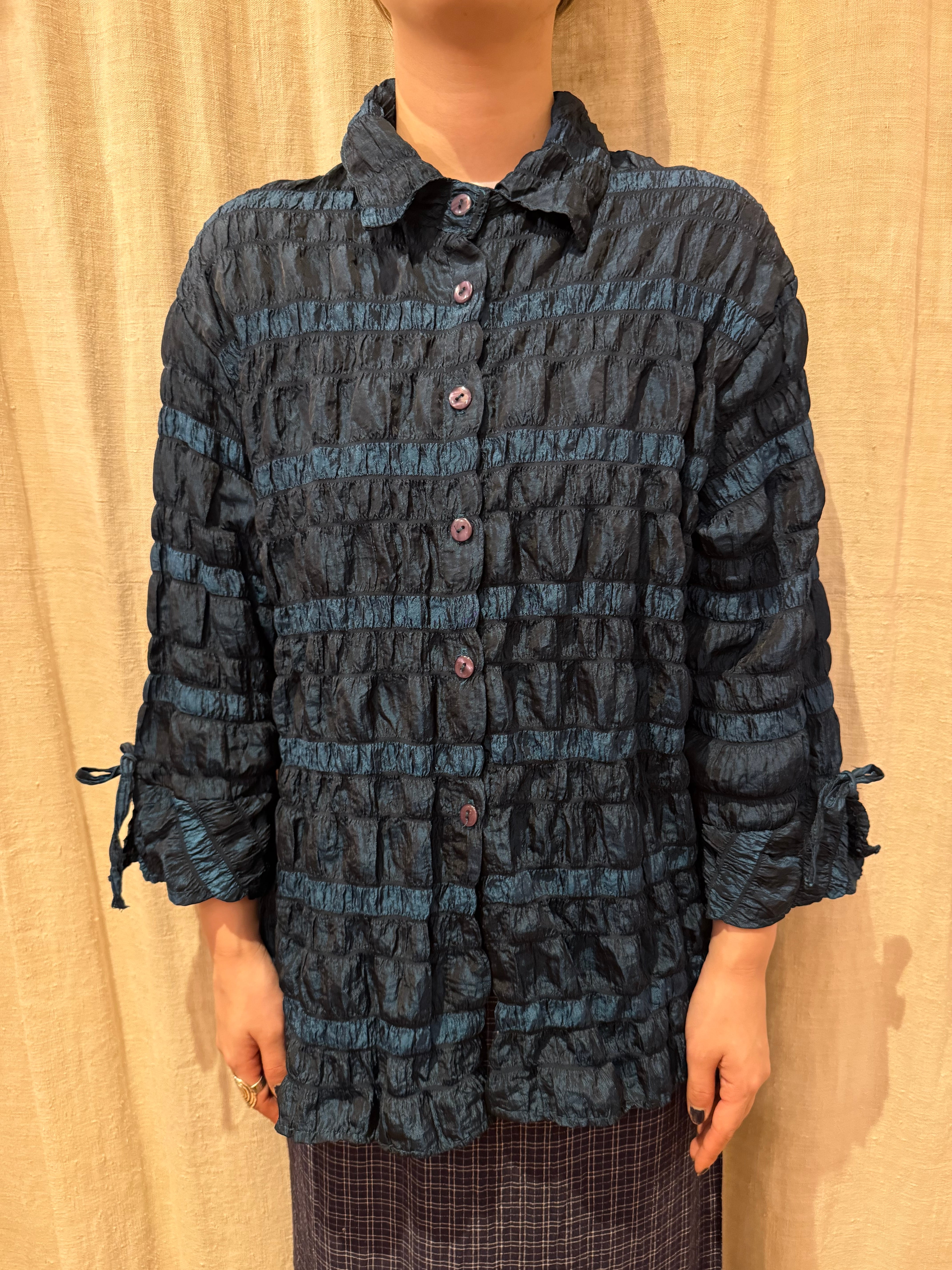 大きなシャーリング仕様のシャツです。落ち着いたカラーリングと光沢が少しあり、高級感があります。少し短めの袖丈ですので、袖でもレイヤードを楽しめそうです。一枚での着用の存在感はもちろん、羽織としてもワンポイントになります。ラフなスタイルがお好きな方にもオススメです。