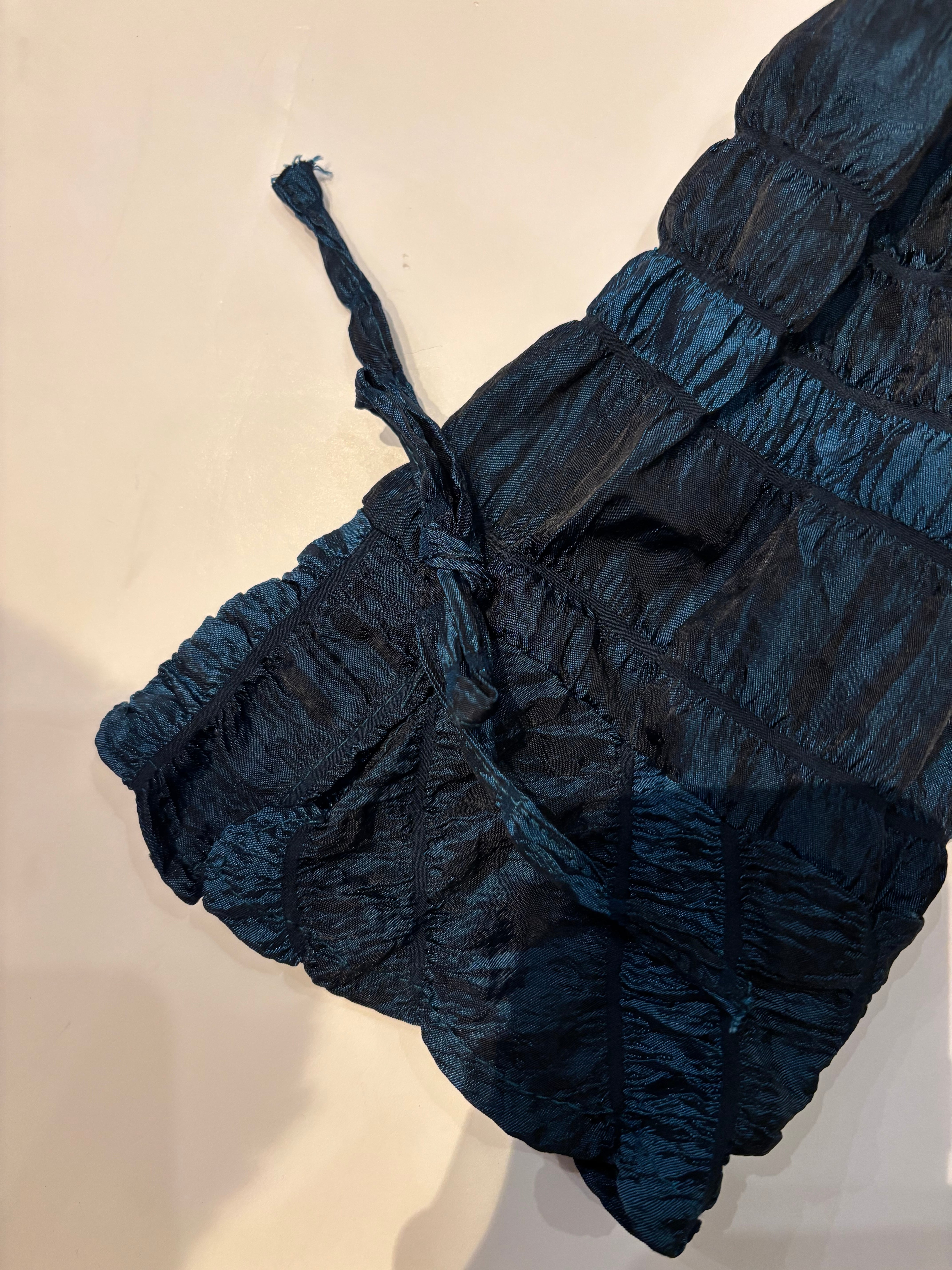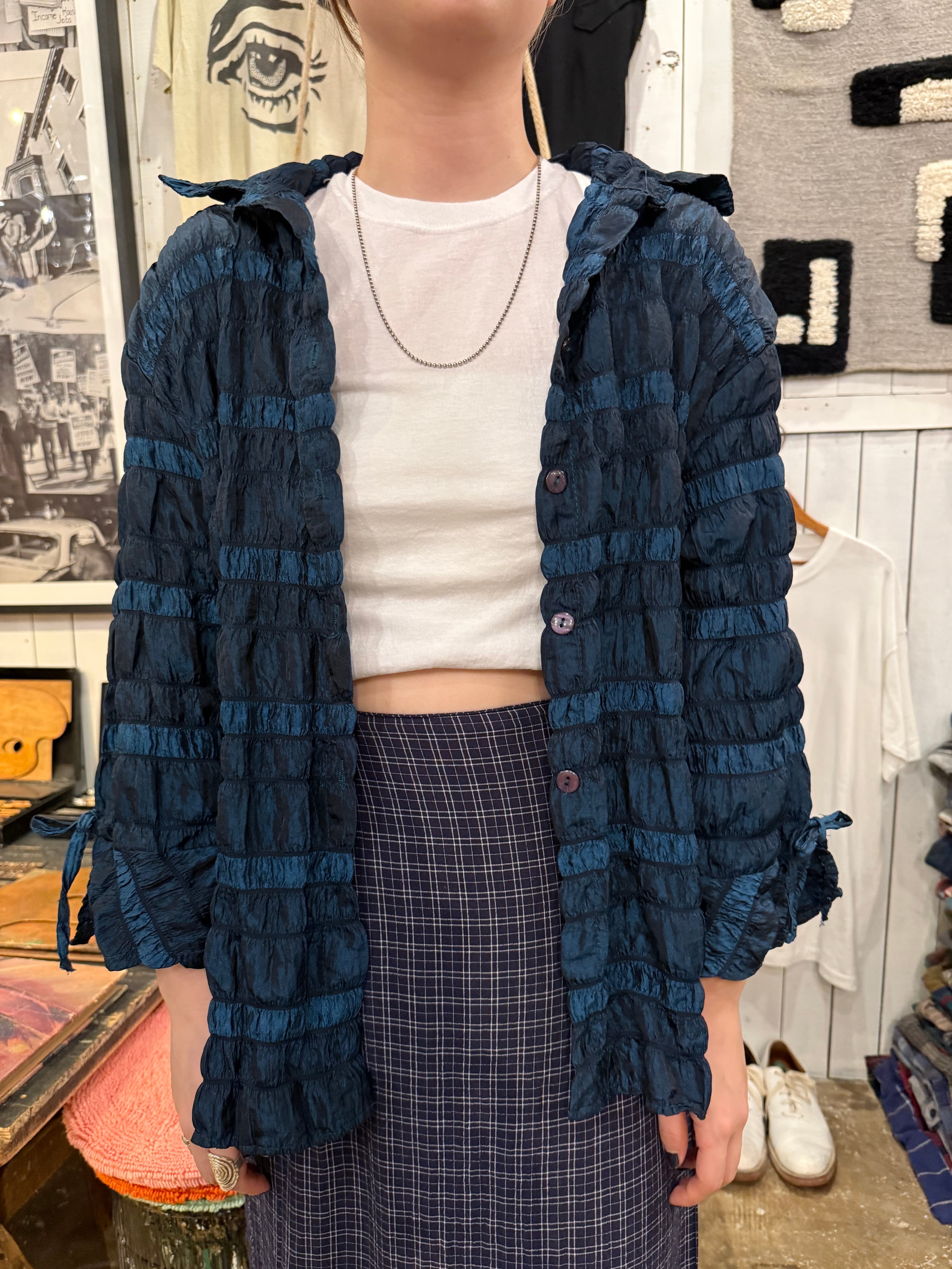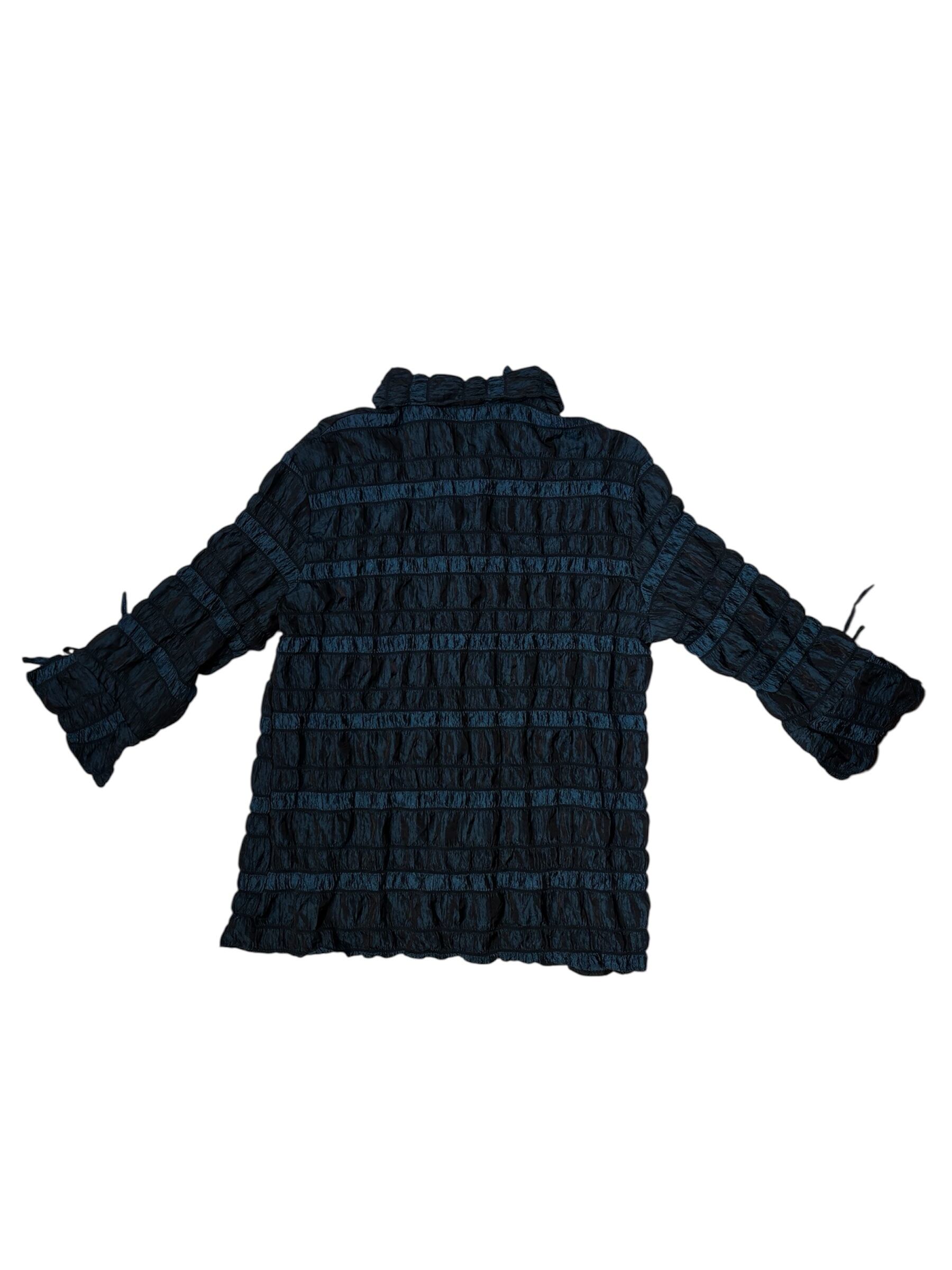 大きなシャーリング仕様のシャツです。落ち着いたカラーリングと光沢が少しあり、高級感があります。少し短めの袖丈ですので、袖でもレイヤードを楽しめそうです。一枚での着用の存在感はもちろん、羽織としてもワンポイントになります。ラフなスタイルがお好きな方にもオススメです。