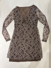 くすんだグレーのようなカラーに、淡いピンクの子花柄が可愛らしいドレス。胸元部分のレースはブラウンが入って二重になっていてリボンがついているのがポイントです。腕に透け感があるので華奢な雰囲気を演出できます。ネックの部分が深くブイになっているのでインナーも楽しめます。