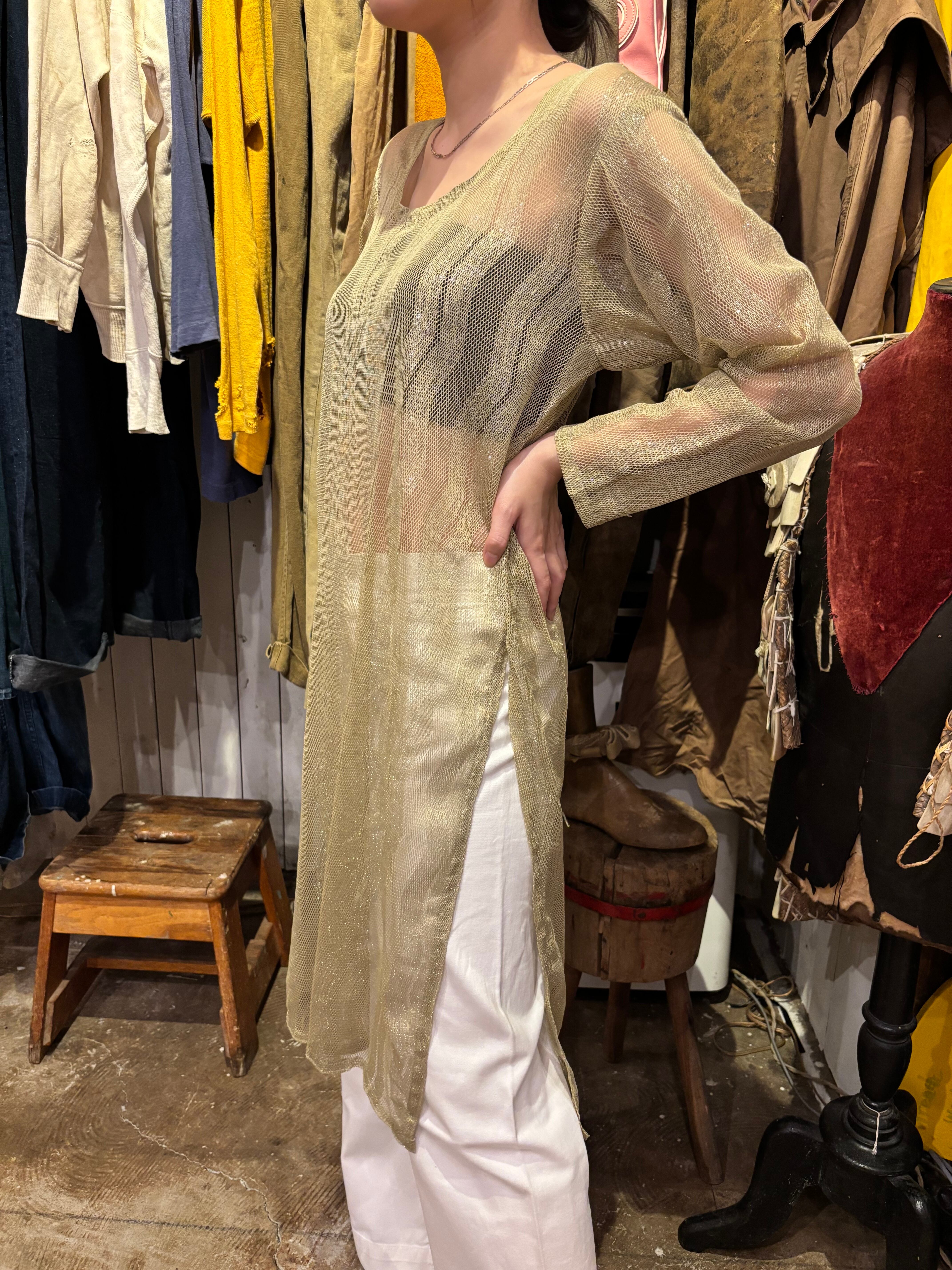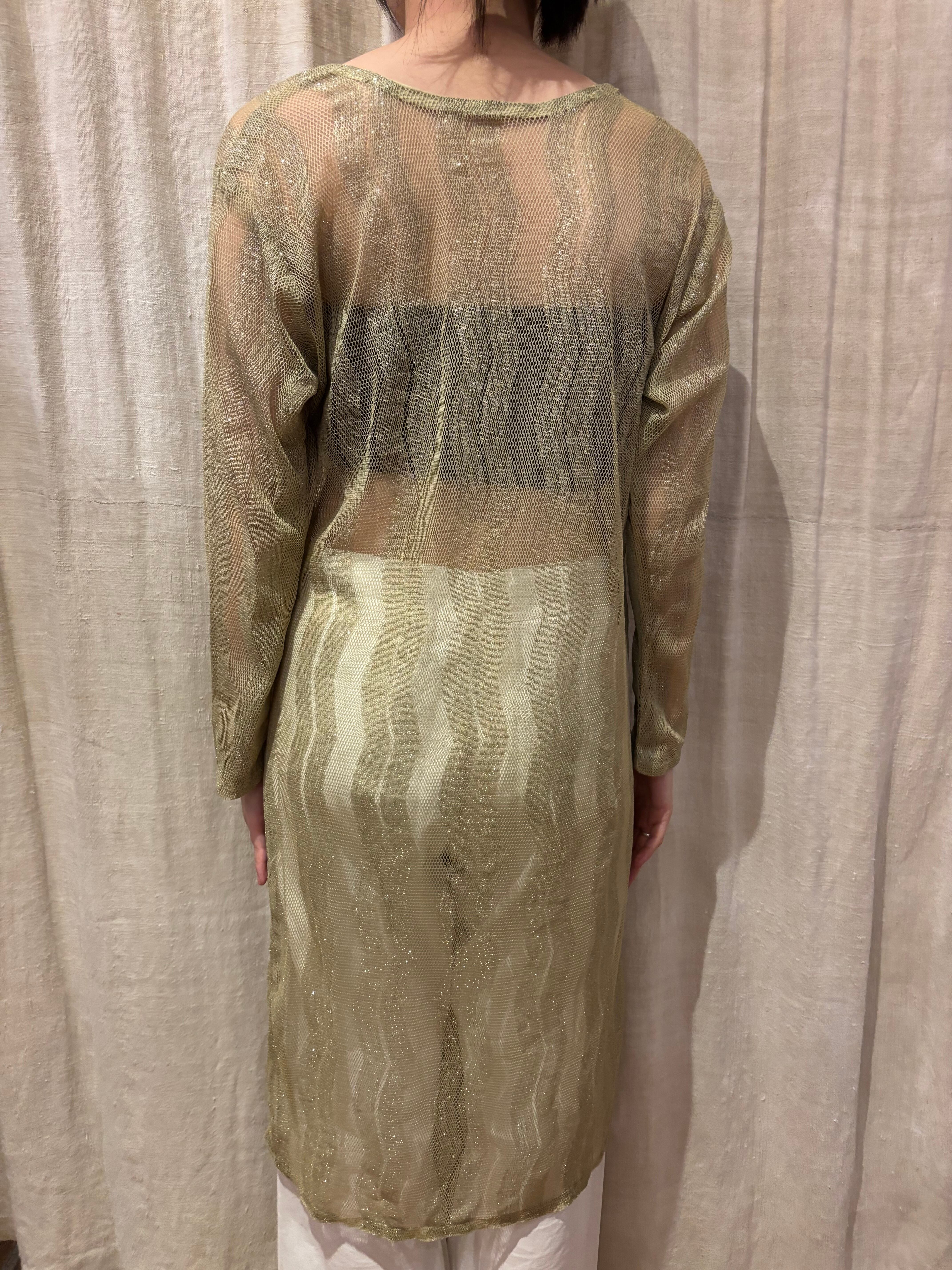 キラキラとした上品なゴールドのメッシュワンピースです。輝きが派手過ぎず、私服としても取り入れやすいです。うねうねとしたストライプの柄もあり、デザイン性もあります。メッシュ生地ですので様々なアイテムとレイヤードして楽しんでいただけます。