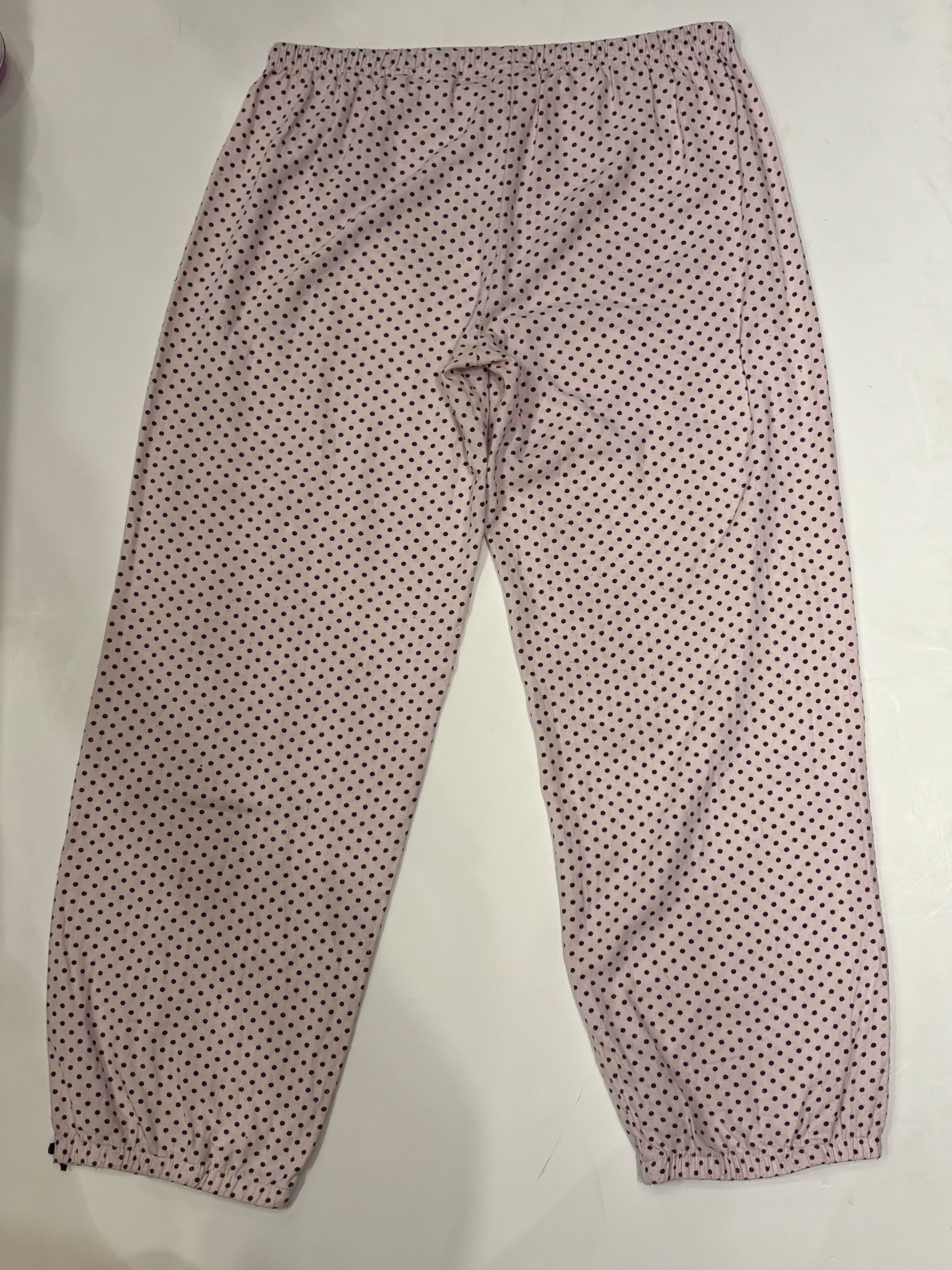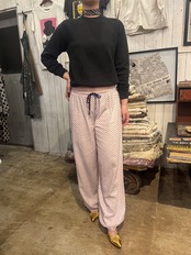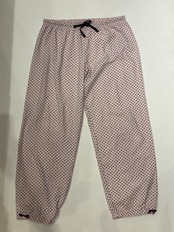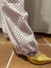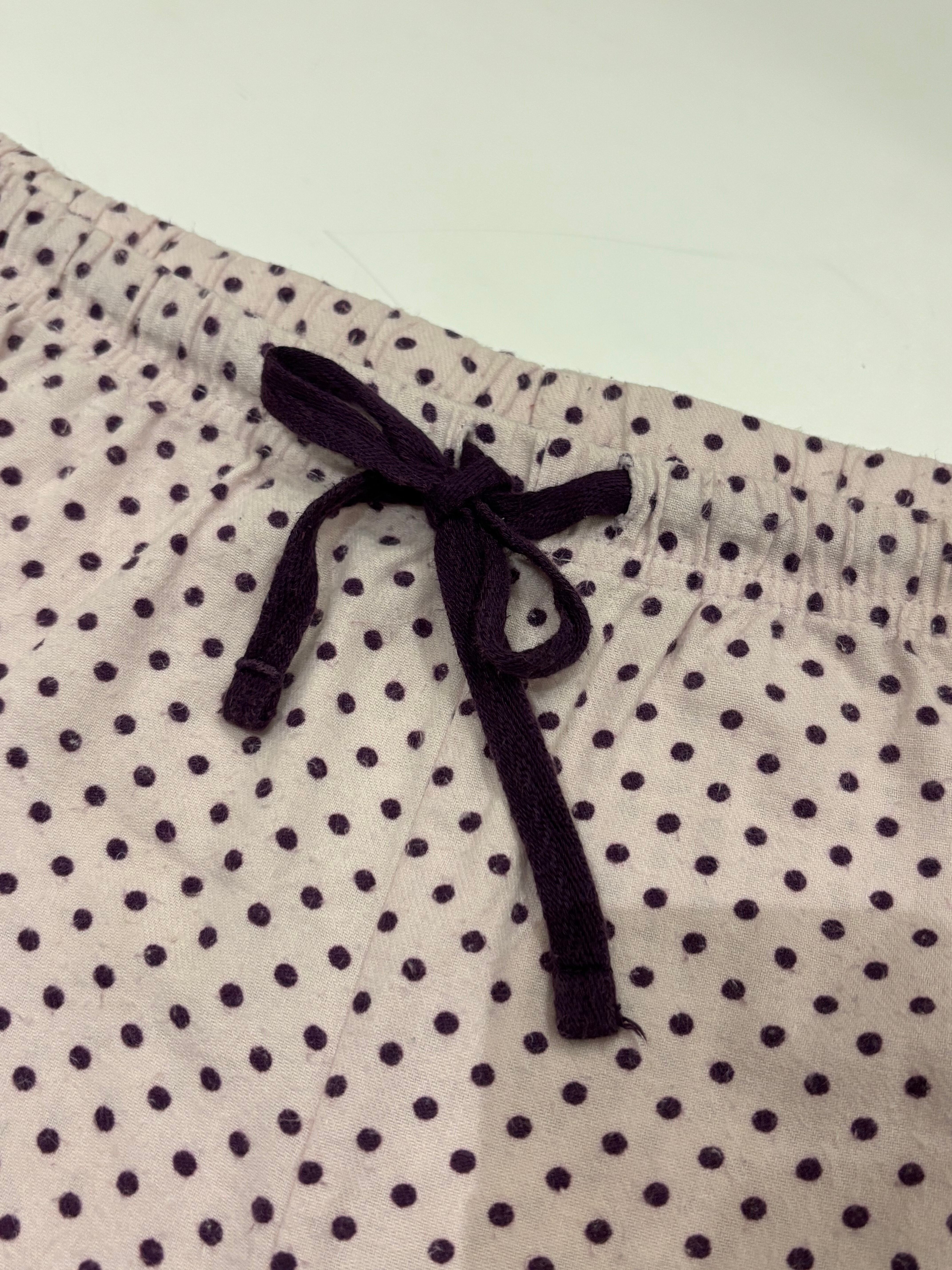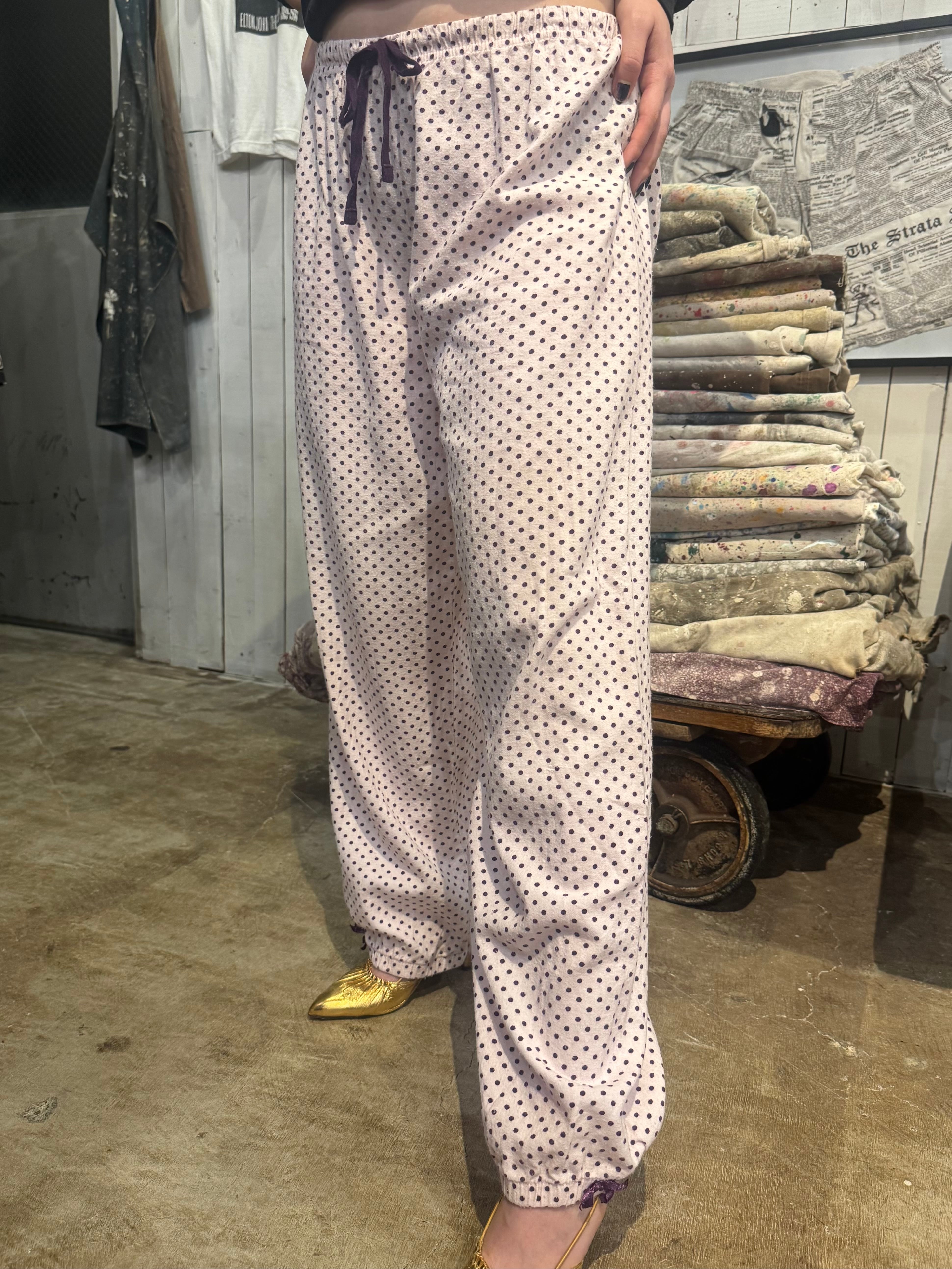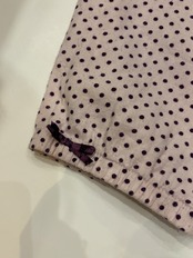 ピンクと紫のドット柄が可愛らしいパンツ。ネルの様な素材でこれからの季節にも使い勝手の良いラフな履き心地。裾についた小さなリボンもポイントです。ウエストが紐で絞れるので重ね着をしても使いやすいアイテムです。