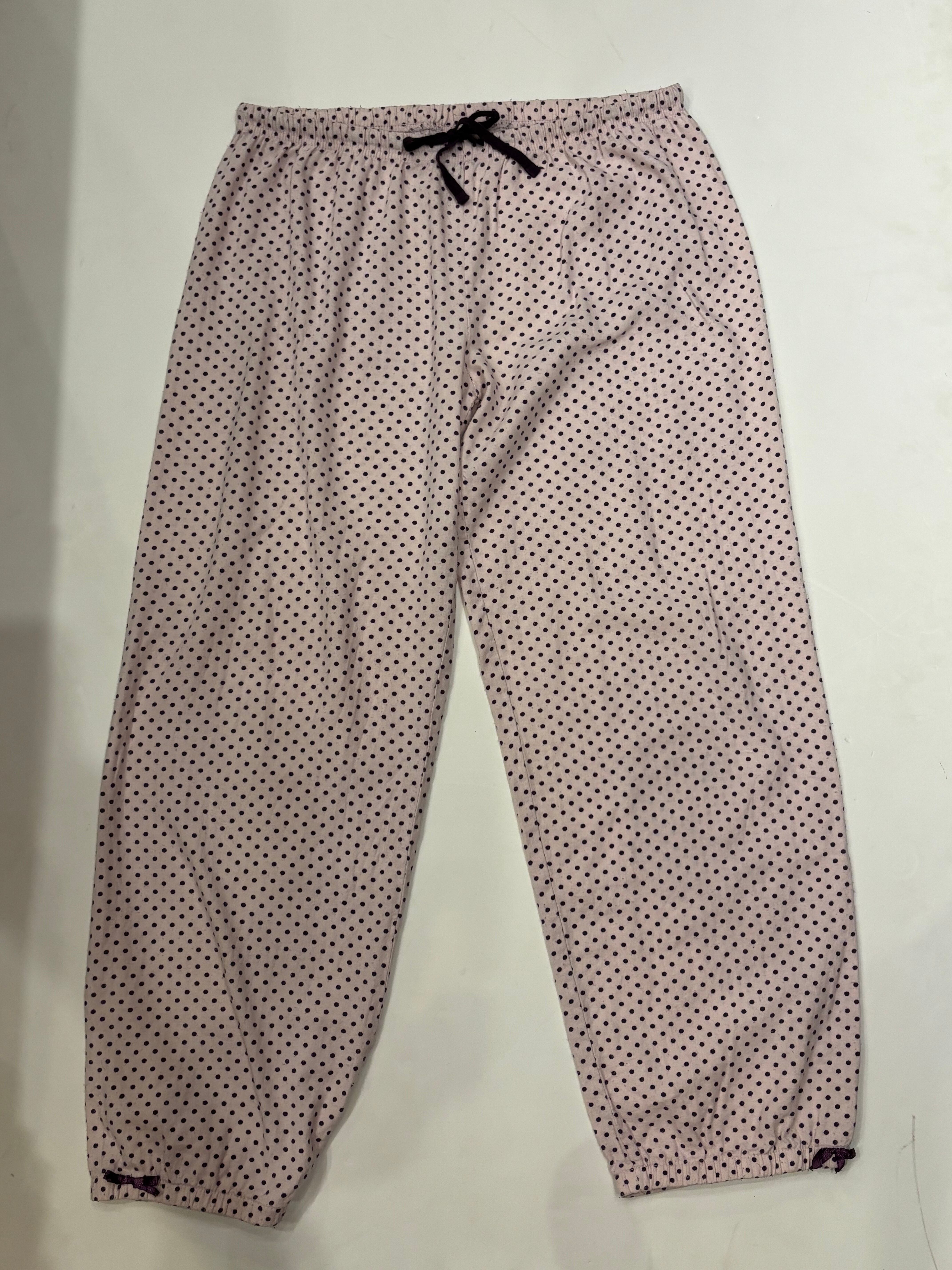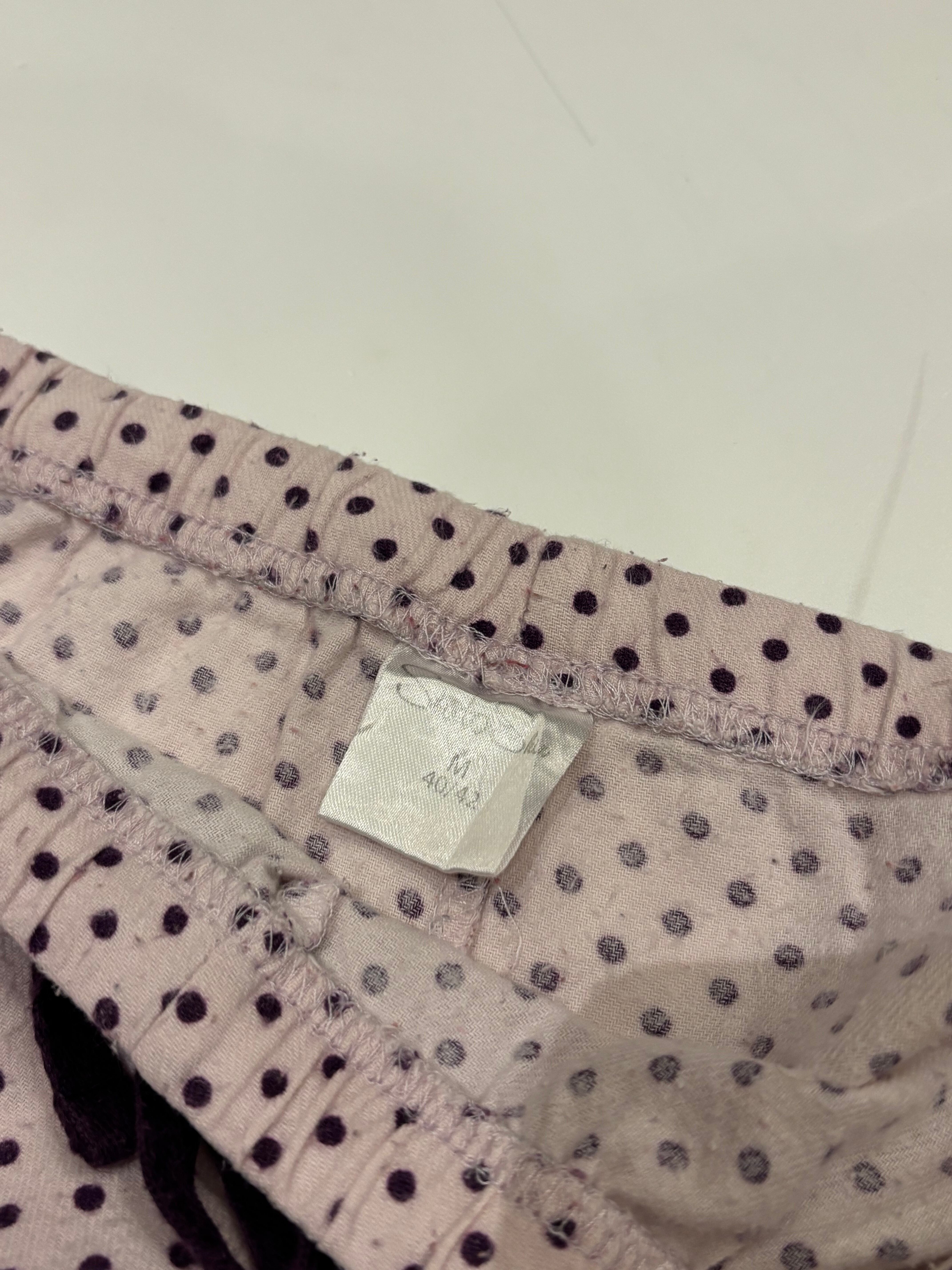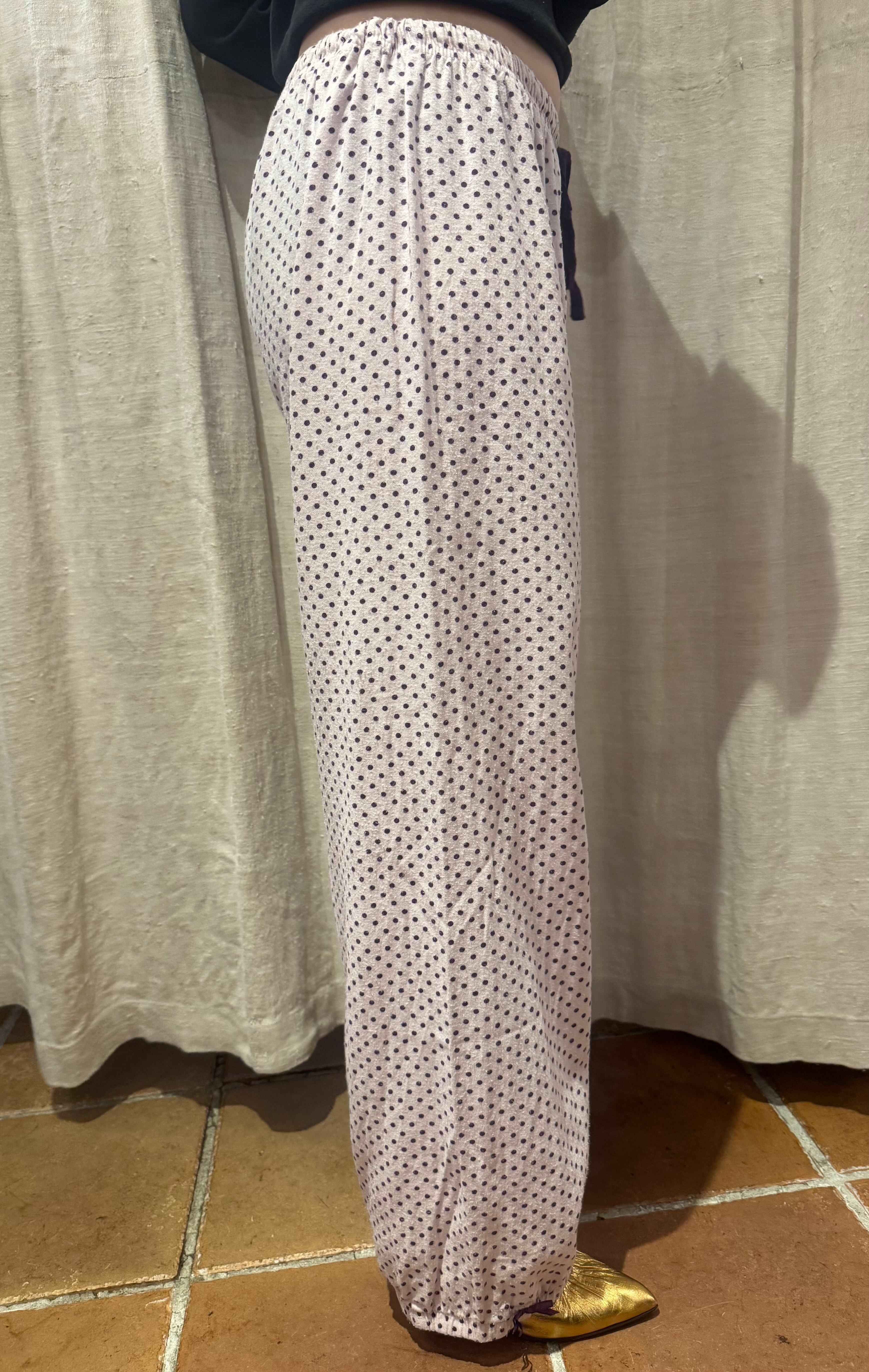 ピンクと紫のドット柄が可愛らしいパンツ。ネルの様な素材でこれからの季節にも使い勝手の良いラフな履き心地。裾についた小さなリボンもポイントです。ウエストが紐で絞れるので重ね着をしても使いやすいアイテムです。