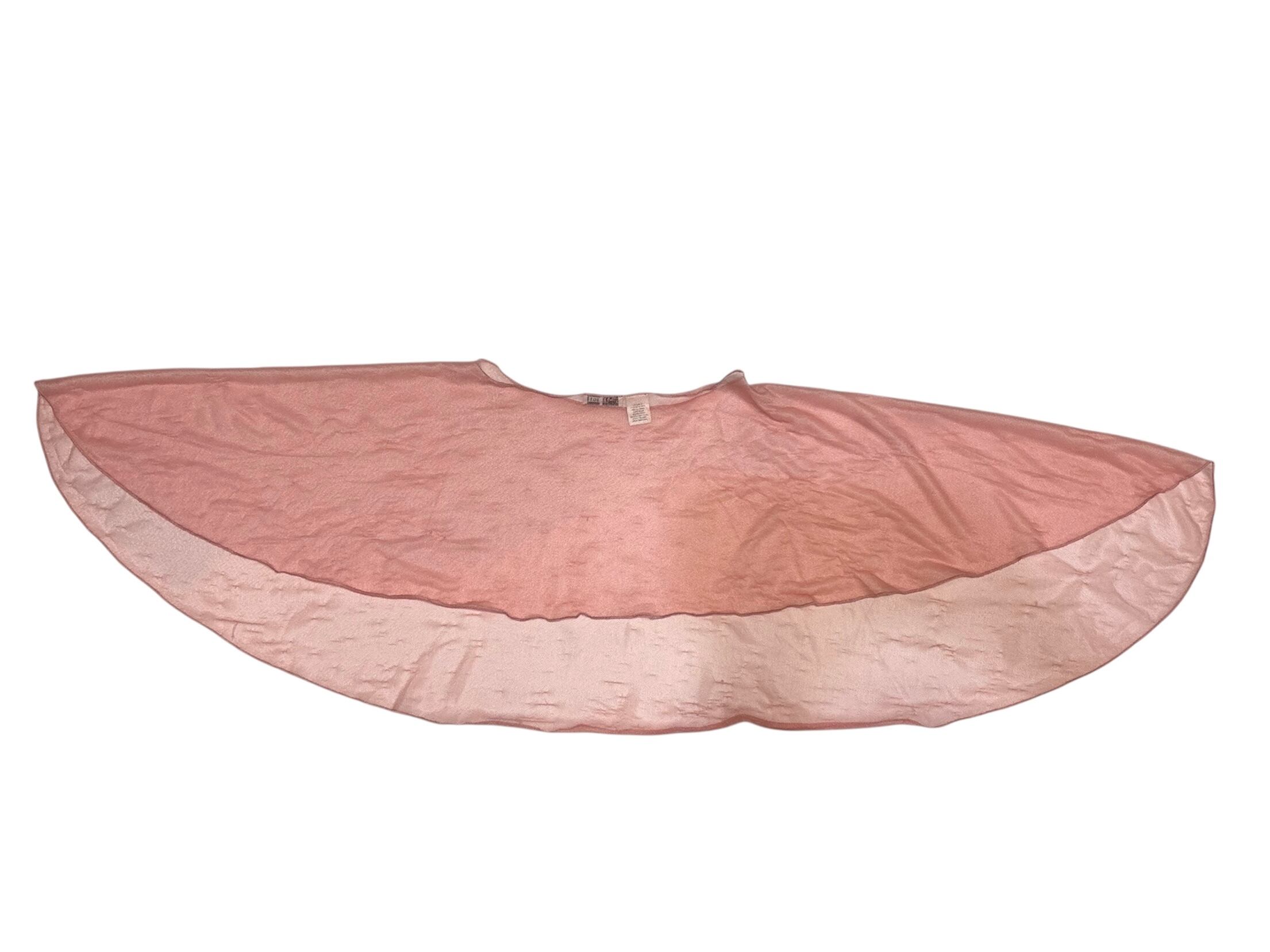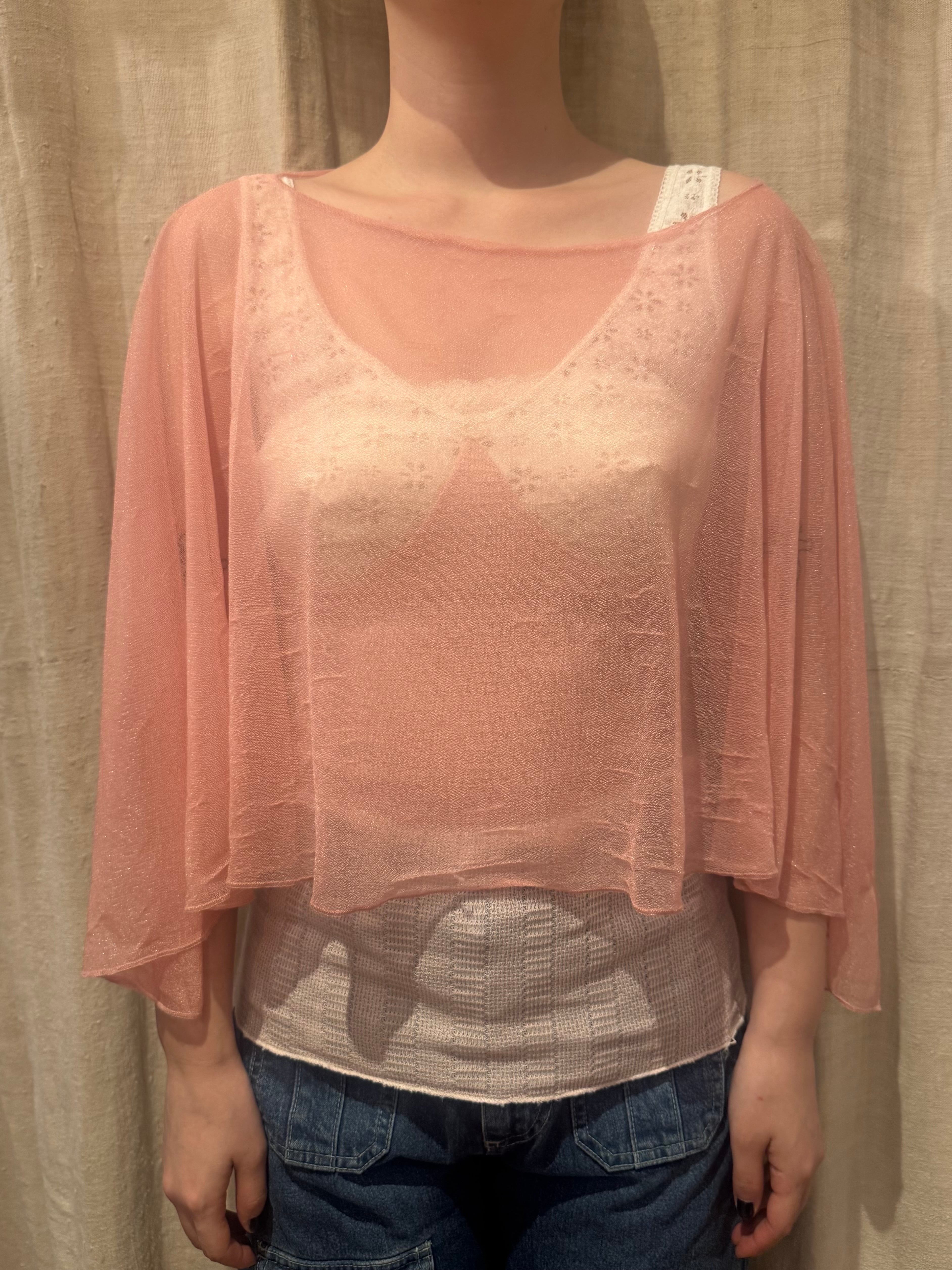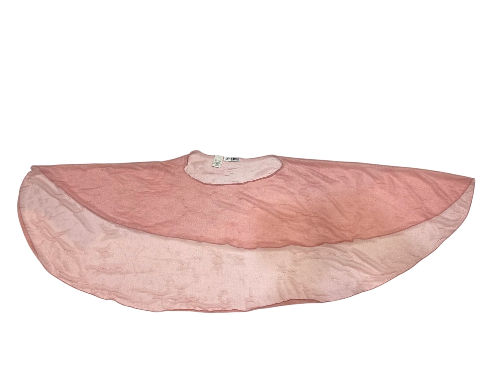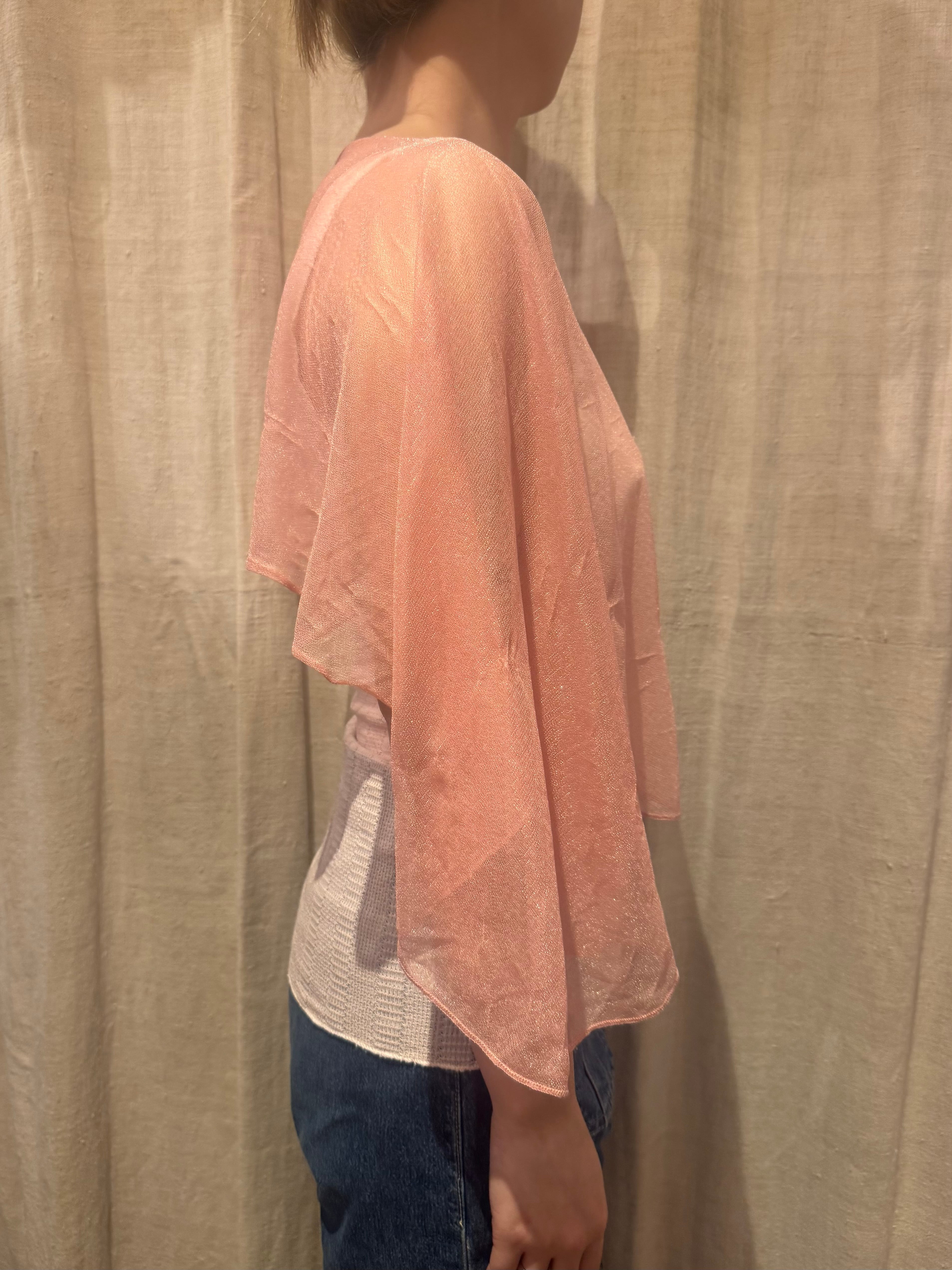 優しいピンクカラーのポンチョです。シアー素材で動いた時にひらひらと美しいです。ラメが含まれておりキラキラしています。チクチクせず、肌触りの良い素材感です。前後で着丈の長さが違うのもアクセントになっていて素敵です。