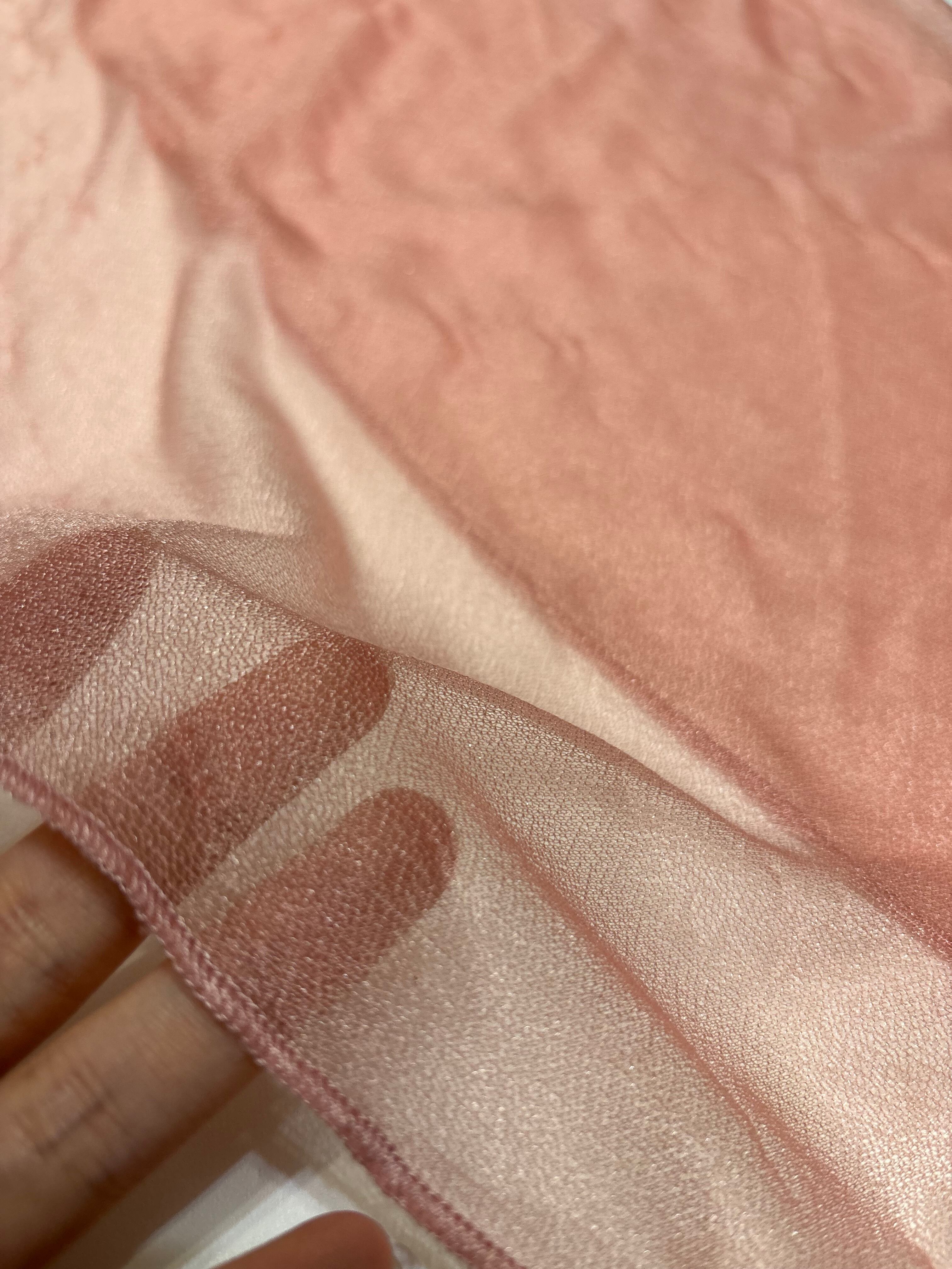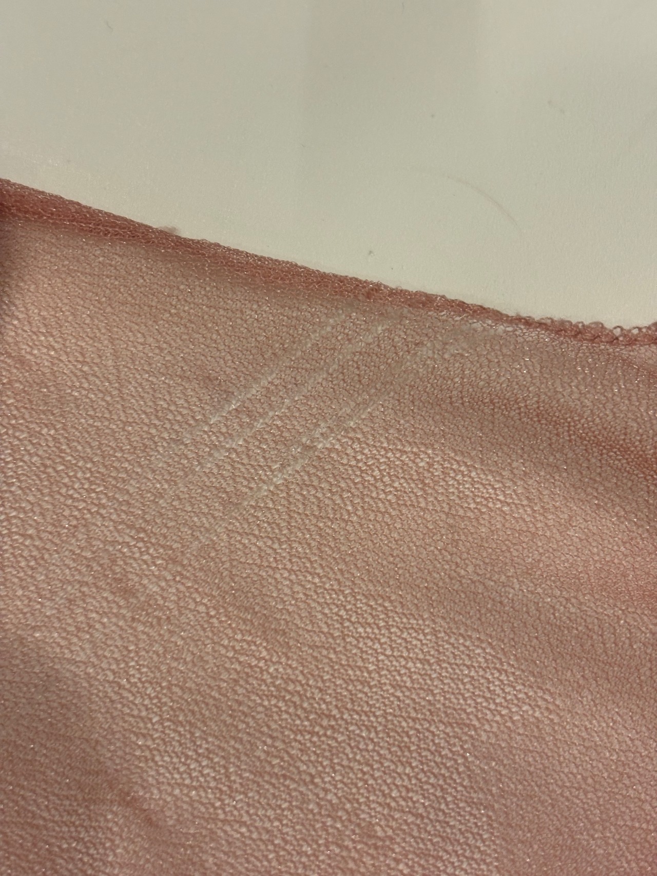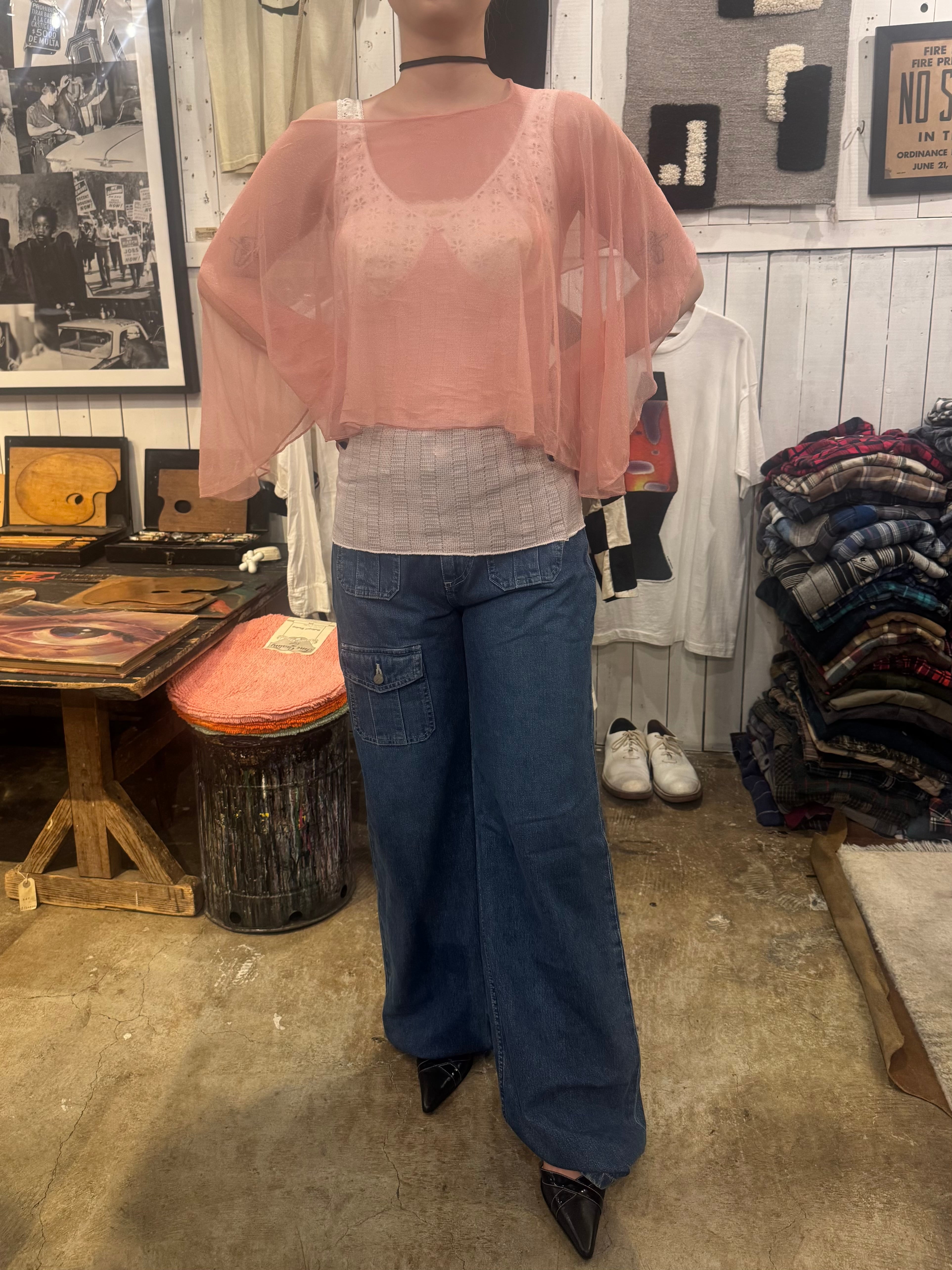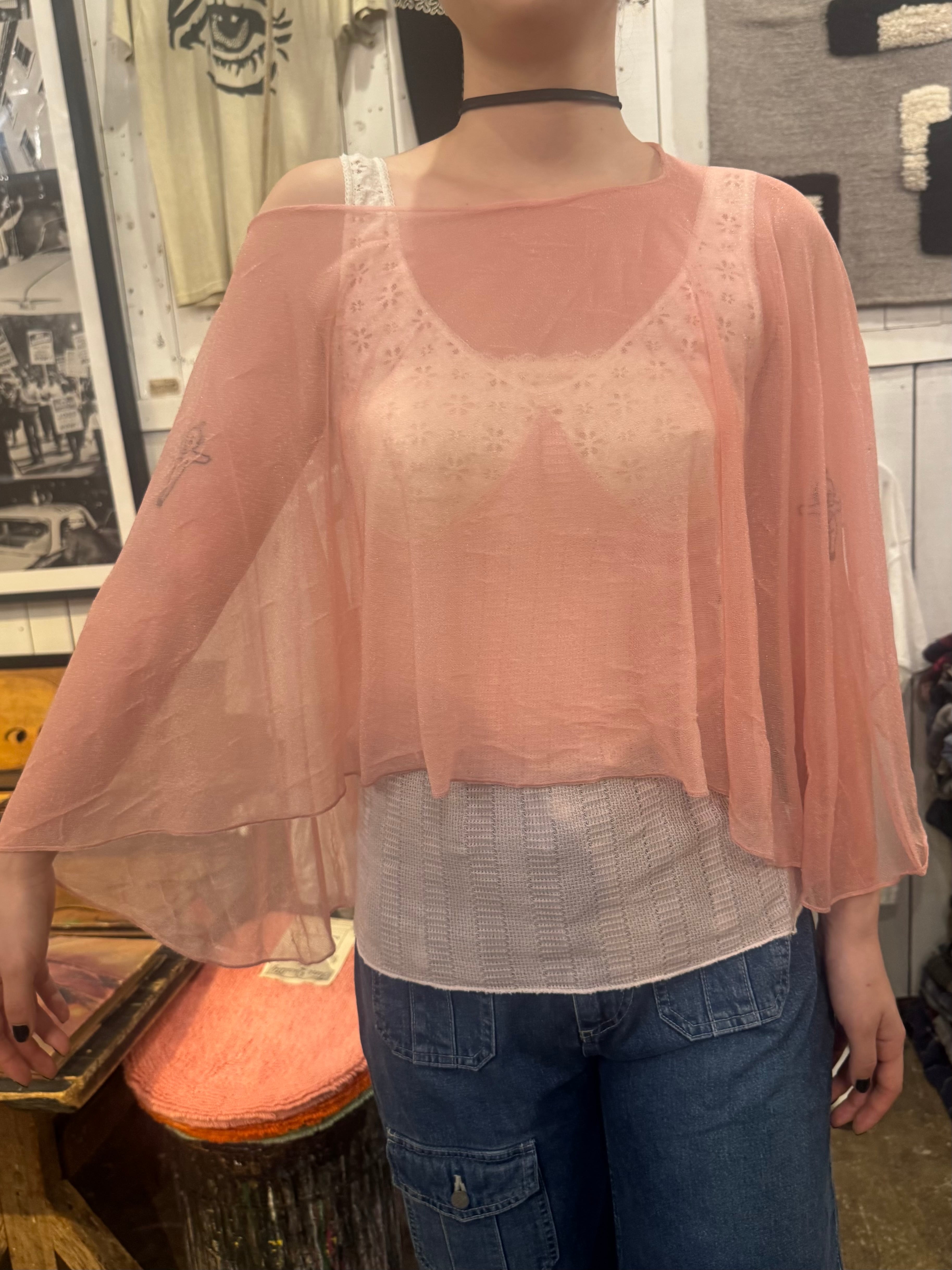 優しいピンクカラーのポンチョです。シアー素材で動いた時にひらひらと美しいです。ラメが含まれておりキラキラしています。チクチクせず、肌触りの良い素材感です。前後で着丈の長さが違うのもアクセントになっていて素敵です。