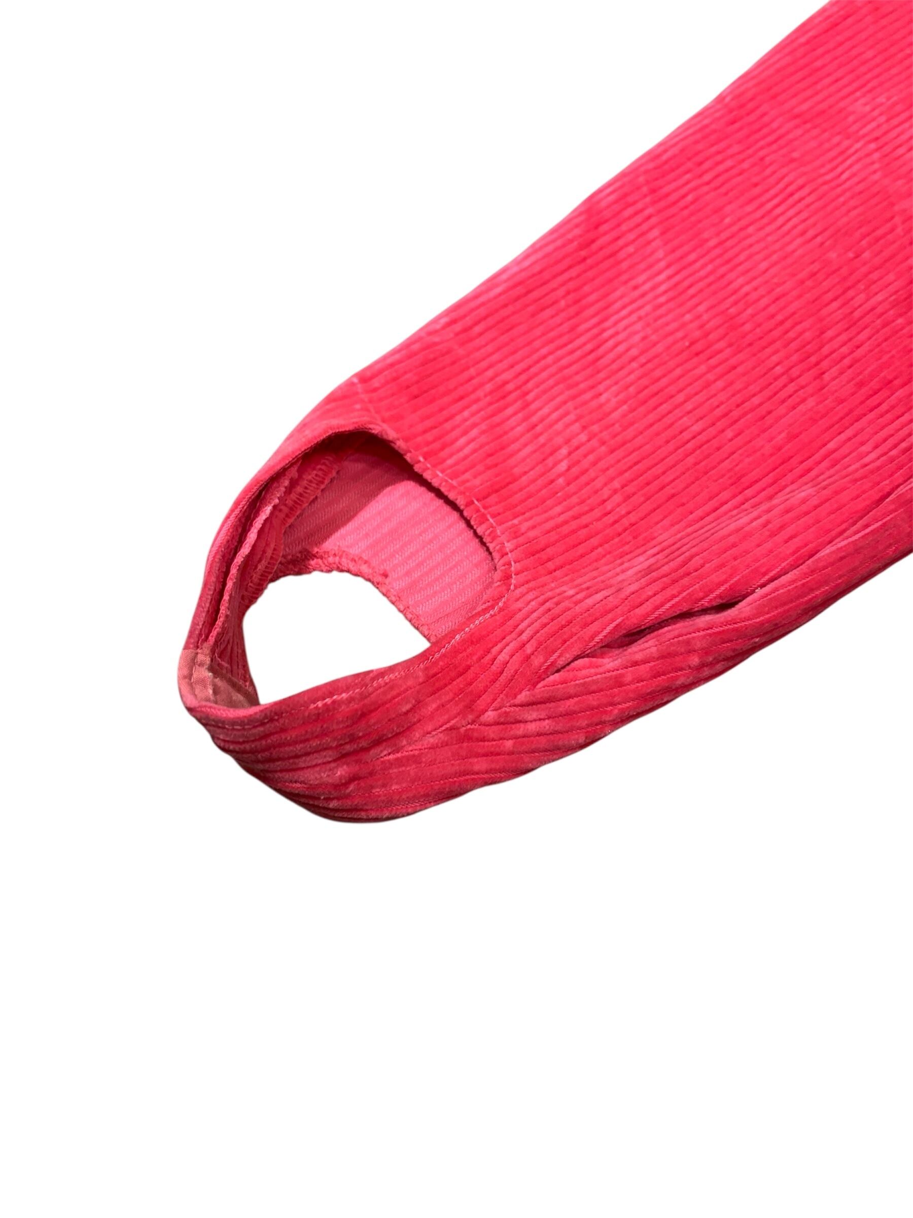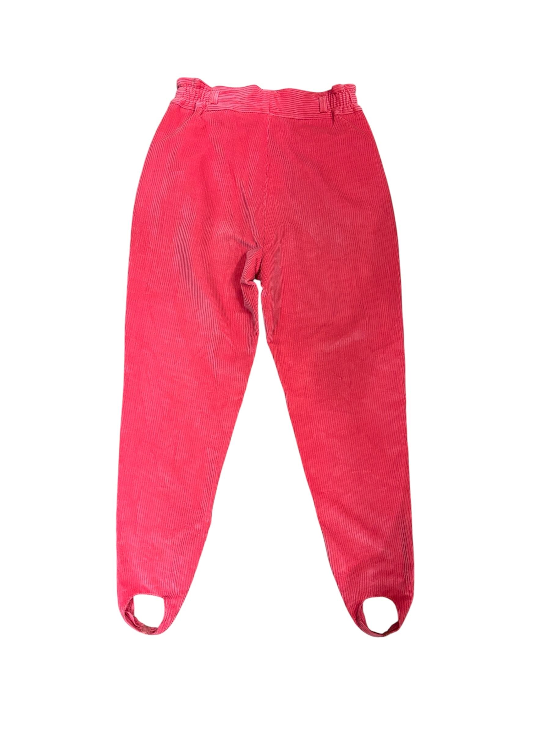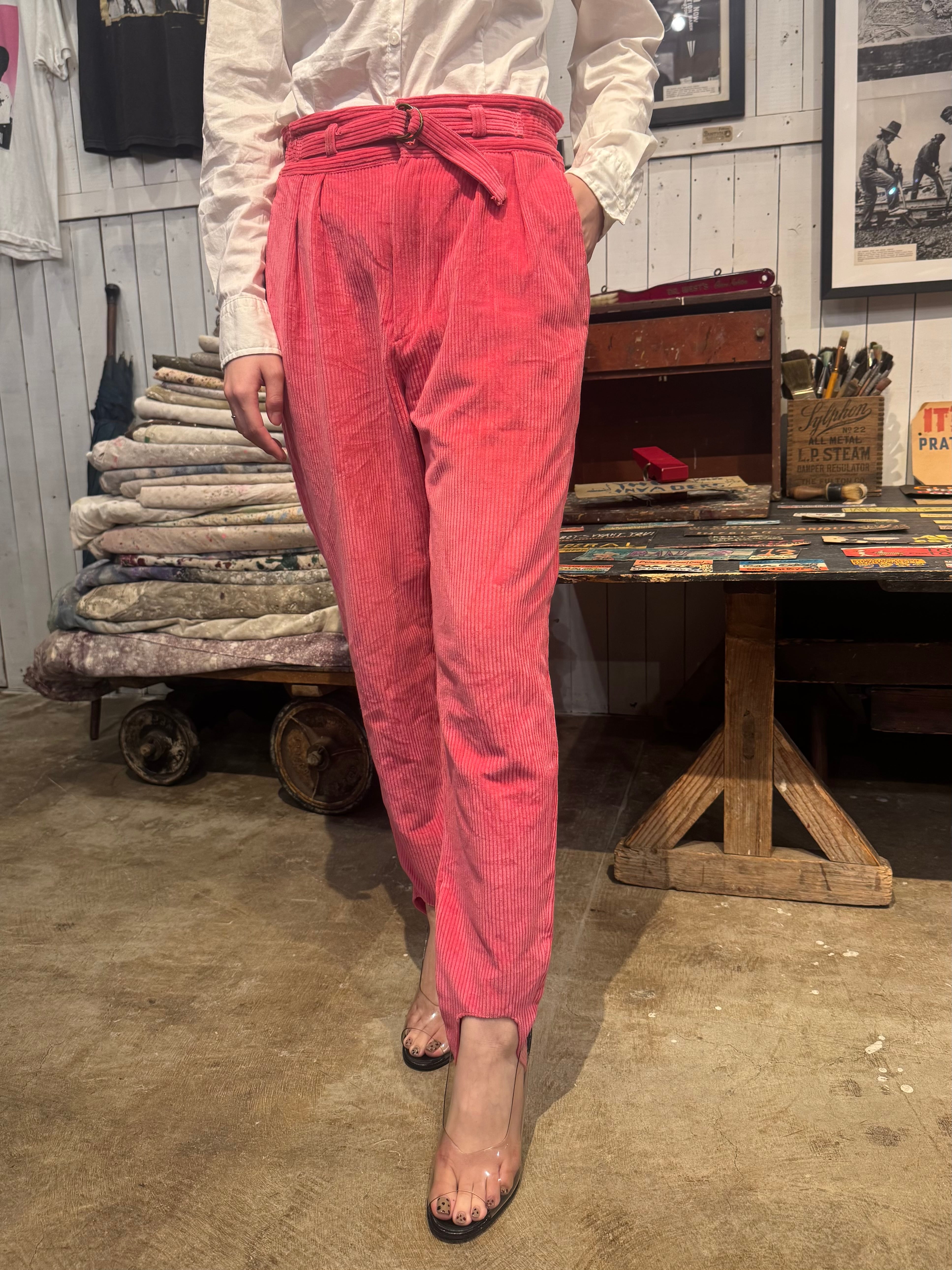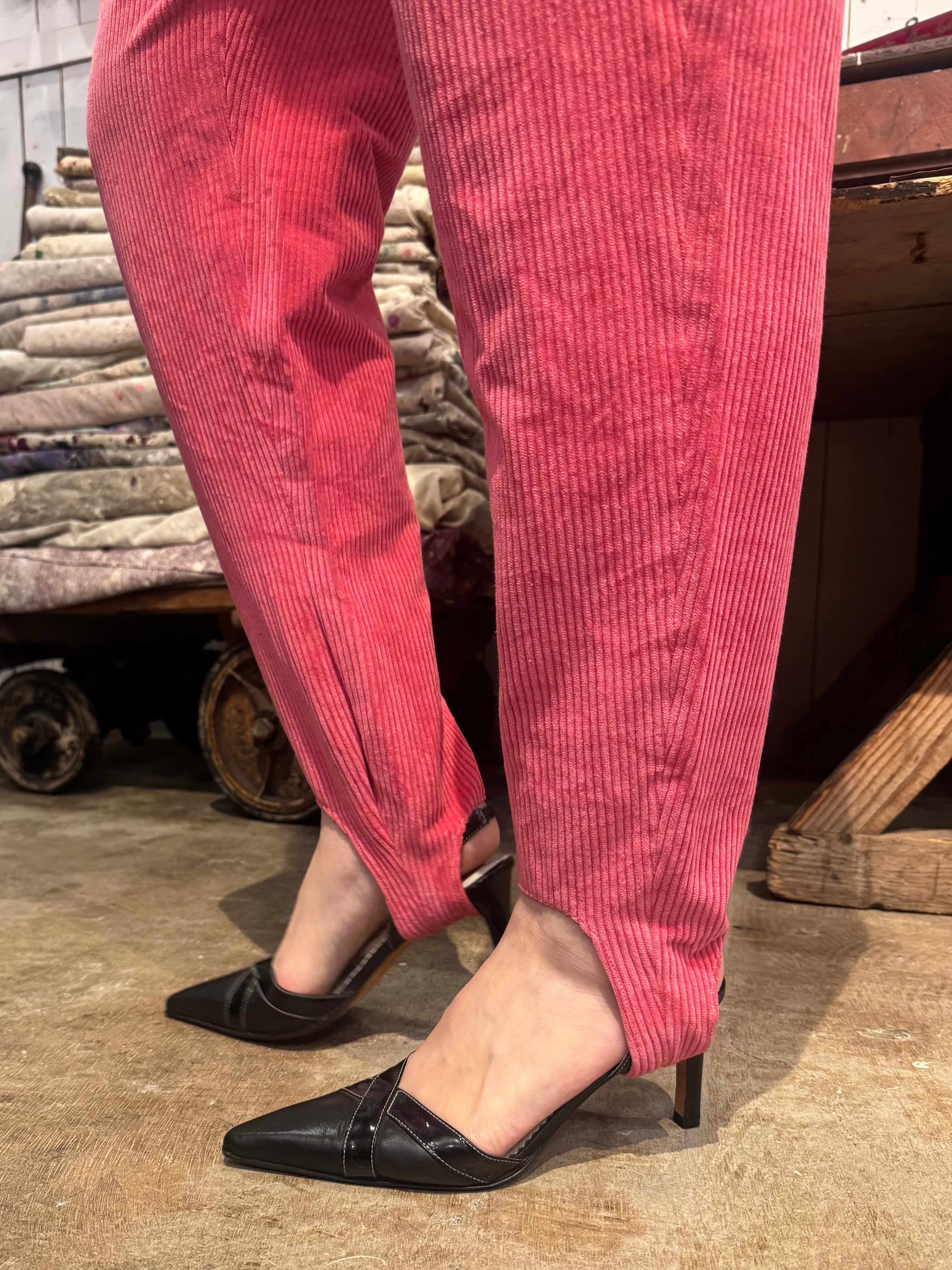 ピンクカラーが目を惹くコーデュロイのパンツです。フットストラップ仕様になっており、かかとに引っ掛けて着用できます。着用画像のようにヒールに引っ掛けるのもとても可愛いです。テーパードシルエットなのでインスタイルでスッキリと着用するのもオススメです。