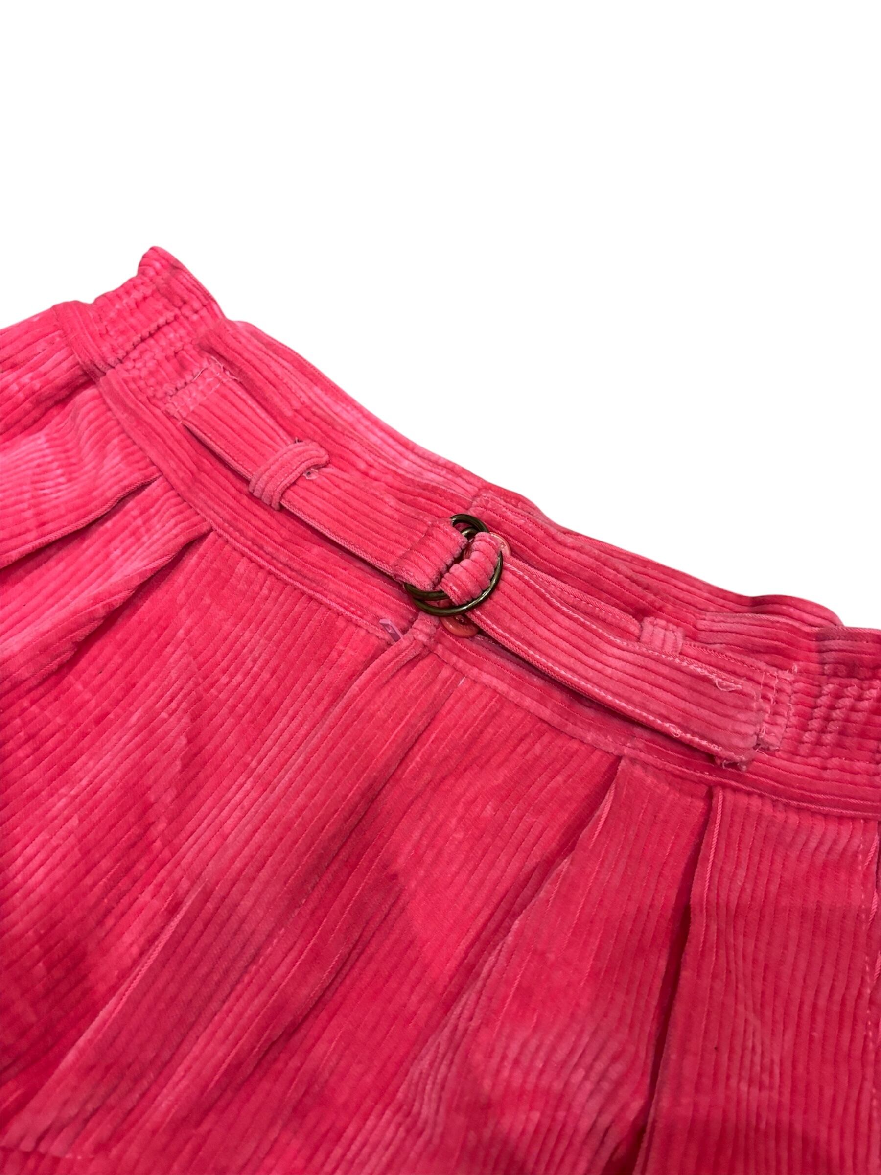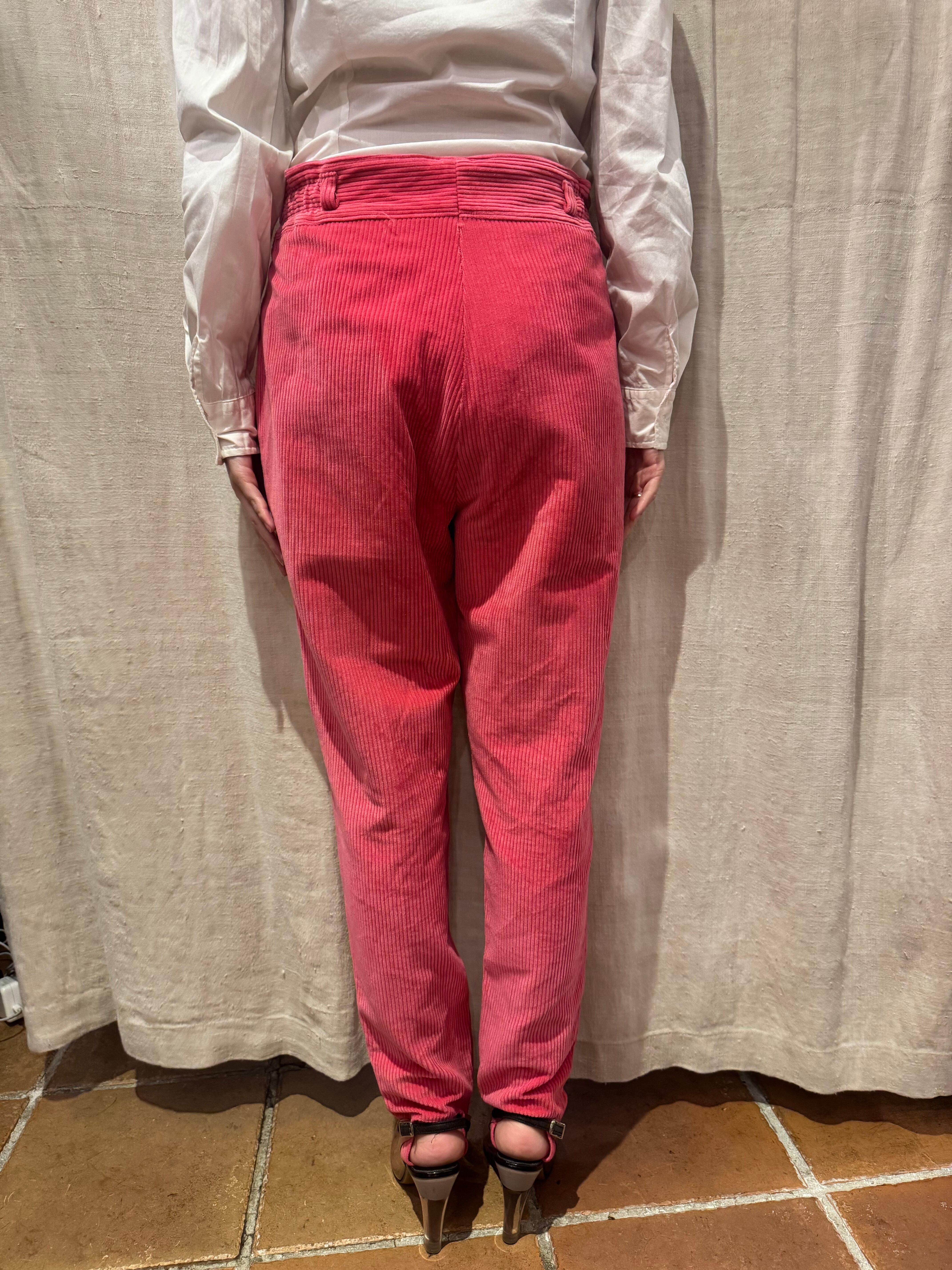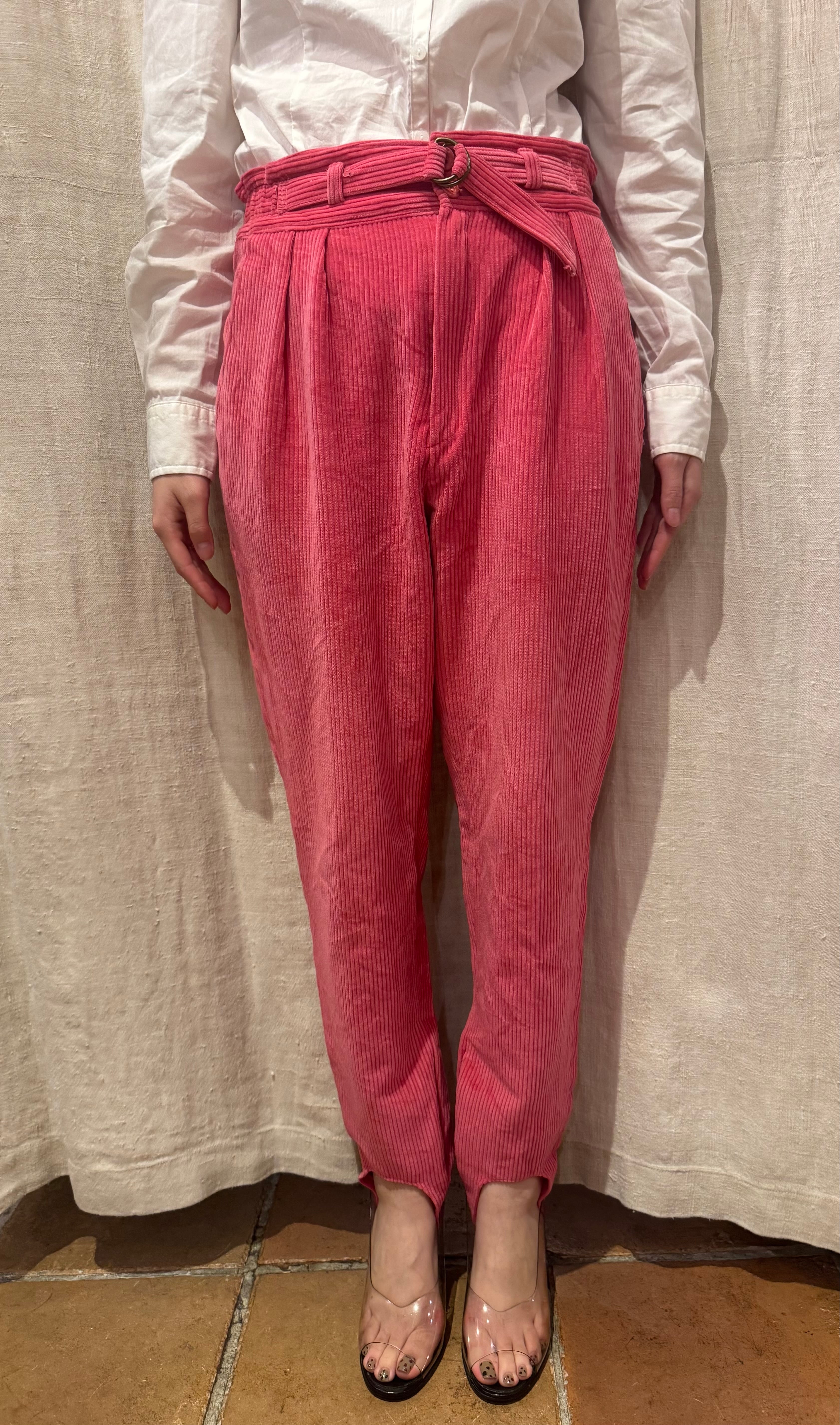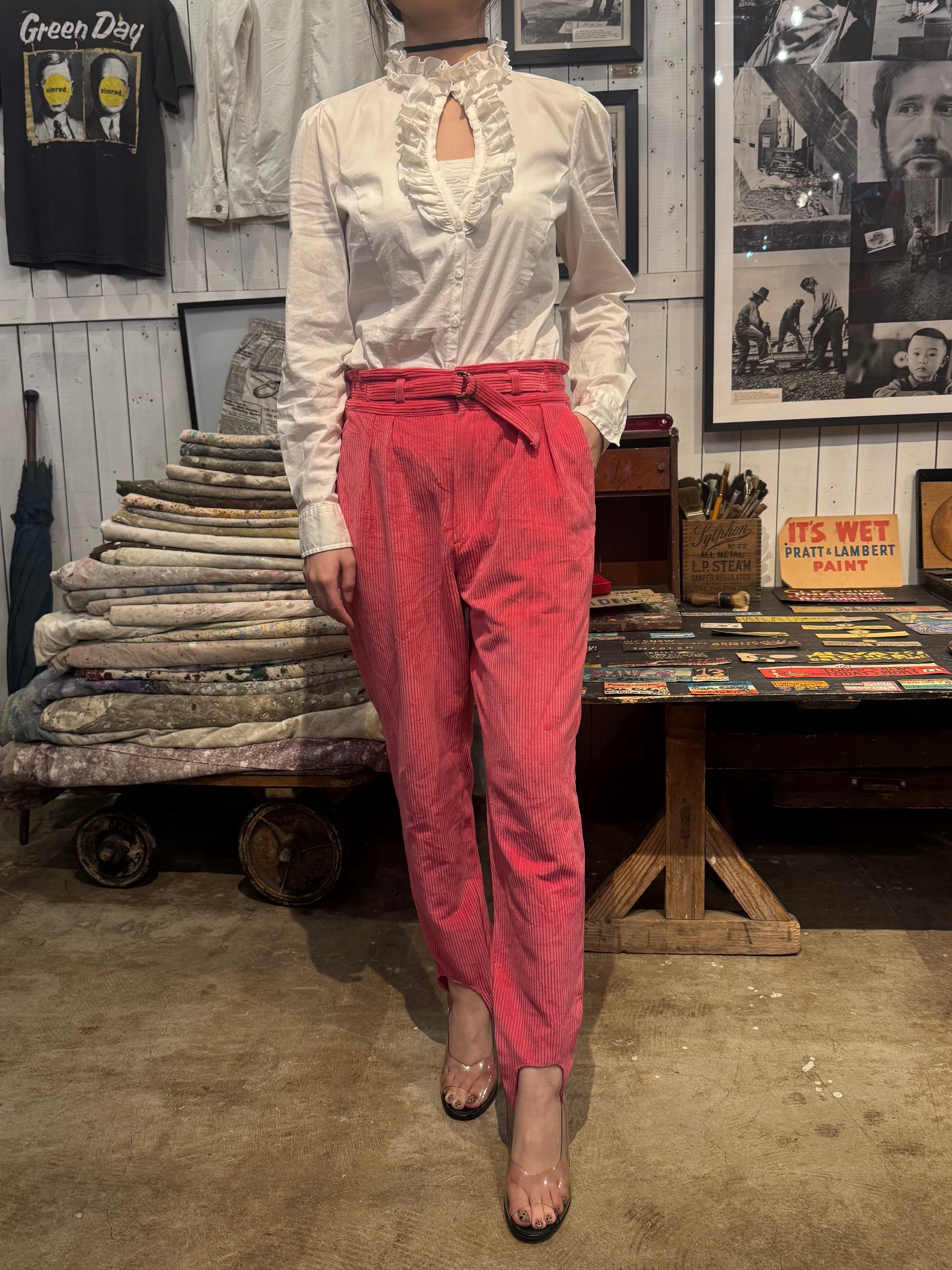 ピンクカラーが目を惹くコーデュロイのパンツです。フットストラップ仕様になっており、かかとに引っ掛けて着用できます。着用画像のようにヒールに引っ掛けるのもとても可愛いです。テーパードシルエットなのでインスタイルでスッキリと着用するのもオススメです。