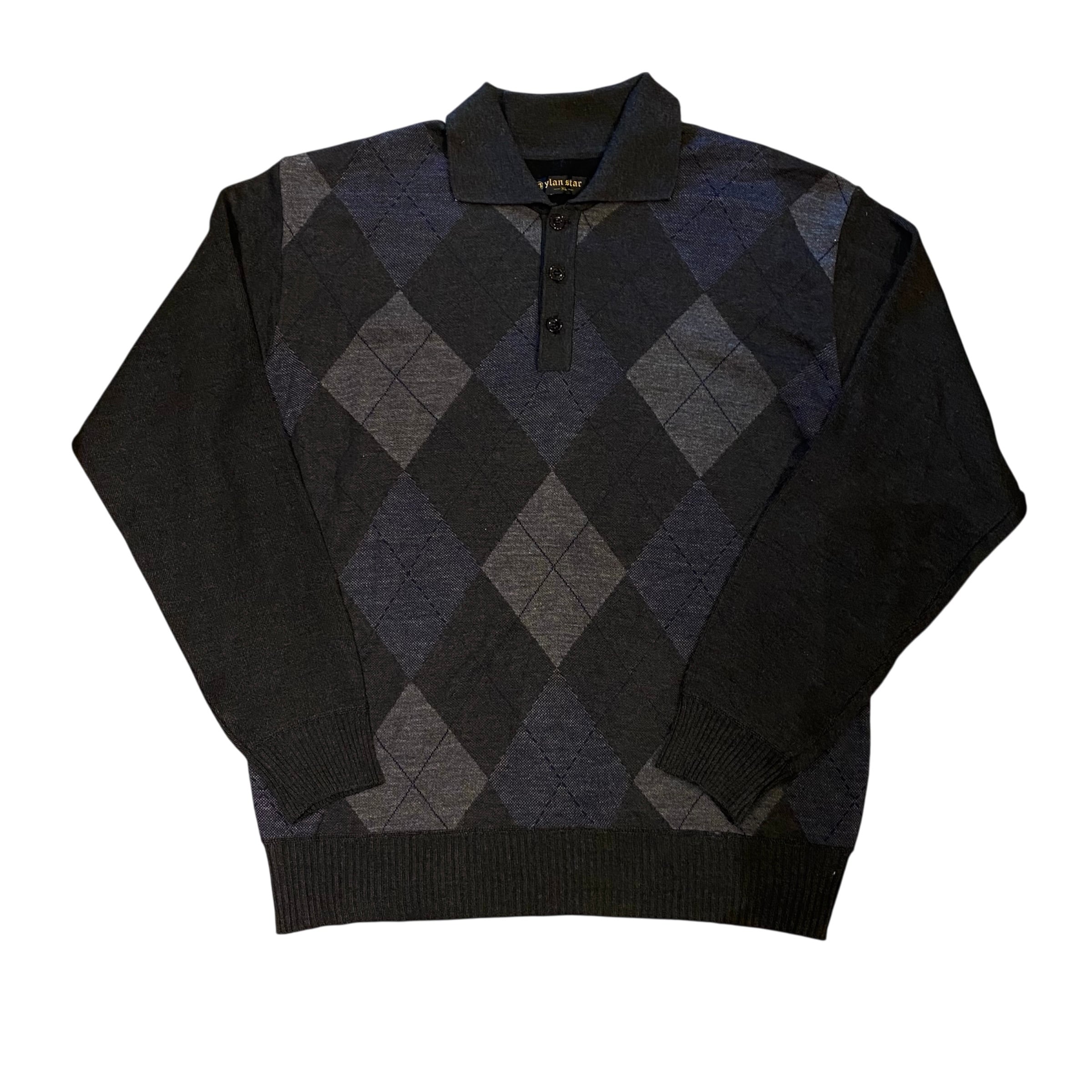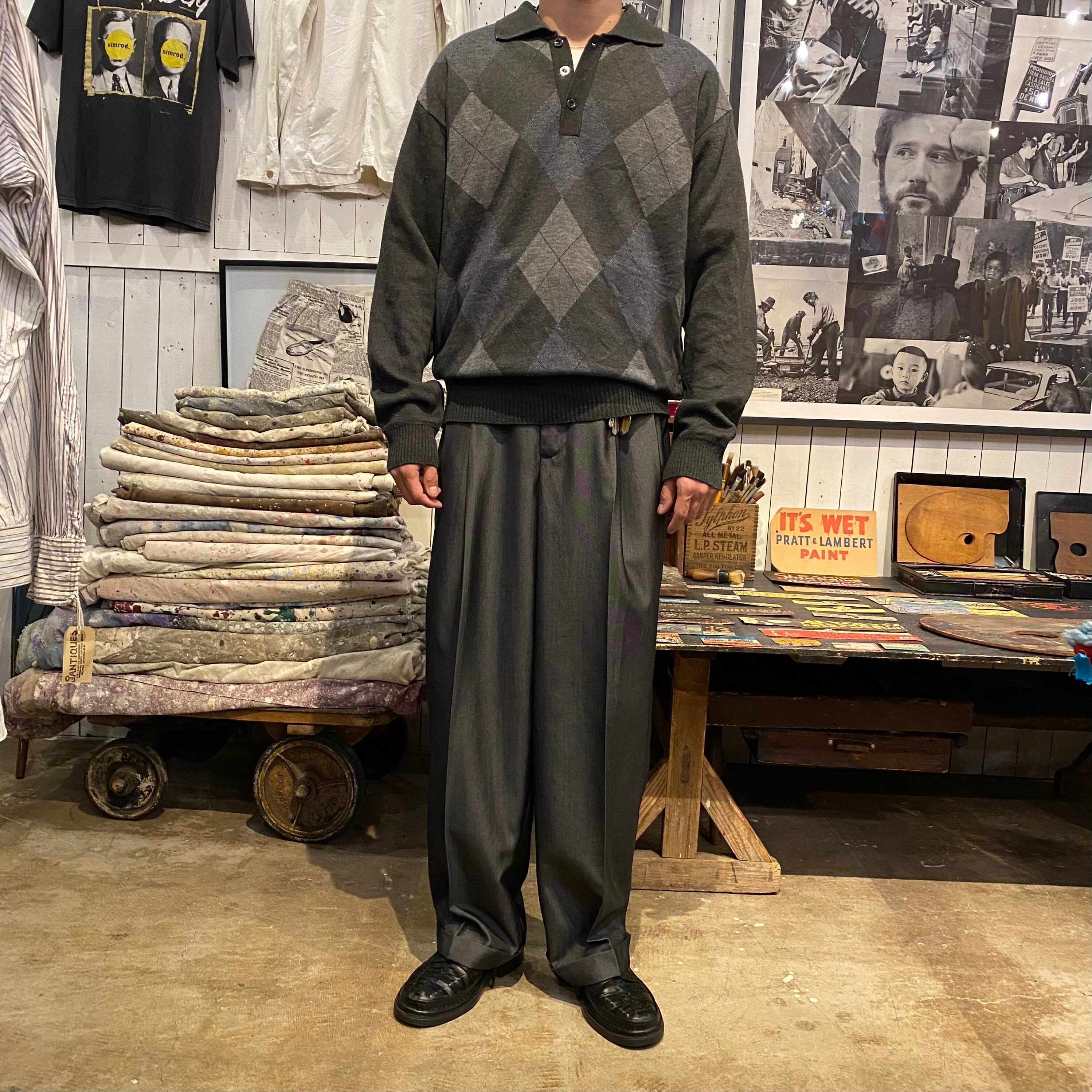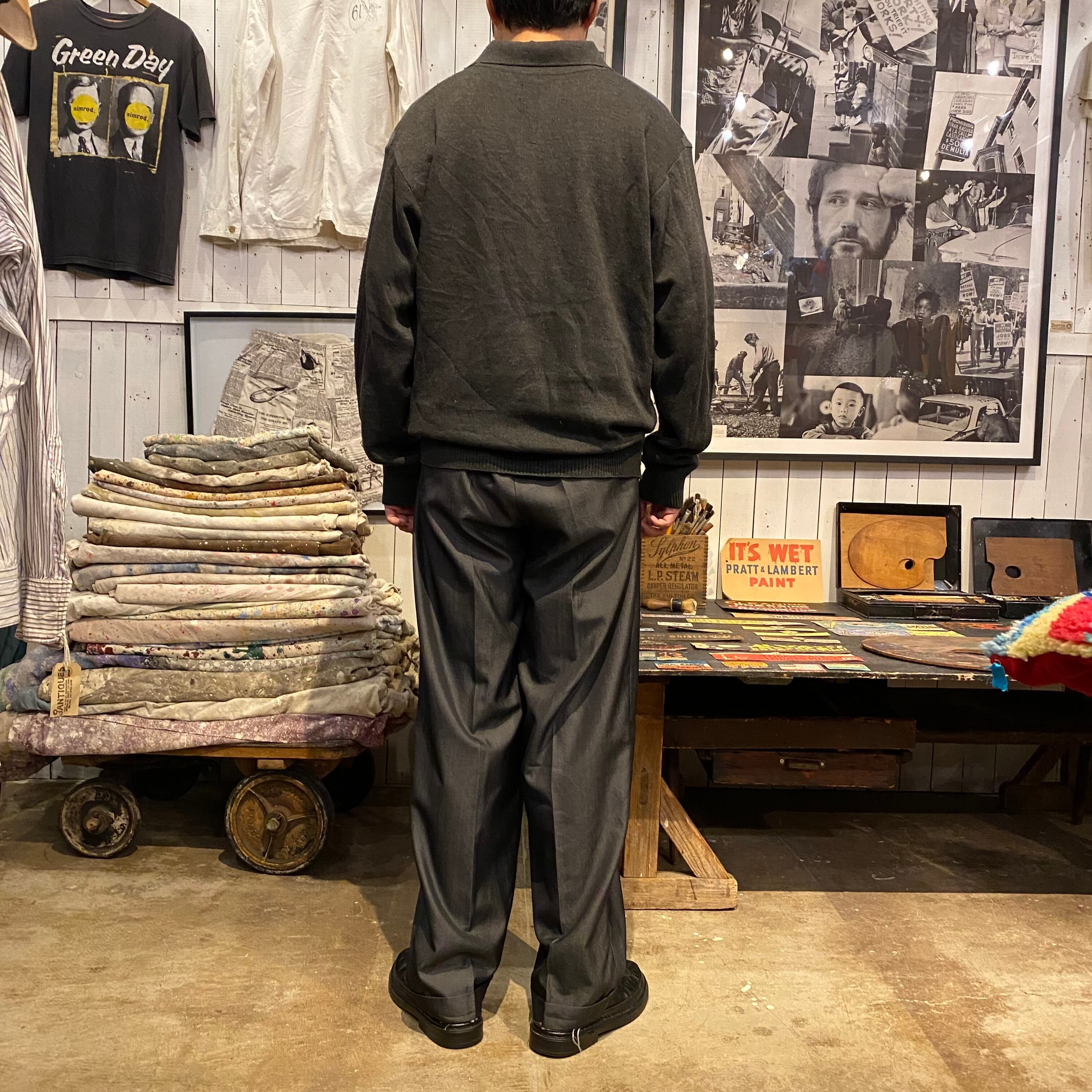 ヨーロッパのニットポロシャツになります。柔らかく肌触りの良い、薄手のニットです。チャコールグレーの落ち着いた色味も魅力的で、柄も同色でシックな印象でしょう。合わせやすいと思いますし、ゆったりめに着れるサイジングも良いと思います。少し光沢感ある太いスラックスで大人っぽく着こなしました。