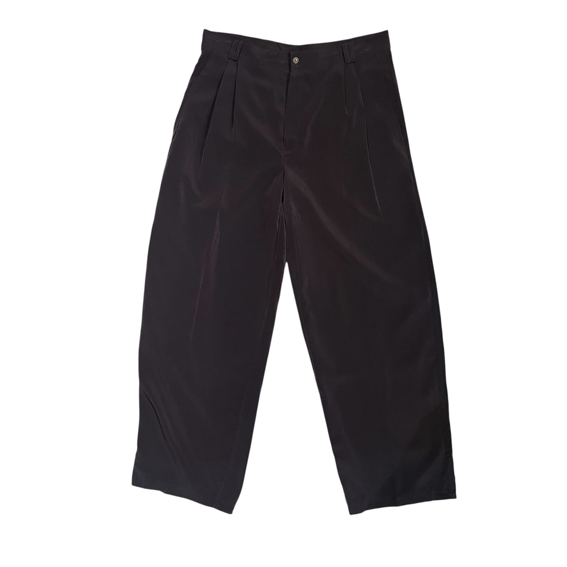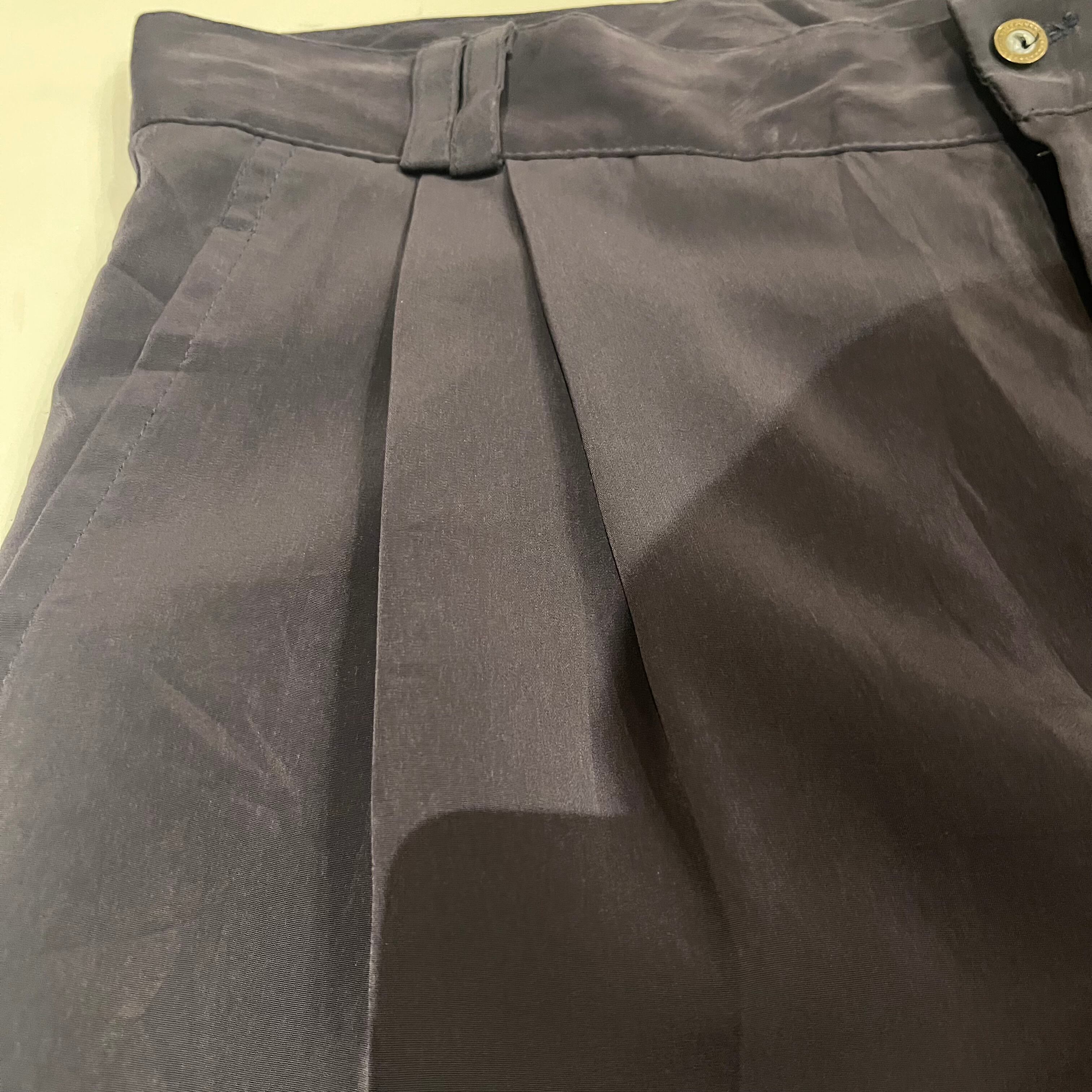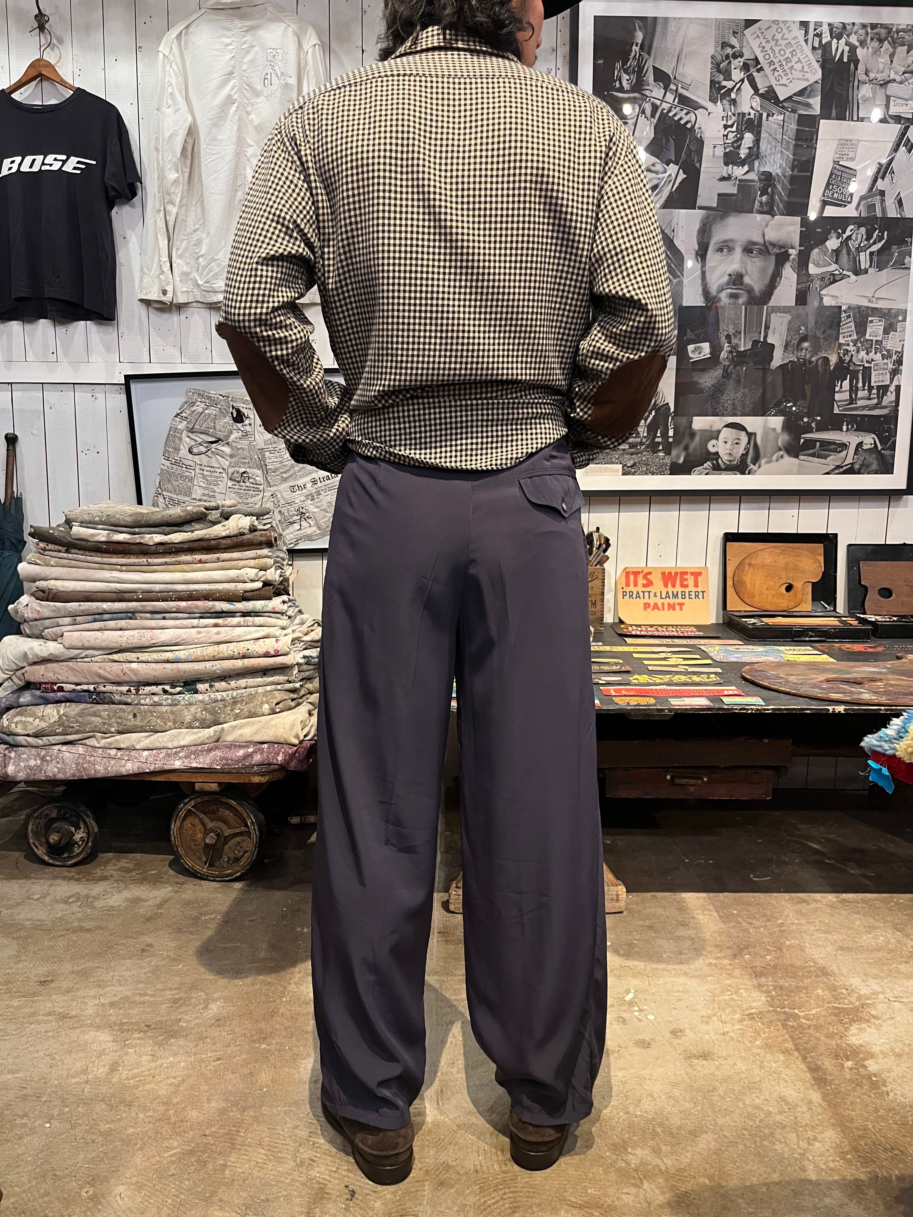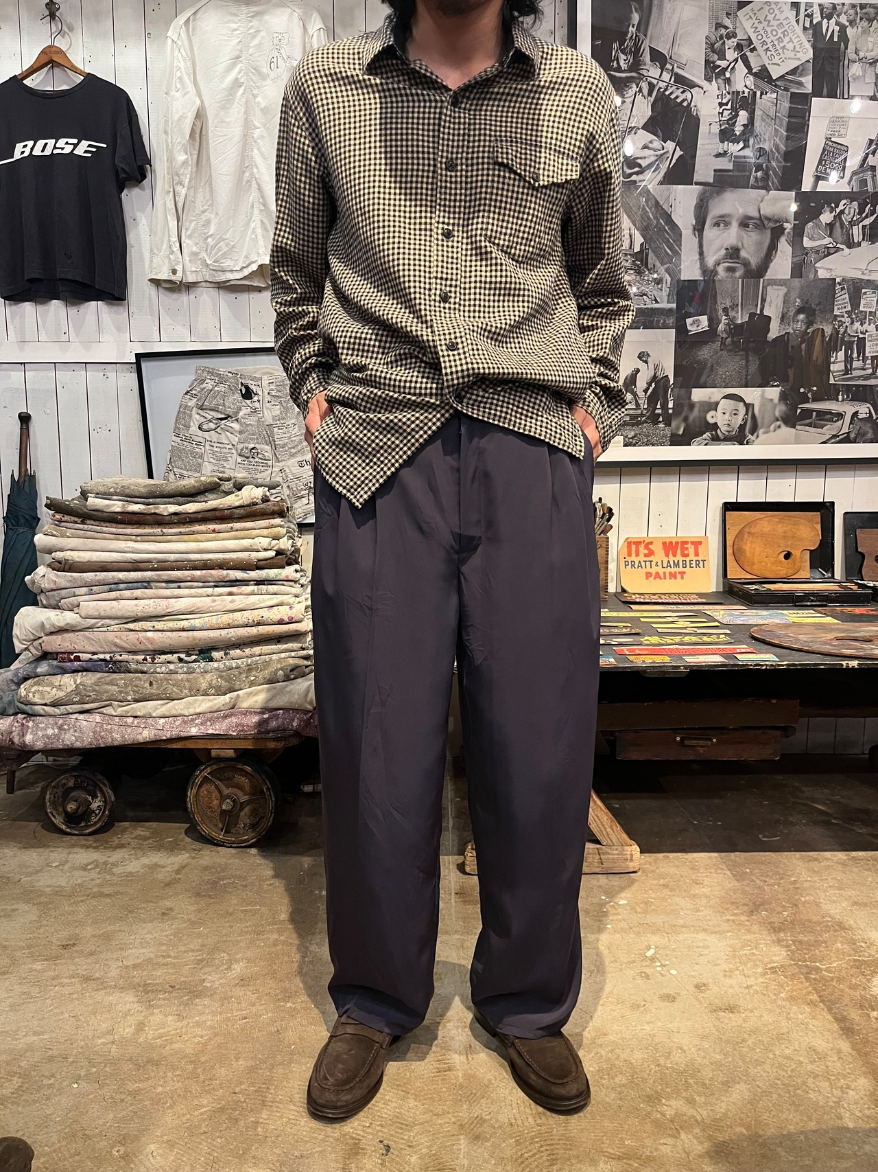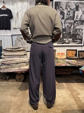 艶があり、さらっとした履き心地です。タックも2本入っているのでゆったりとした履き心地とシルエットになります。パジャマパンツのようになりにくく普段使いしやすいような艶感のあるパンツになっております。色味も合わせやすくワントーンでまとめて見ましたがどの色味でも合わせやすいパンツです。