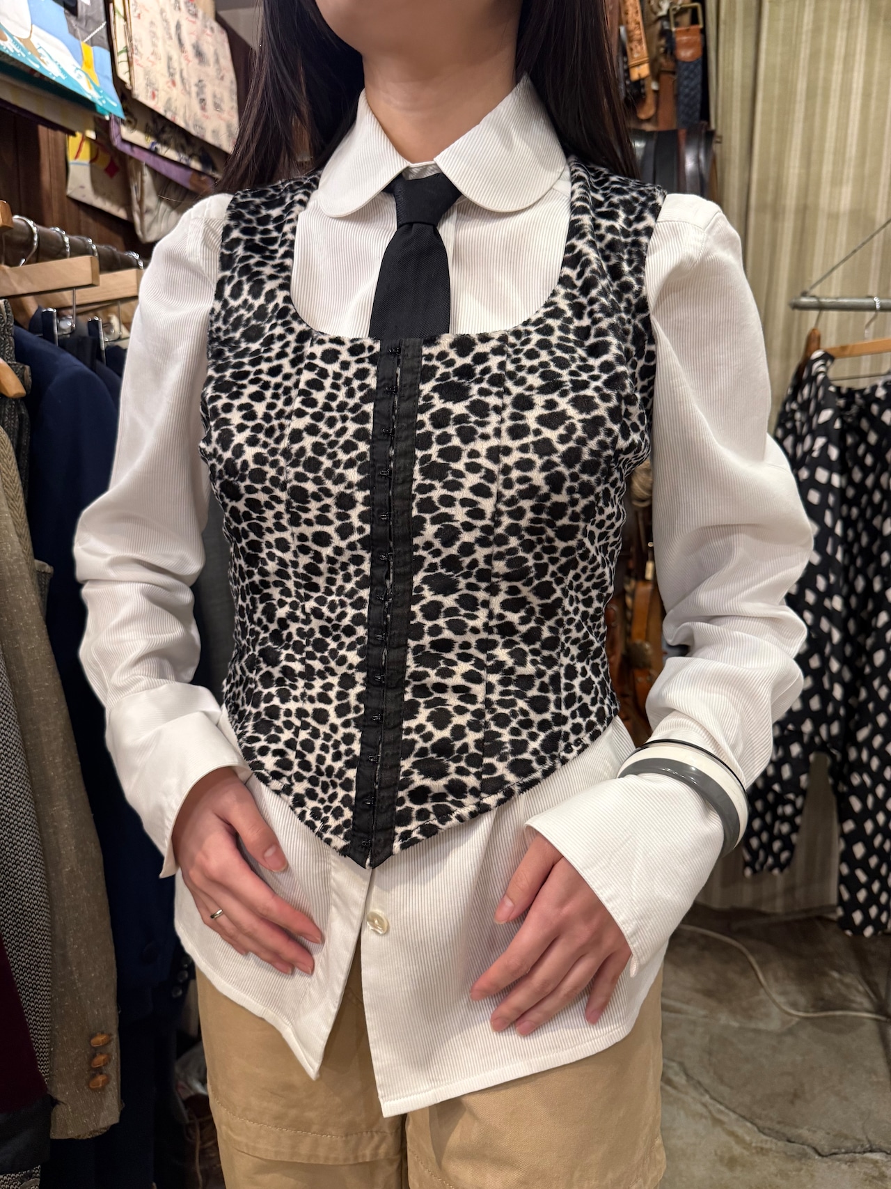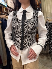 ベロア生地のレオパード柄のビスチェです。前開きがホックで留められる仕様になっており、途中から開けて着用しても可愛いです。体にフィットするサイズ感で、スタイリング画像のように中のシャツなどのインナーとメリハリをつけて着用しても素敵です。
