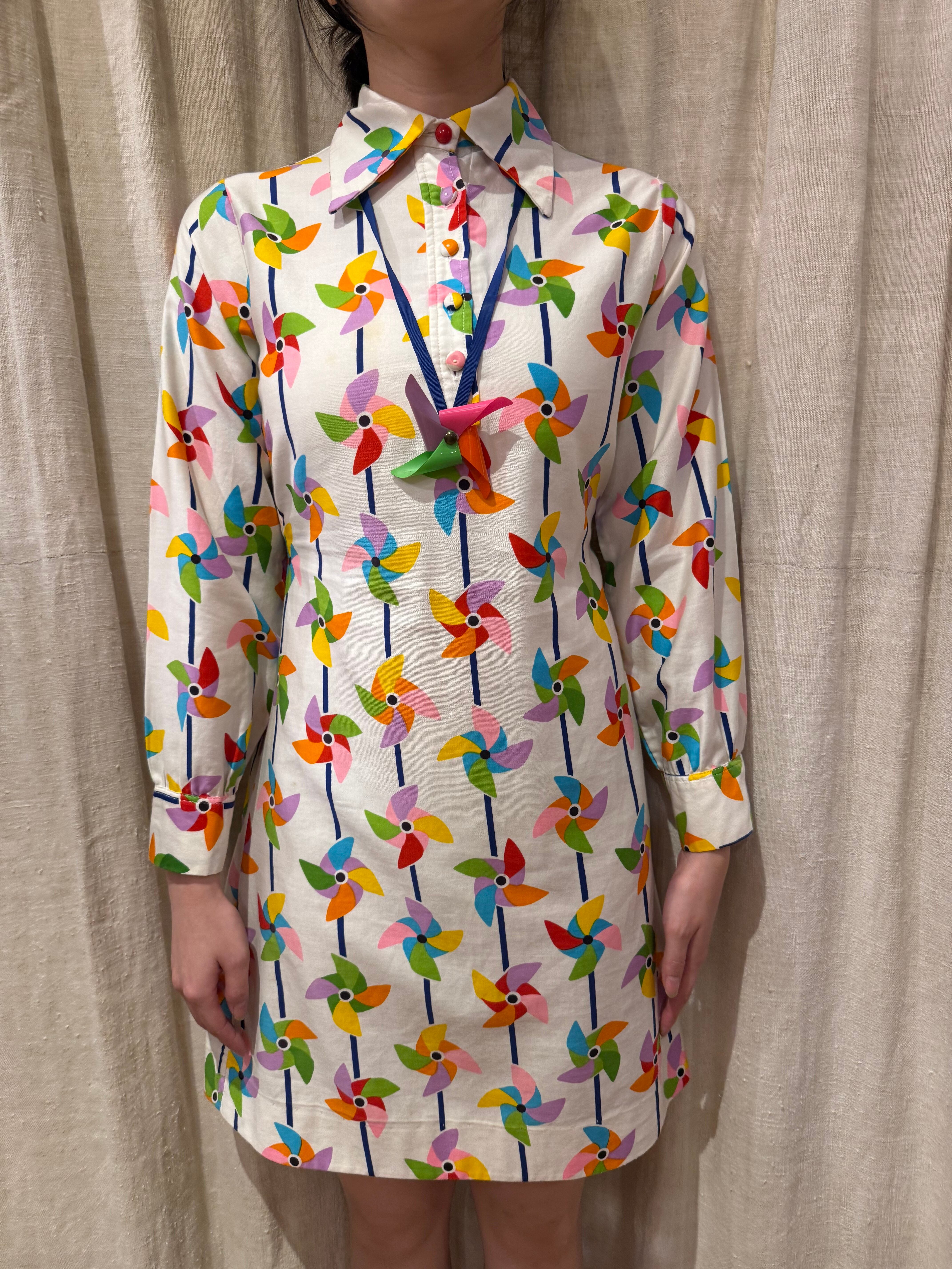 カラフルな風車柄が可愛らしいドレス。タイトな着心地でウエスト部分はくびれたデザイン。後ろにギャザーが入っていて、紐でウエストマークが出来ます。首にかける風車のネックレスもポイントです。