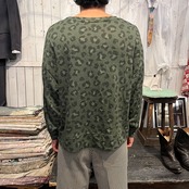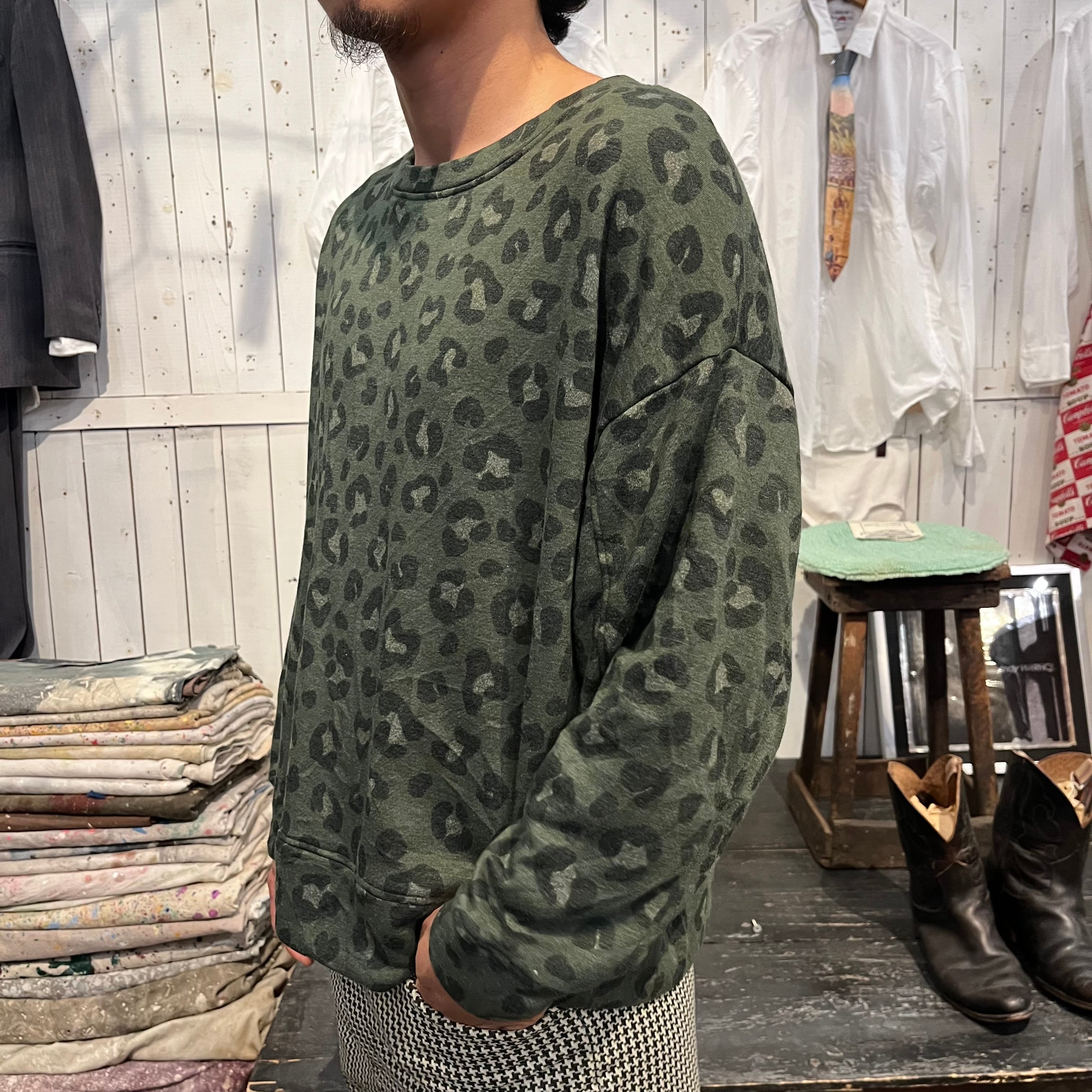 素材はリサイクルポリエステル、コットン、レーヨンからなるロングスリーブシャツです。ドルマンスリーブでゆったりとしたシルエットが特徴です。タグから見るに近年物ではありますがヴィンテージではあまり見られないアイテムが逆に良いかと思います。シルエットが面白くドルマンスリーブなので1枚でも決まりますし、レオパード柄を活かしてレイヤードしてみても良い面白いアイテムかと思います。これからの季節にはピッタリなアイテムです。お探しの方はおはやめに。