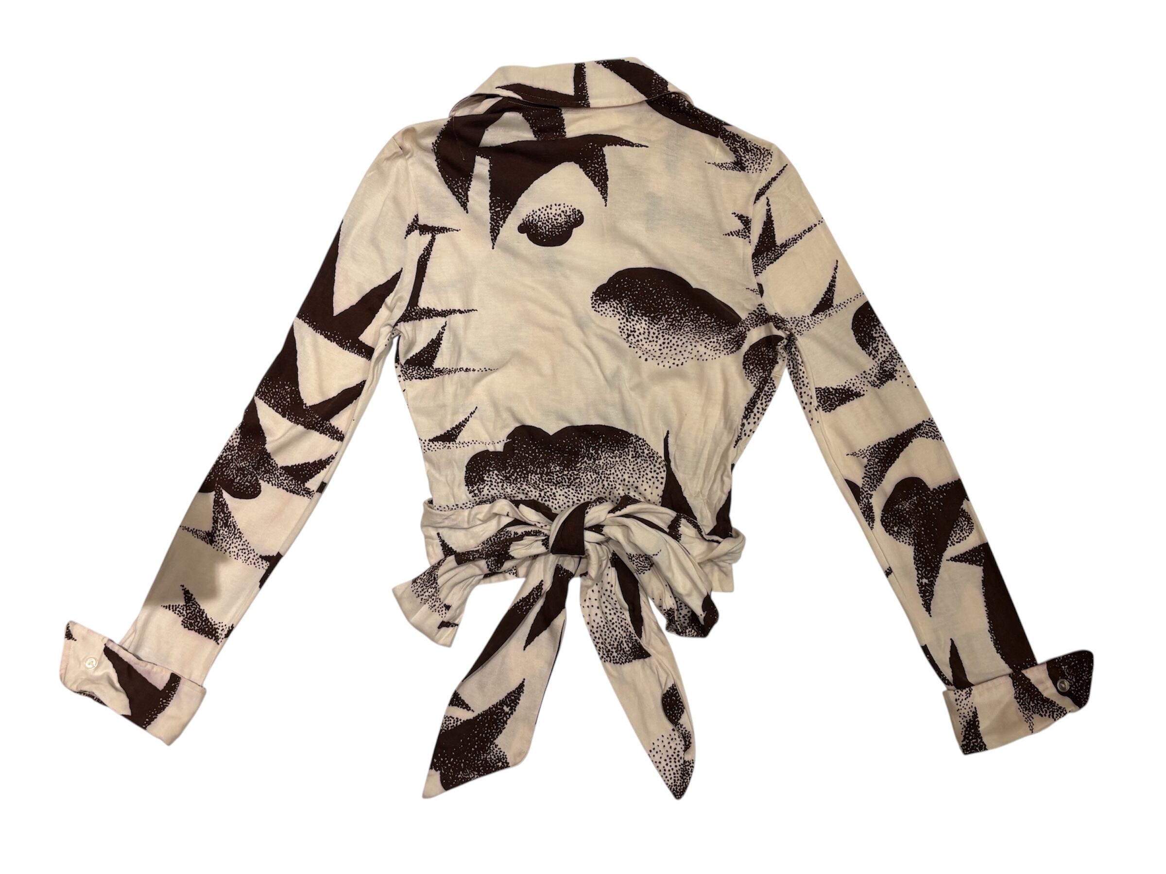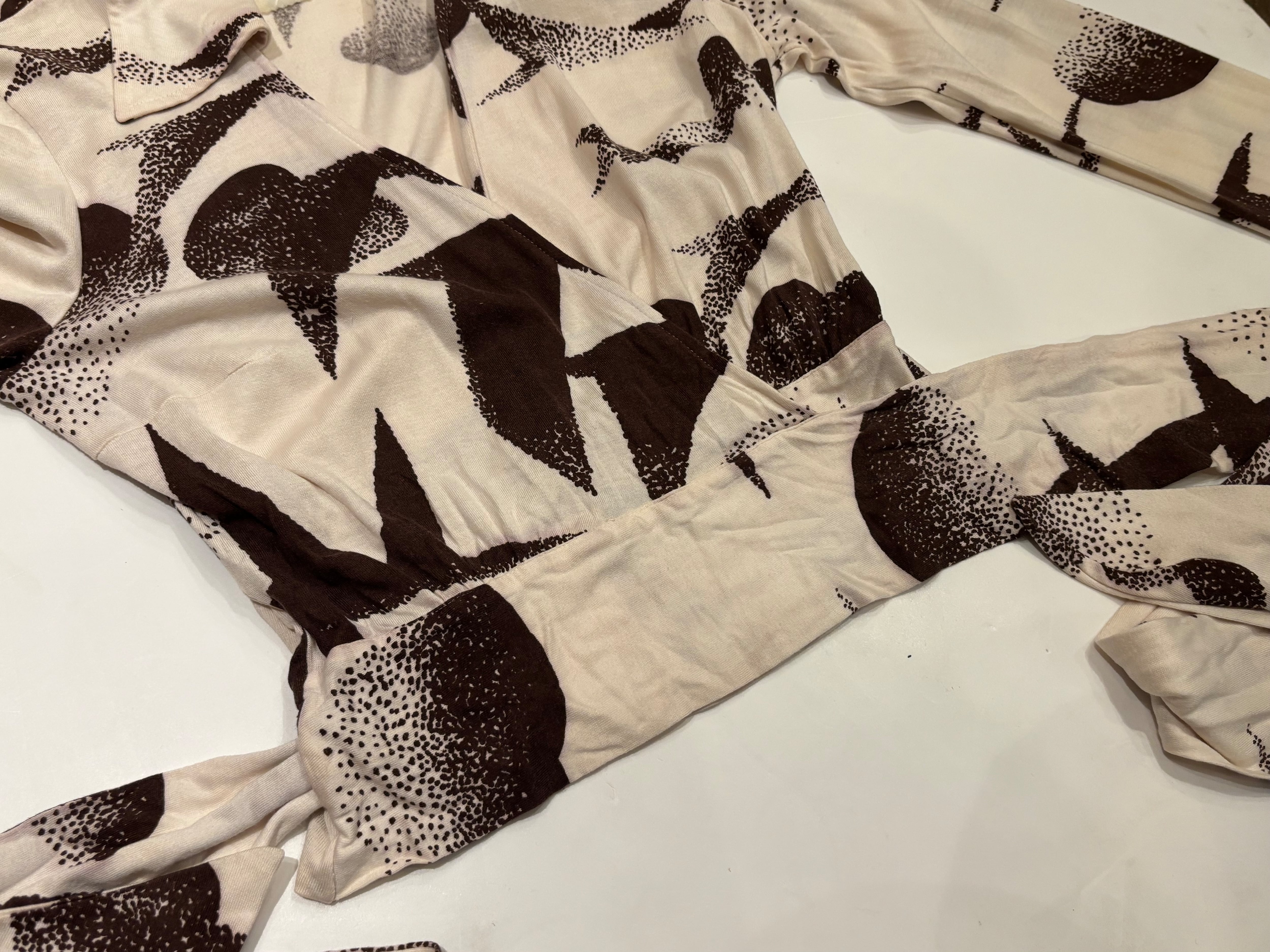 柔らかい肌触りで、身体に馴染むデザインのセットアップ。鳥のようなモチーフ柄で落ち着いたシンプルな色合いが可愛らしいです。ウエストマークができるのでシルエットにメリハリがつけられます。これからの季節にぴったりなアイテムです。