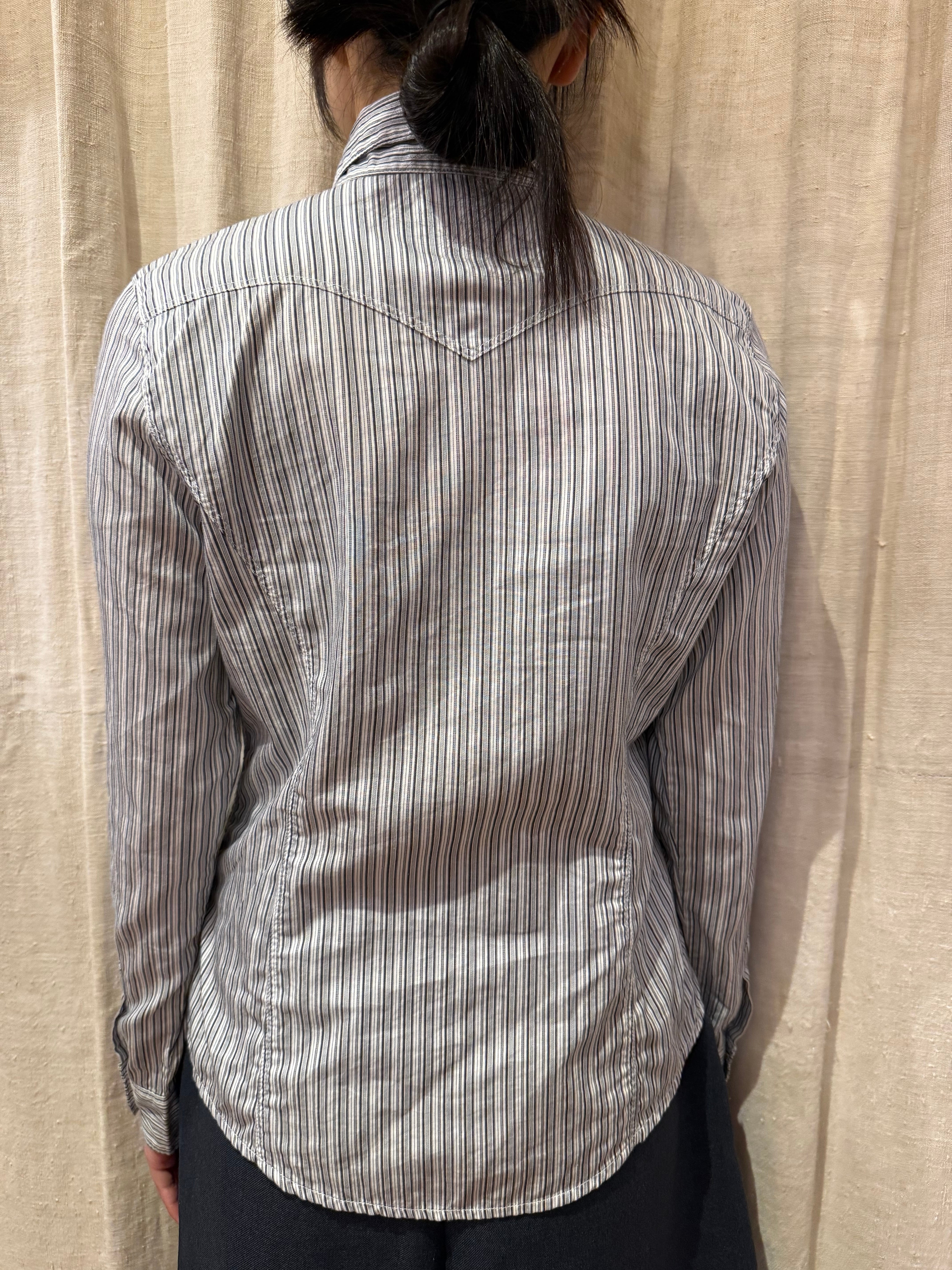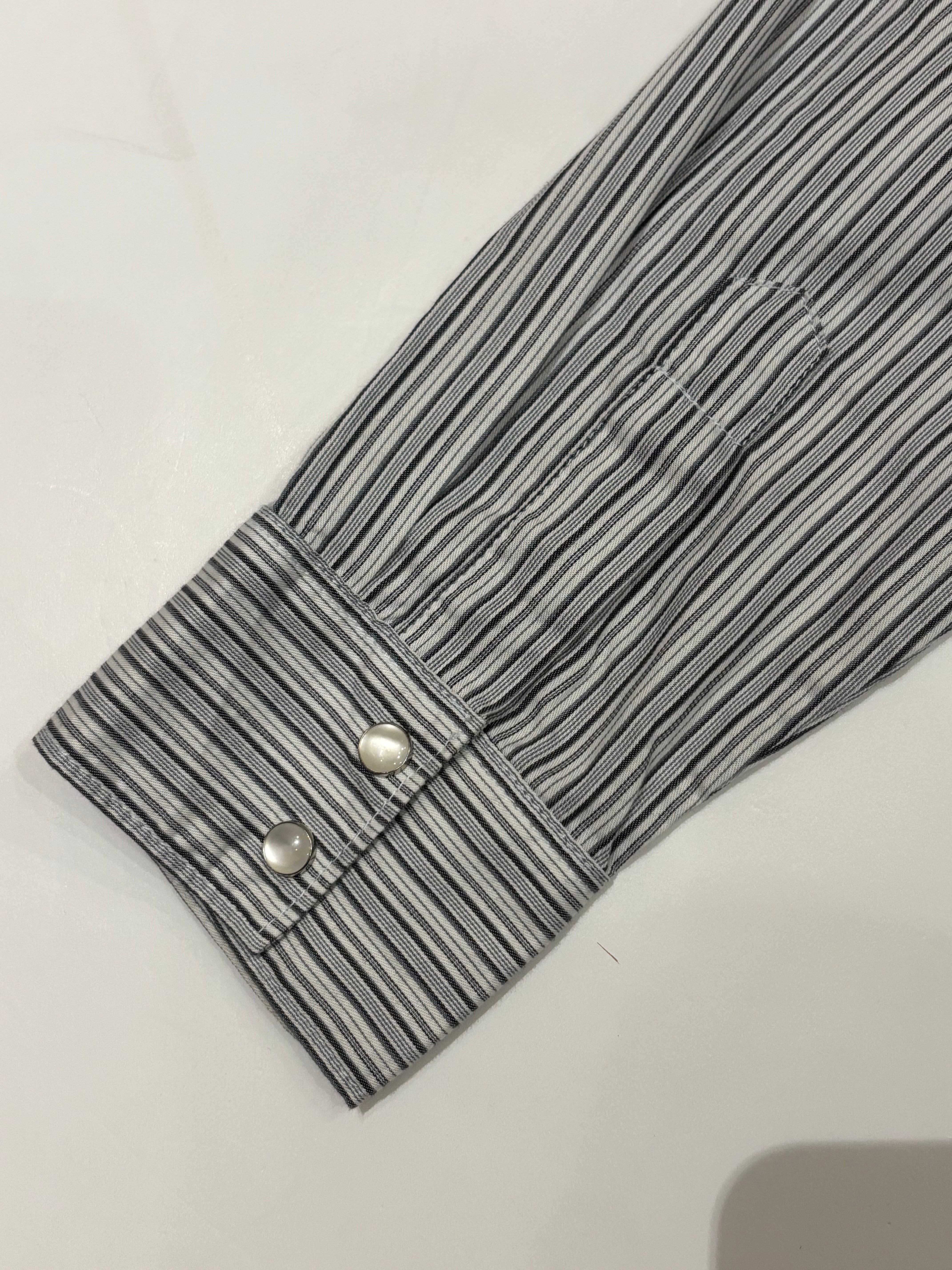 GAPなフリルシャツです。ストライプ柄にパネルラインでスッキリとした印象で、女性らしいシルエットです。スナップボタンで着脱もしやすいです。一枚で着ても存在感があります。ベストなどとレイヤードしてフリルを見せても可愛いです。