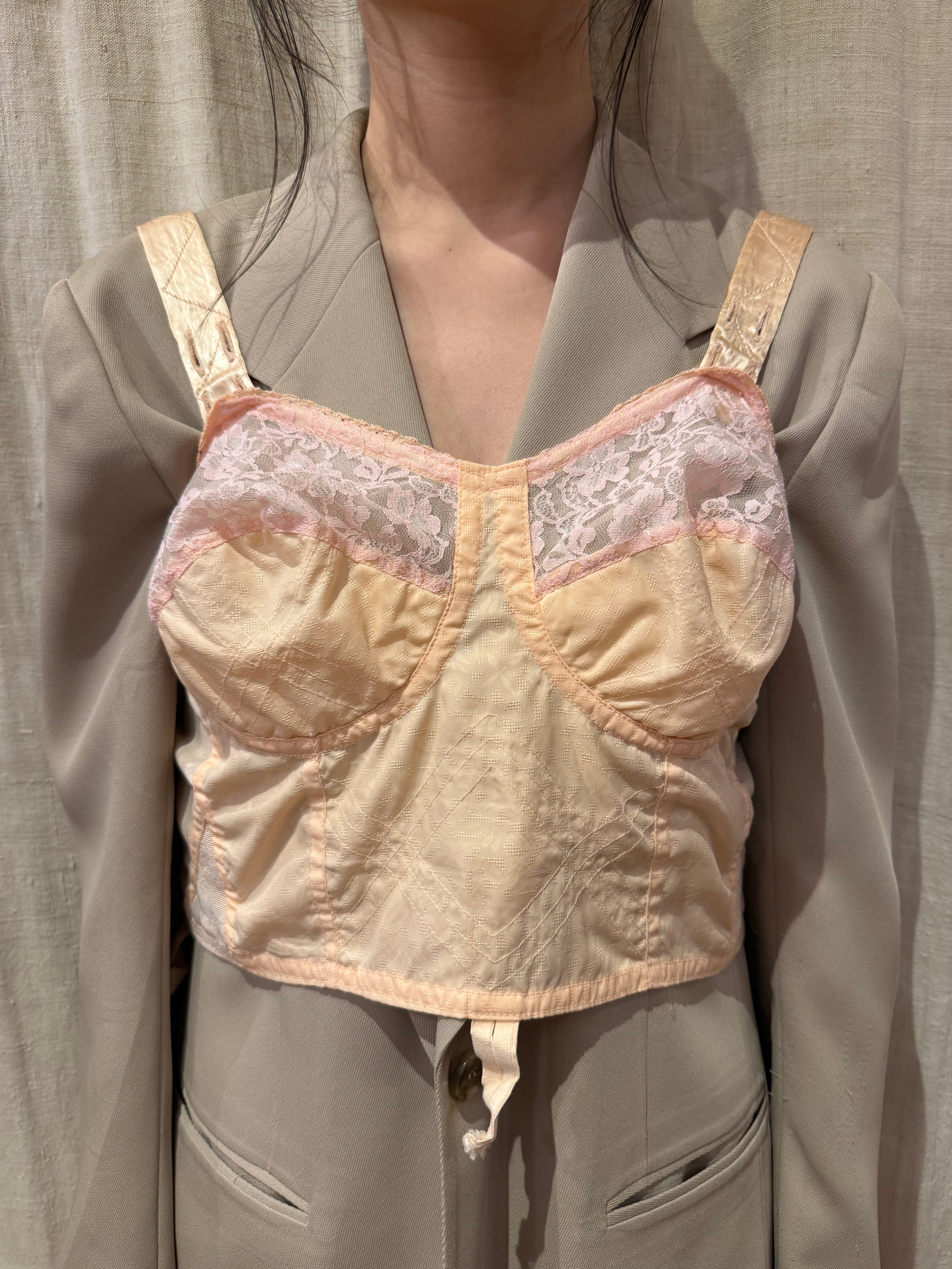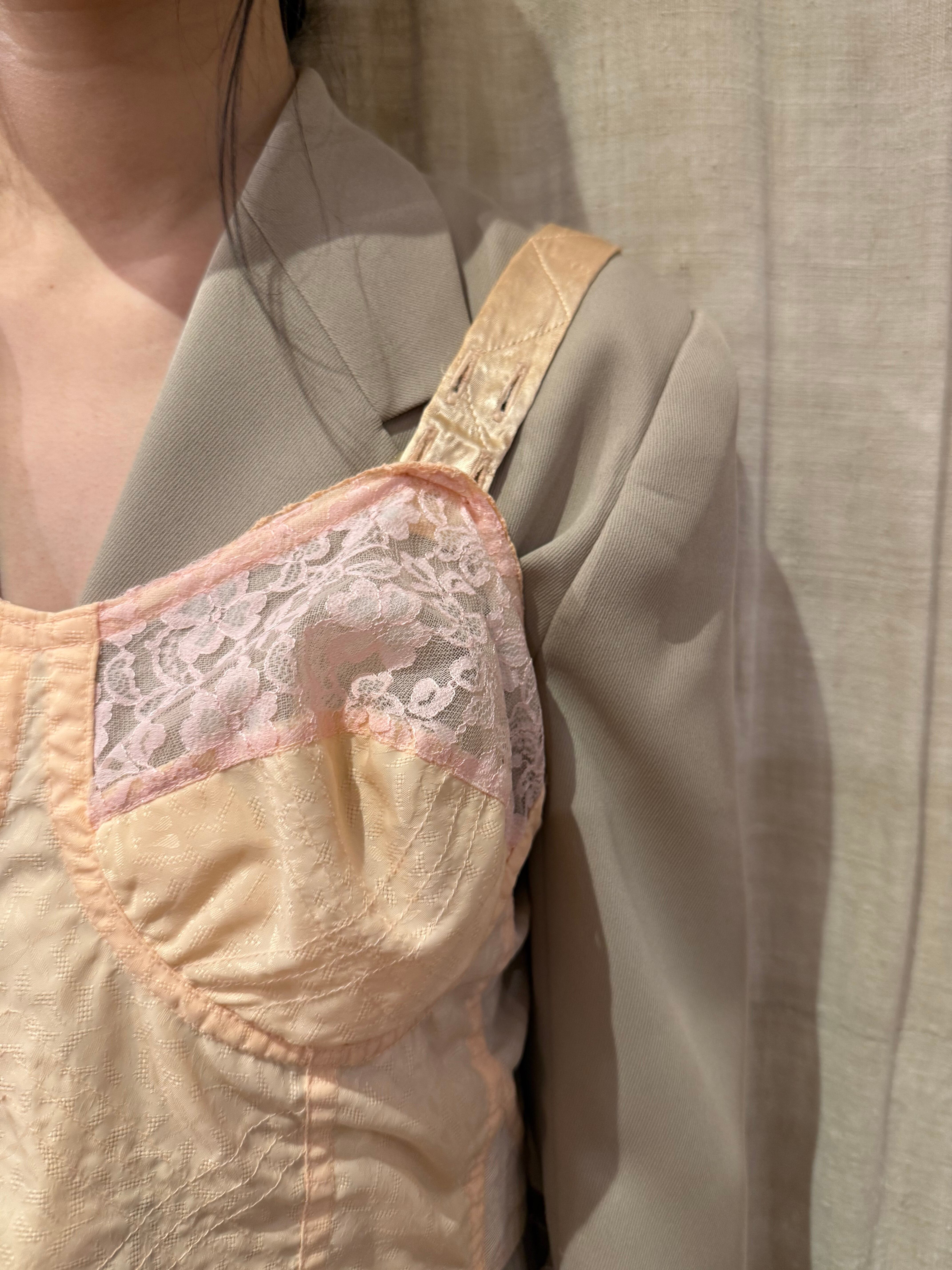 ツヤツヤとした柔らかい素材で、淡いピンクのようなカラーが可愛らしいランジェリービスチェ。身幅がワンジェリーにしては大きめなので秋冬はスウェットやセーターの上から合わせても良さそうです◎肩のストラップも太めなデザインなので肩に負担無く着用出来るのも魅力的です。レイヤードに是非いかがでしょうか。