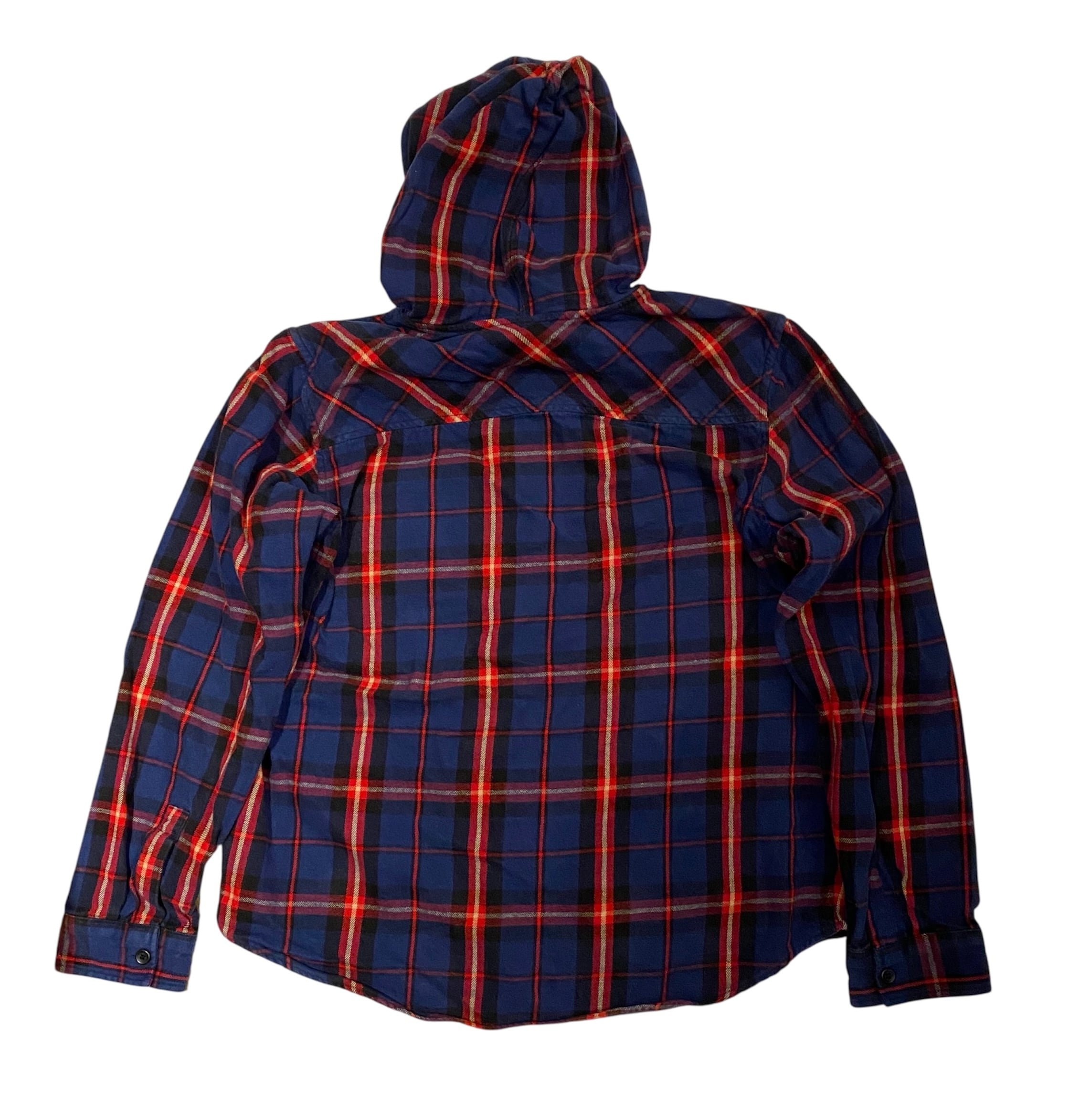 フード付きのコットンフランネルシャツになります。大きめのチェック柄で綺麗な配色だと思います。フード部分までボディと同じフランネルの生地で作られているのがポイントです。普段のTシャツの上にラフに羽織って着れる秋口にぴったりなアイテムだと思います。また身幅があって着丈が長すぎないサイズバランスも良い感じです。タグ欠損になりますが2000年代くらいのもので古くはないですが気が利いています。