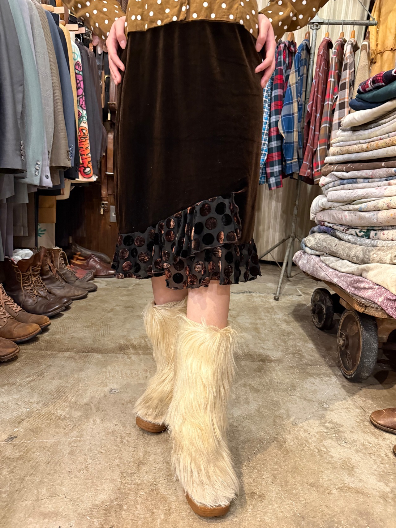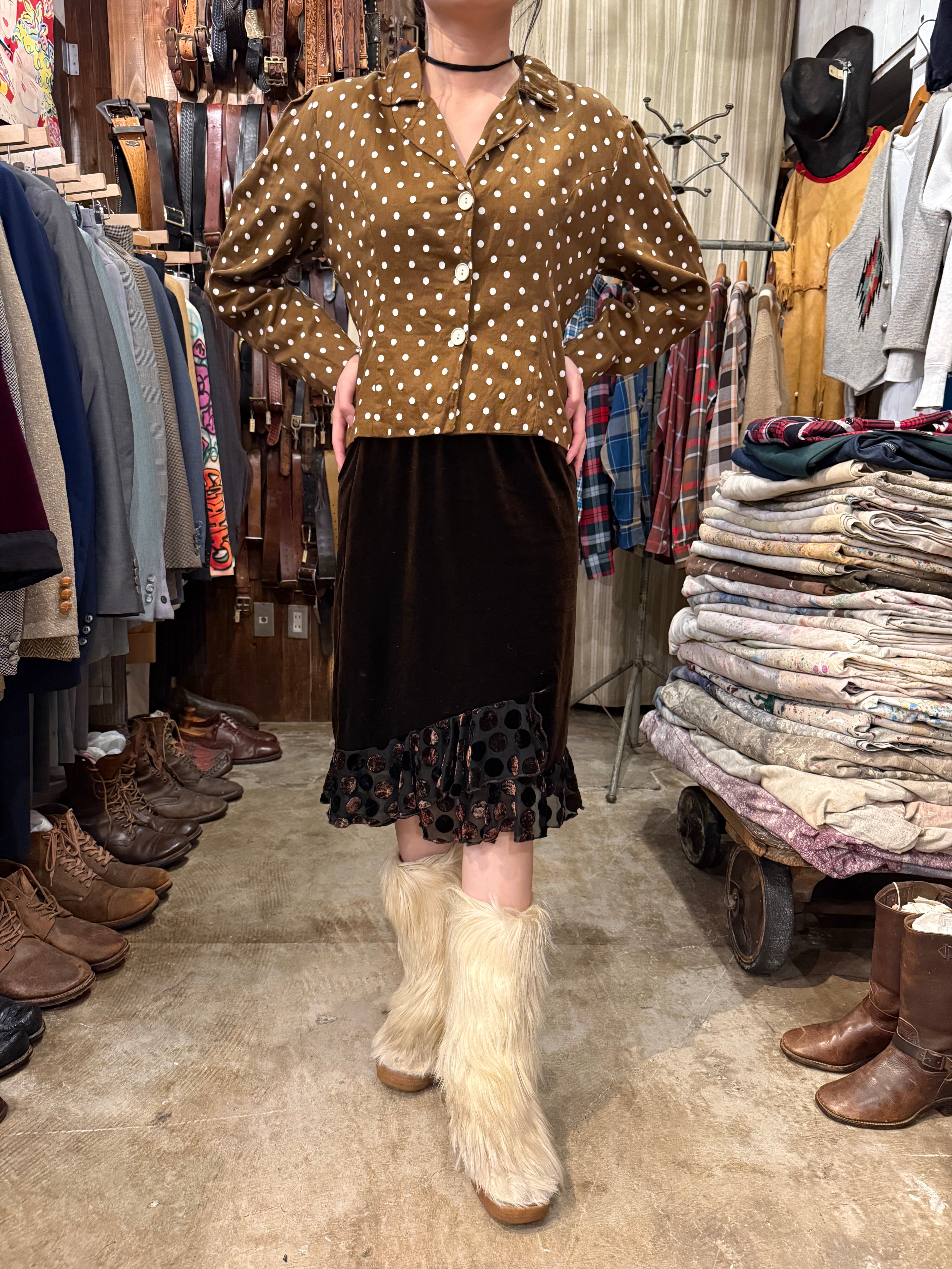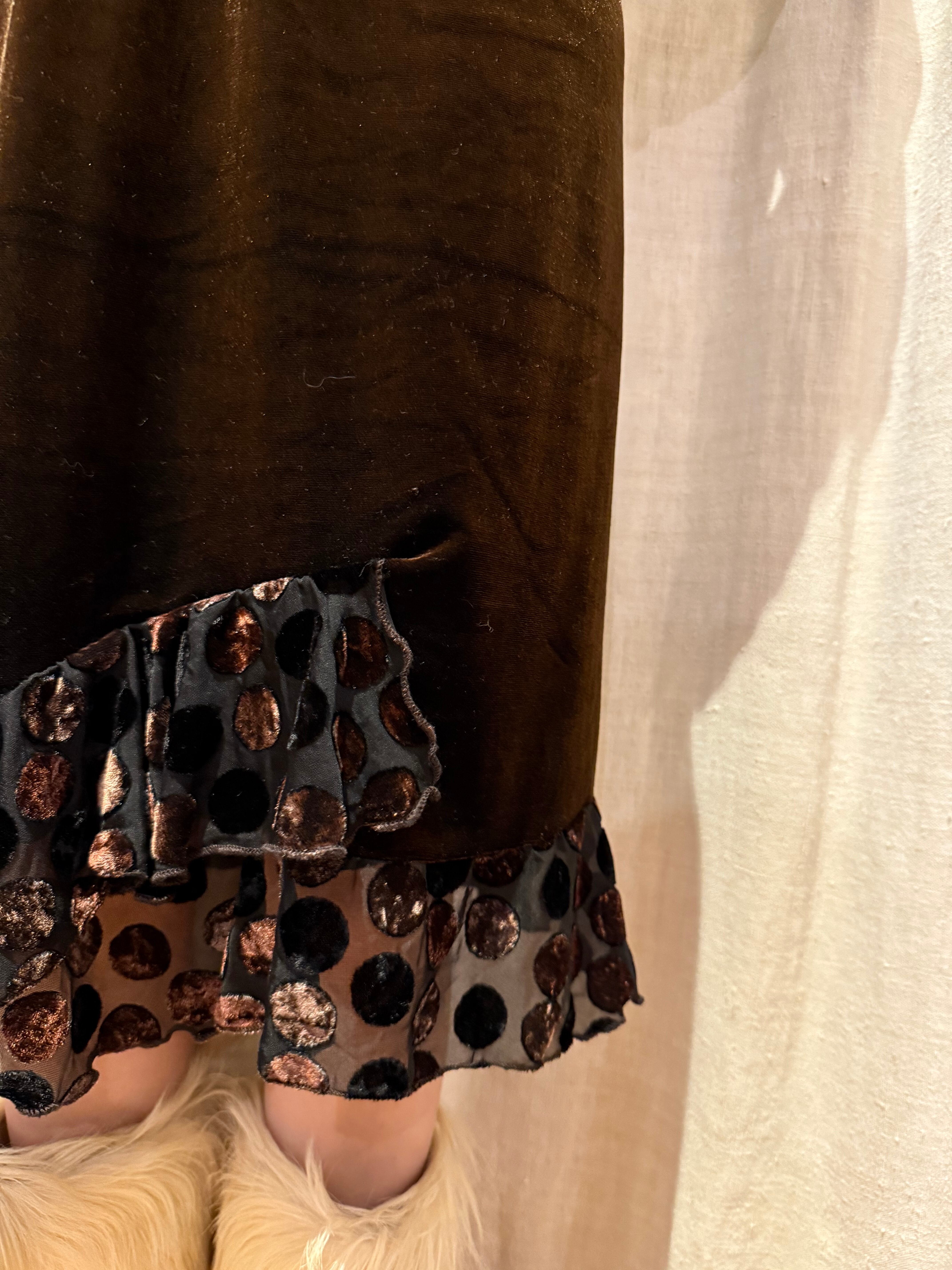 サラッとした肌触りのベロアのスカート。裾のレースが前で二重に重なった様なデザインと、ドット柄になっているのが特徴です。深いブラウンで秋らしい雰囲気も出せます。レイヤードとしても使いやすいアイテムです。