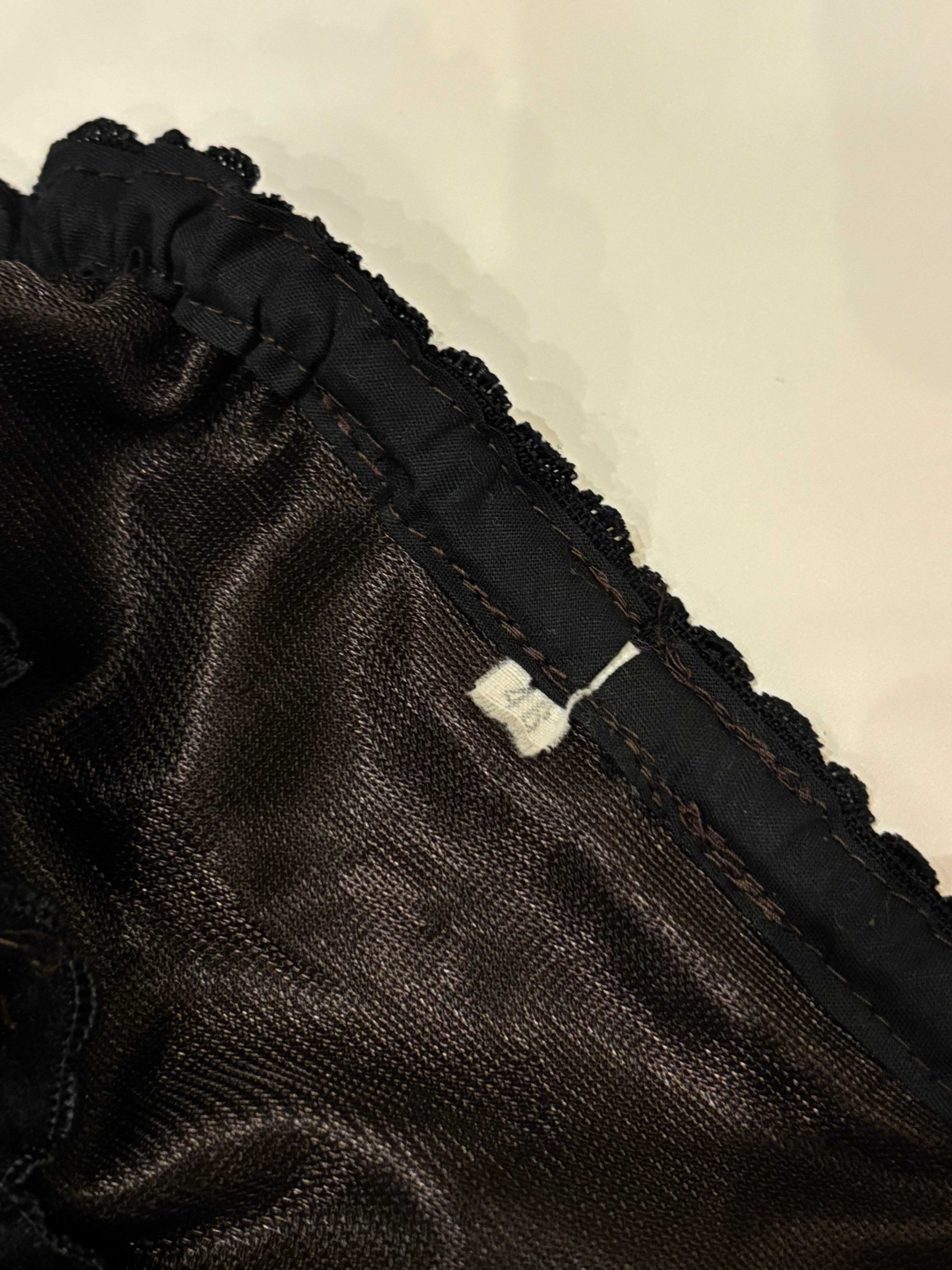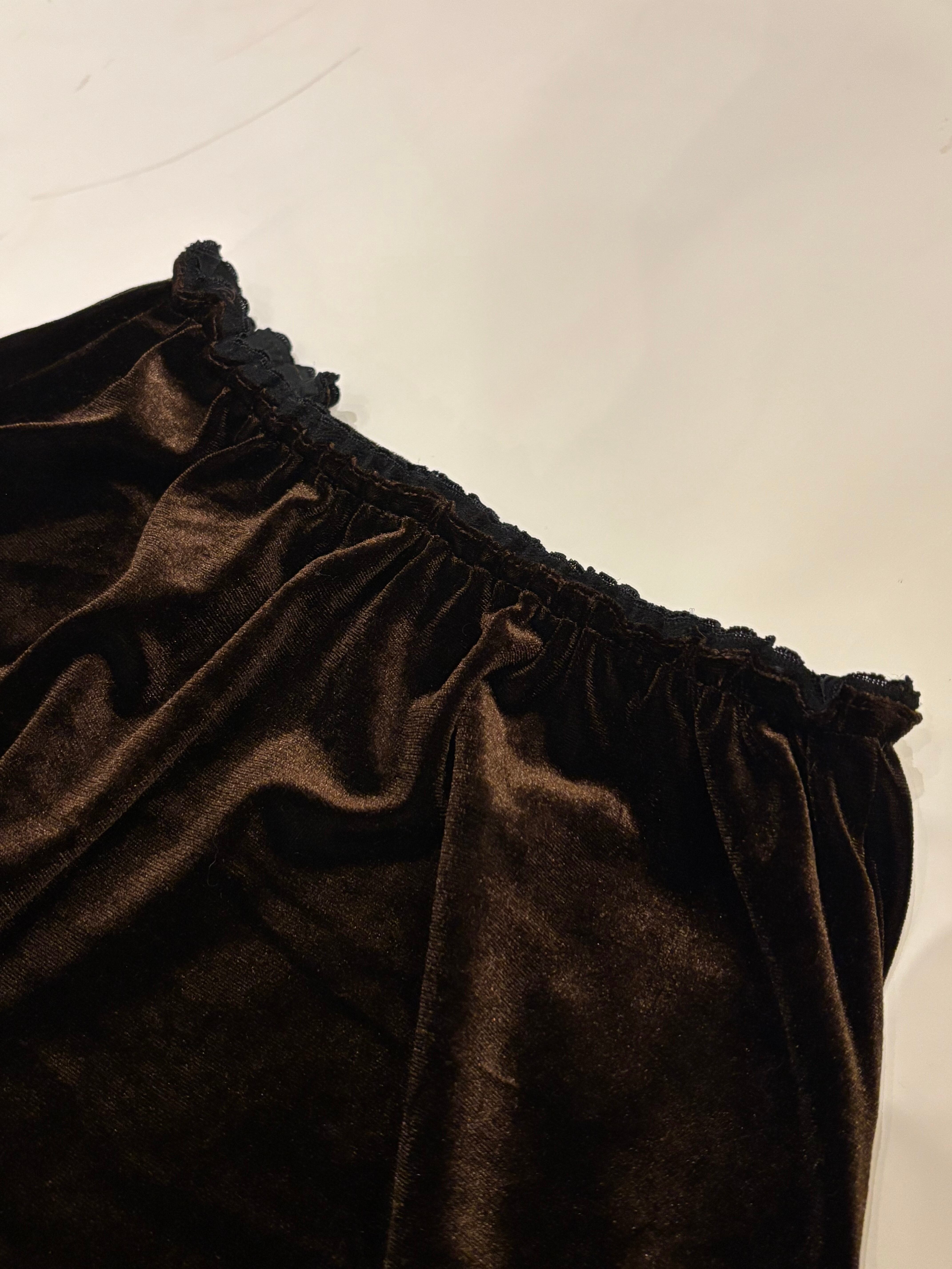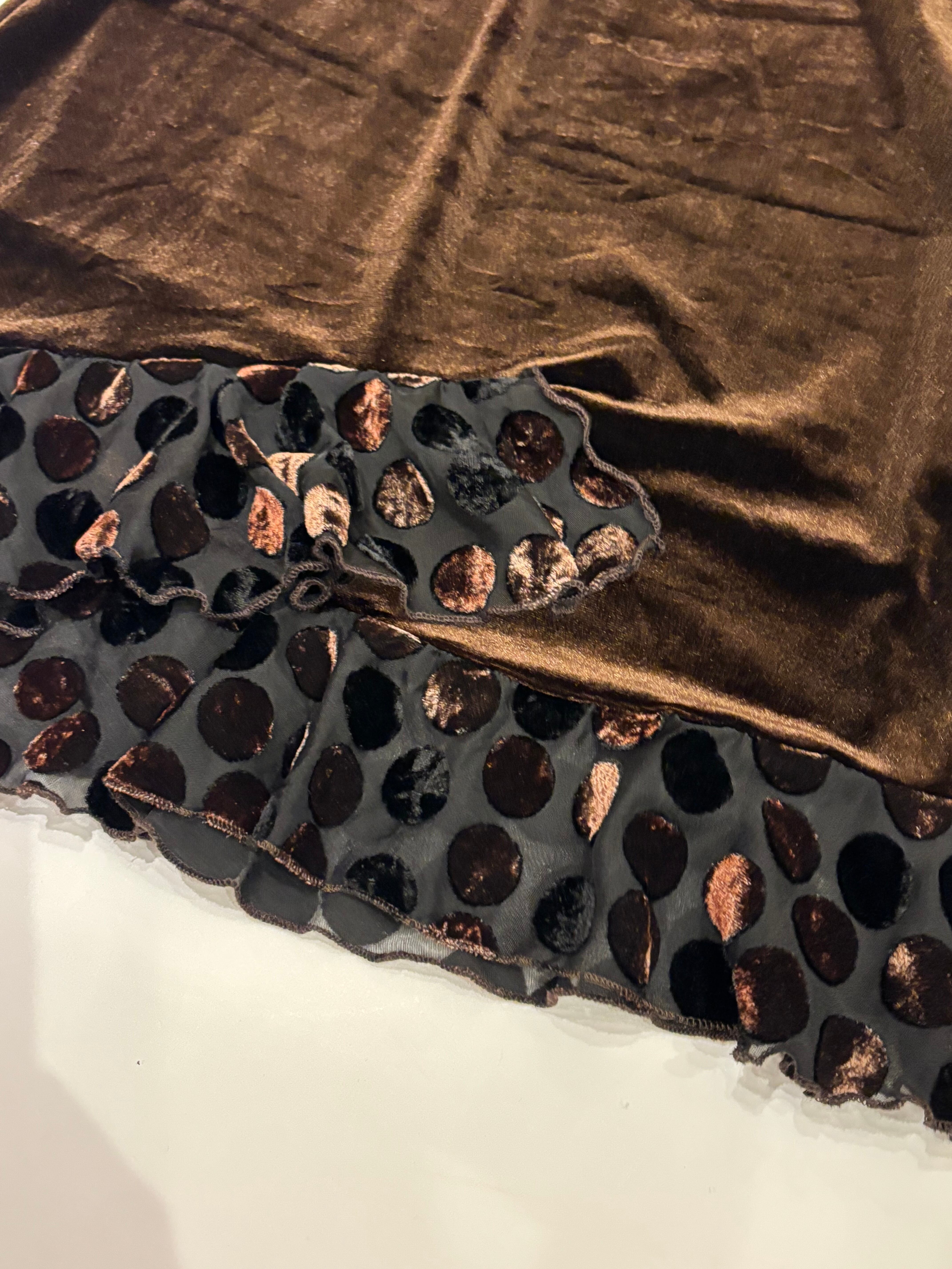 サラッとした肌触りのベロアのスカート。裾のレースが前で二重に重なった様なデザインと、ドット柄になっているのが特徴です。深いブラウンで秋らしい雰囲気も出せます。レイヤードとしても使いやすいアイテムです。