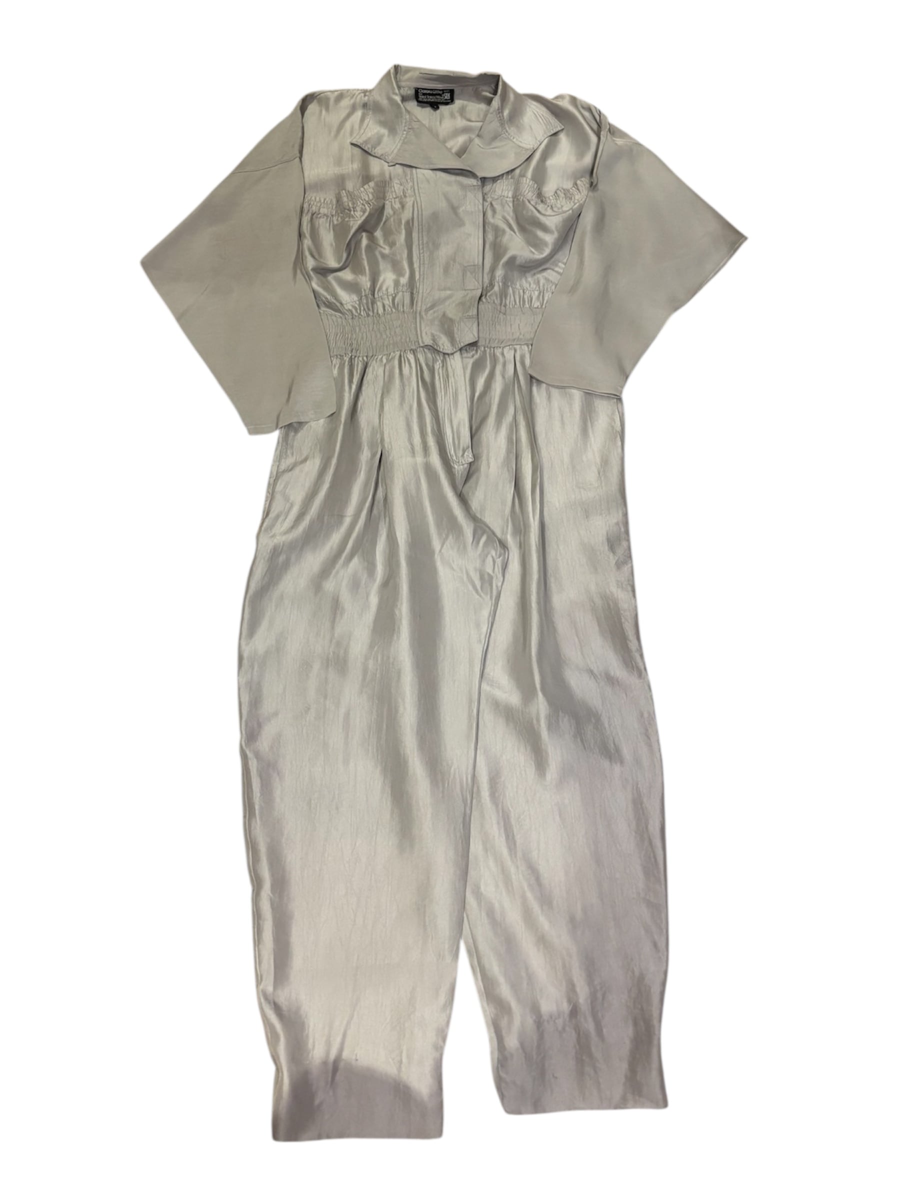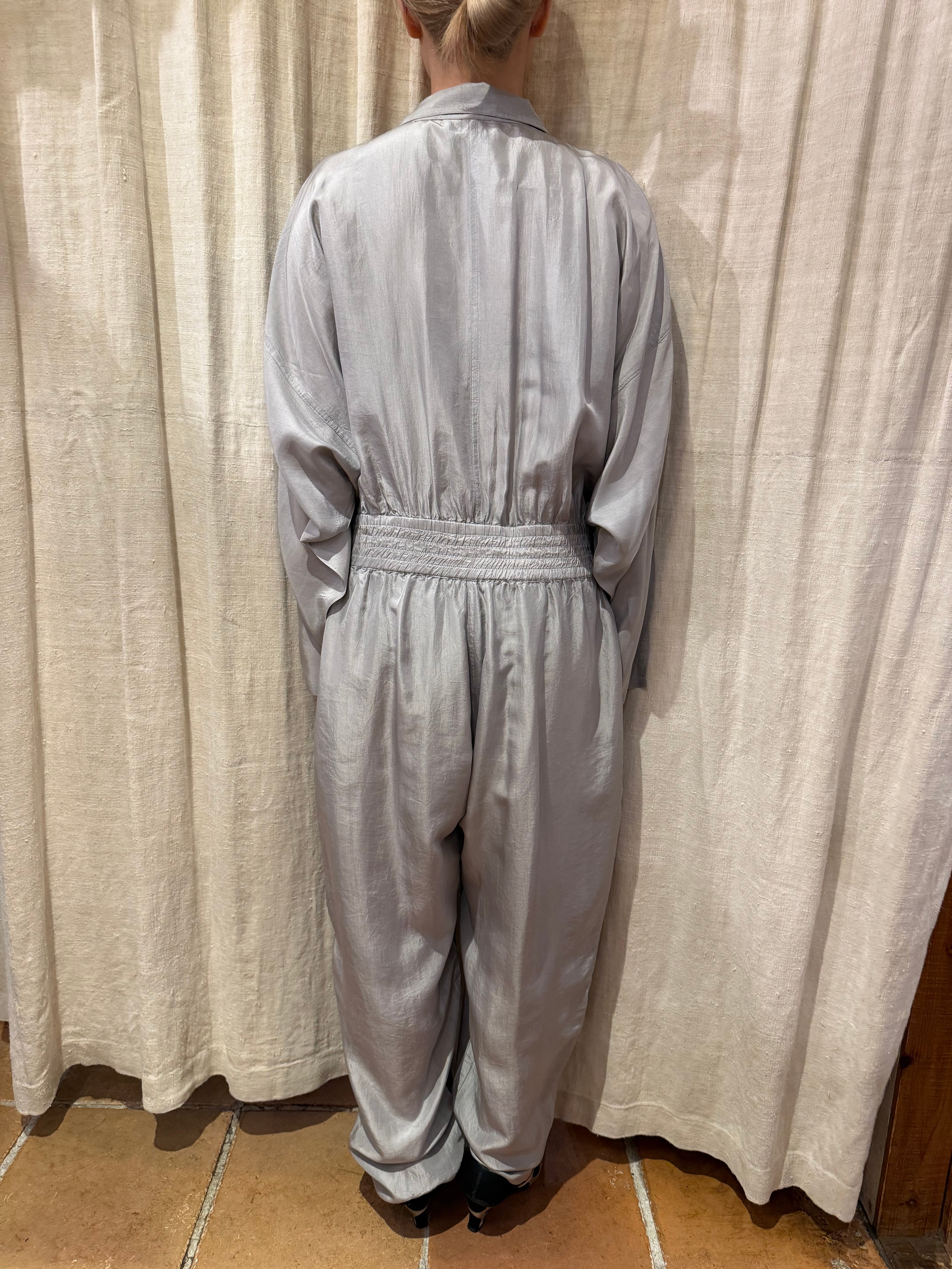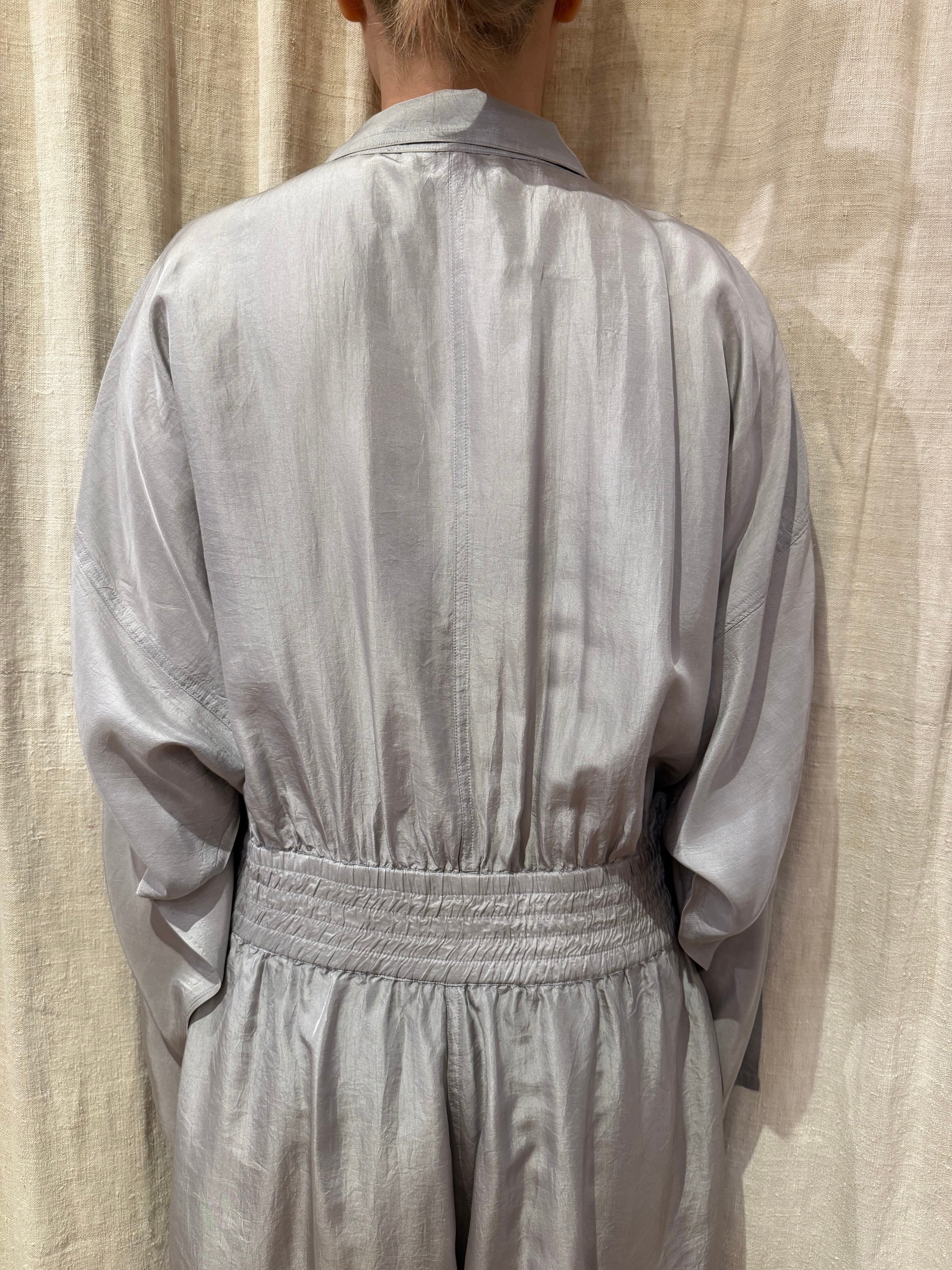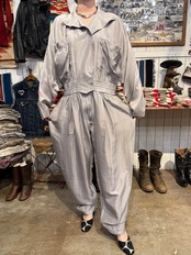 ツヤツヤと質感で肌触りのいいシルク素材のジャンプスーツ。オーバーサイズに絞られたウエストやテーラードのかかったパンツのシルエットが可愛らしいです。フロント部分はマジックテープで楽に着脱が出来、胸元のポケットは大きめで利便性もあります。これからの季節はサラッとラフに着れるのでおすすめです。