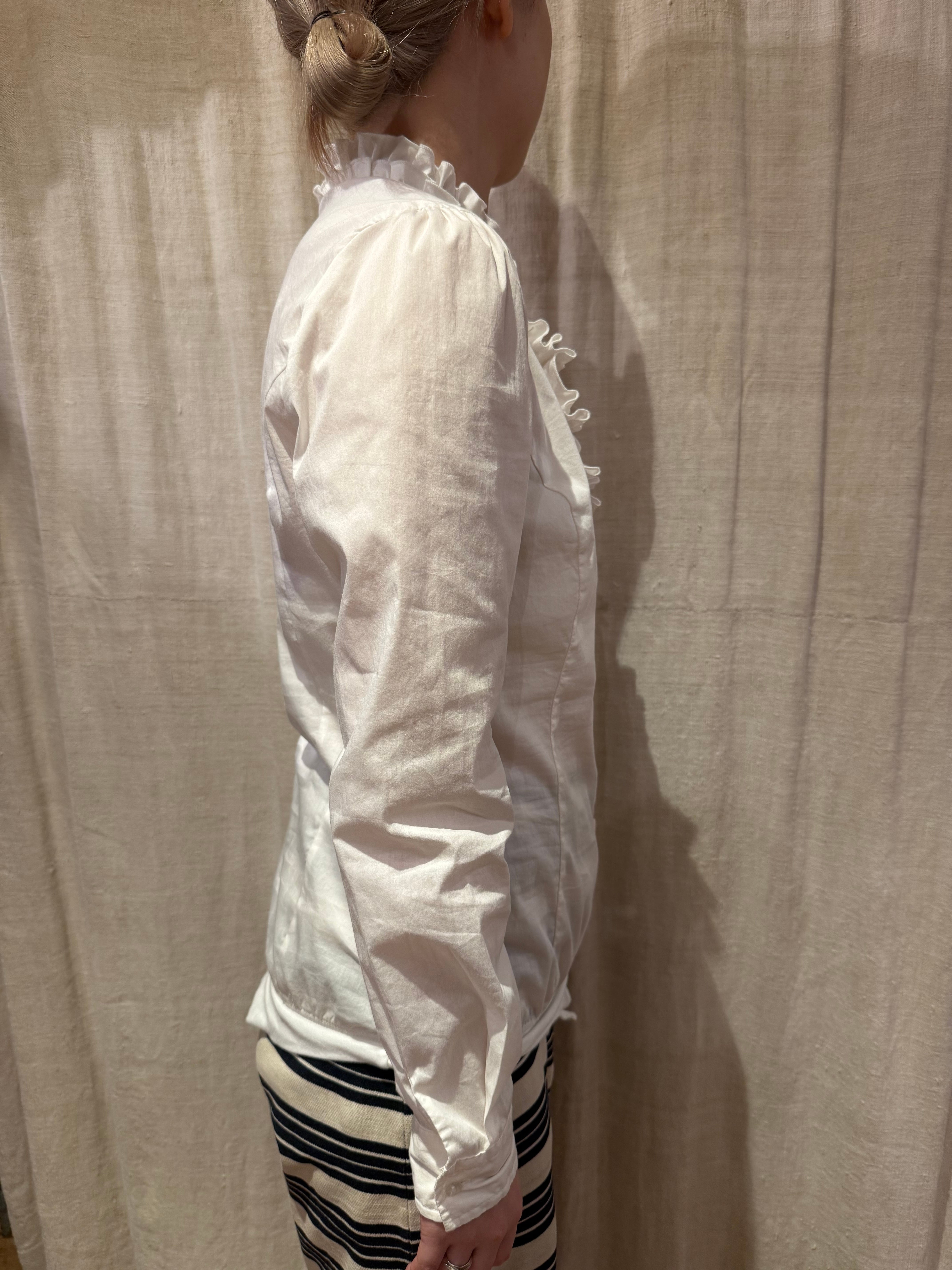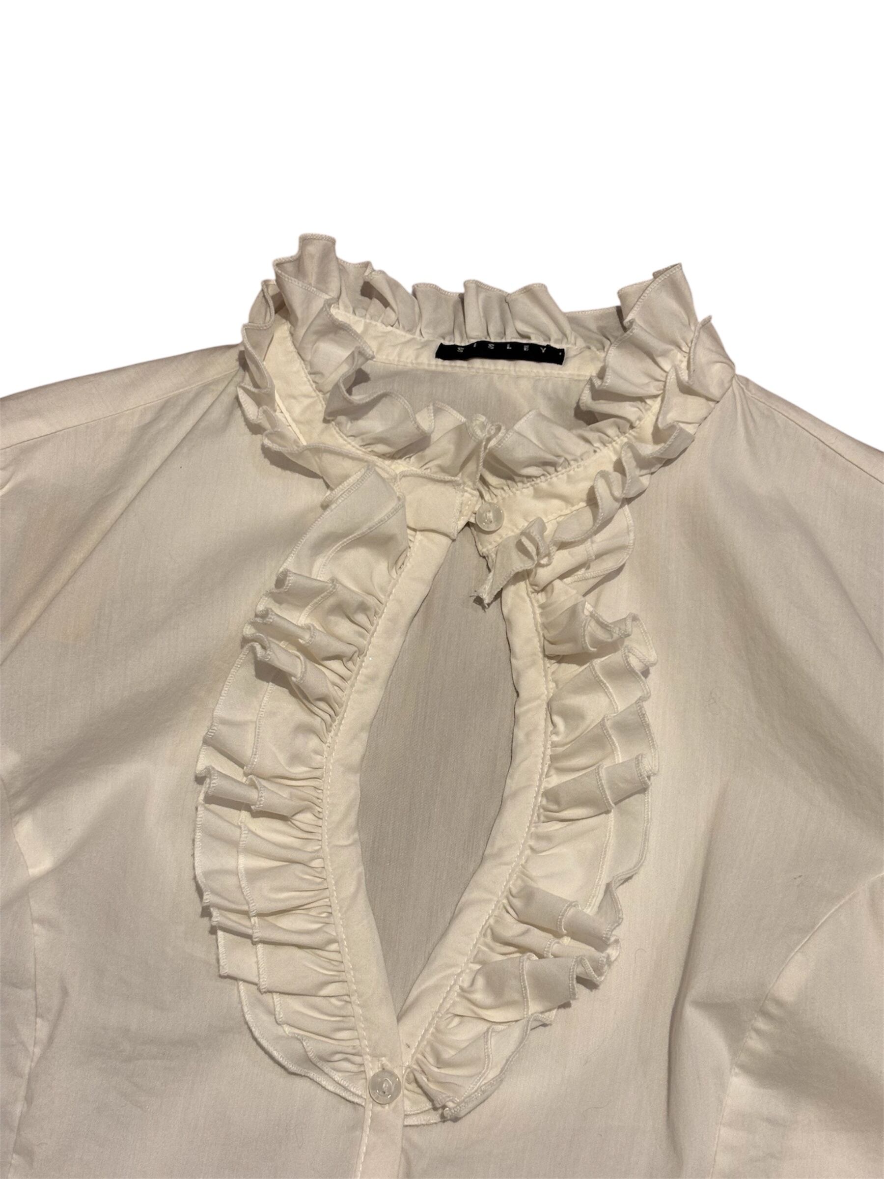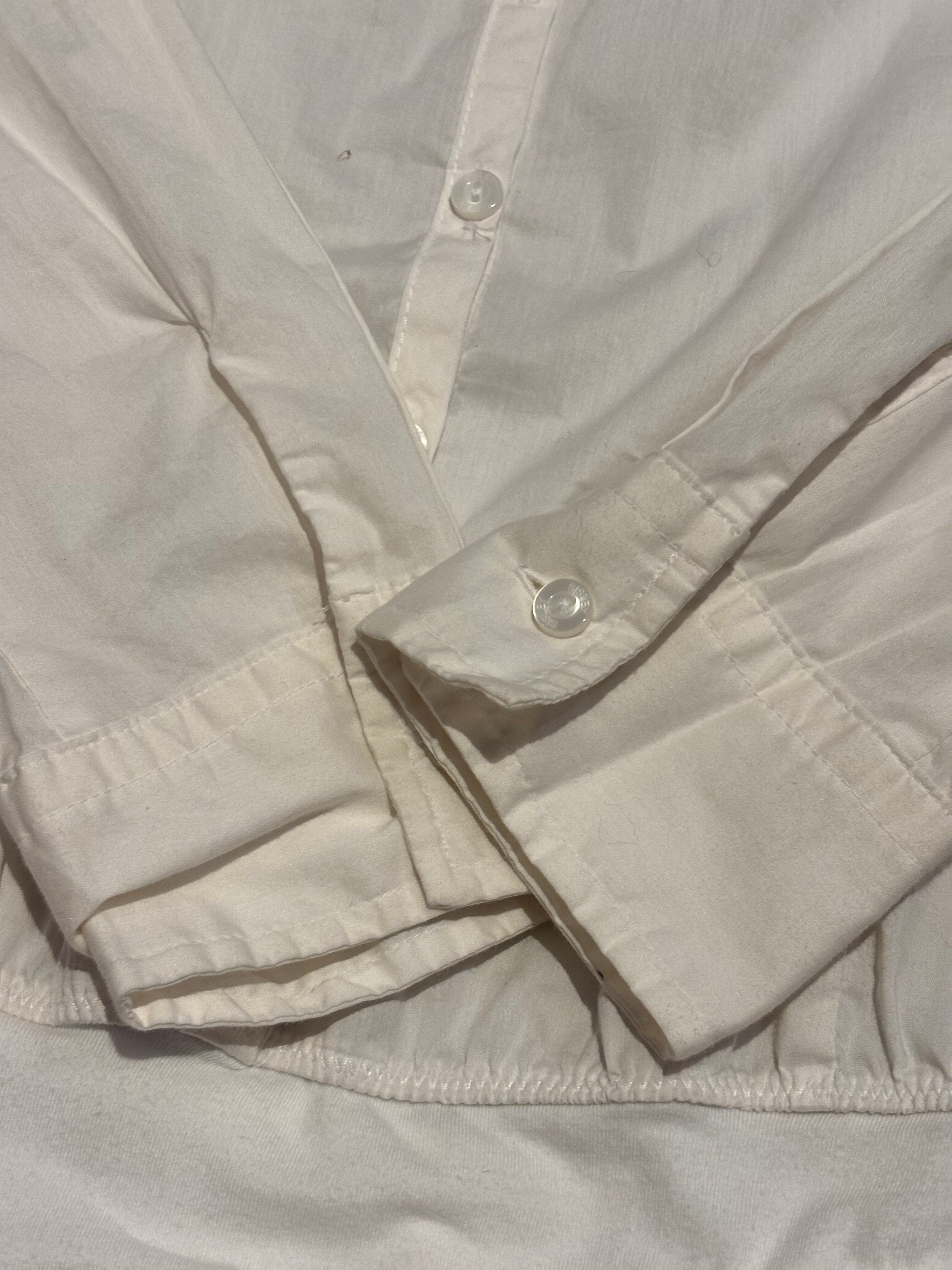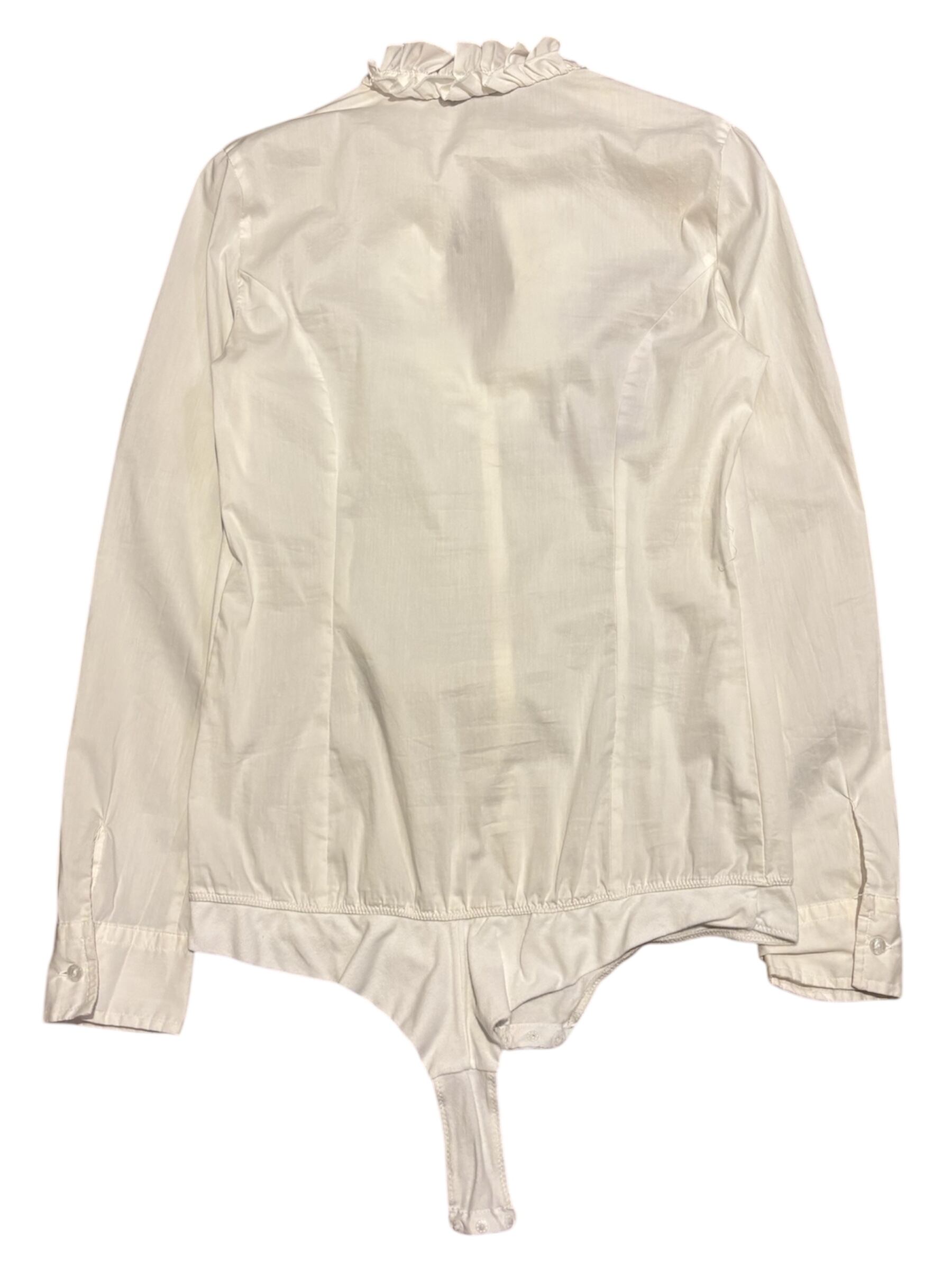 しっかりとした生地感でからだを美しく引き立てるフォルム。胸元が空いたデザインでレオタードのようになっているのでレイヤードとしても使えます。白地でどんなアイテムとも合わせやすく、透け感もあるので下に柄物を仕込んでも良さそうです◎