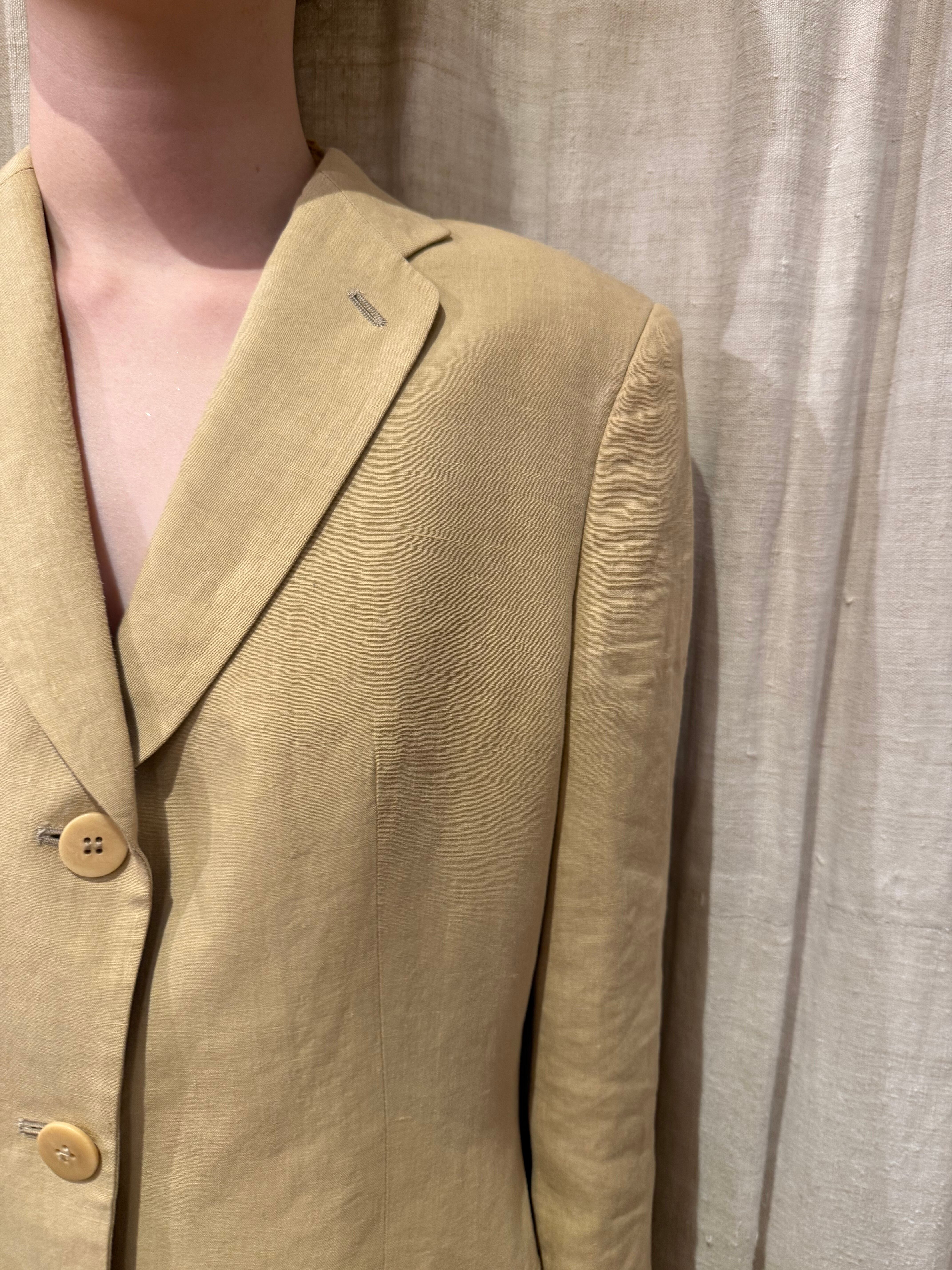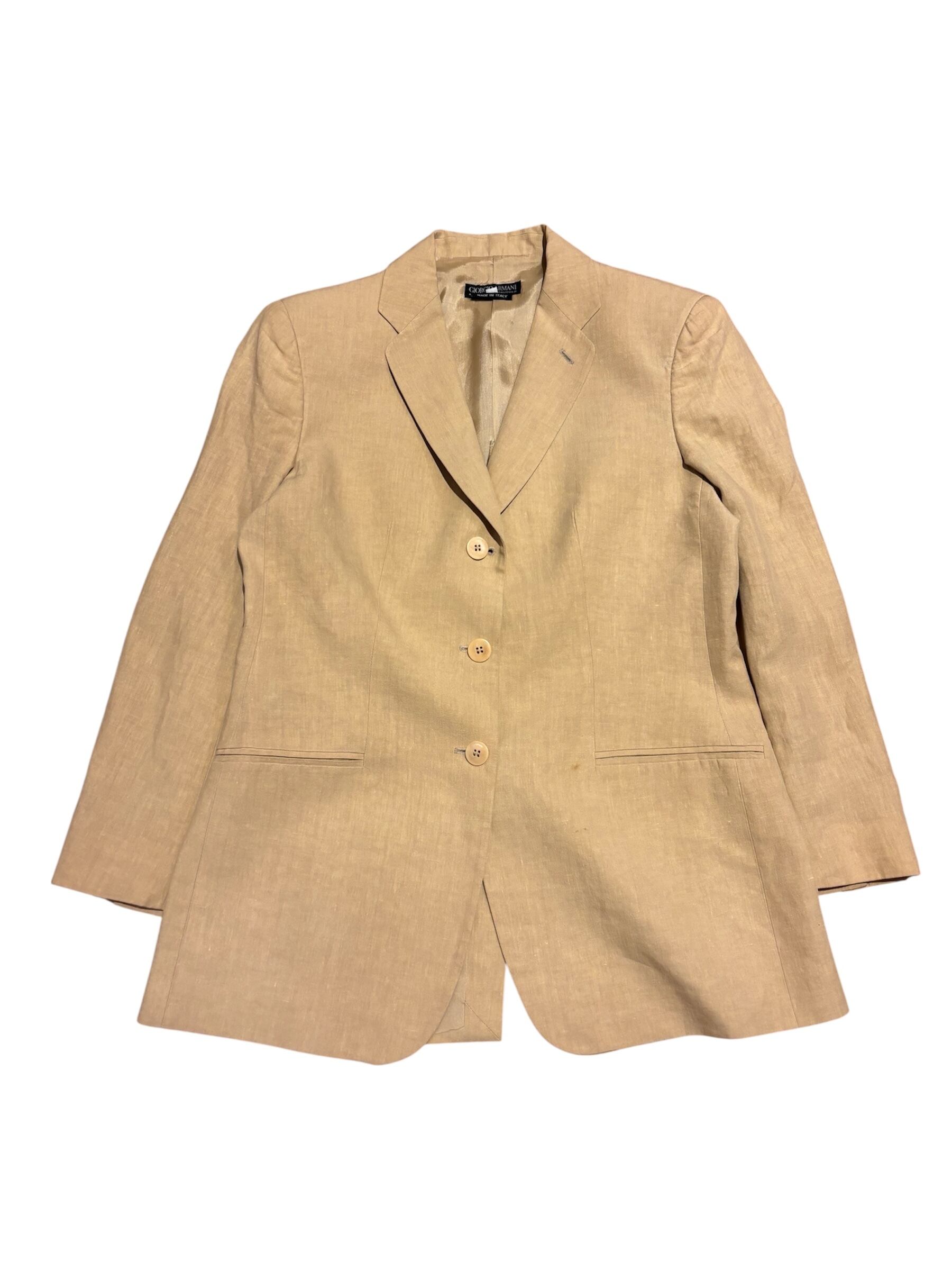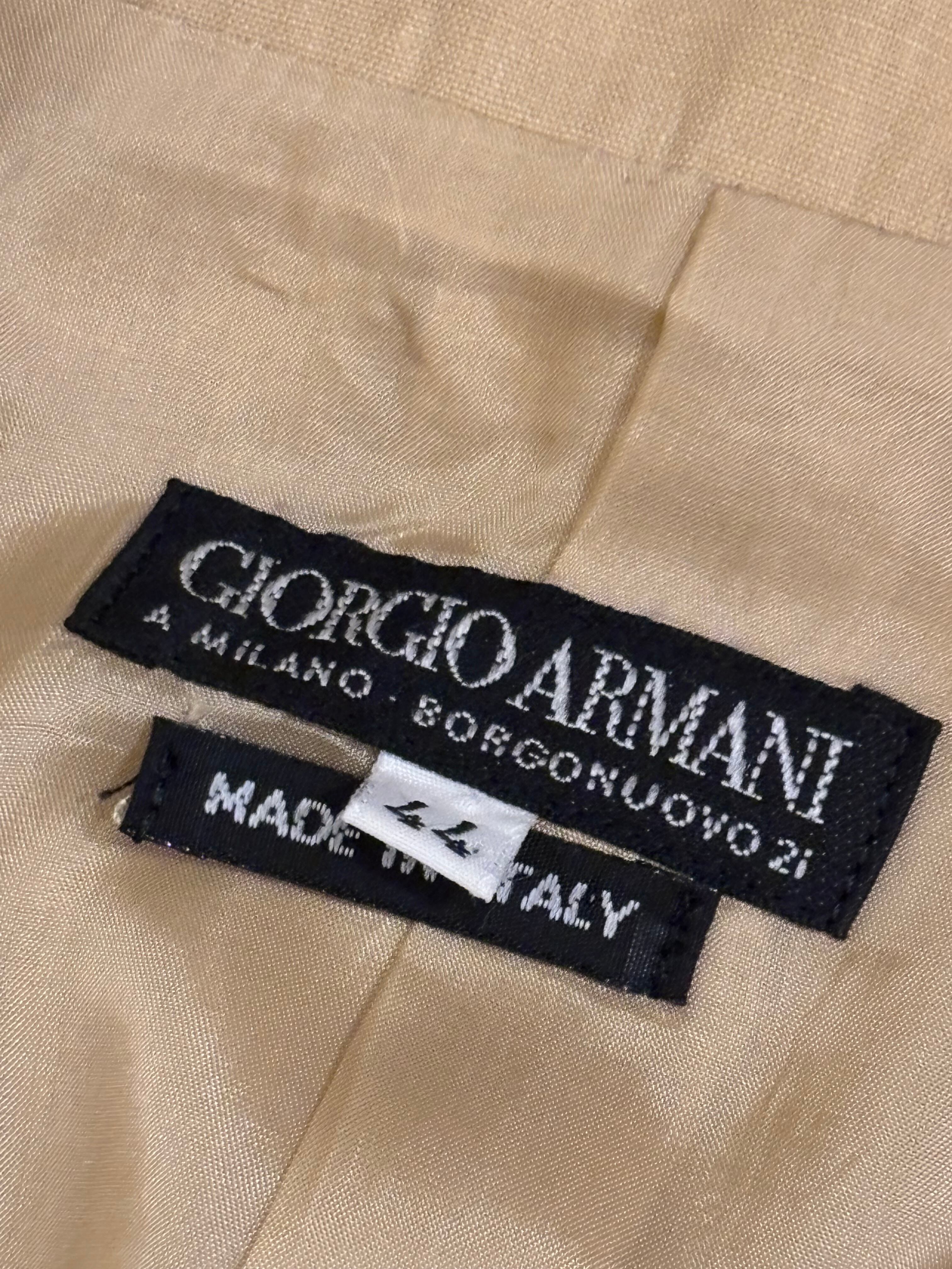 ジョルジオ・アルマーニの中でも人気の高いテーラードジャケット。イタリア製なのも魅力的です。リネン素材で軽い着心地で、ベージュカラーがとても可愛らしいデザインで、肩パッドがやや大きめなのでバサっと羽織るくらいが丁度良いジャケットです。