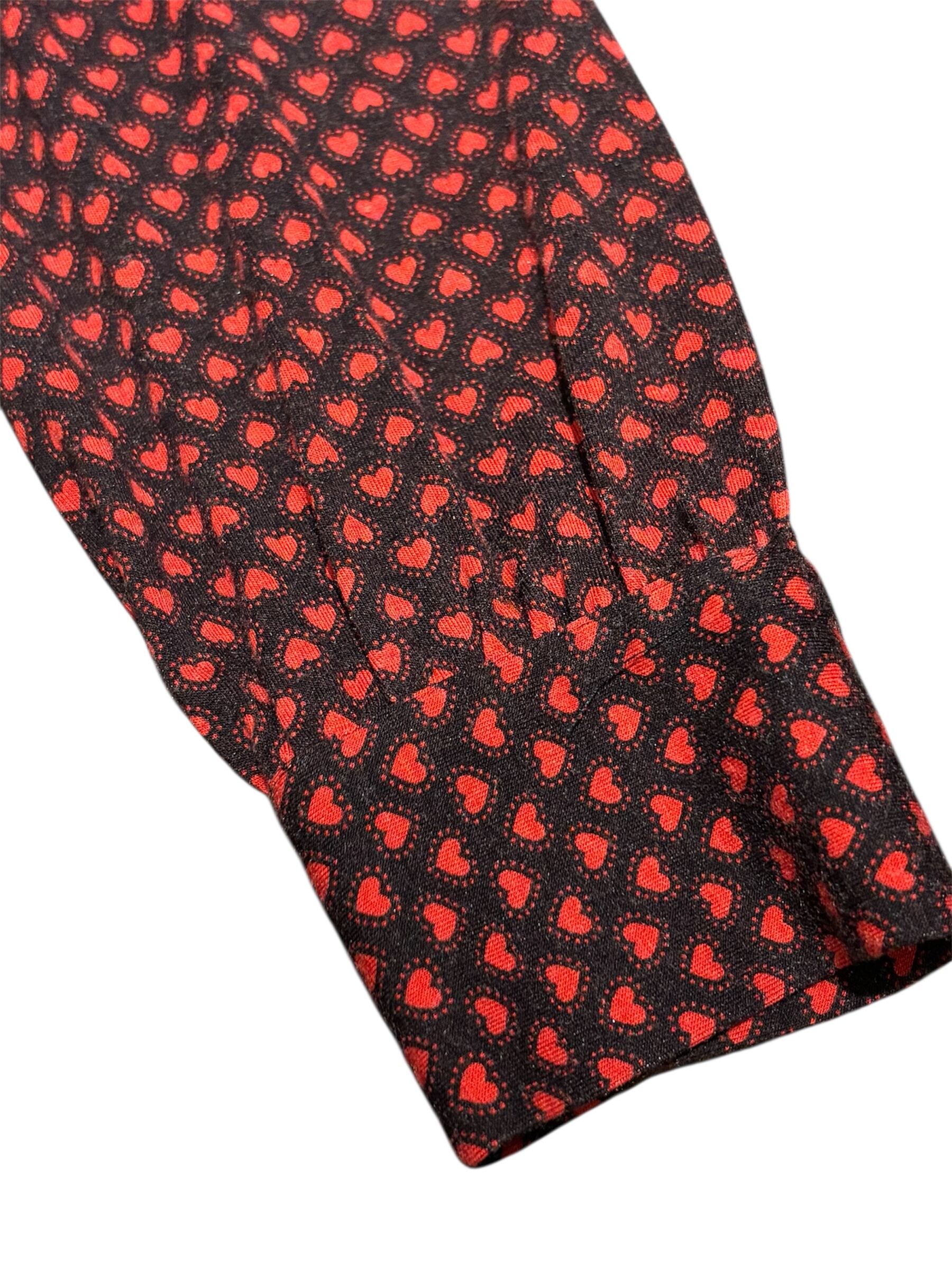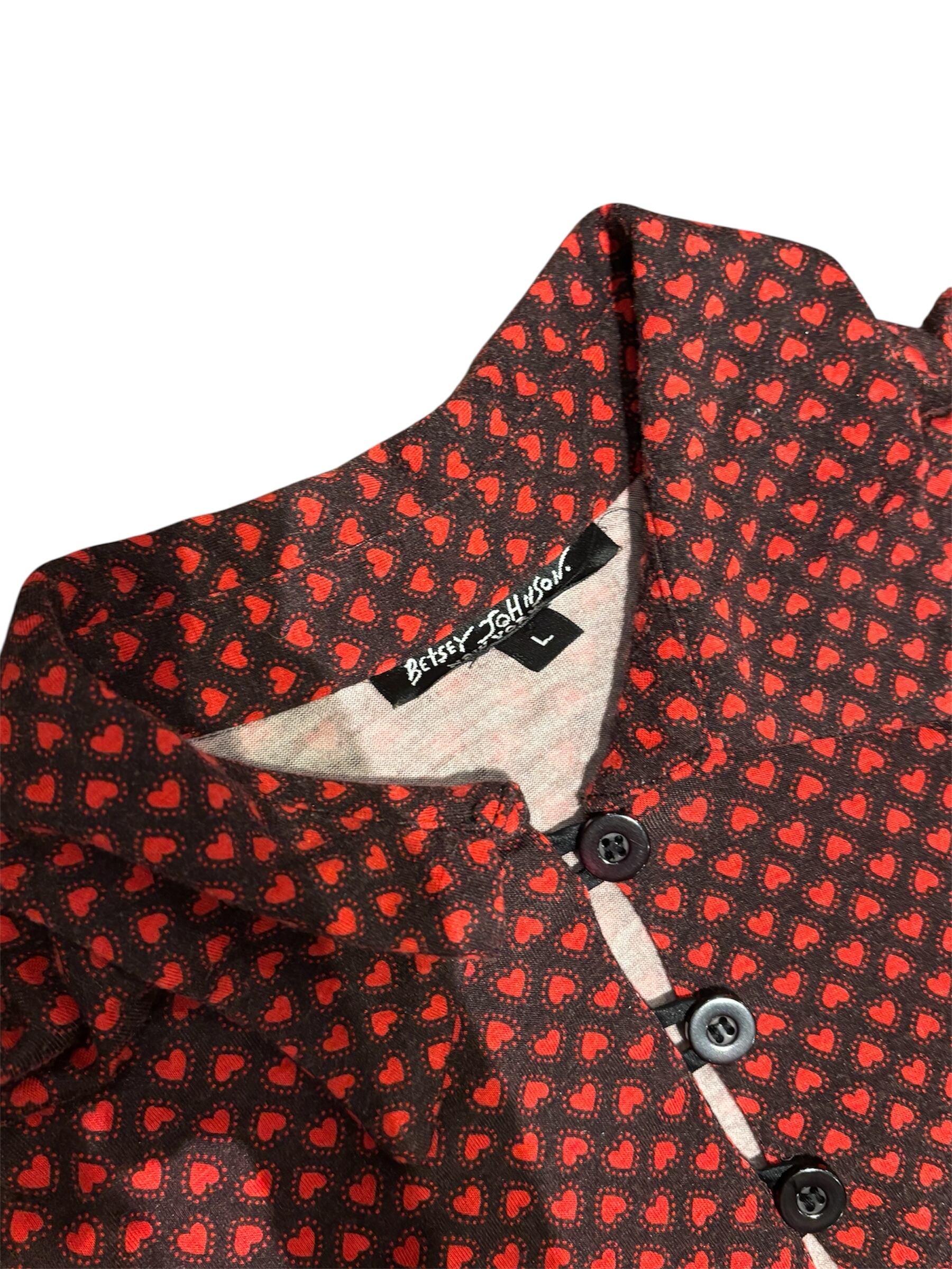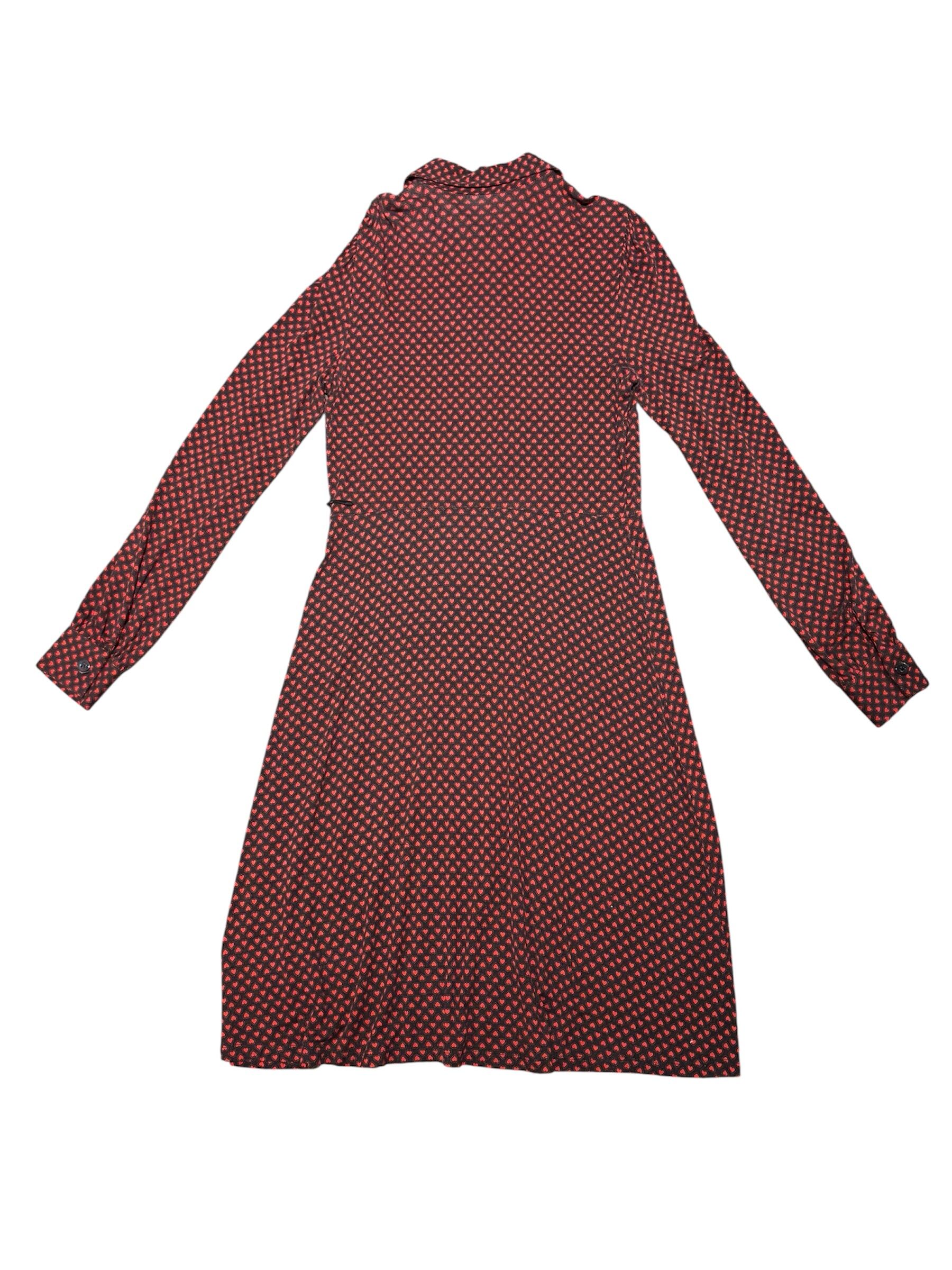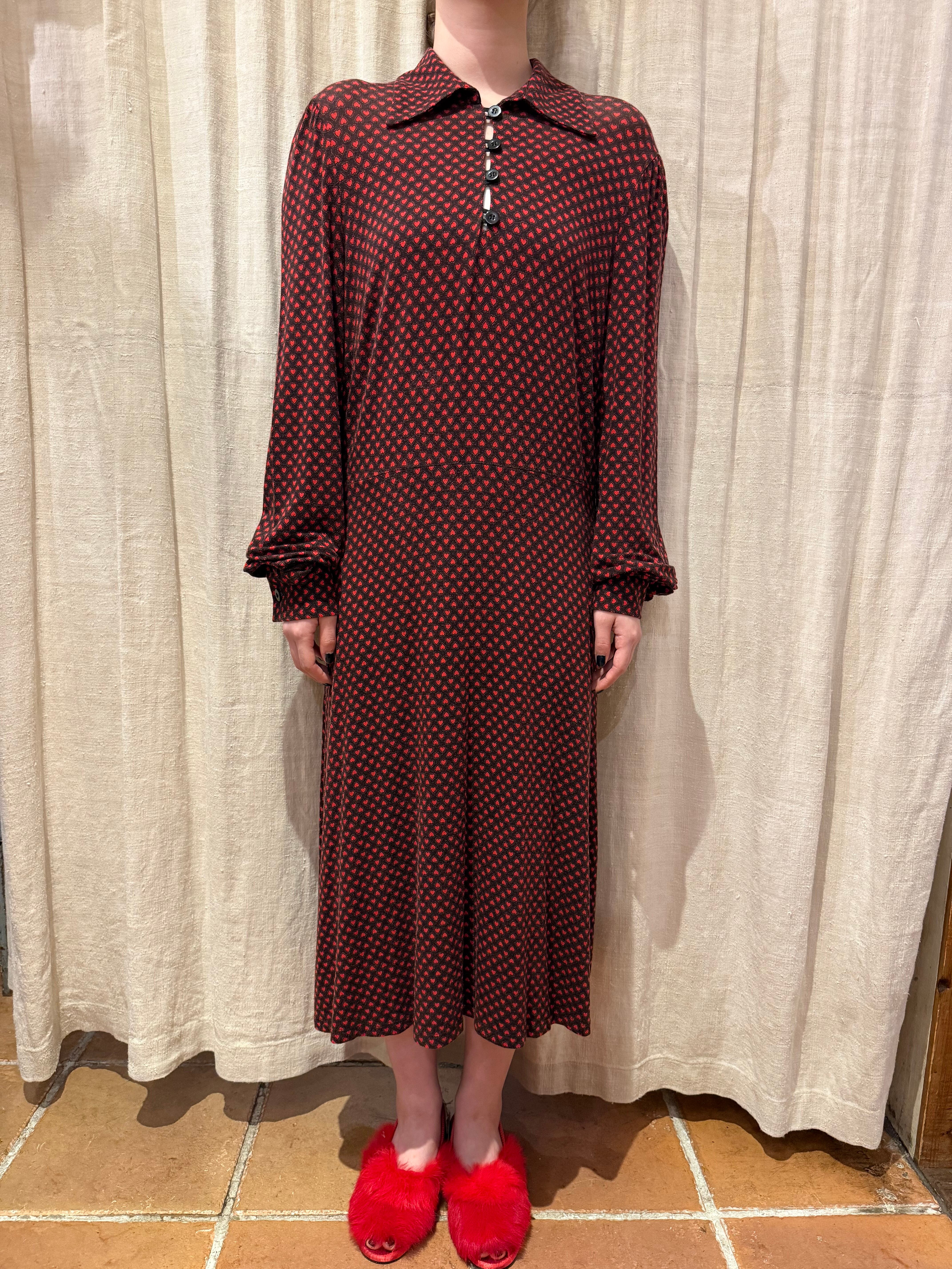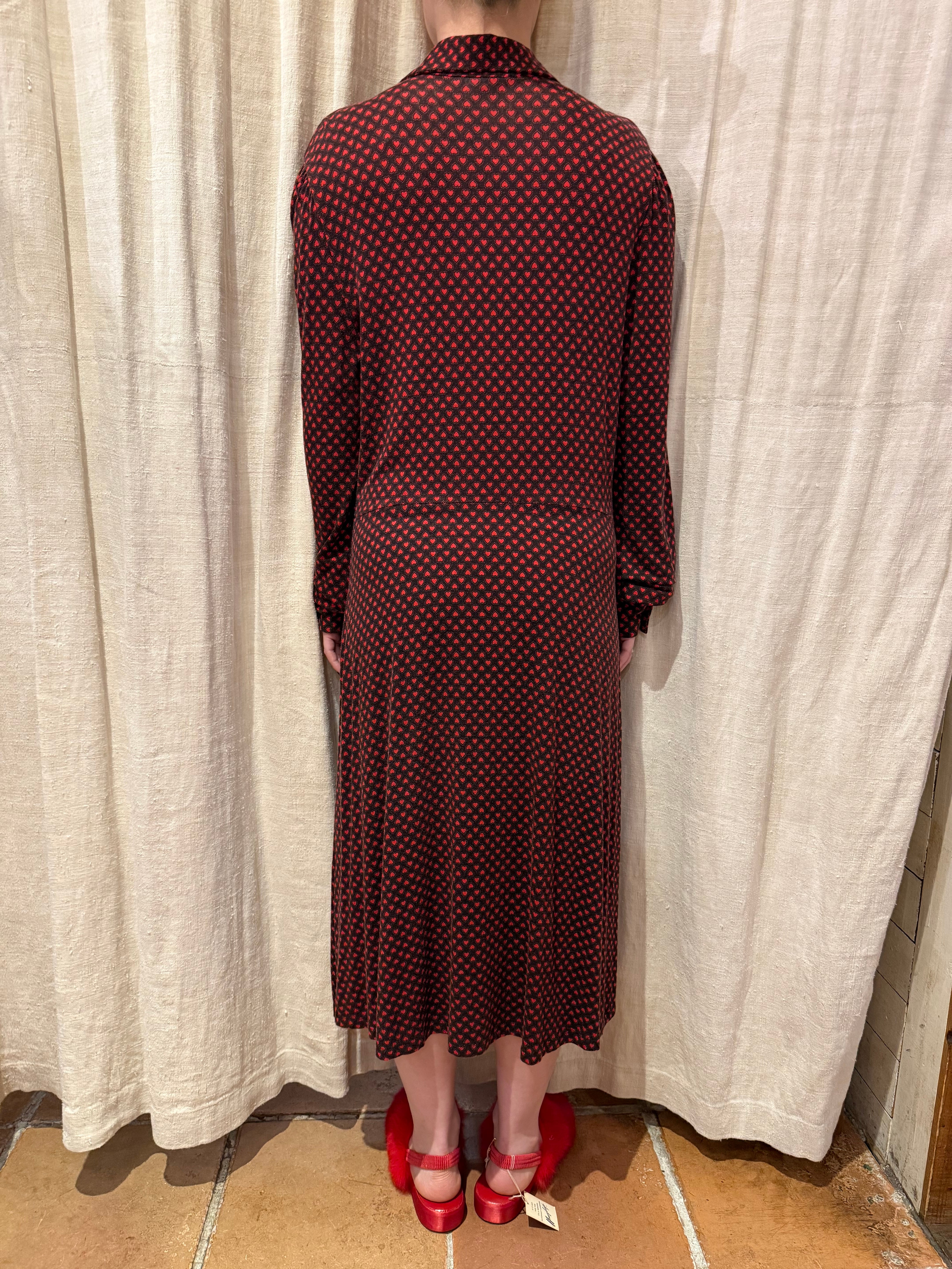スウェットの様な柔らかな肌触りのドレス。クタッとした着心地がとても気持ち良いです。全体はハートのプリントが施されており、等間隔のボタンデザインが素肌やインナーをチラ見せしてくれます。袖が大きめのシルエットでたまる感じもとても可愛らしいです。
