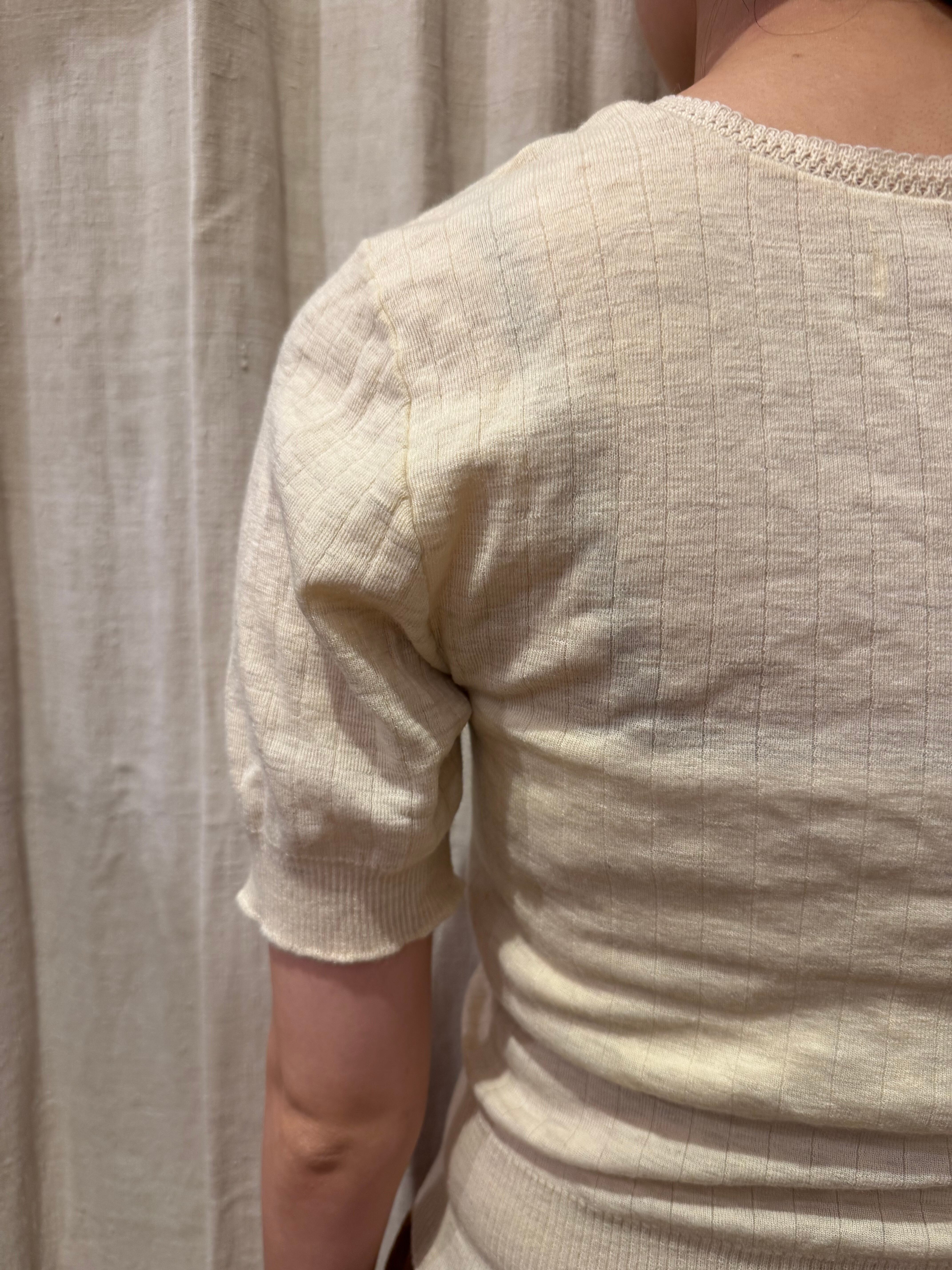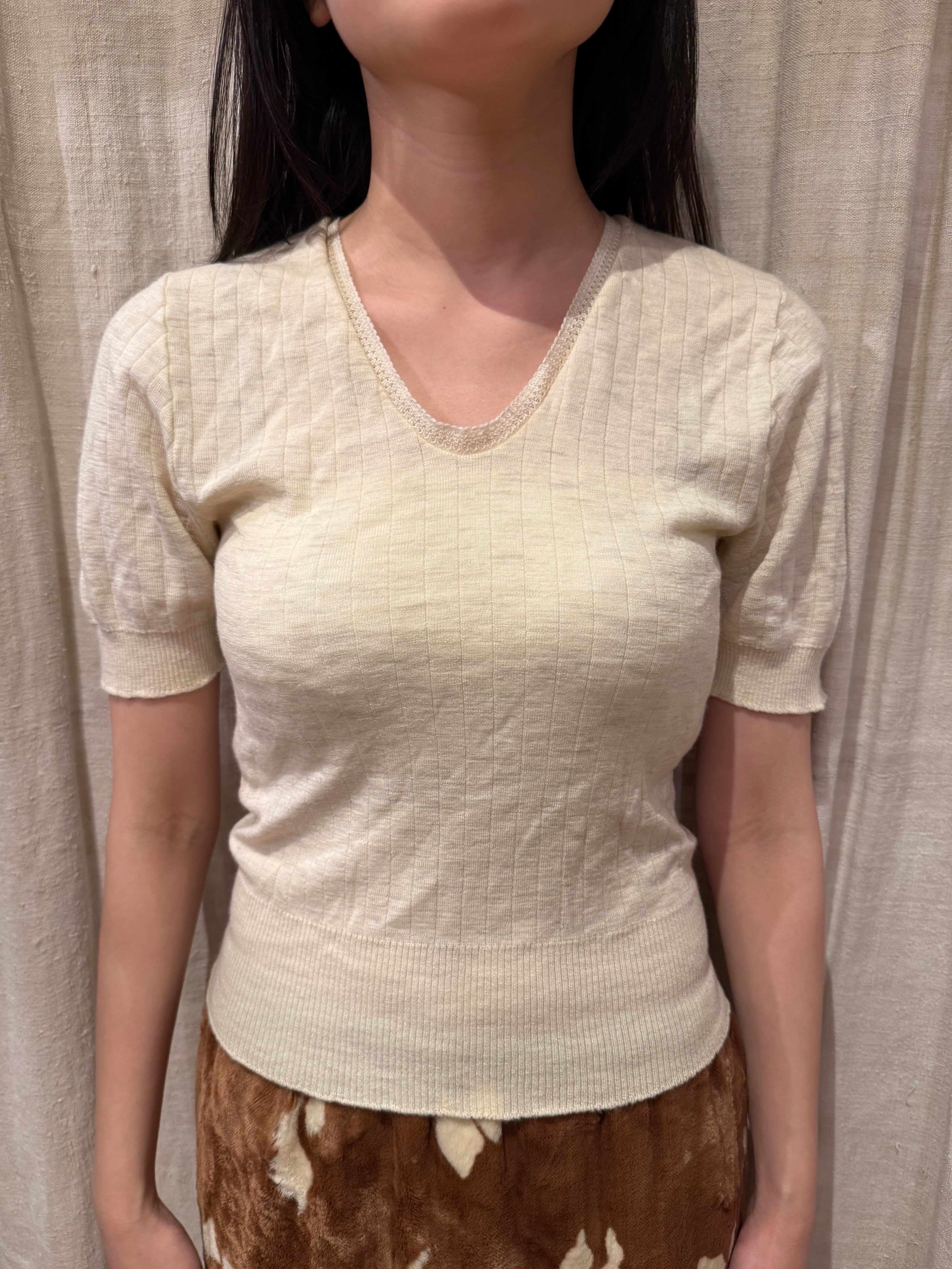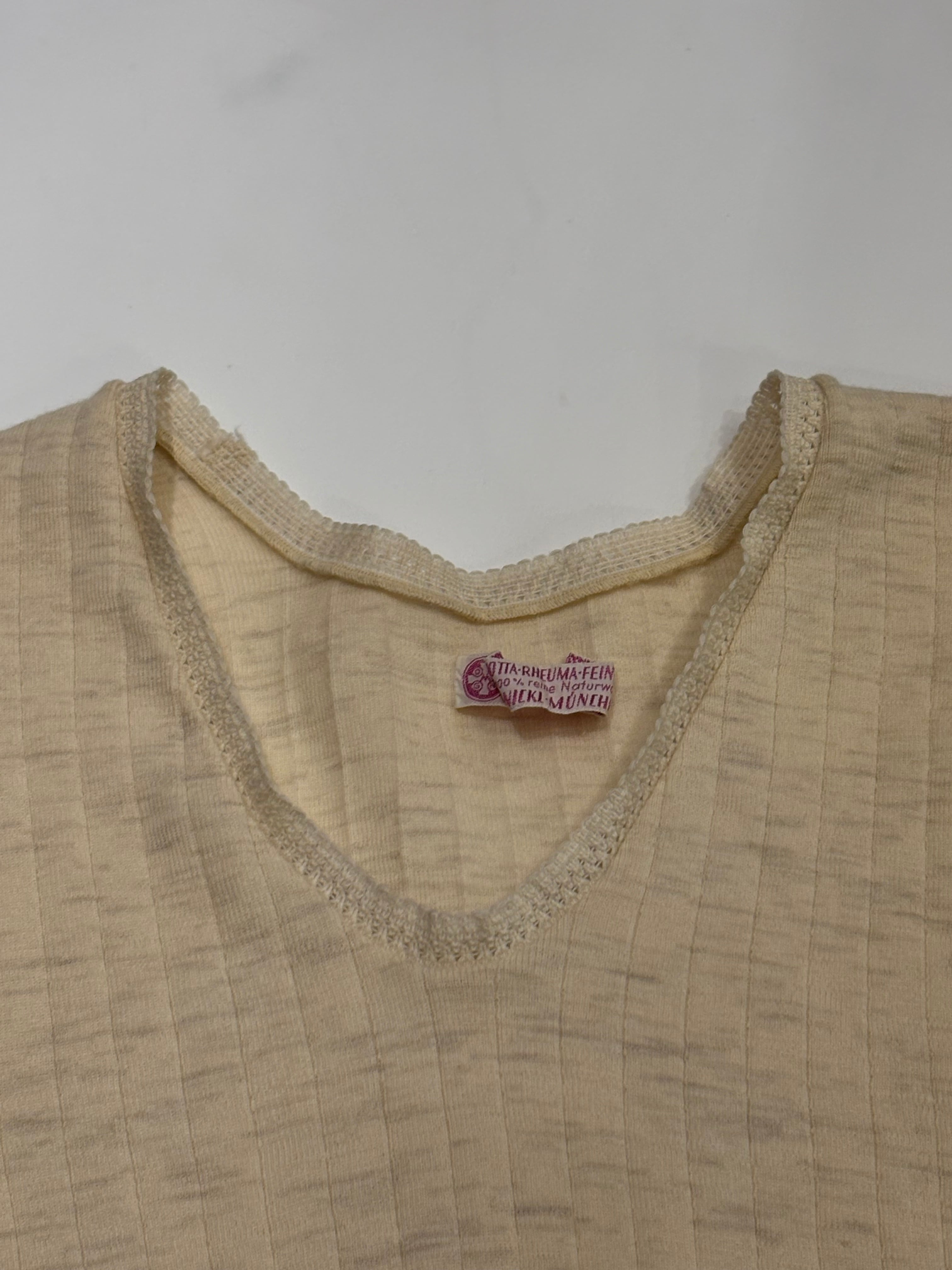 これからの時期に活躍するウールのアンダーウェア。ウールなので暖かい着心地で伸縮性もあります。生成りがかっていてリブデザインなので、ヴィンテージ感が自然に出せるアイテムです。同系色でコーディネートをまとめても可愛らしいですね。