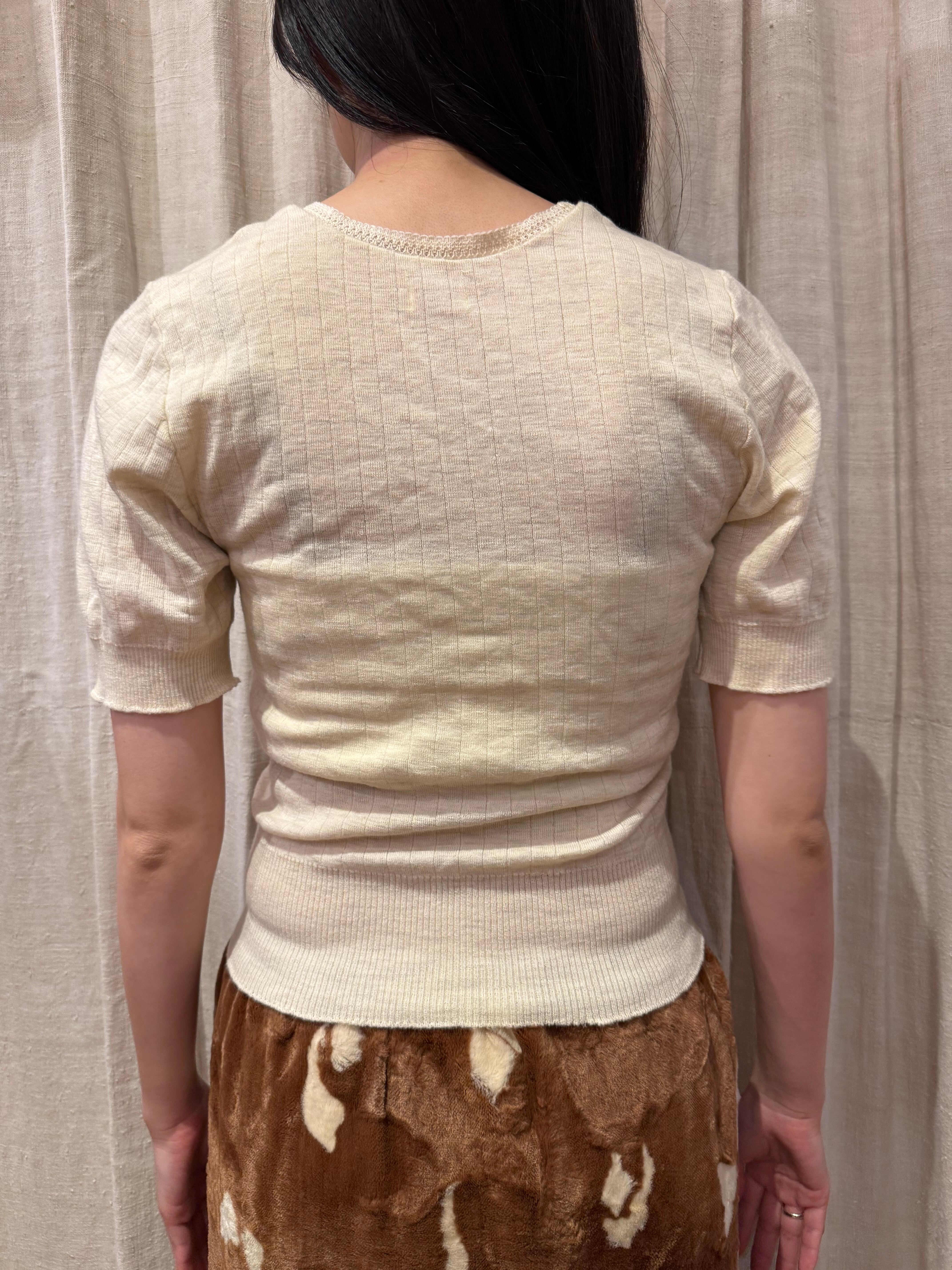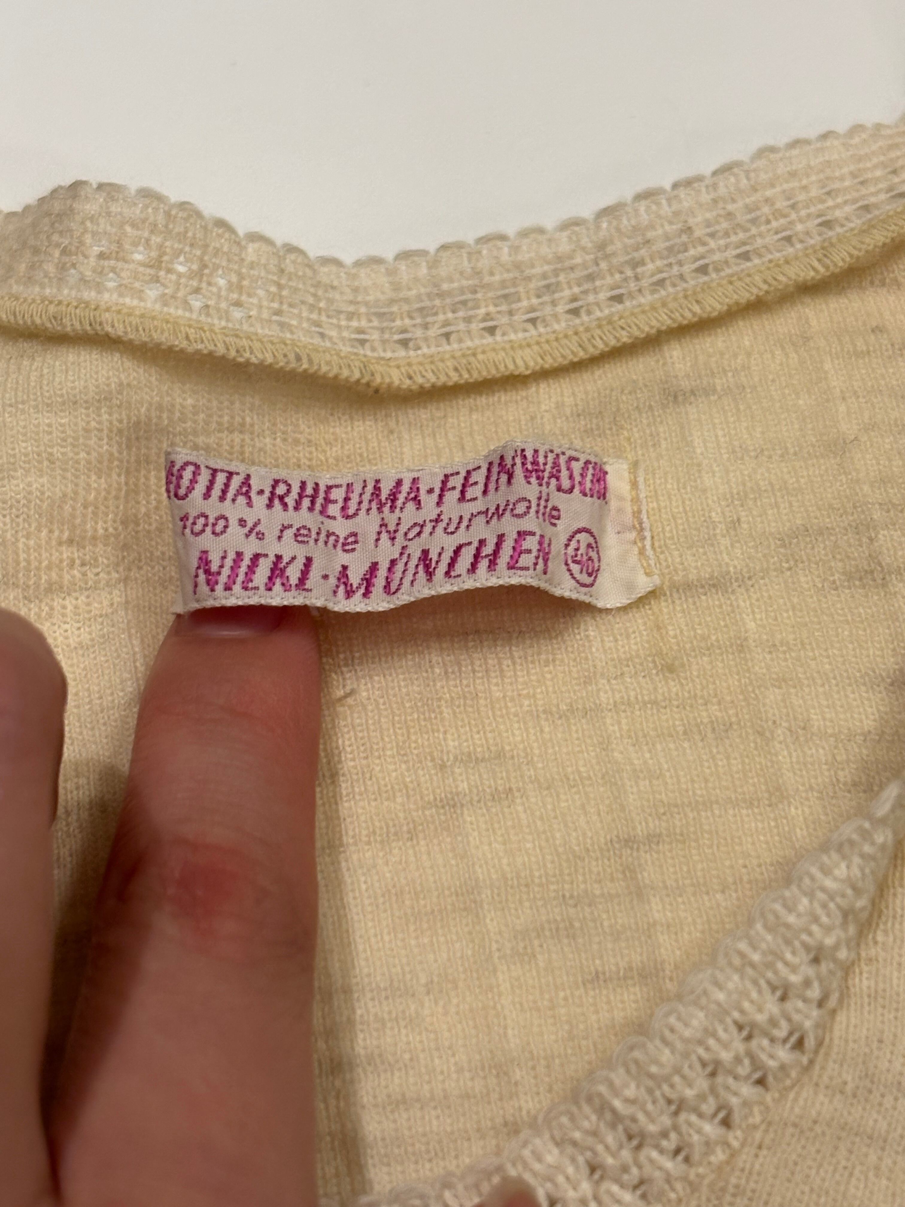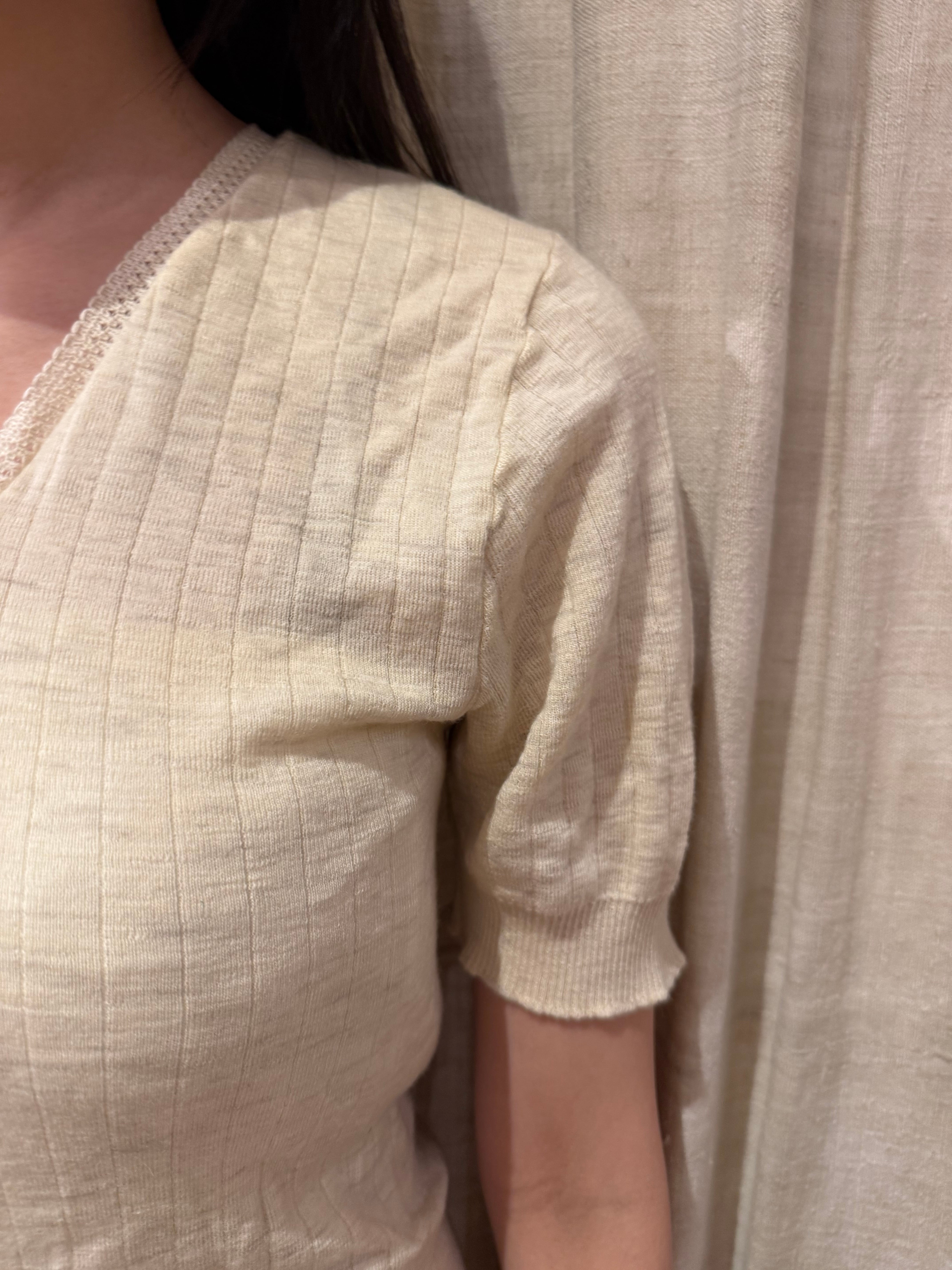 これからの時期に活躍するウールのアンダーウェア。ウールなので暖かい着心地で伸縮性もあります。生成りがかっていてリブデザインなので、ヴィンテージ感が自然に出せるアイテムです。同系色でコーディネートをまとめても可愛らしいですね。