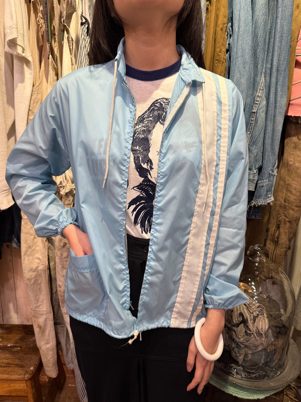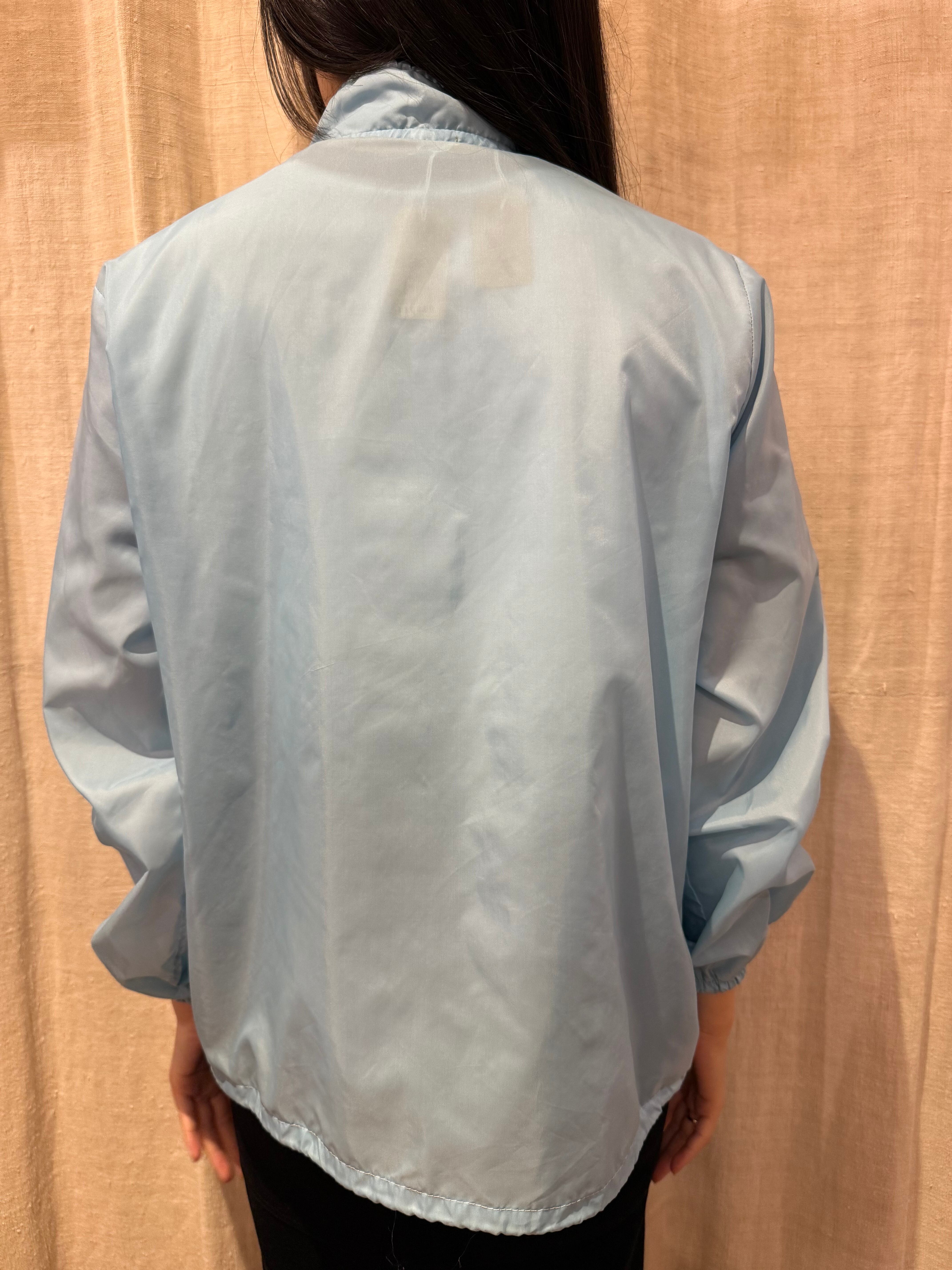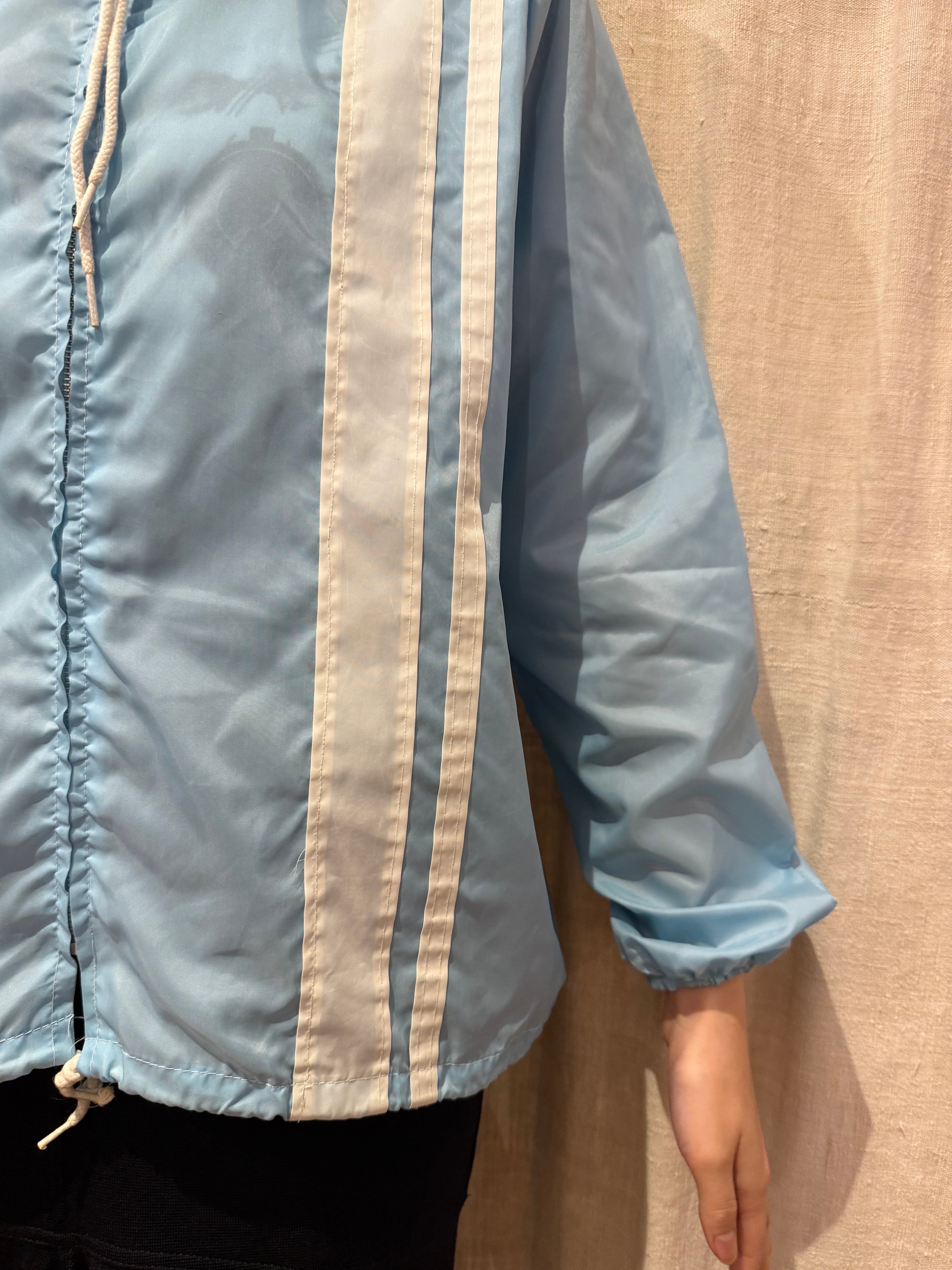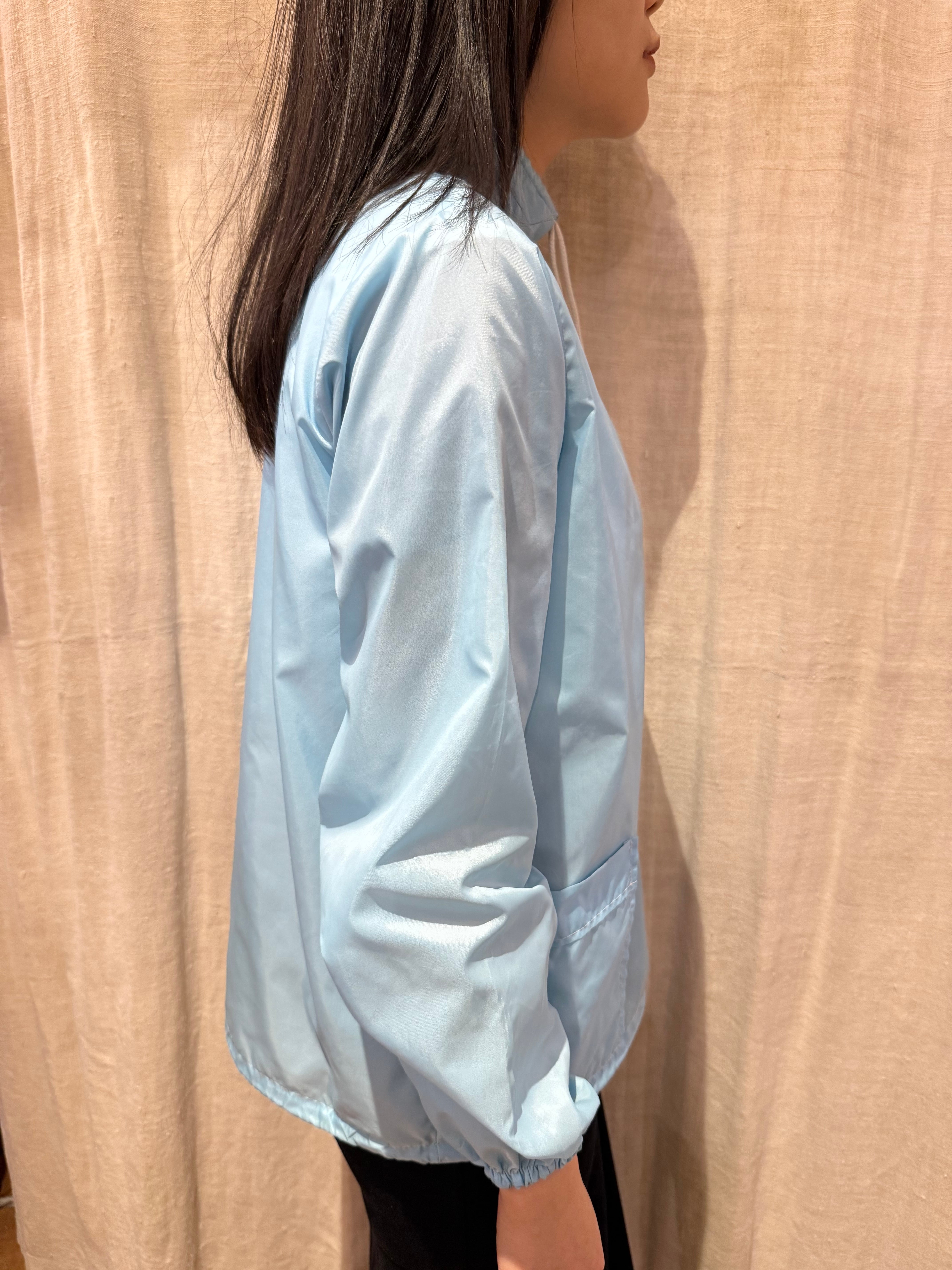 ナイロン素材でスポーティな雰囲気。淡い水色に縦に入ったラインが特徴的です。透け感があるのでインナーに柄物を入れても◎襟はドローコードで調節をする事も可能です。お洒落も機能性もあるアイテムです。