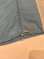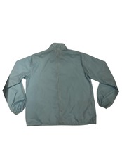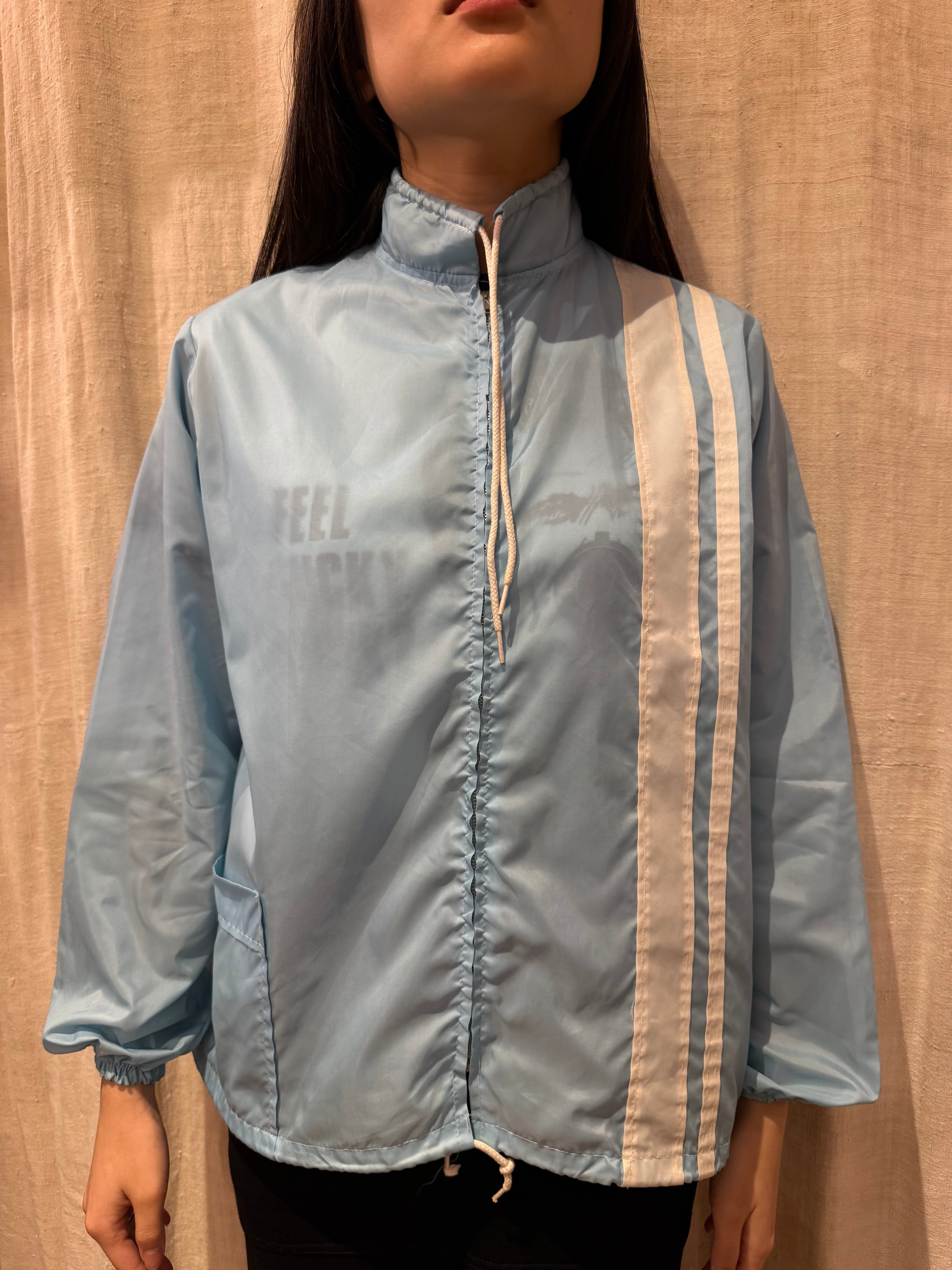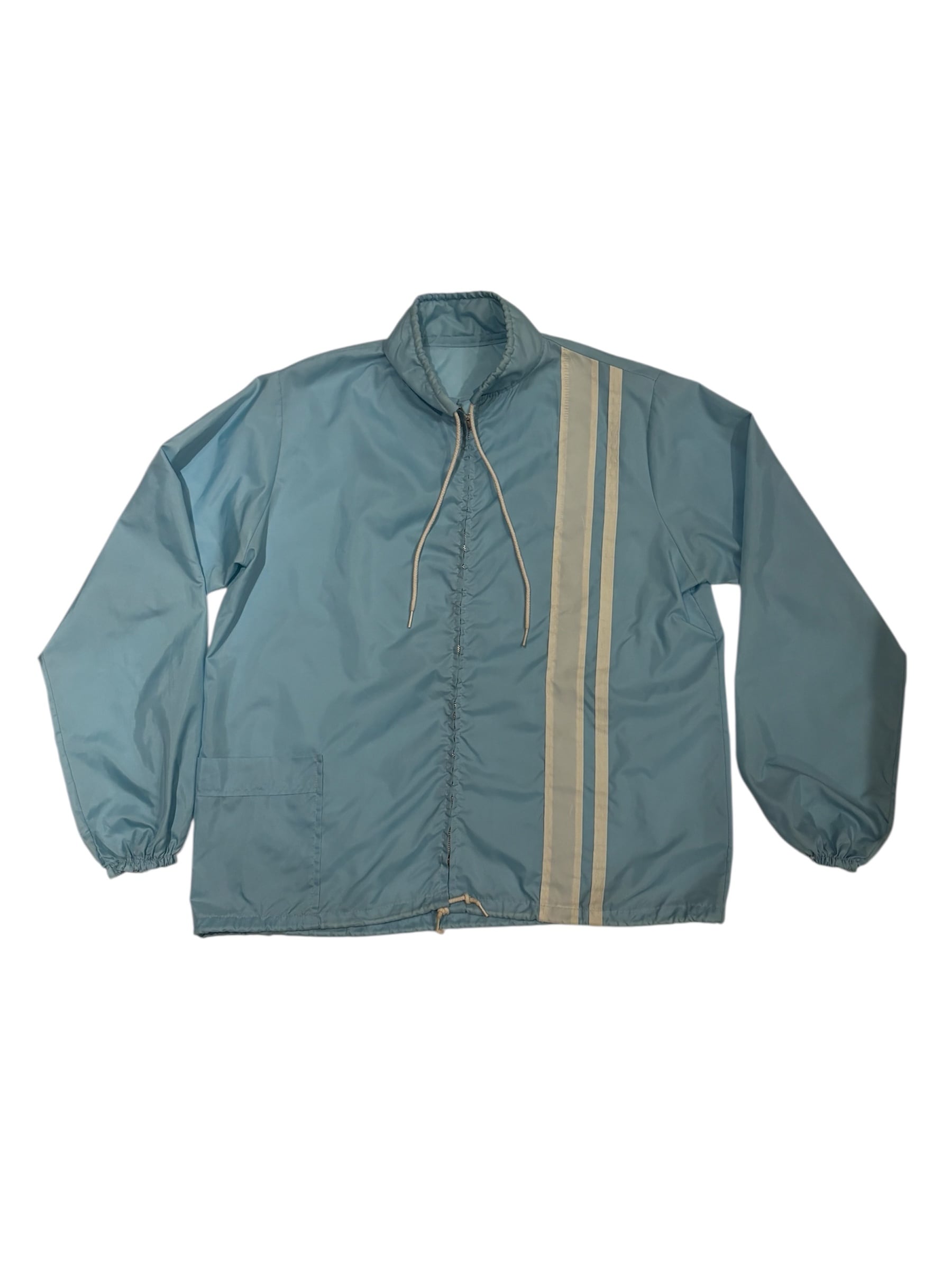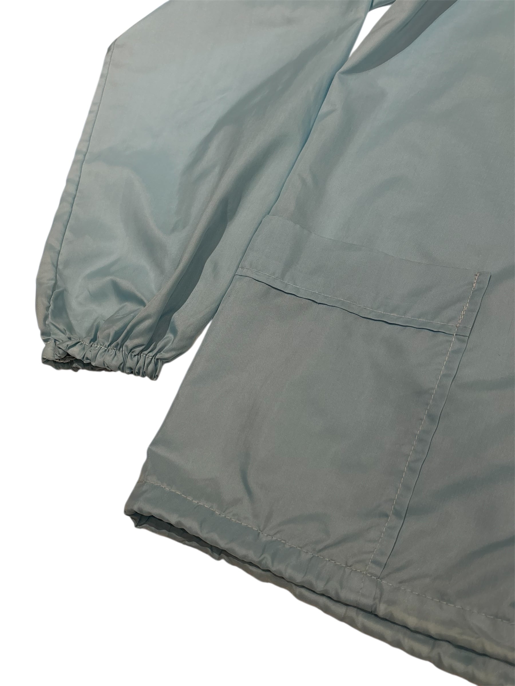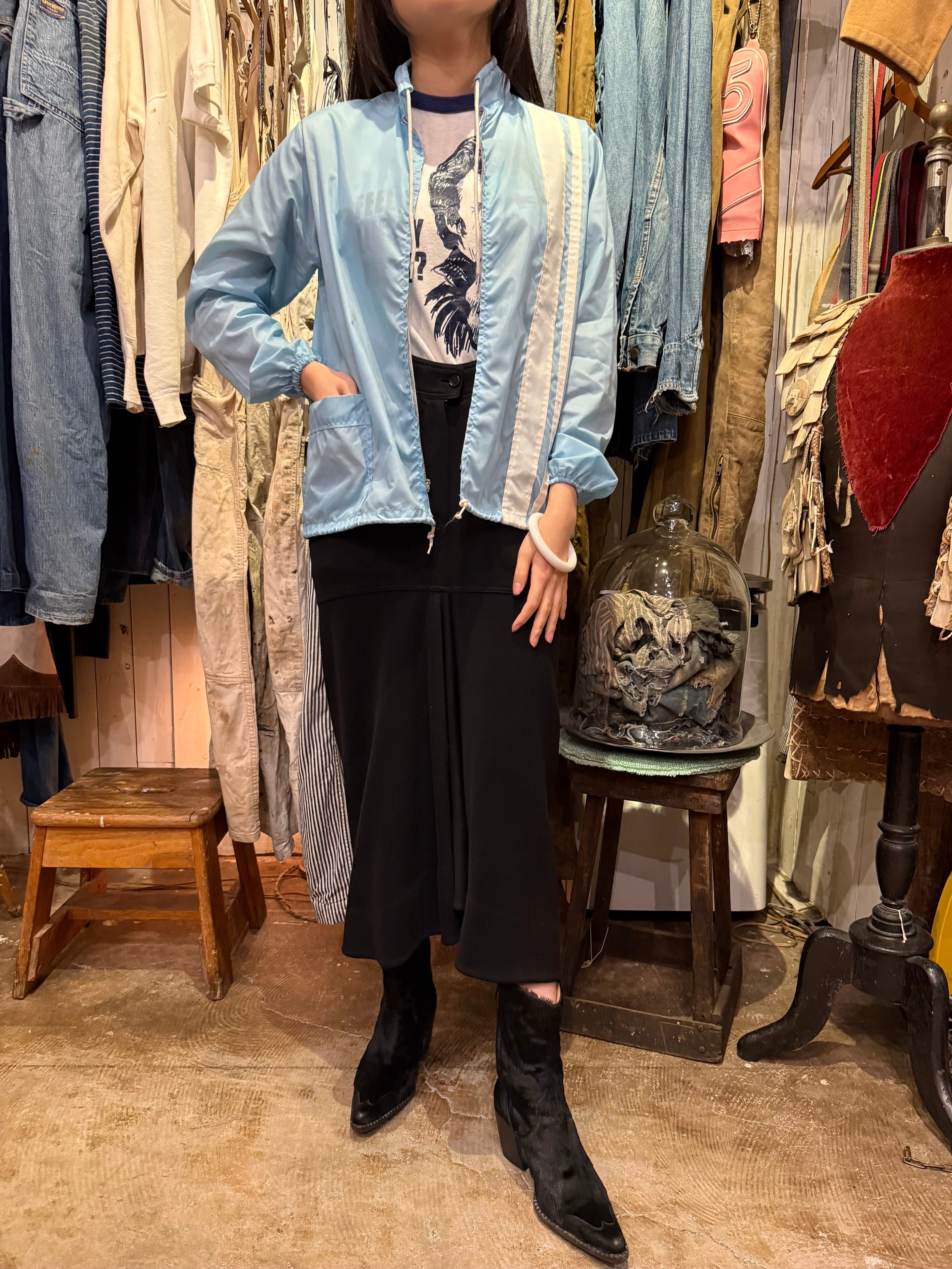 ナイロン素材でスポーティな雰囲気。淡い水色に縦に入ったラインが特徴的です。透け感があるのでインナーに柄物を入れても◎襟はドローコードで調節をする事も可能です。お洒落も機能性もあるアイテムです。