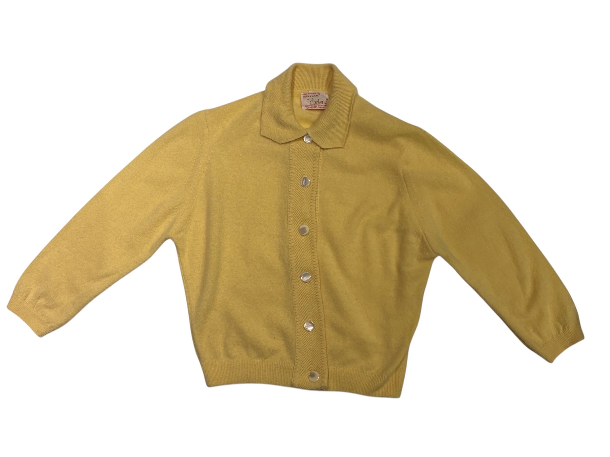柔らかいイエローカラーのニット素材のカーディガンです。コンパクトなサイズ感なのでアウターなども上からかさばらずに着用できそうです。襟もついており、シャツのような雰囲気で1枚で着用するのもオススメです。