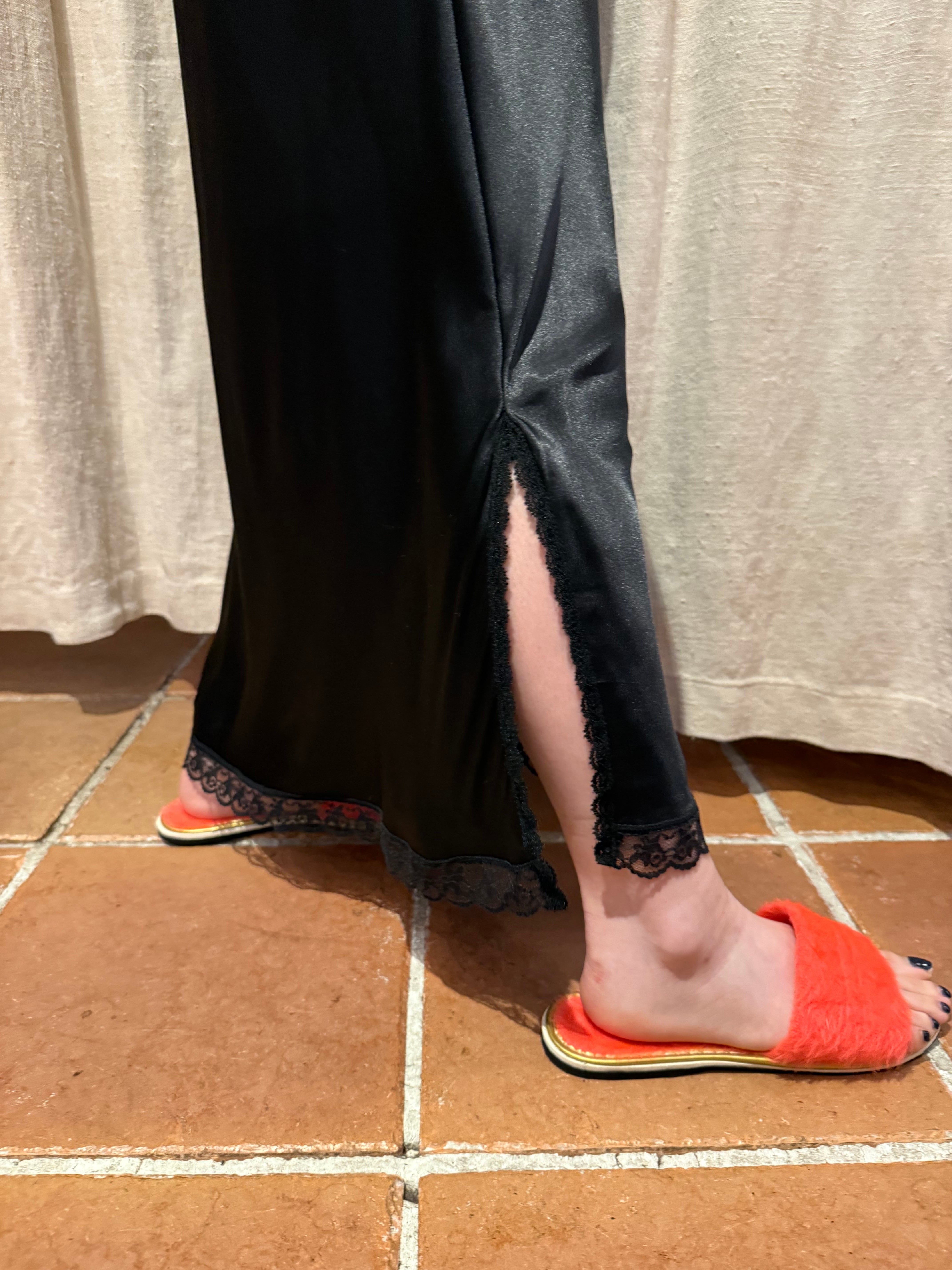 サテン生地のスカートです。軽やか着心地で、少し深めのスリットが入っており、歩きやすいです。ペチコートとしてもご使用して頂けそうです。スカラップ仕様のレースがとても可愛らしく、ランジェリーがお好きな方にオススメです。