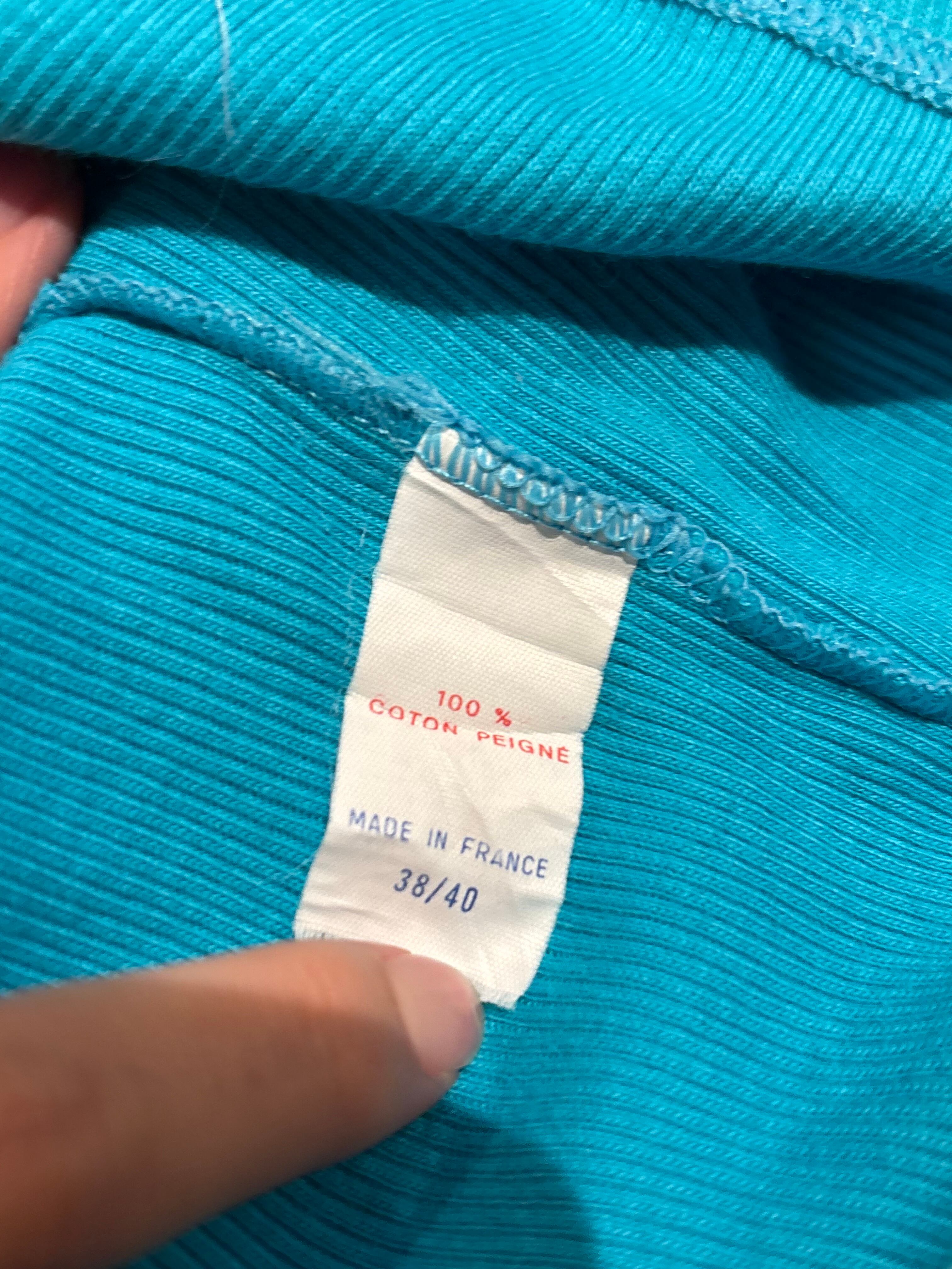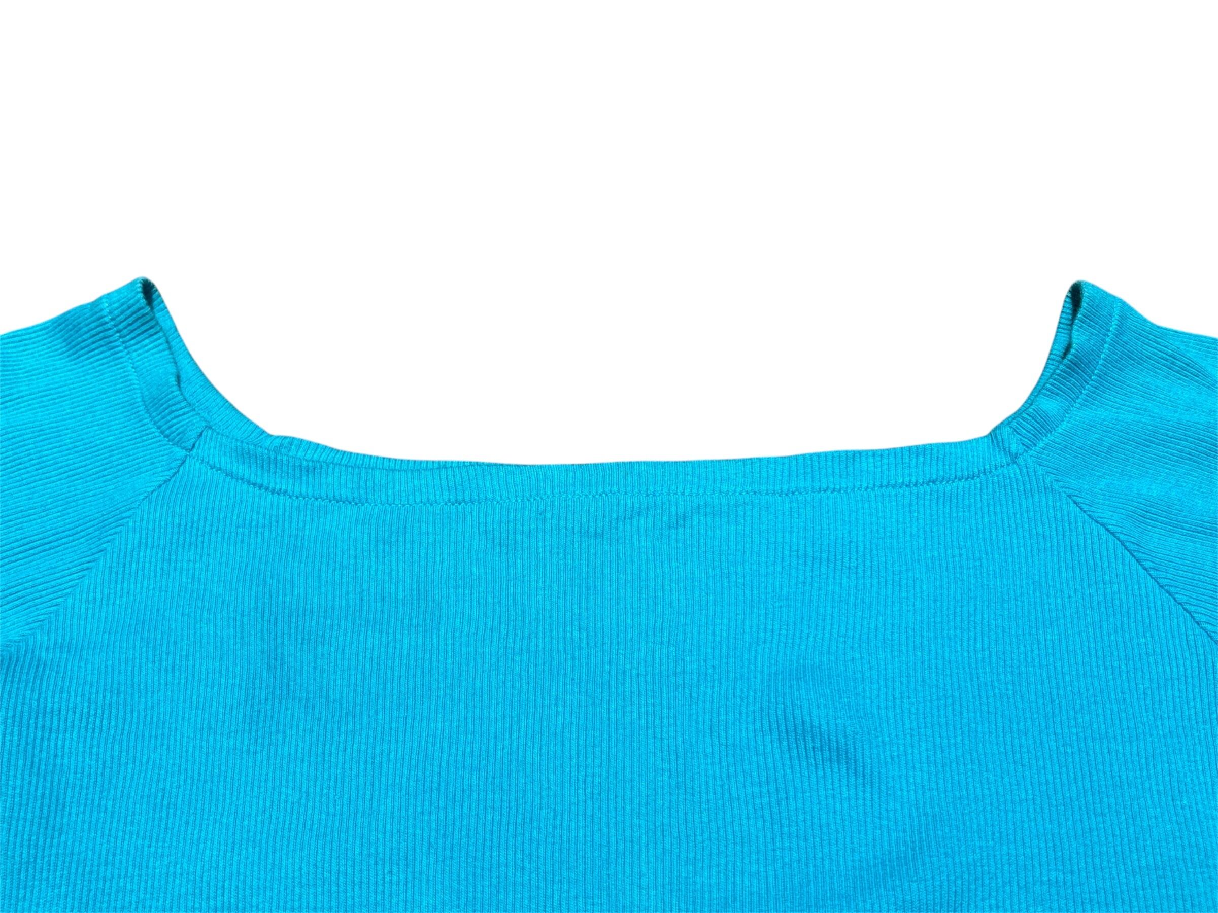 クロップド丈のトップスです。体にフィットするリブ仕様で、若干袖丈が短く、大きく開いた首元はスポーティーな雰囲気でスッキリとした印象です。裾にはゴムが中に入っており、強くも弱くもなく丁度いいゴムの強度で、さりげなく綺麗なシルエットを演出してくれます。