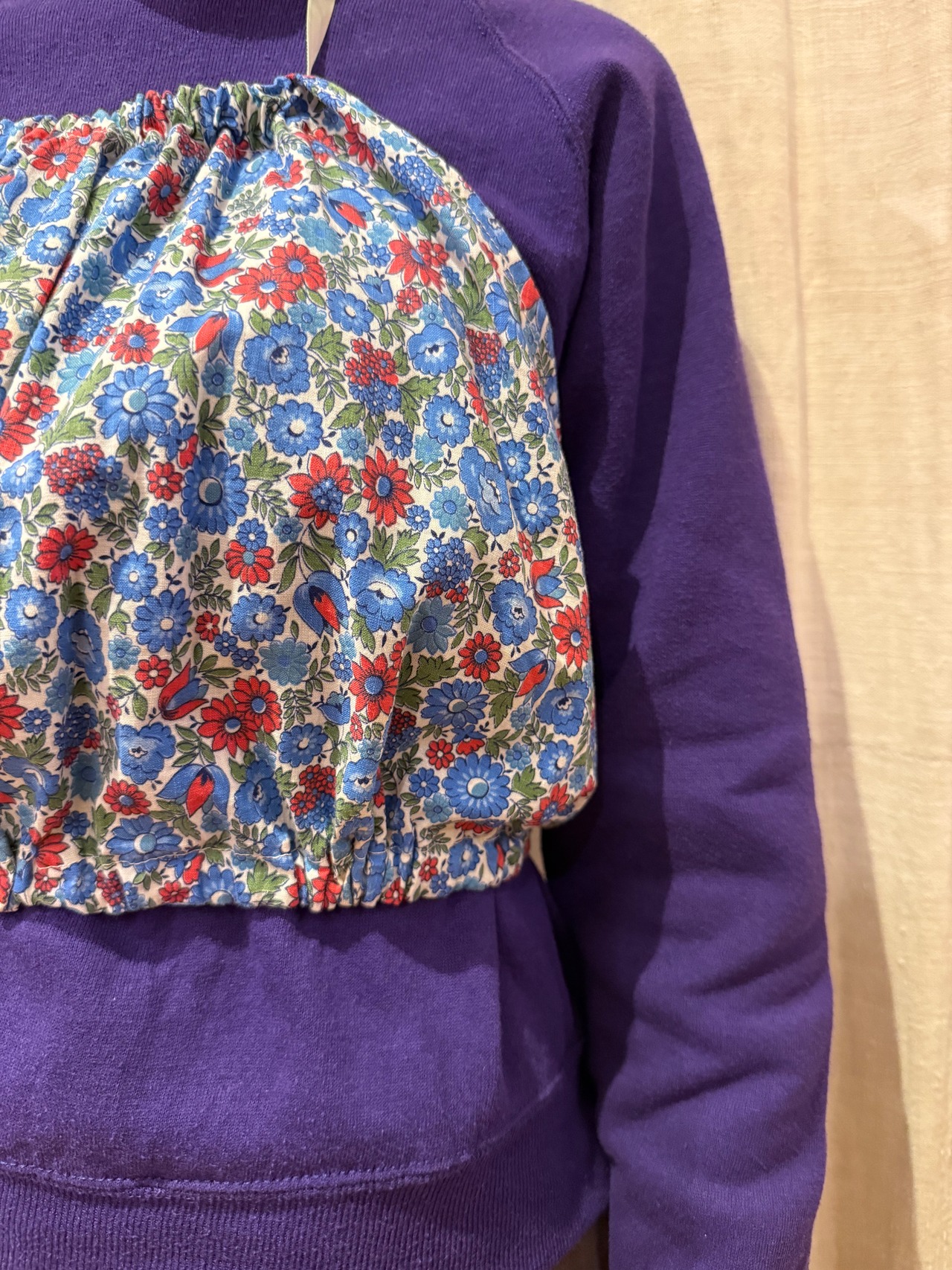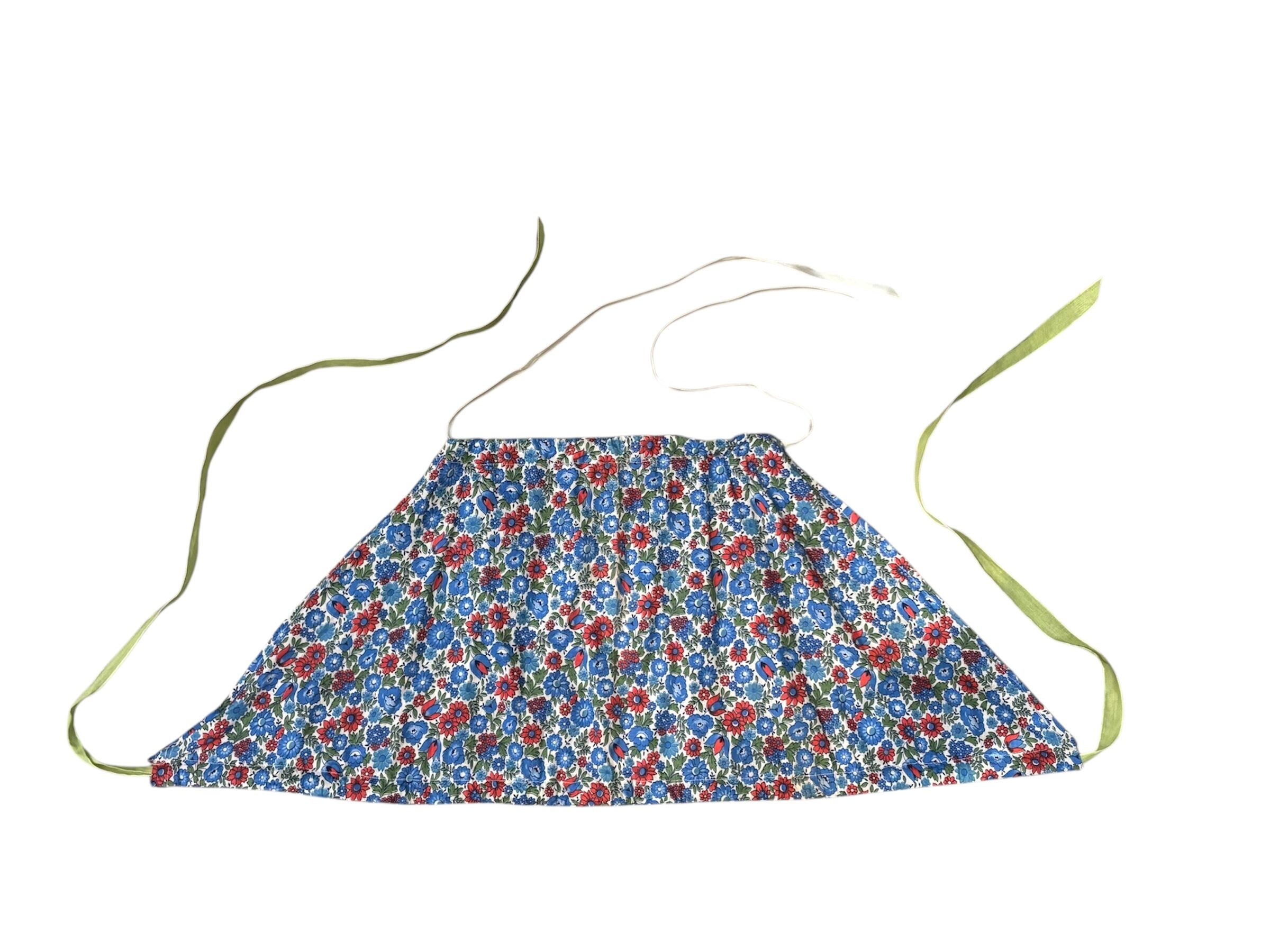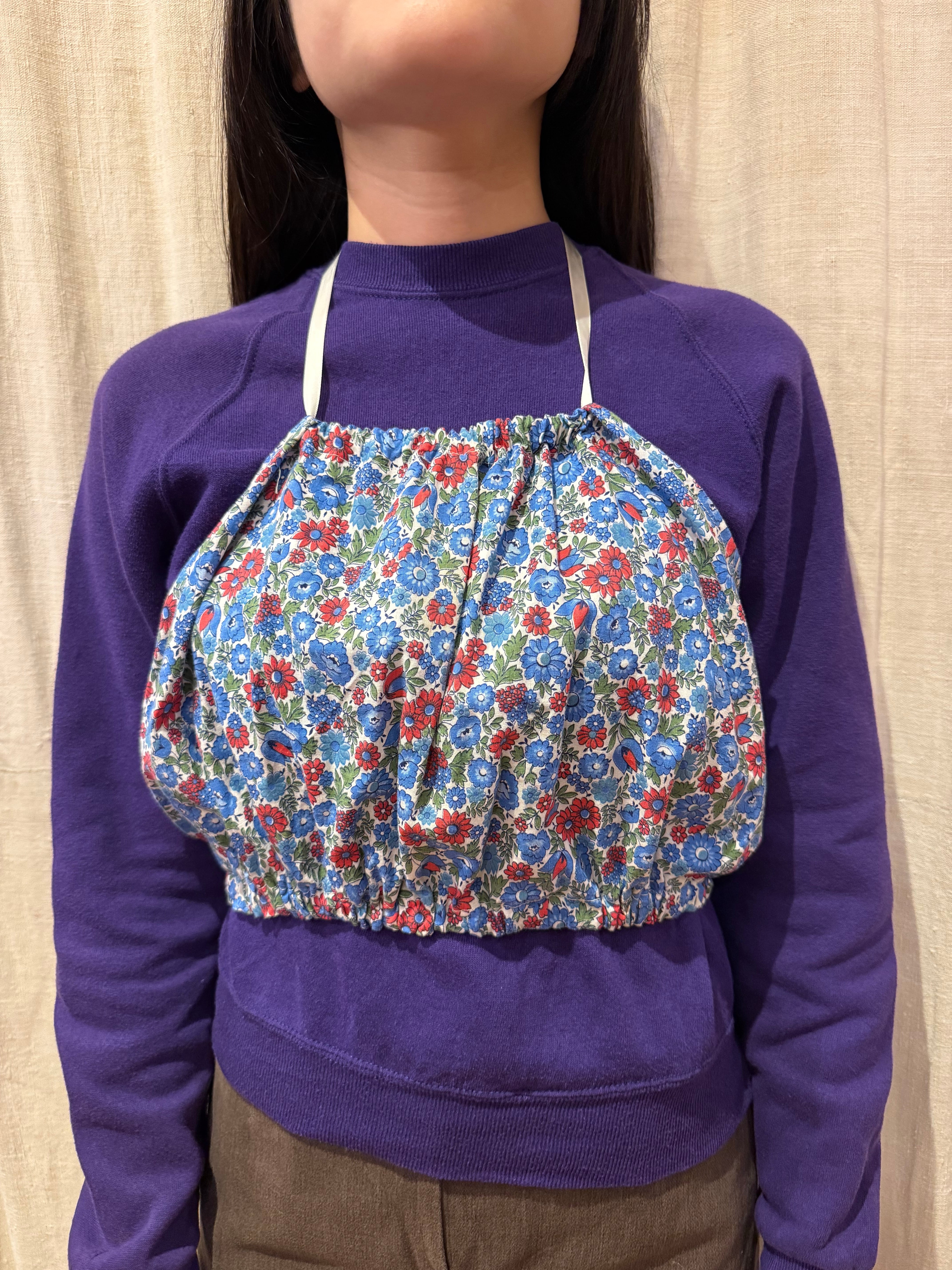 小花柄のビスチェです。総柄でインパクトがあります。ネック部分とウエスト部分で違うカラーのリボンが使われており、とても可愛いです。リボンで上下の生地を寄せたり伸ばしたりして、お好みの大きさで着用して頂けます。少しチープな作りです。アメリカに住む花が好きな女の子が作ったのかな…などと想像すると愛着が湧きます。