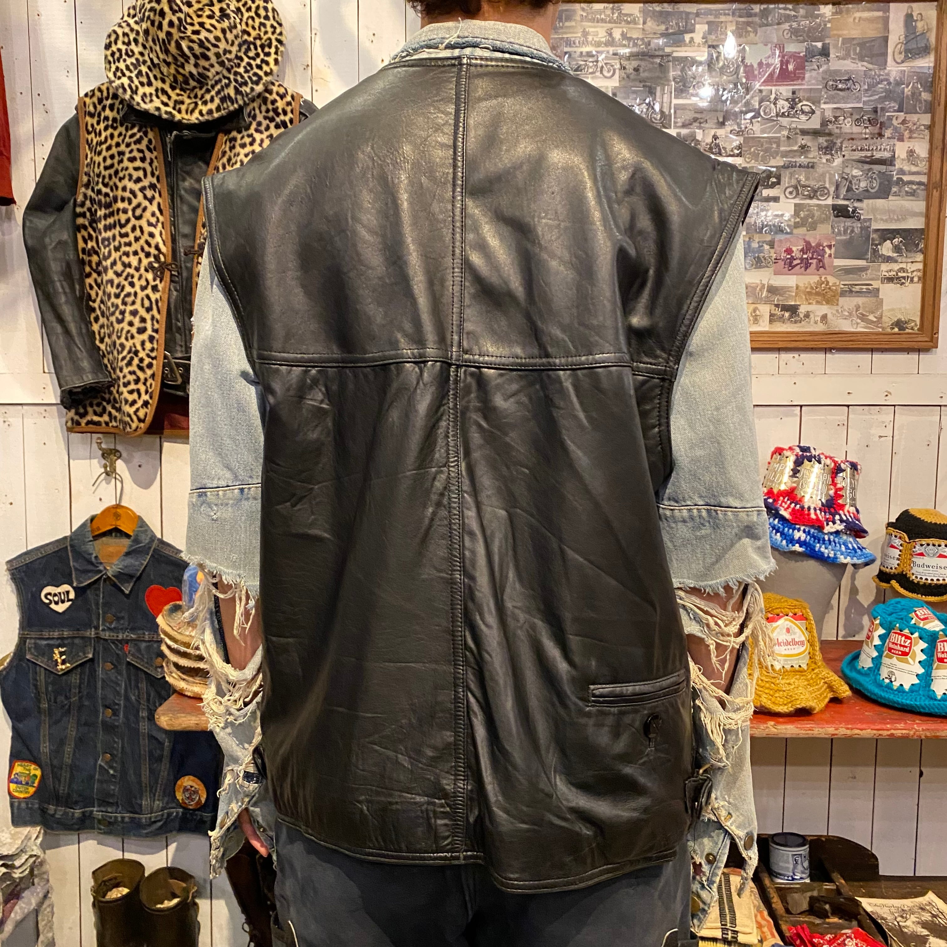 大きめのサイズのヨーロッパのレザーベストになります。柔らかくしなやかなレザーで裏地付きです。脇下につく大きなポケットをはじめポケット使いがとても凝っていて計7個のポケットが付きます。大きめで着丈もあるので分厚いニットやアウターの上にがばっと着れてとても格好良いと思います。※レザークリーニング済み