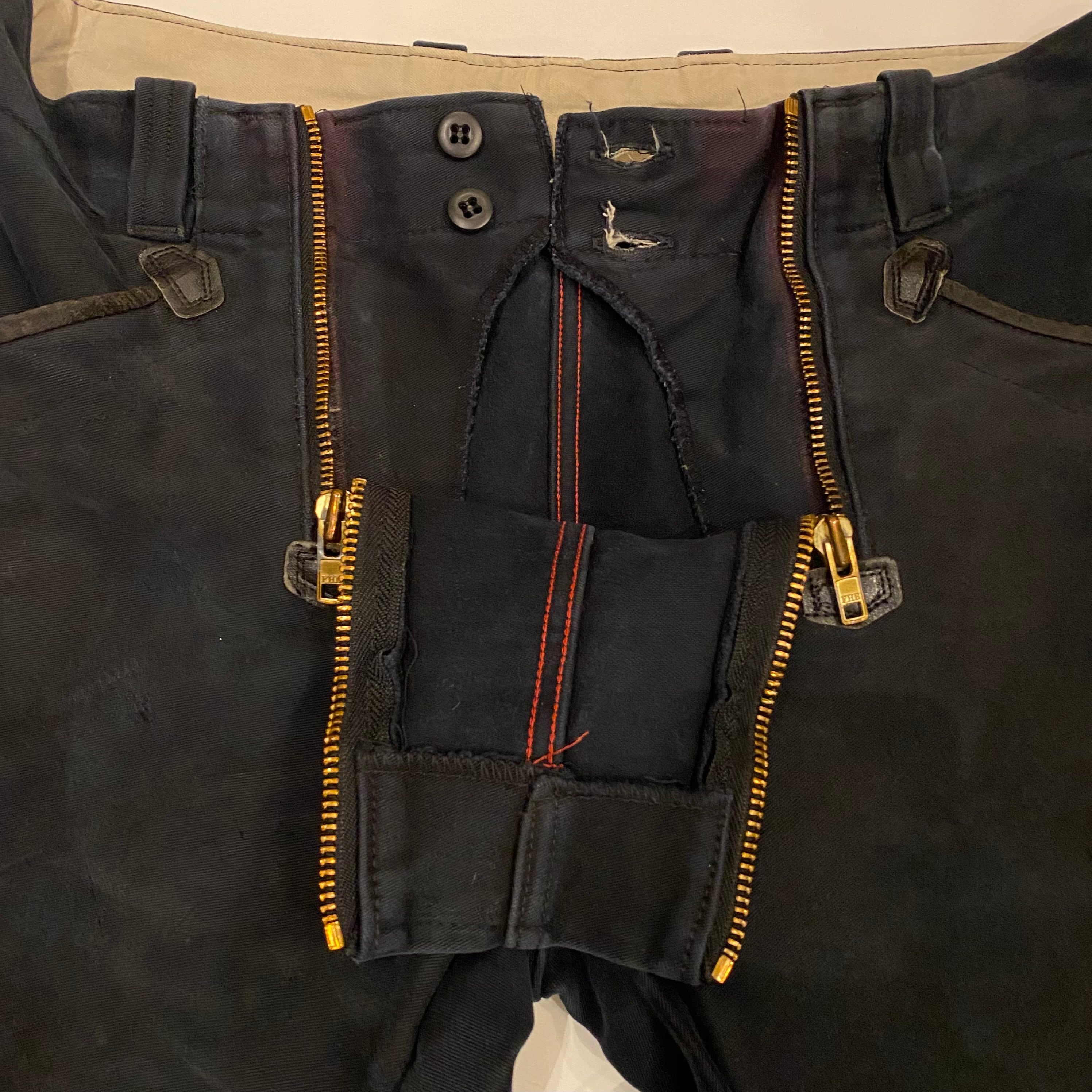 ドイツ製の膝にパッチワークが施された木こりのワークパンツになります。素材はブラックモールスキンでパッチワーク部分はコットンで生地がかわっています。色は黒がフェードしていて生地は厚くしっかりとしています。このデザインでは珍しいフレアシルエットが特徴的です。黒のフェード、パッチワーク、ダメージ、の具合がとても格好良くレザーやデニムなどにも相性ばっちりだと思います。