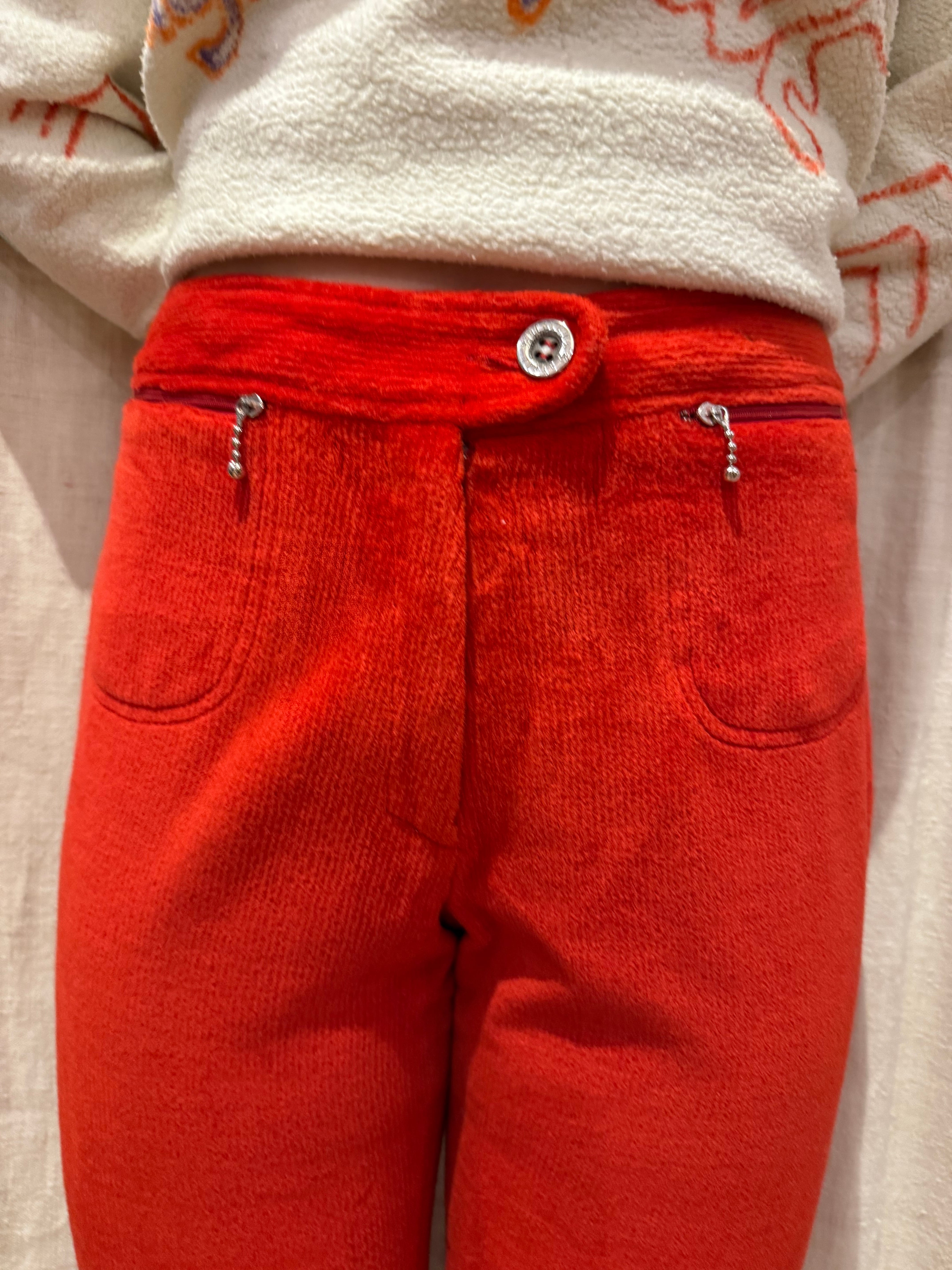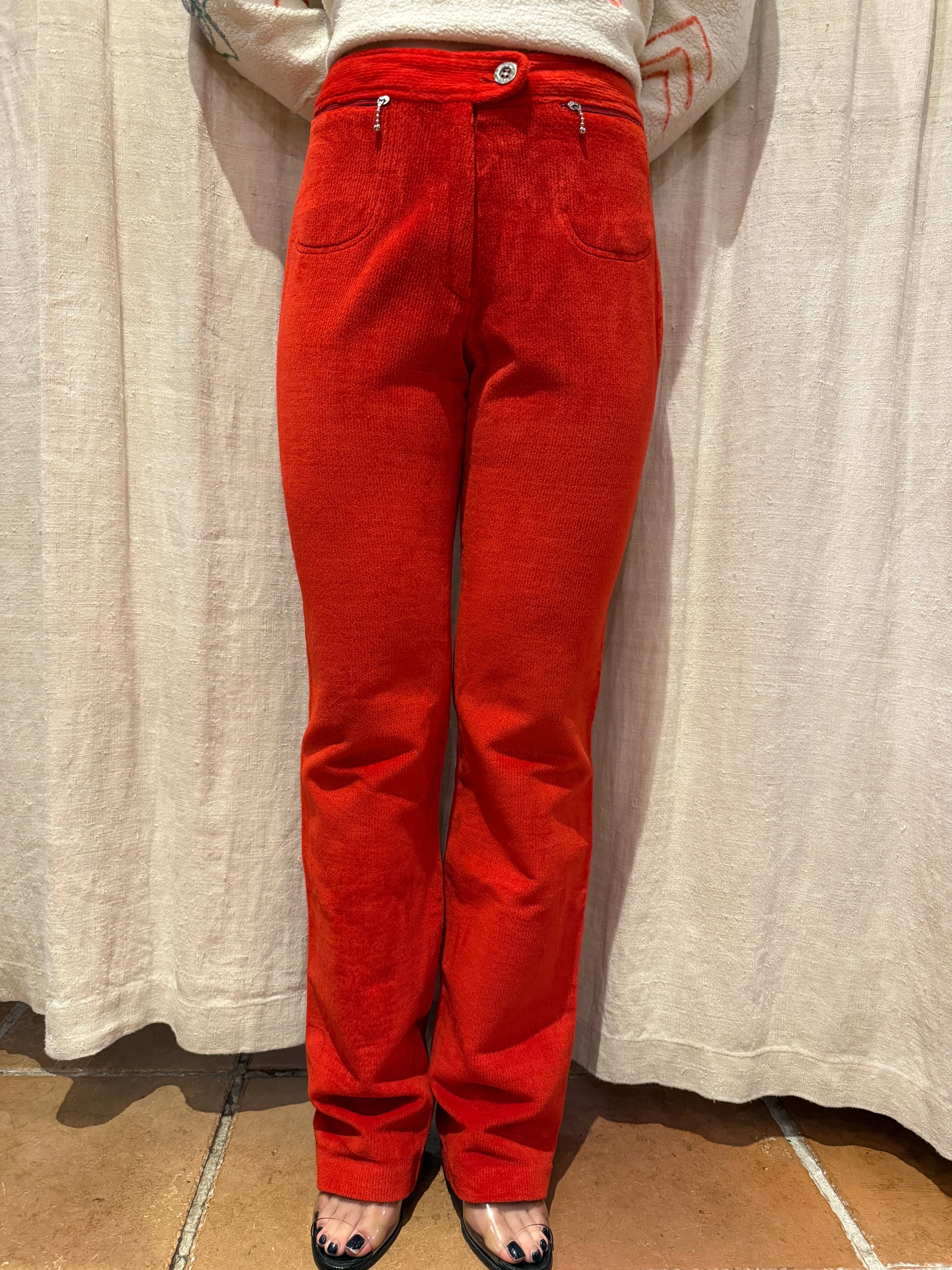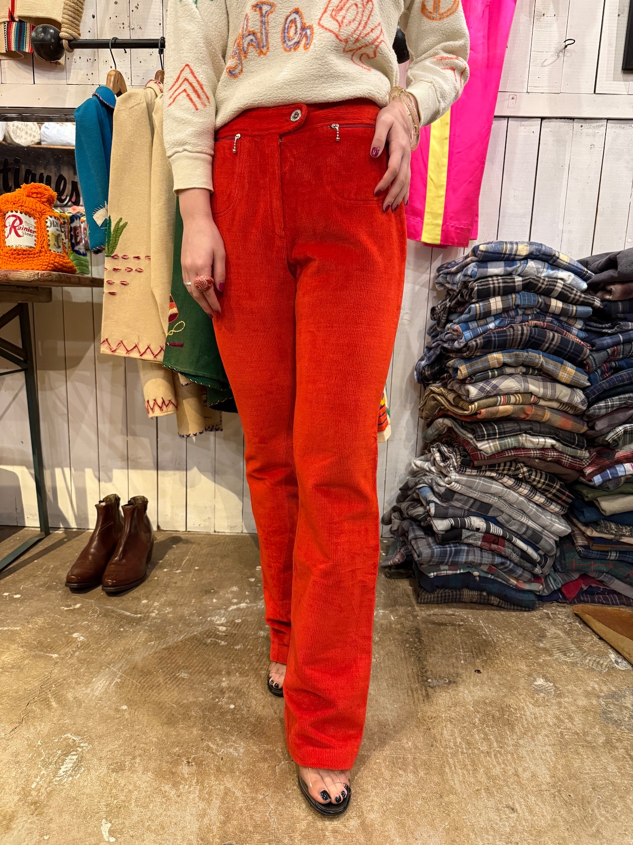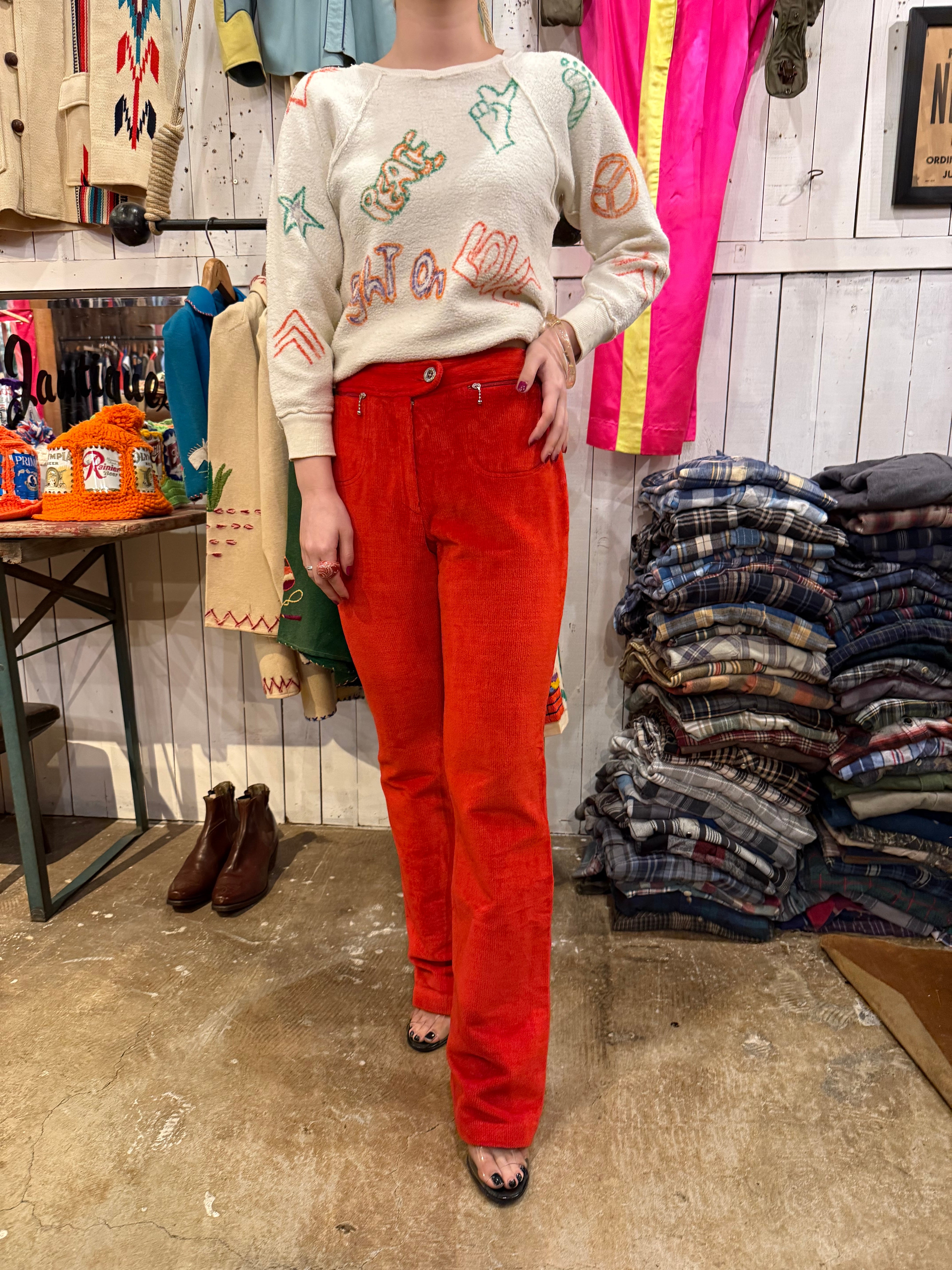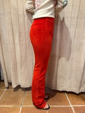 パキッとした赤が特徴的なパンツ。綺麗なストレートシルエットで、コーデュロイですが伸縮性があり履きやすくなっております。両サイドに着くポケットも可愛らしいです。