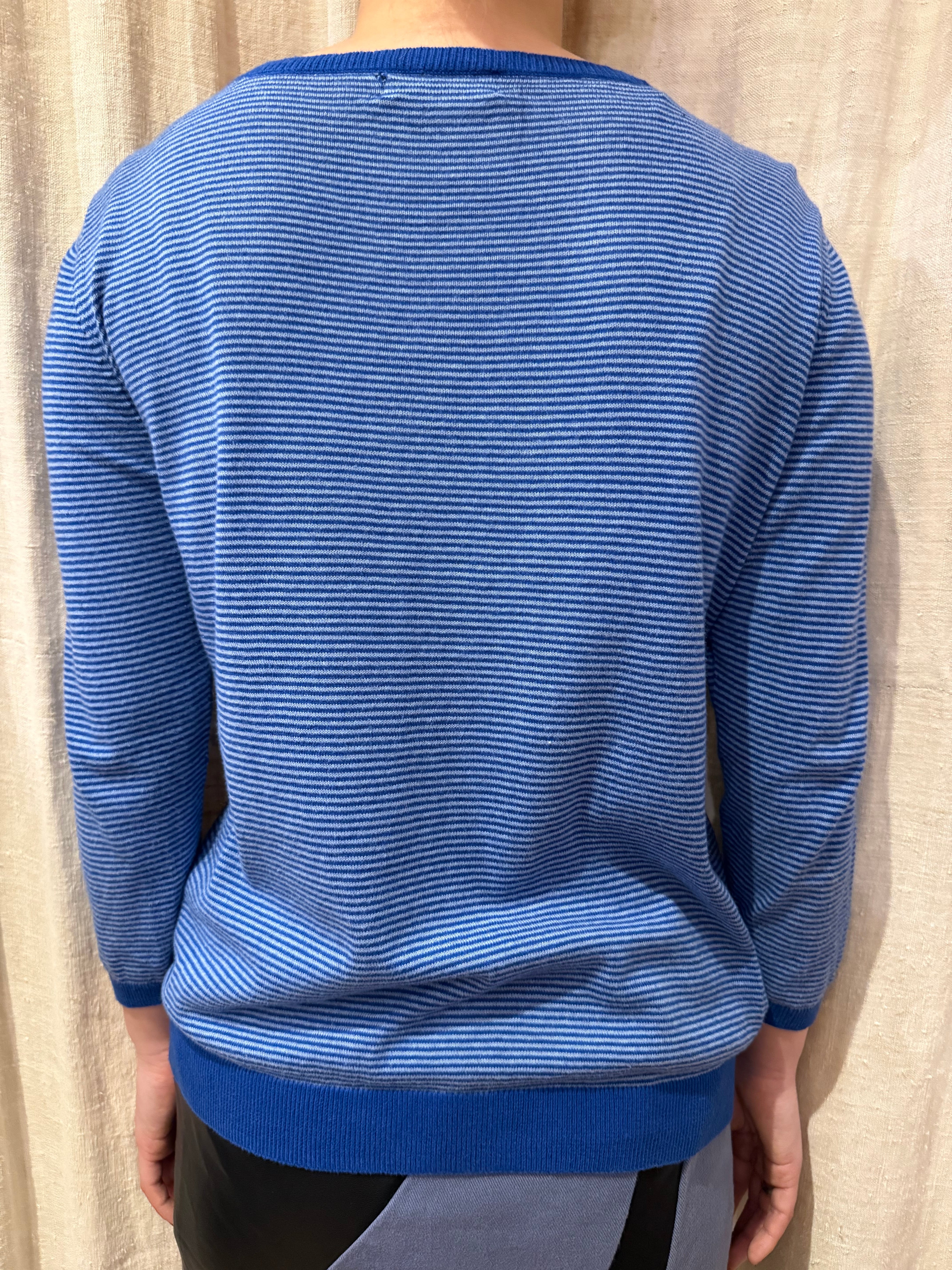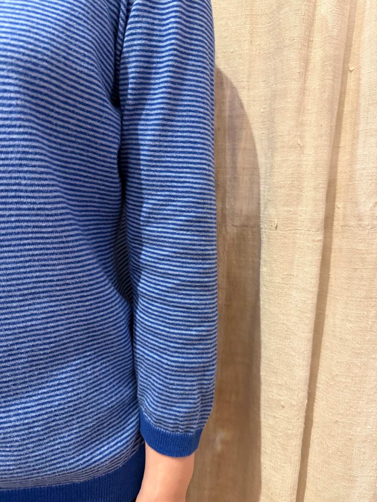 コットン素材で肌触りのいいカーディガン。細かいストライプなので使いやすく、九分袖なのでアクセサリーと合わせても良さそうです。肌寒い今の季節に使いやすくオススメです。