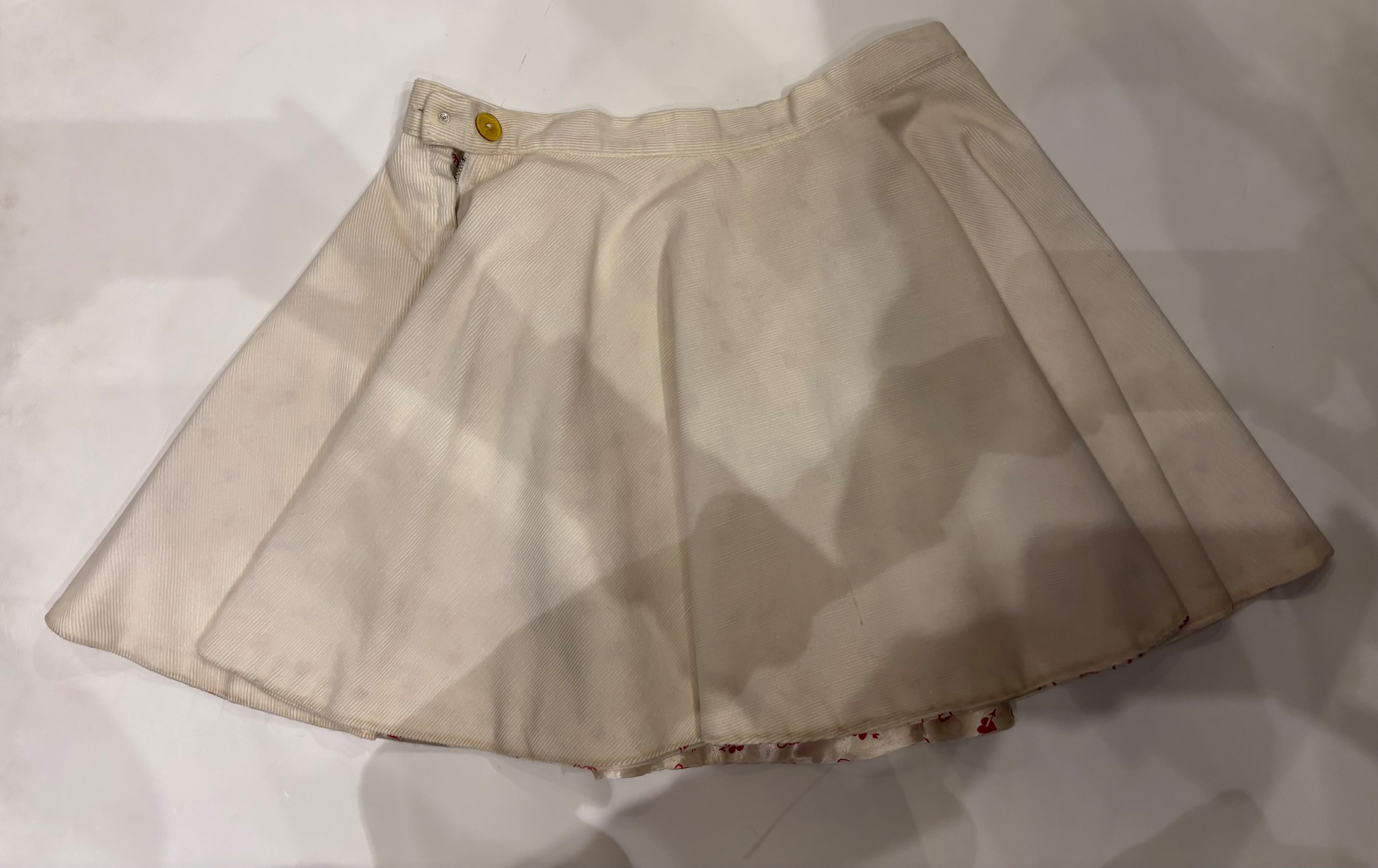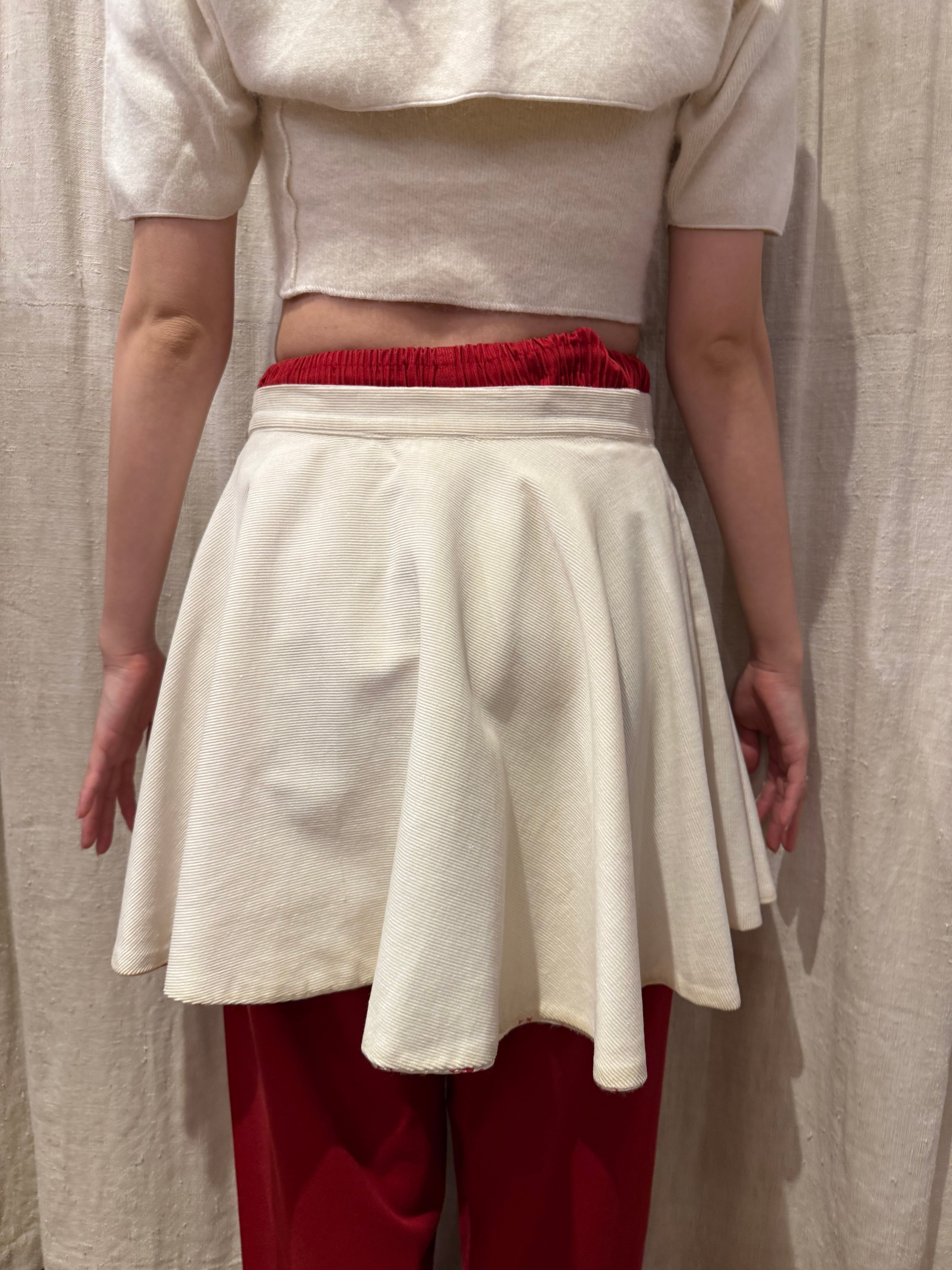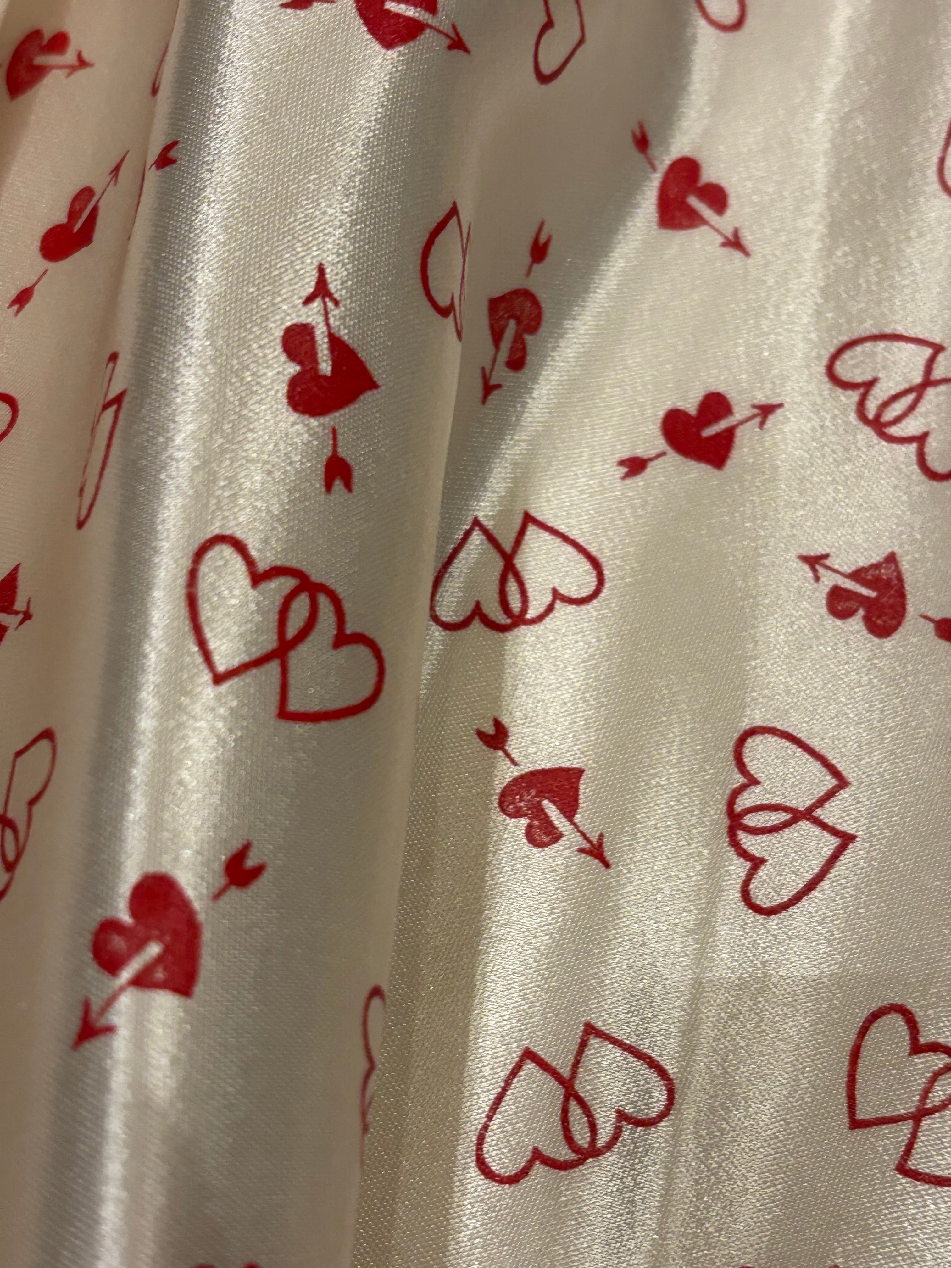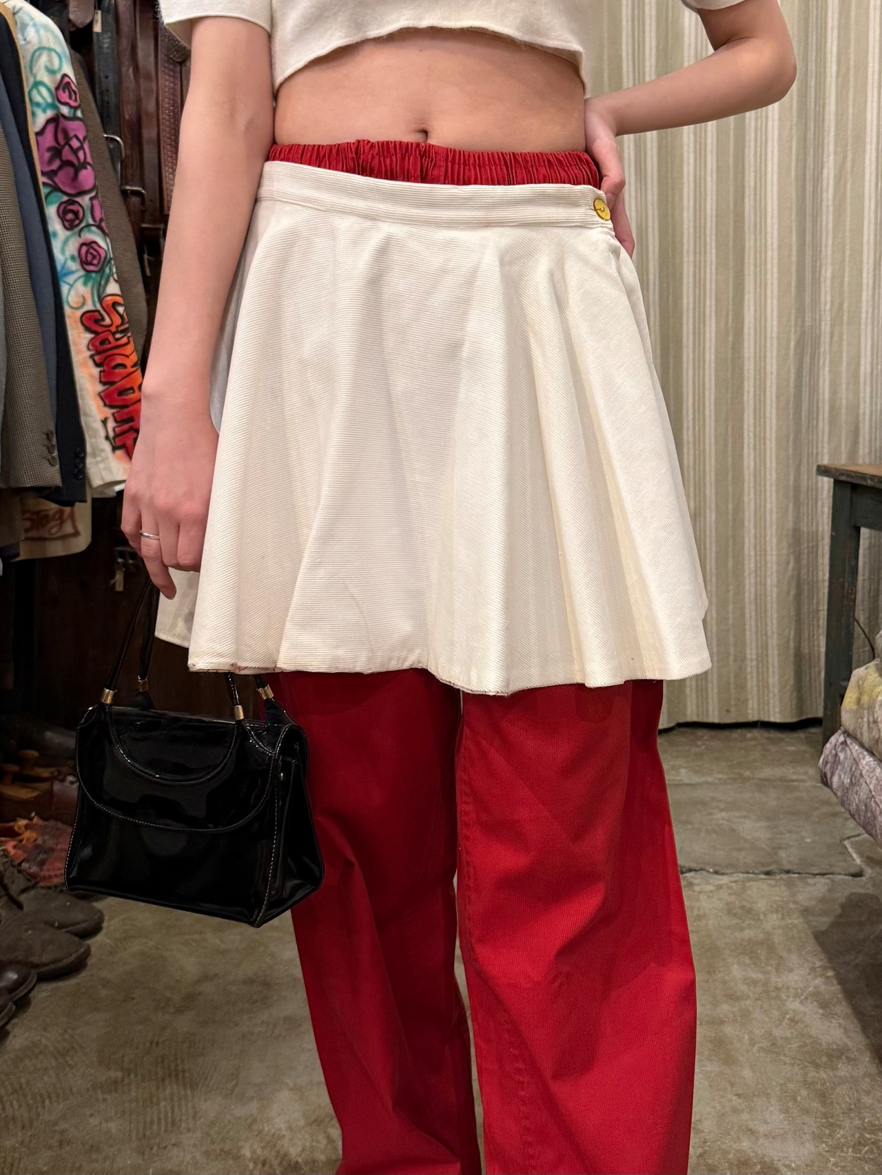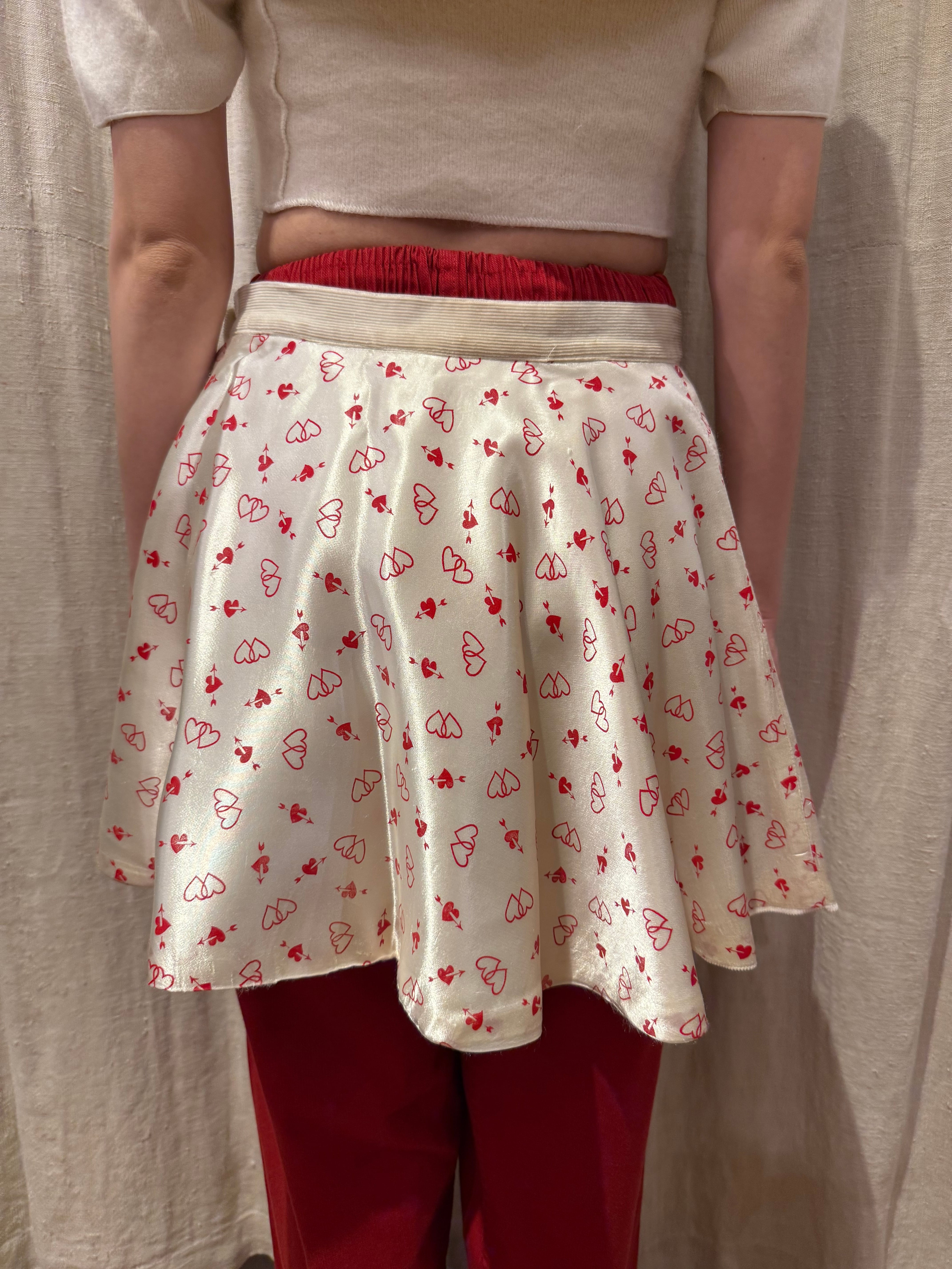 ドレープがかったようなデザインの古いスカート。リバーシブルでコーデュロイとサテンのような生地にハートのプリントが可愛いらしいです。ミニ丈なのでレイヤードに使える一着です。