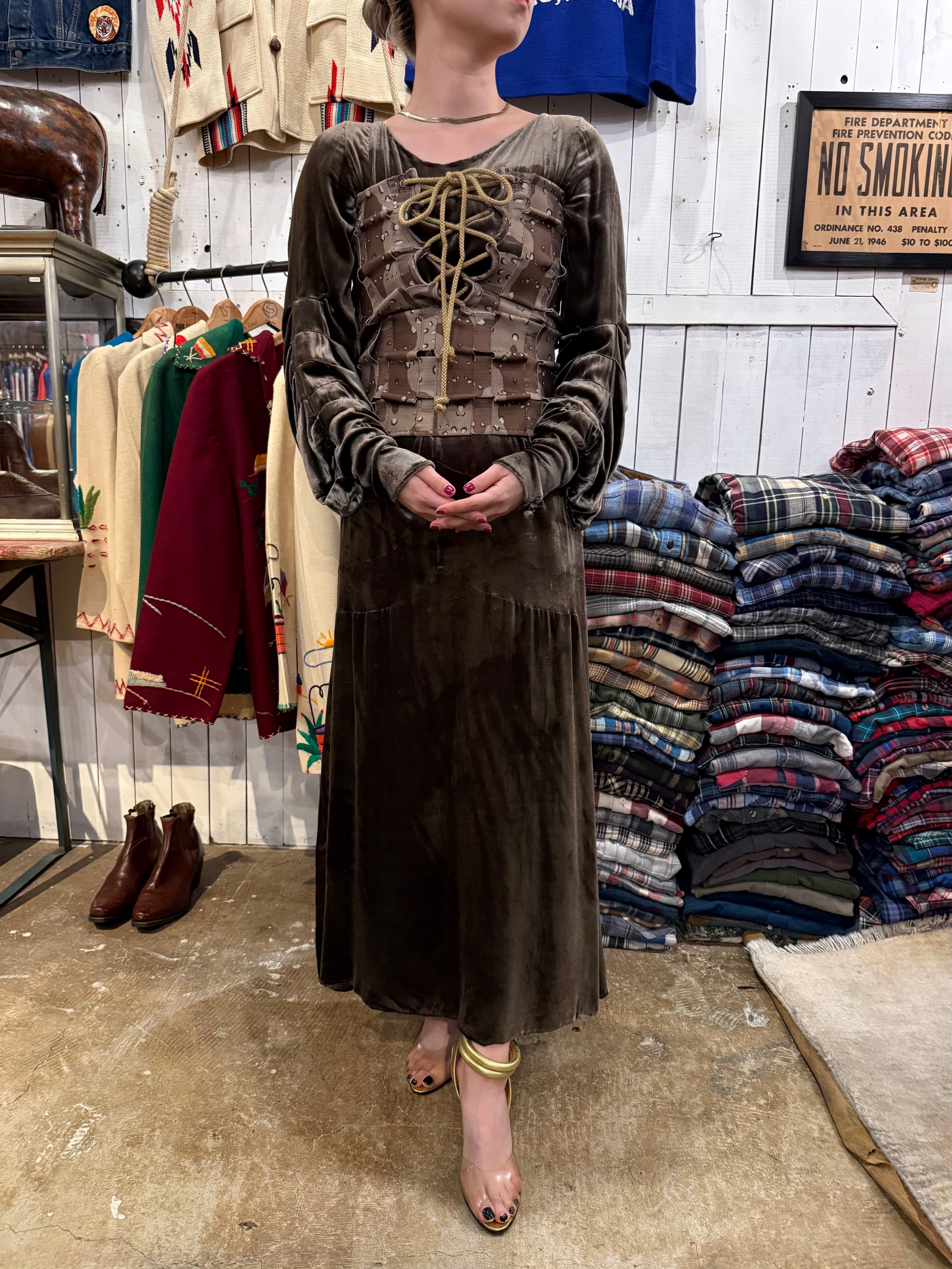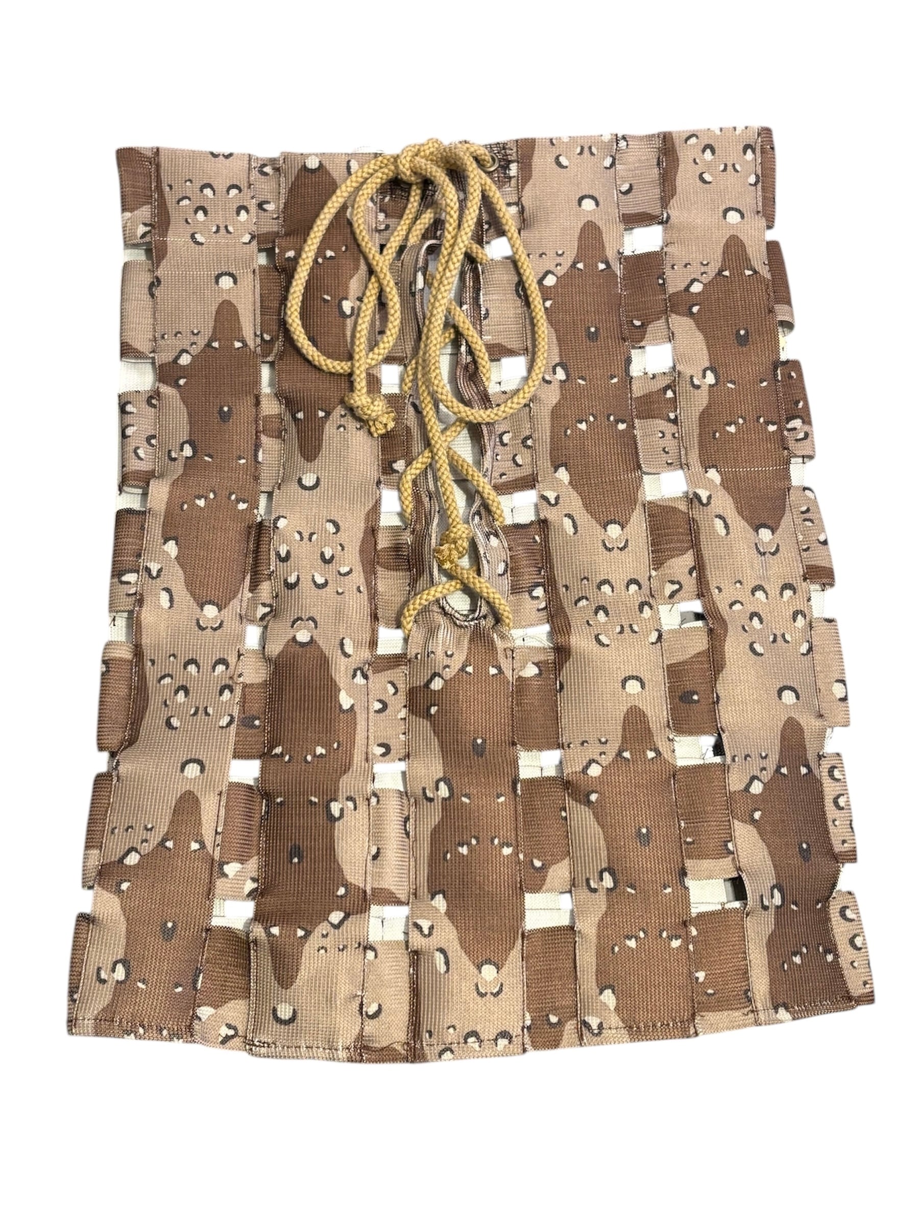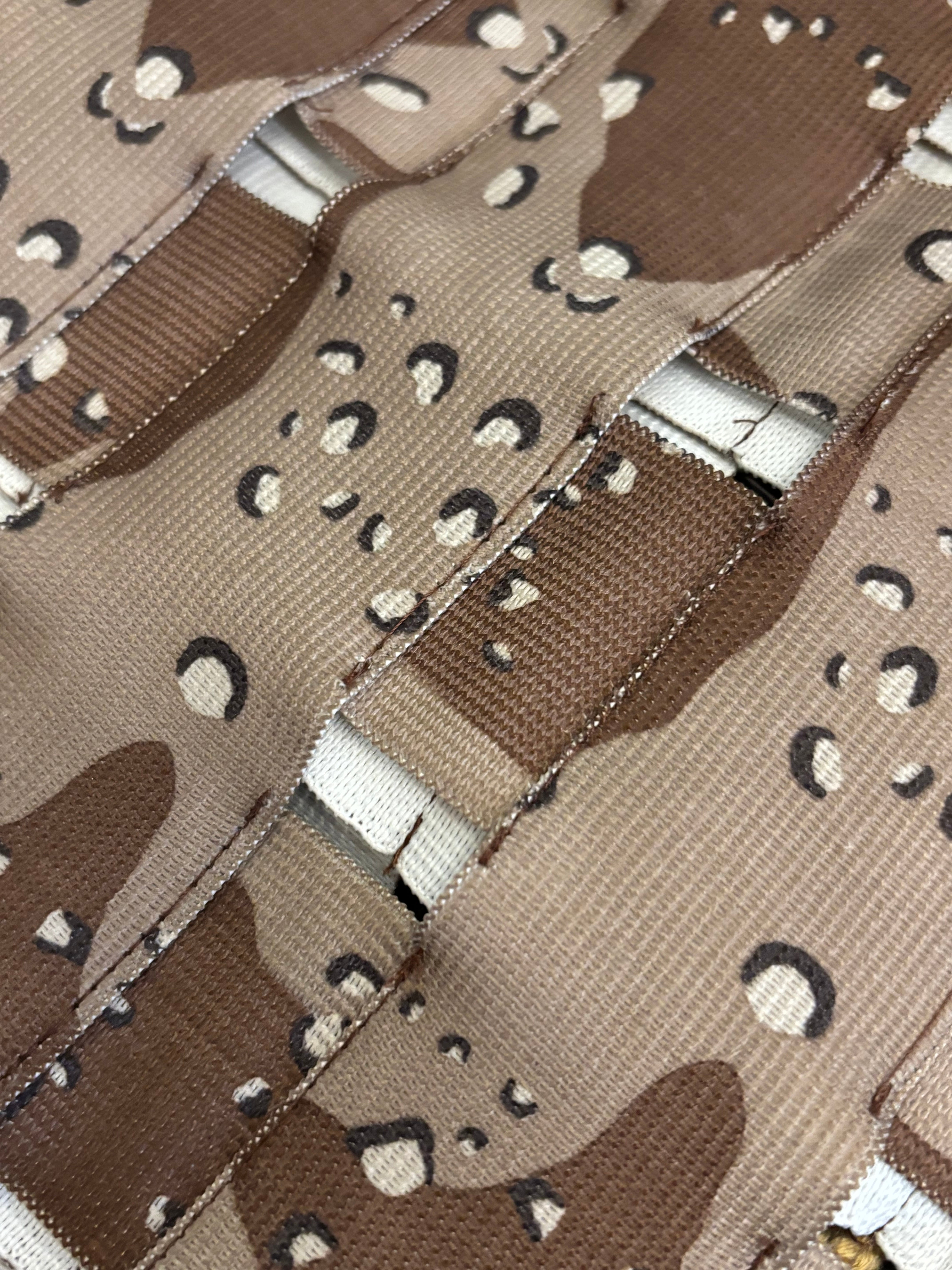 チョコチップカモ柄のビスチェです。リボンが交互に編み込まれているような仕様になっており、個性的な印象です。バスト部分はレースアップになっておりますので、調節が可能です。シーズン問わず着用して頂ける一着です。
