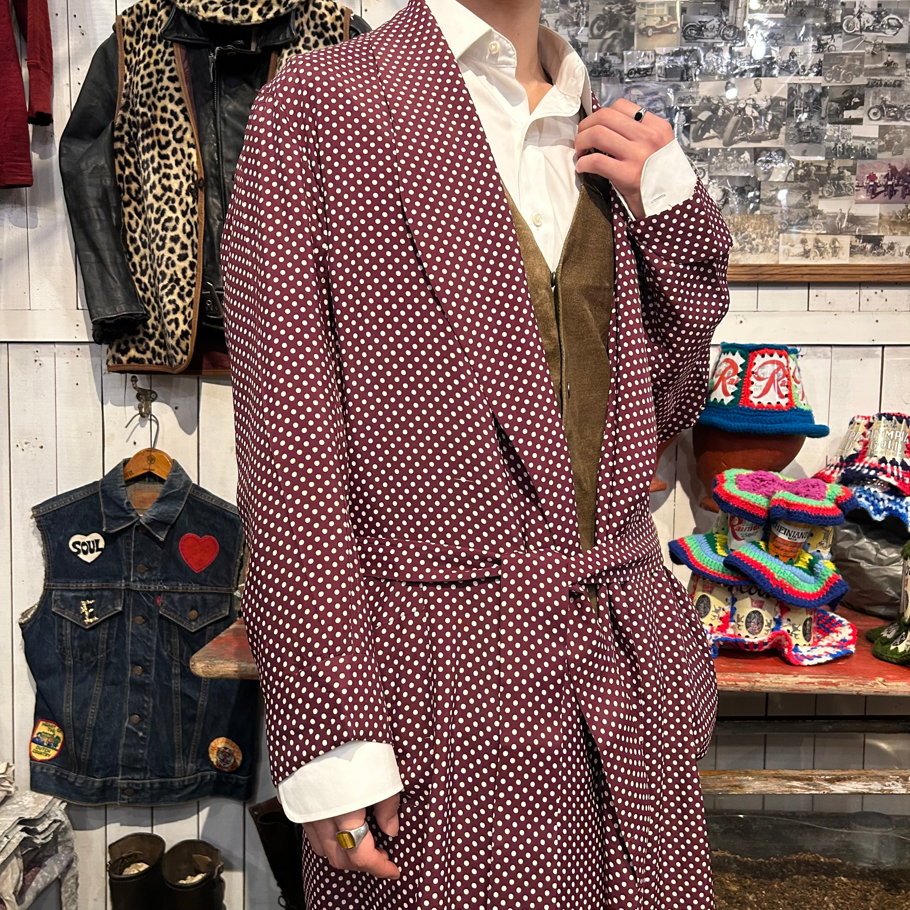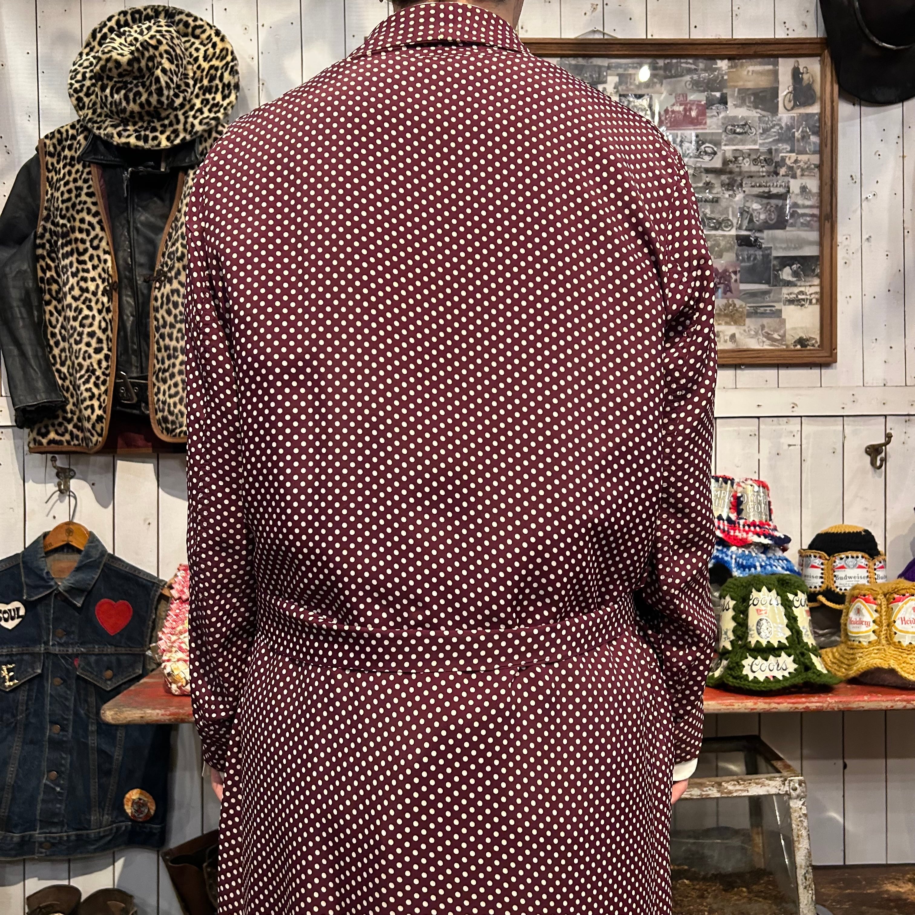 ガウン、ドットの組み合わせは、カジュアルかつ大人の色気が出るものだと思います。