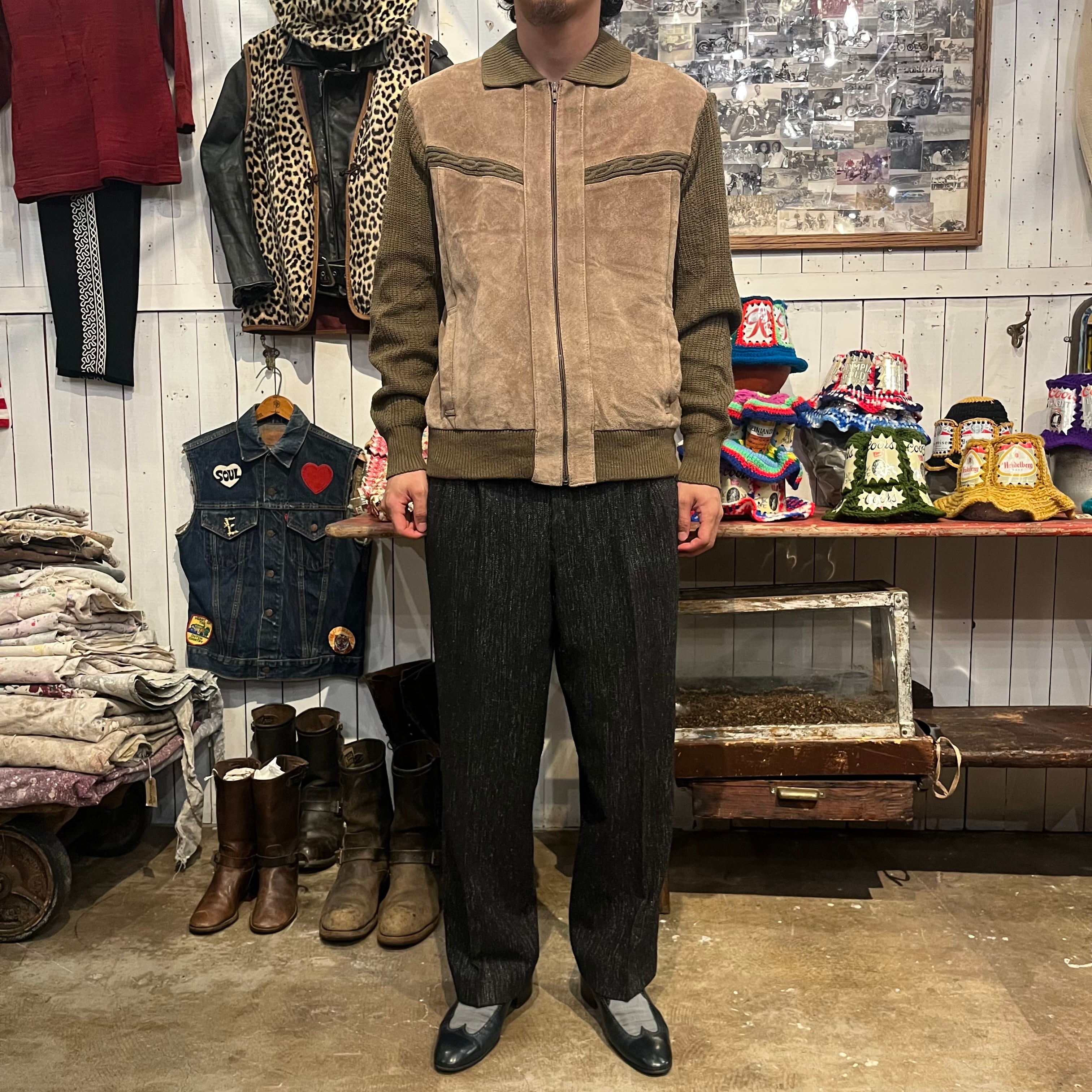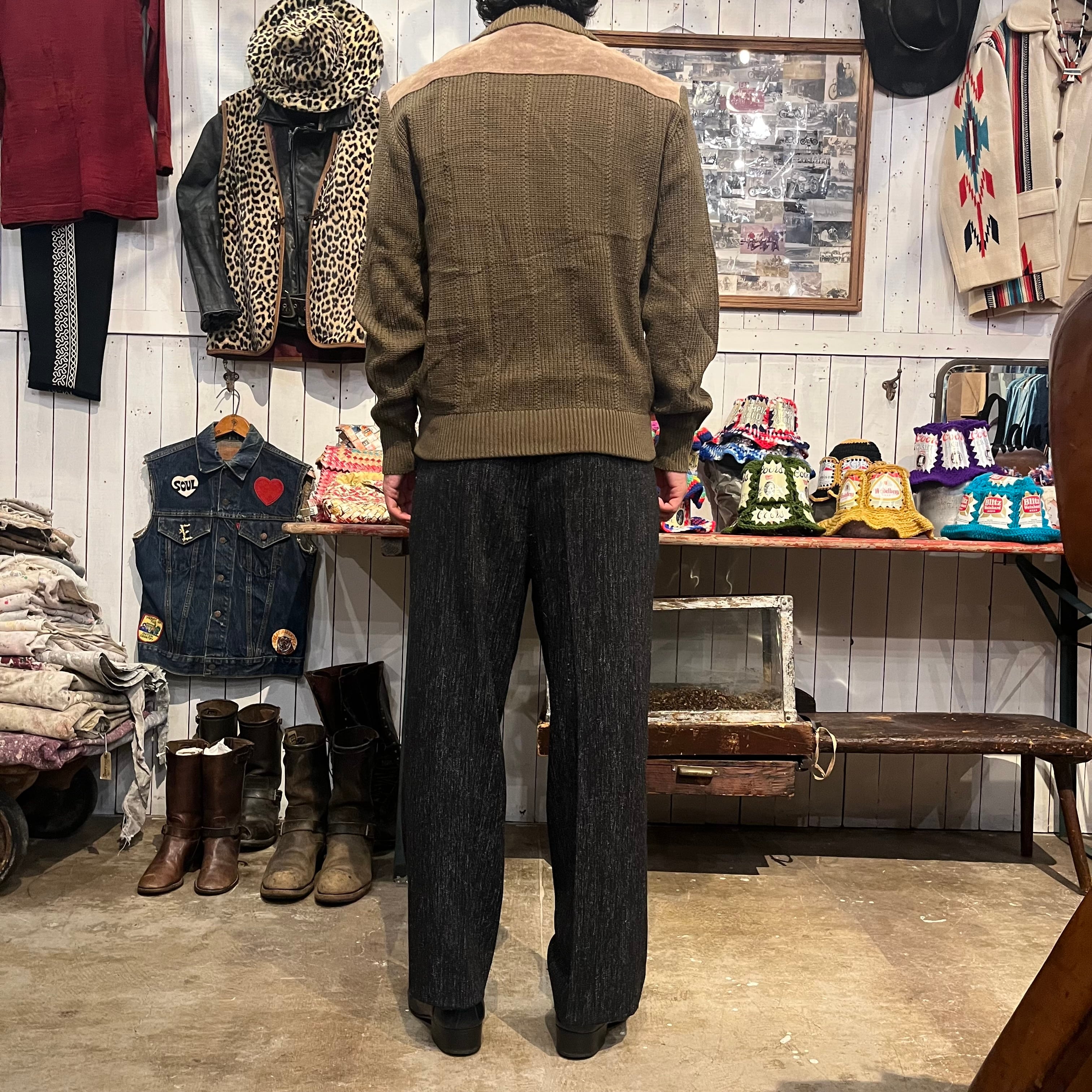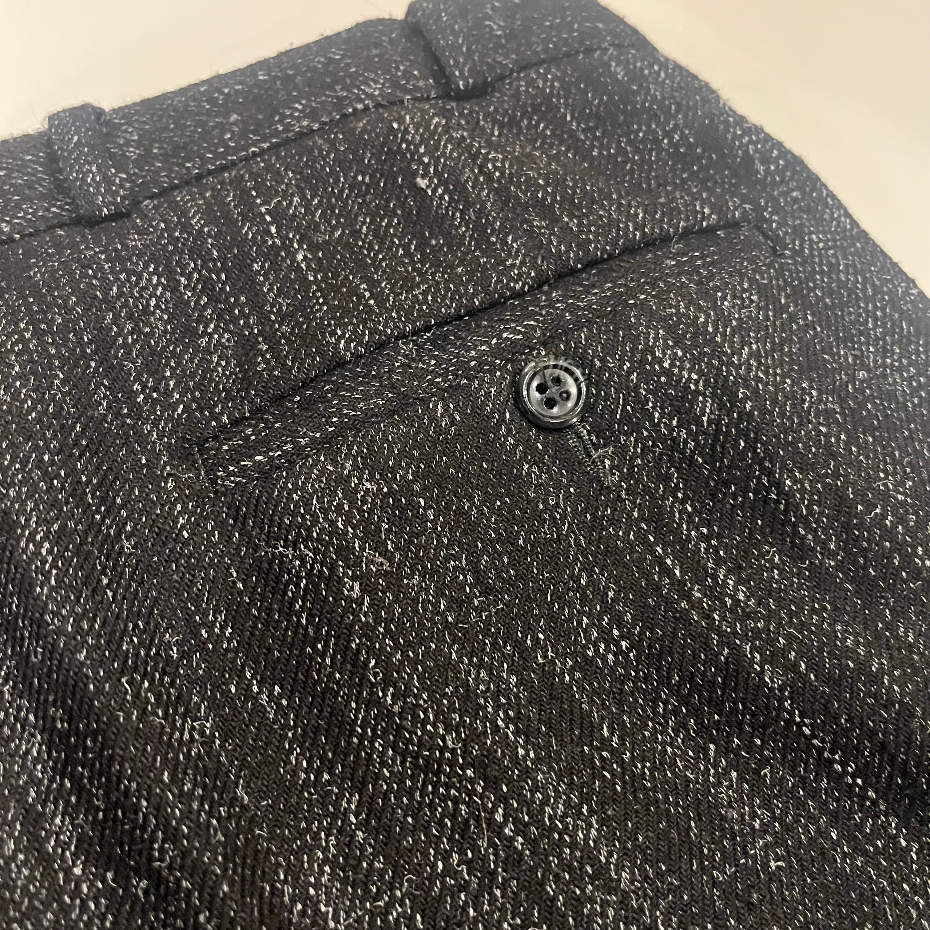ユーロアイテムからポリウールのスラックスになります。絣のような生地になっています。2タックにセンタープレスも綺麗に入っているので履いたシルエットがとても綺麗に出ます。